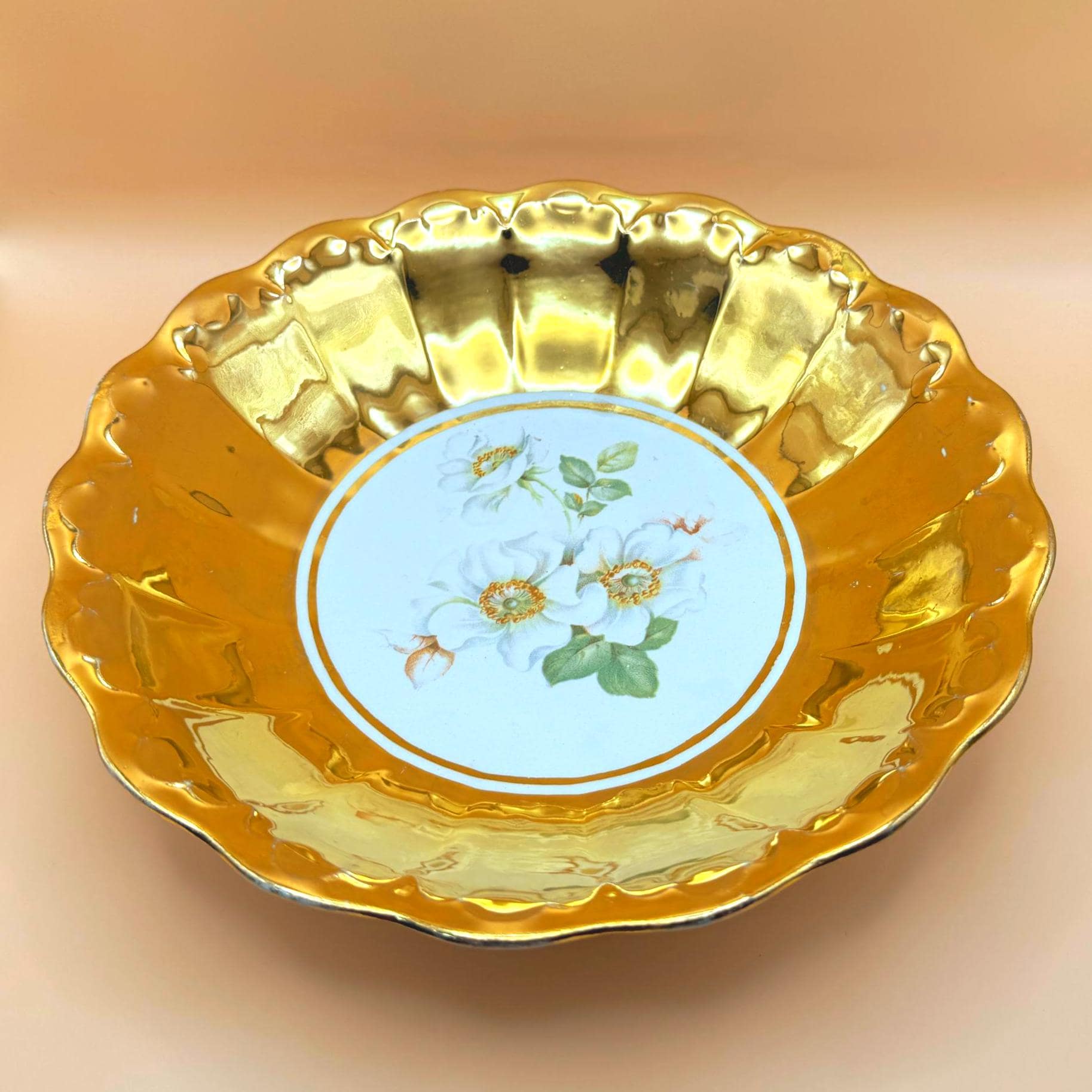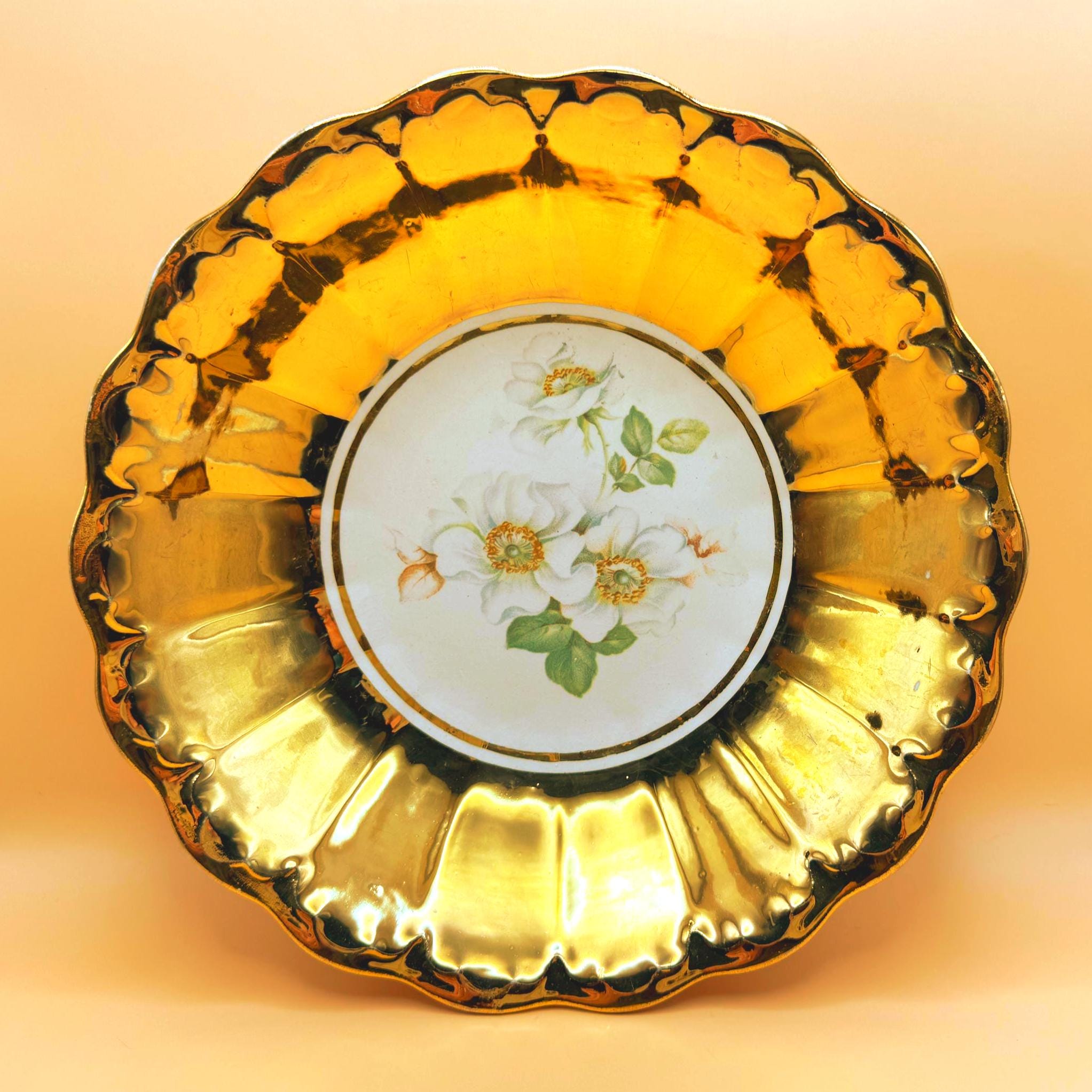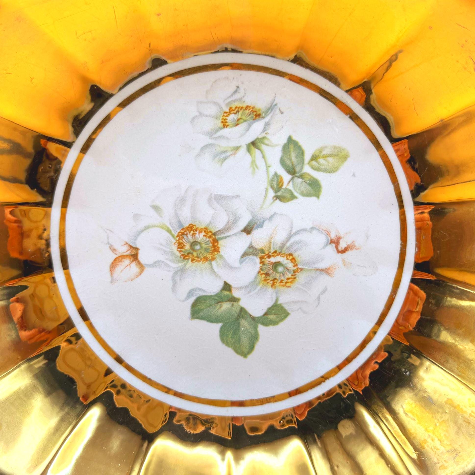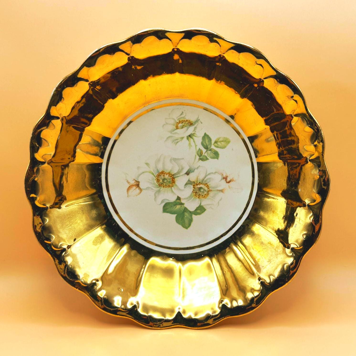 This beautiful antique bowl features a rich gold gilt finish with a delicate floral center, creating a timeless and elegant look. The scalloped edge and softly paneled design give it that classic Victorian charm that instantly elevates any space.