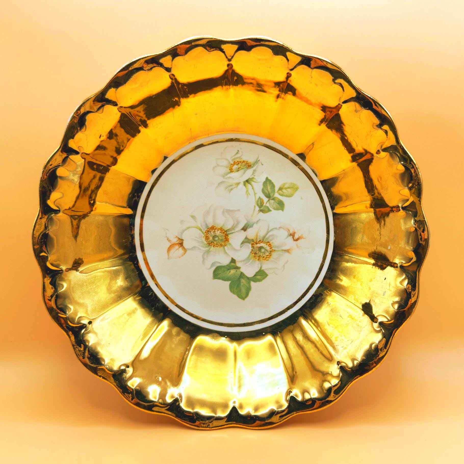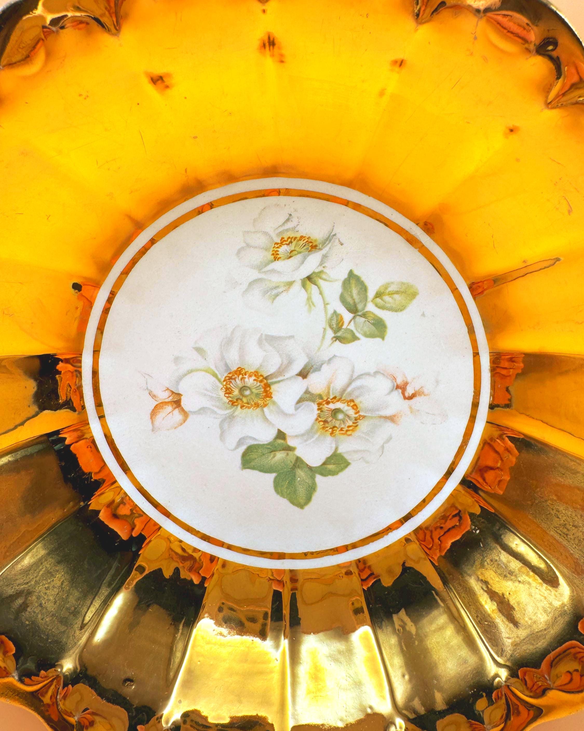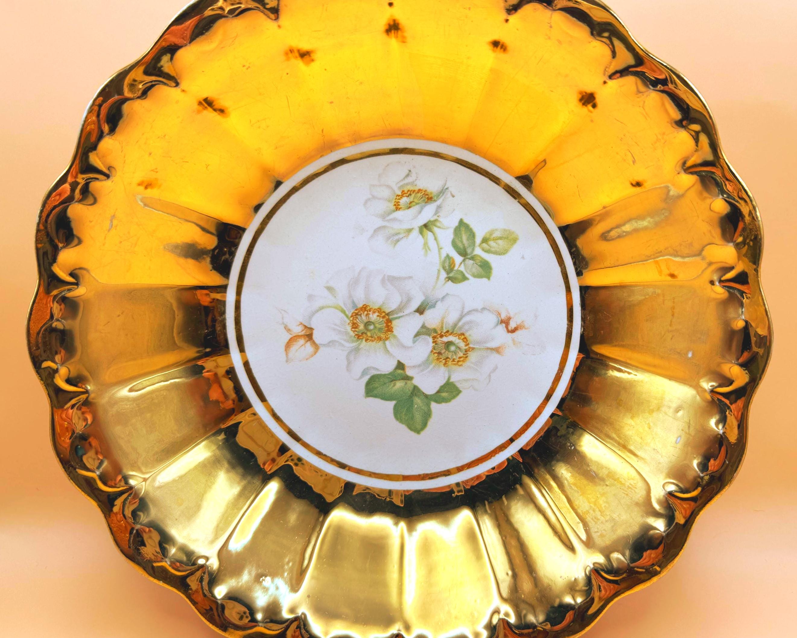 This beautiful antique bowl features a rich gold gilt finish with a delicate floral center, creating a timeless and elegant look. The scalloped edge and softly paneled design give it that classic Victorian charm that instantly elevates any space.