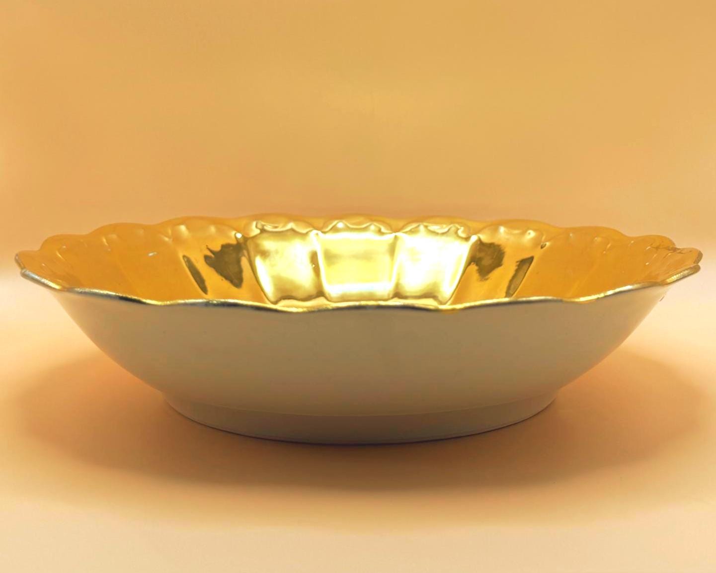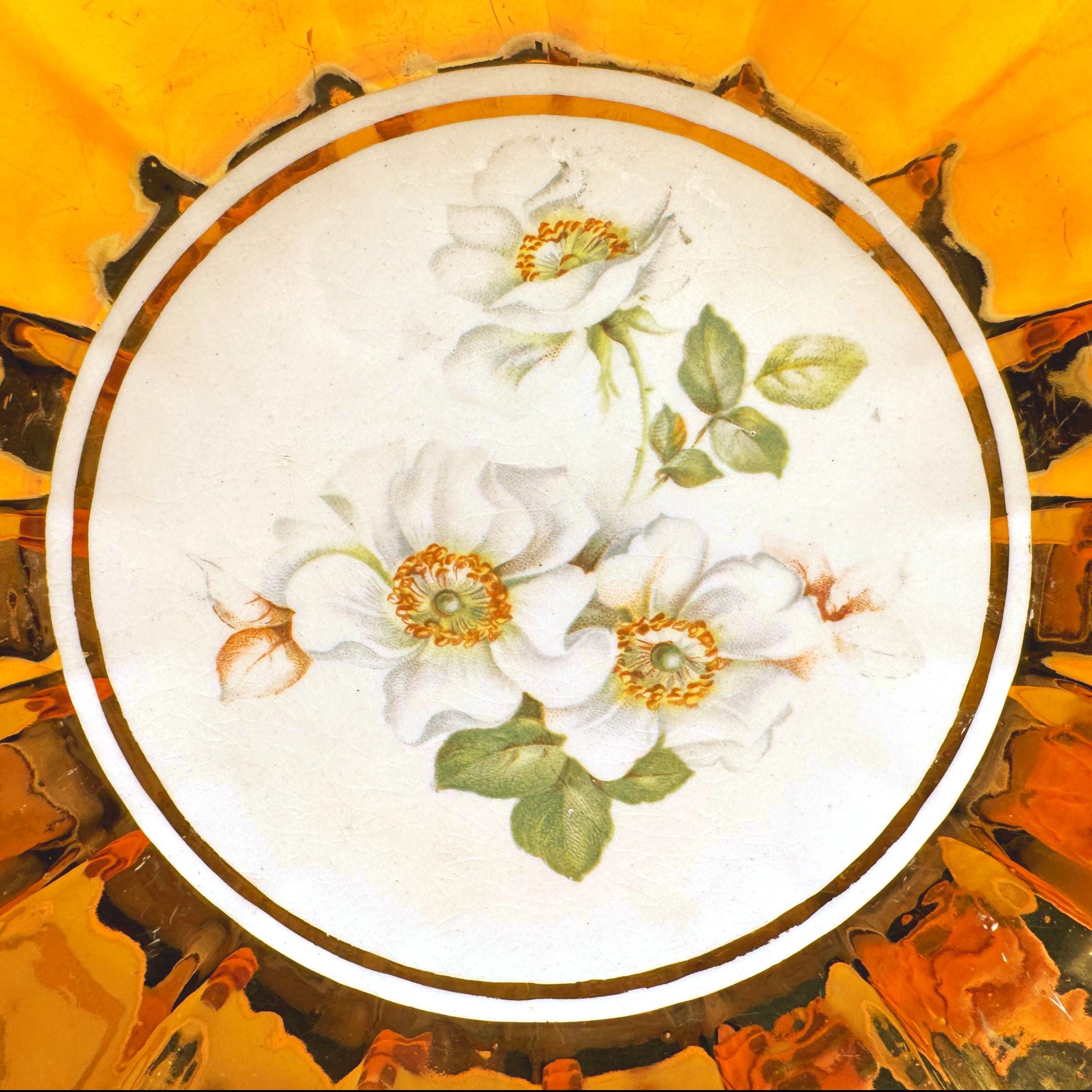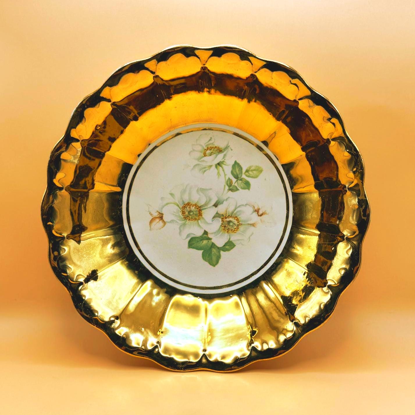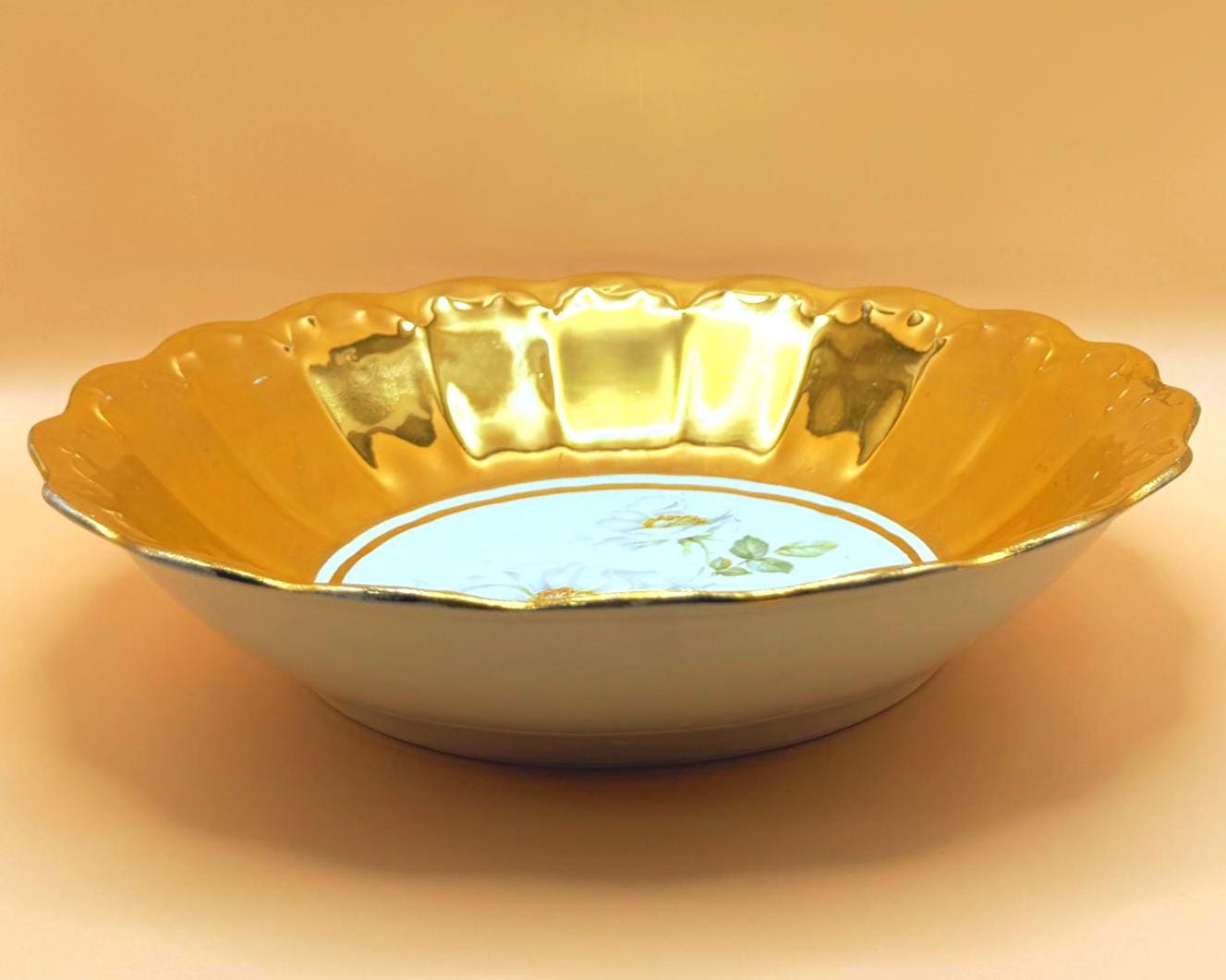 This beautiful antique bowl features a rich gold gilt finish with a delicate floral center, creating a timeless and elegant look. The scalloped edge and softly paneled design give it that classic Victorian charm that instantly elevates any space.