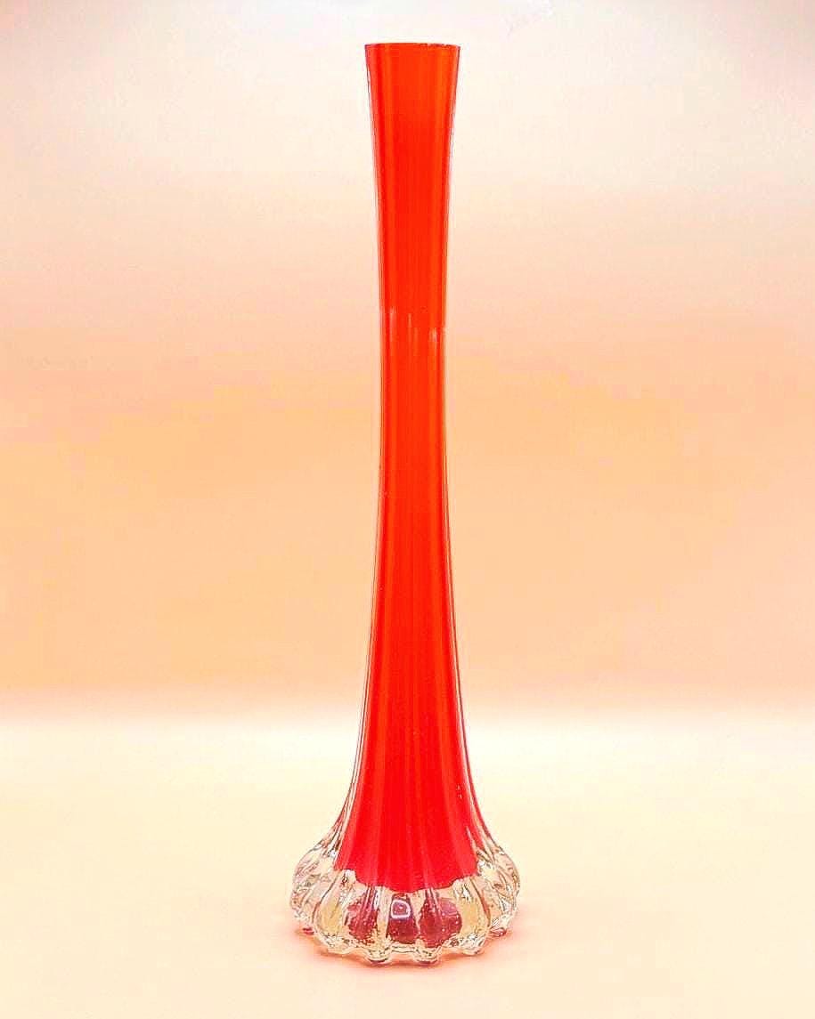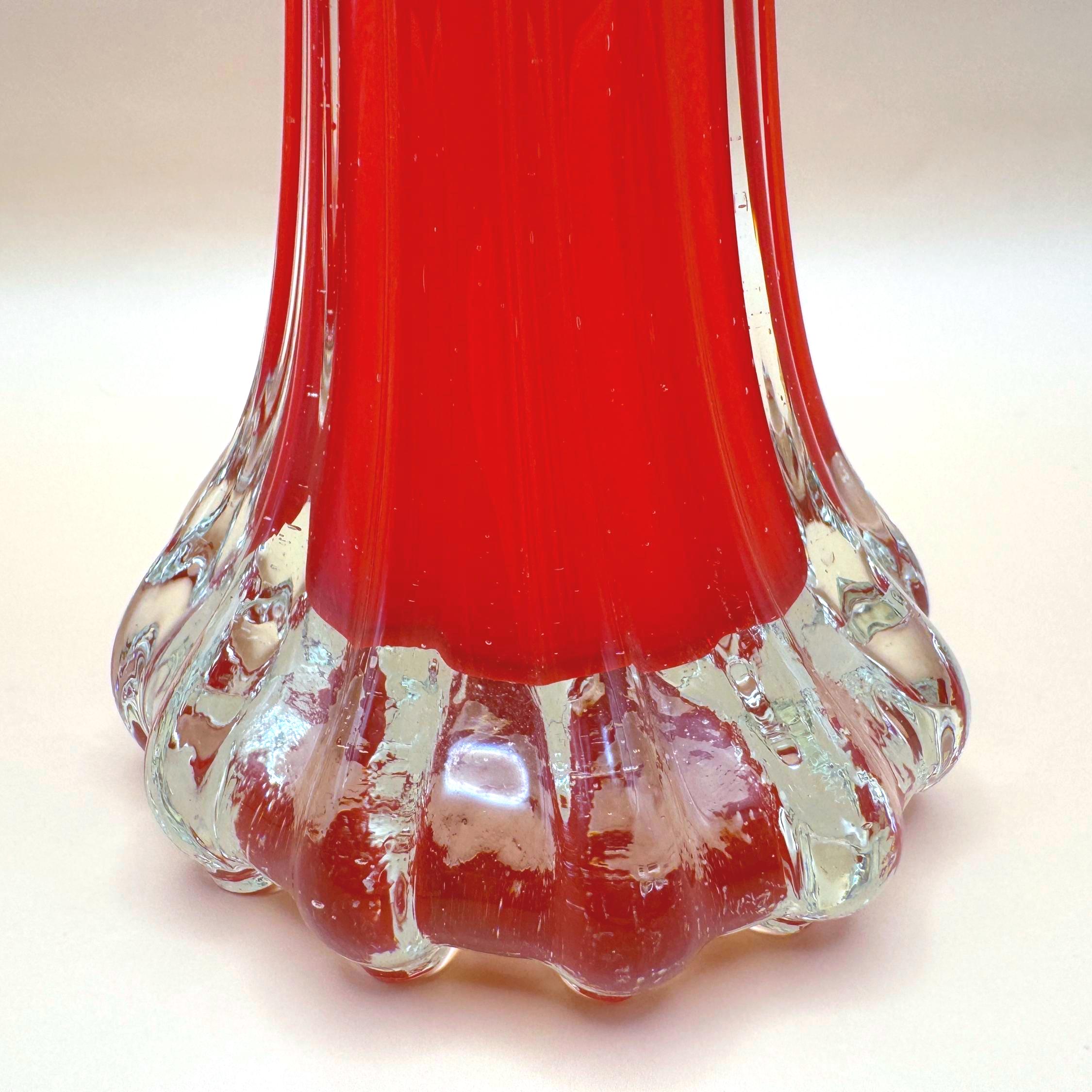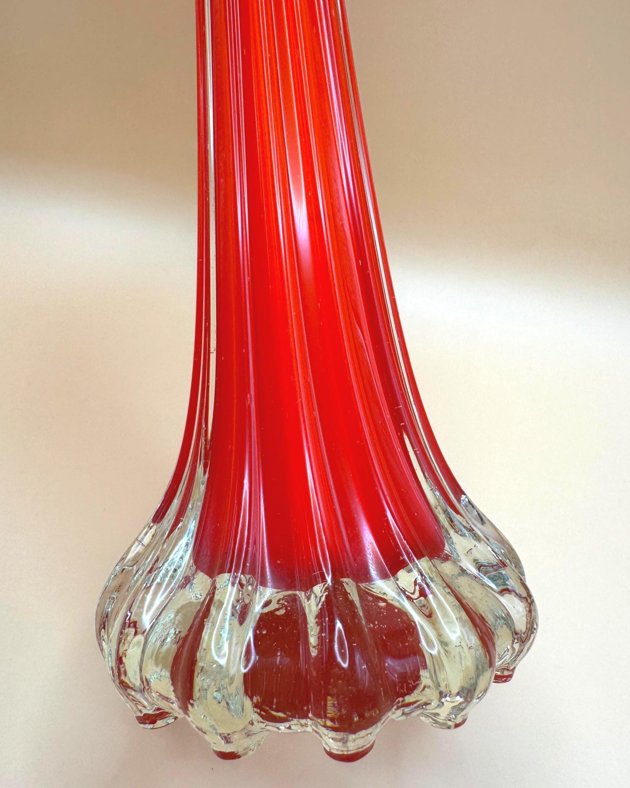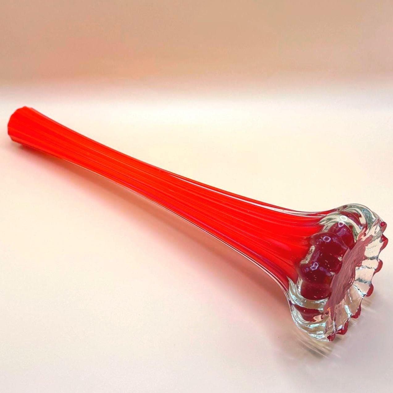 This striking vintage art glass vase features a vibrant red body with a beautifully fluted silhouette that tapers elegantly toward the top. The clear glass base adds contrast and dimension, giving it a sculptural, eye-catching presence.