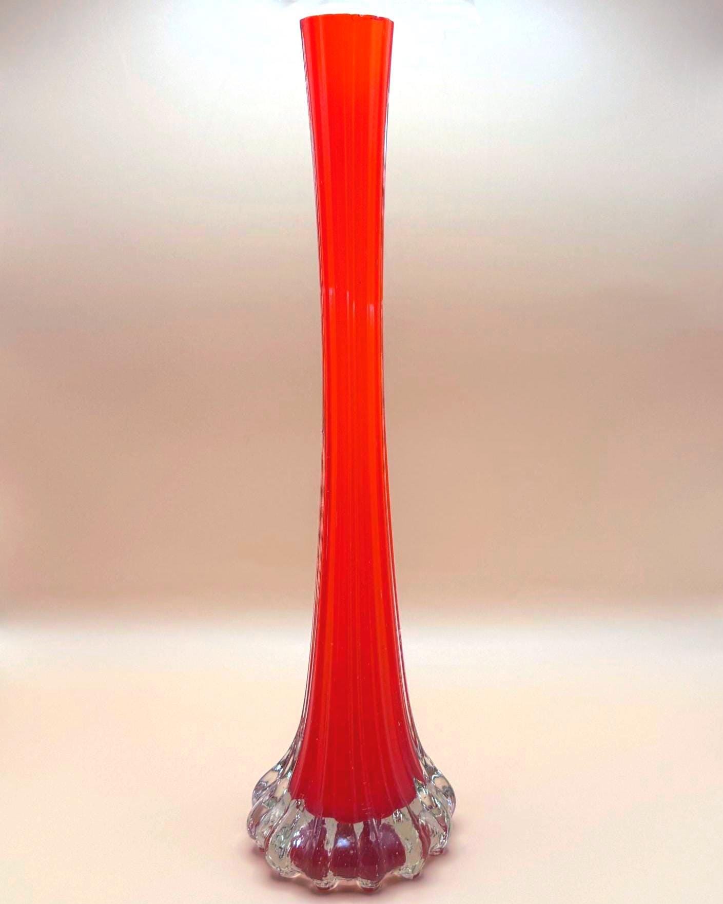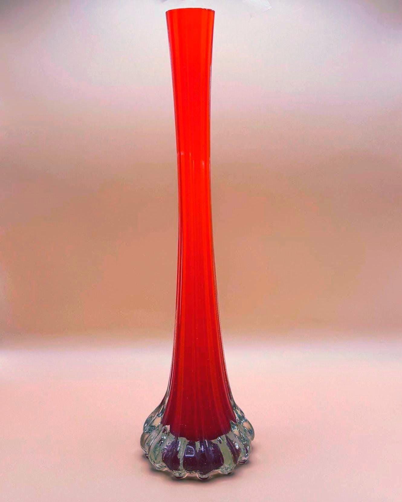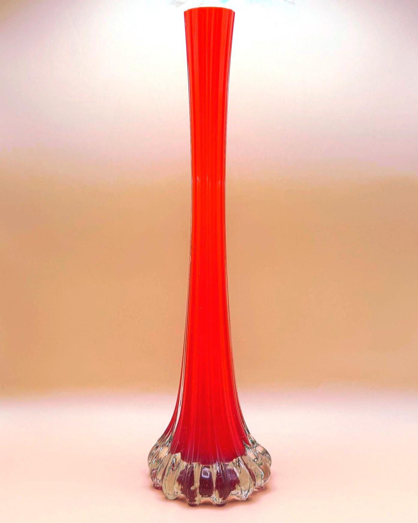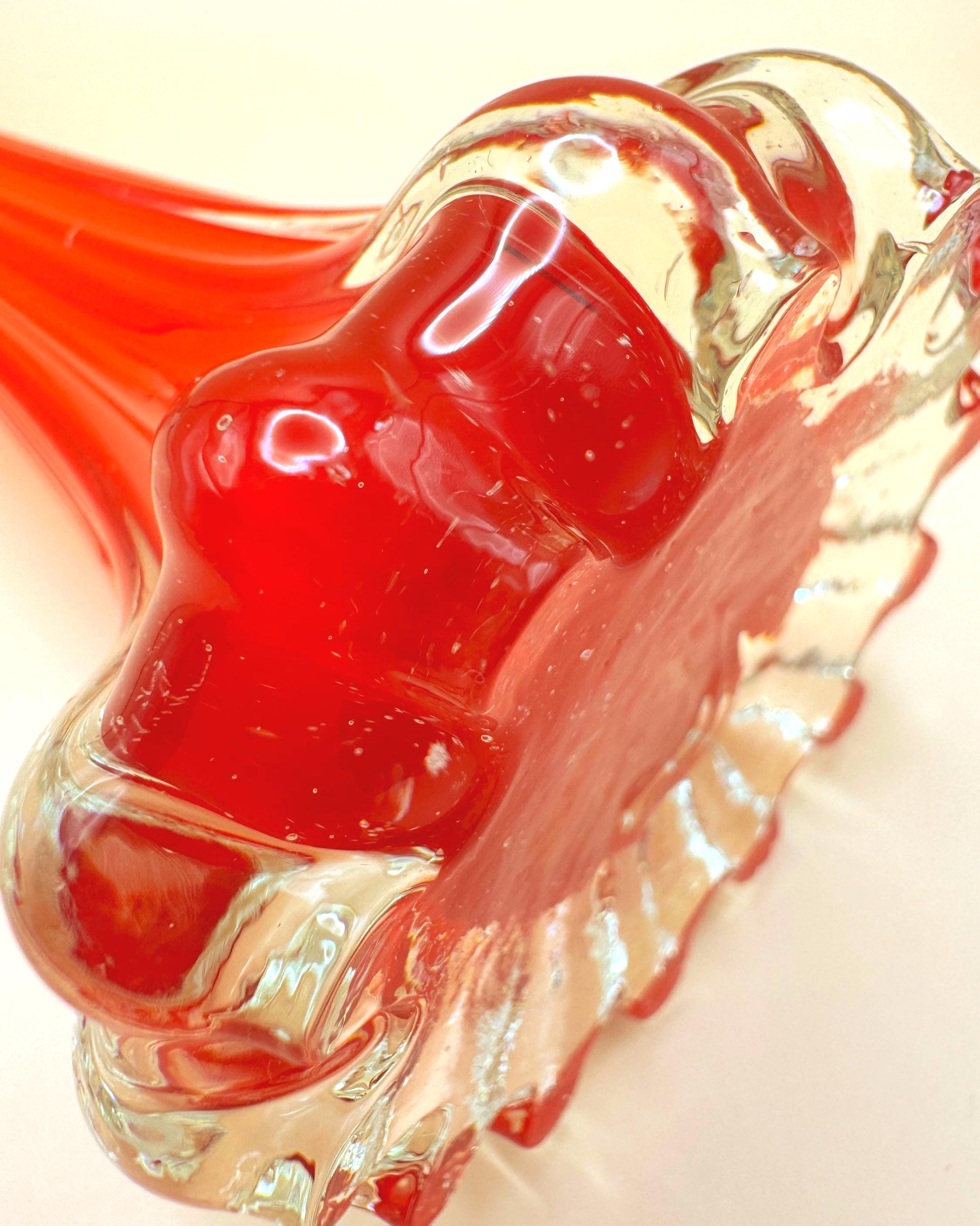 This striking vintage art glass vase features a vibrant red body with a beautifully fluted silhouette that tapers elegantly toward the top. The clear glass base adds contrast and dimension, giving it a sculptural, eye-catching presence.