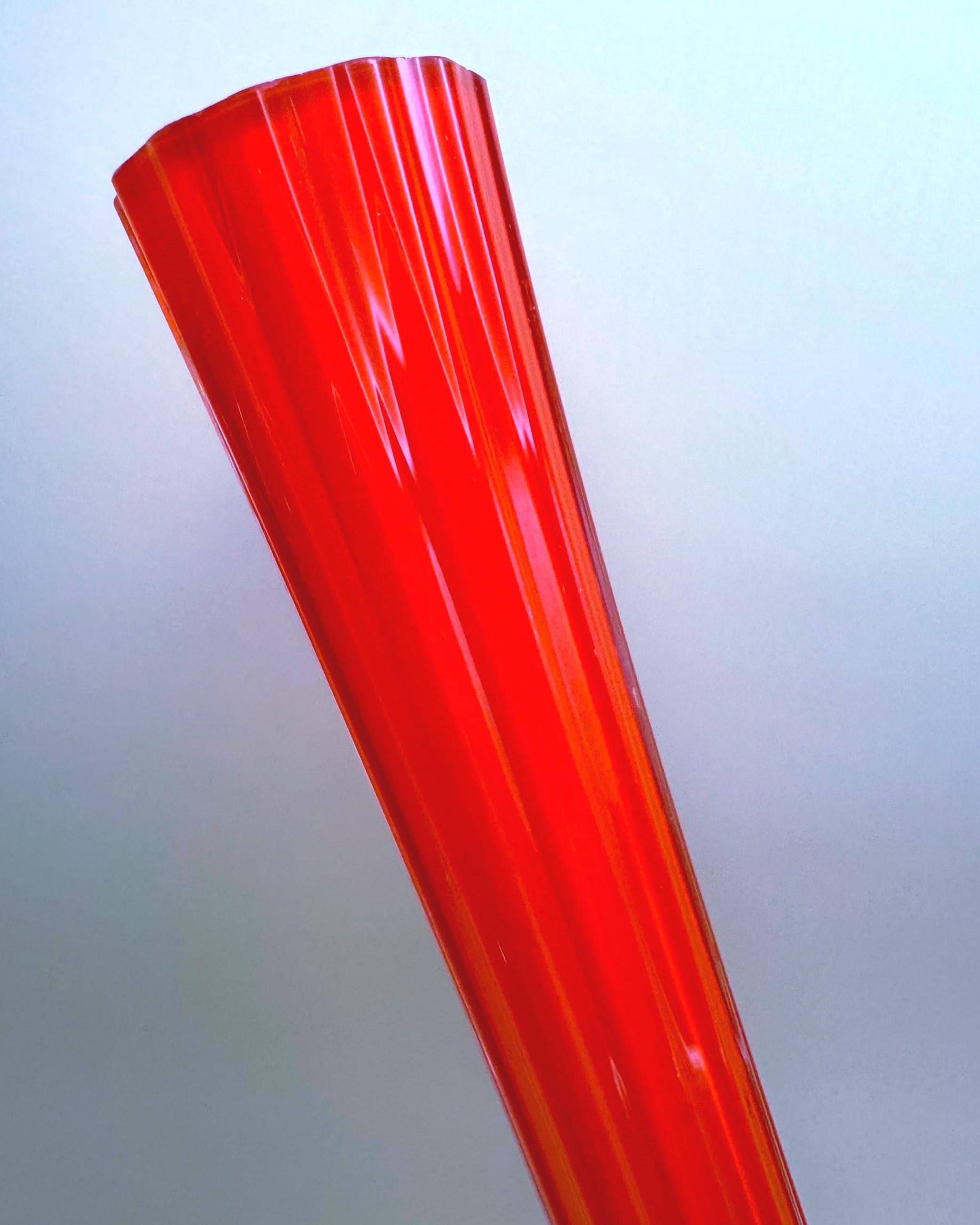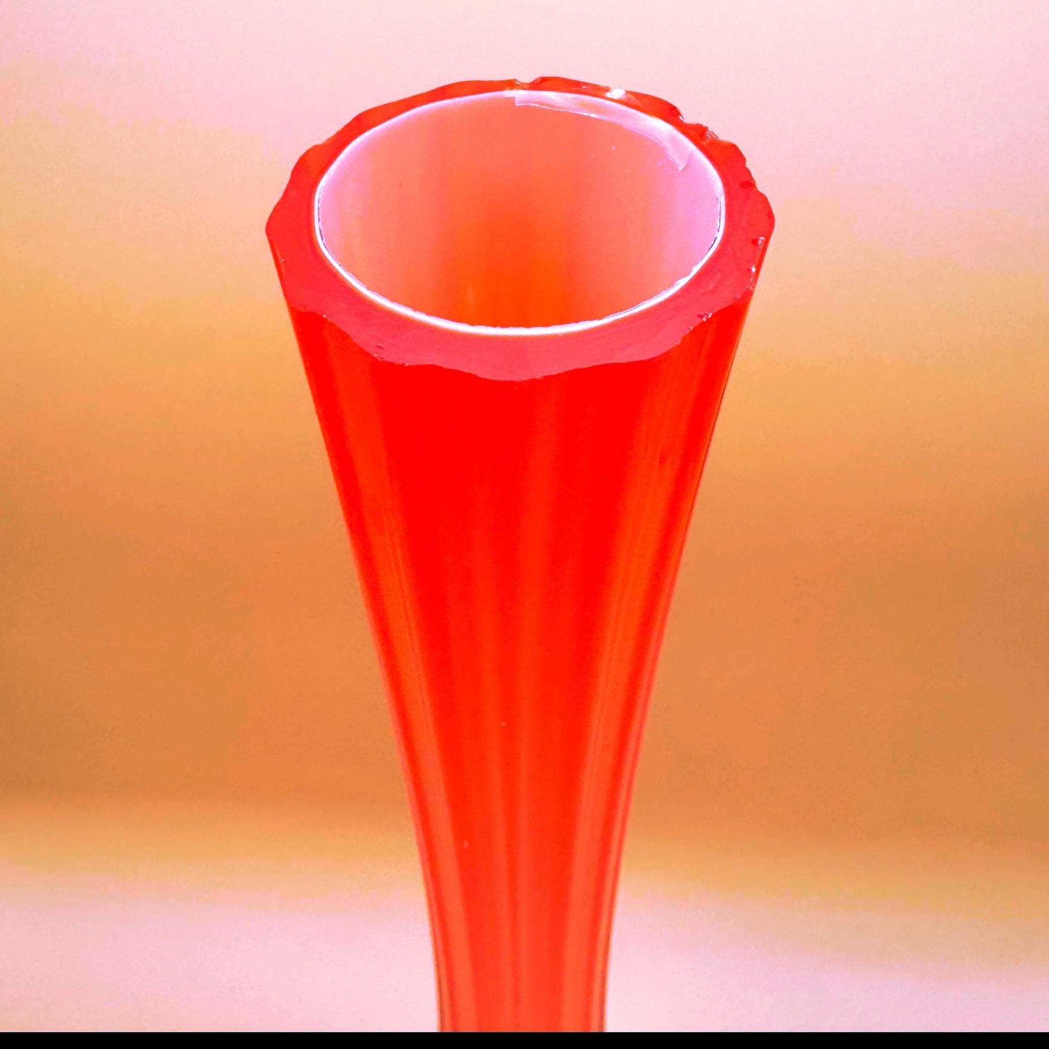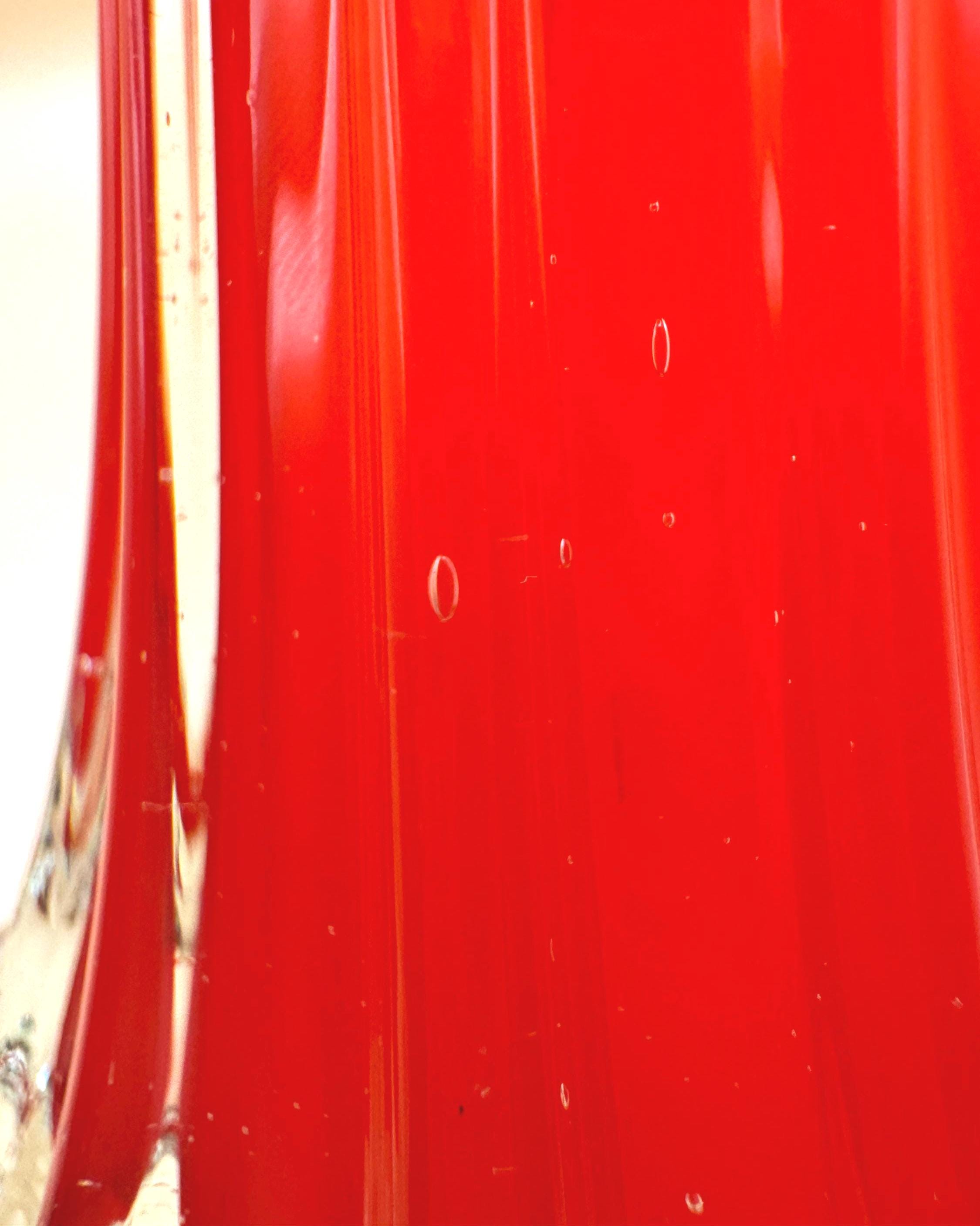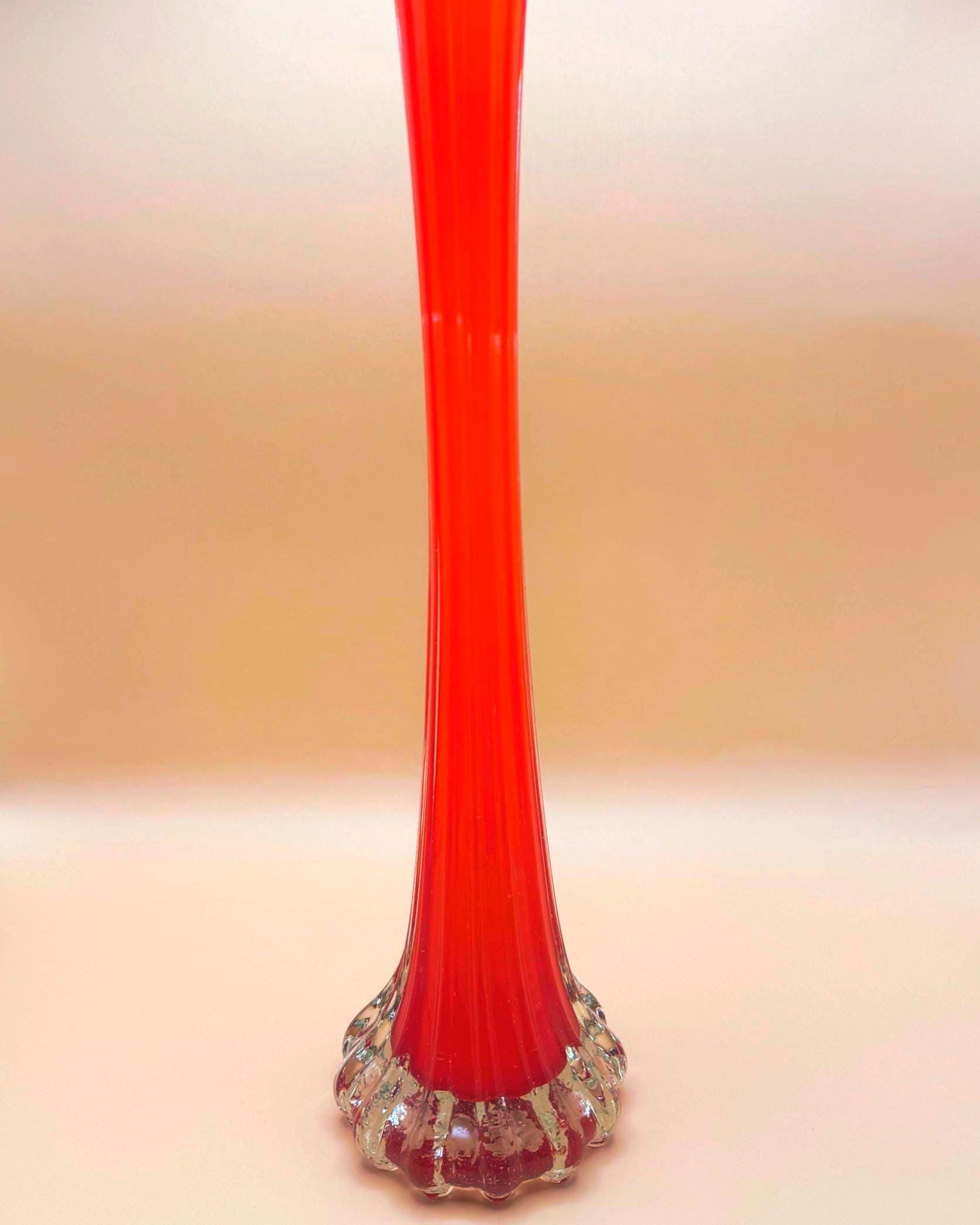This striking vintage art glass vase features a vibrant red body with a beautifully fluted silhouette that tapers elegantly toward the top. The clear glass base adds contrast and dimension, giving it a sculptural, eye-catching presence.
