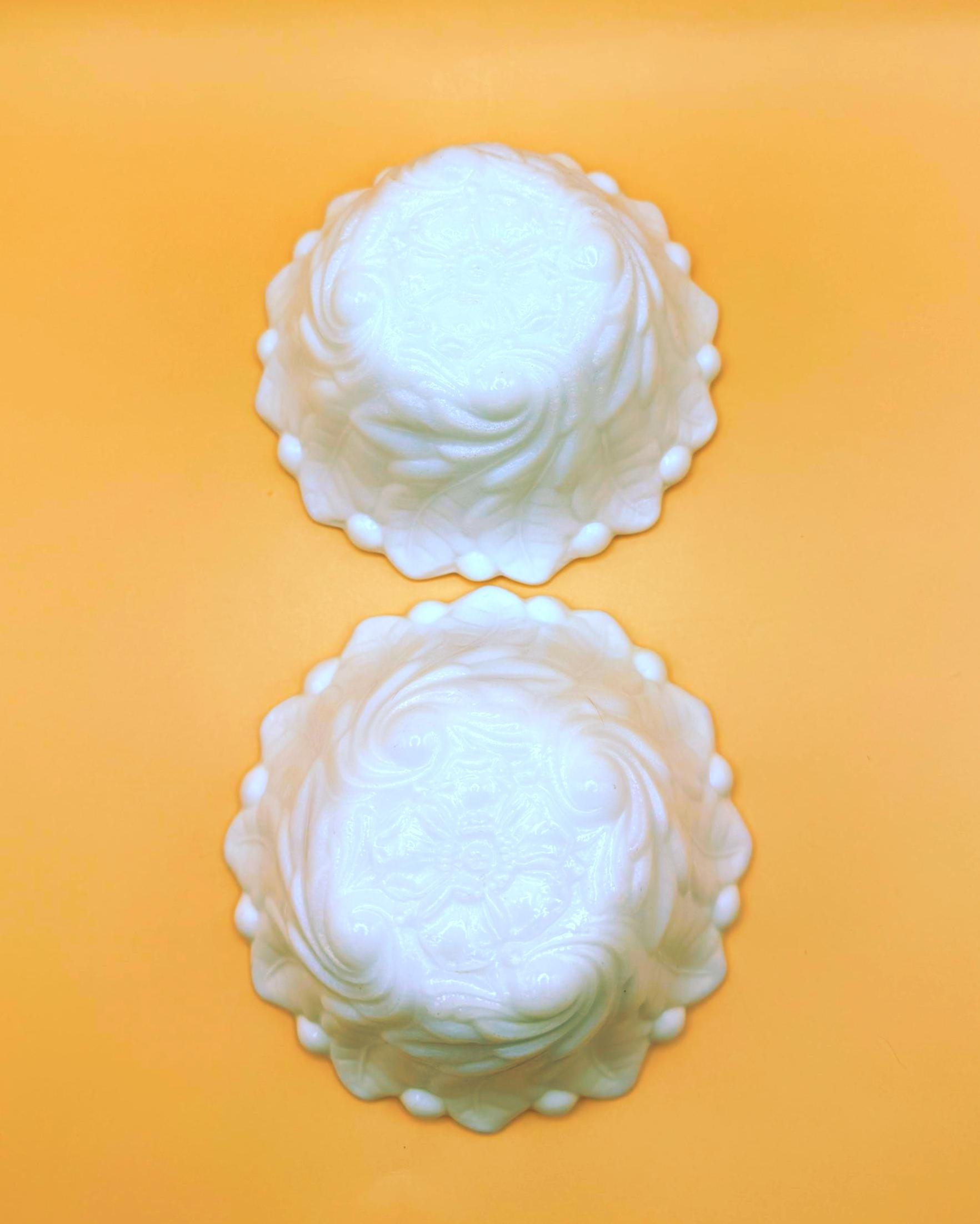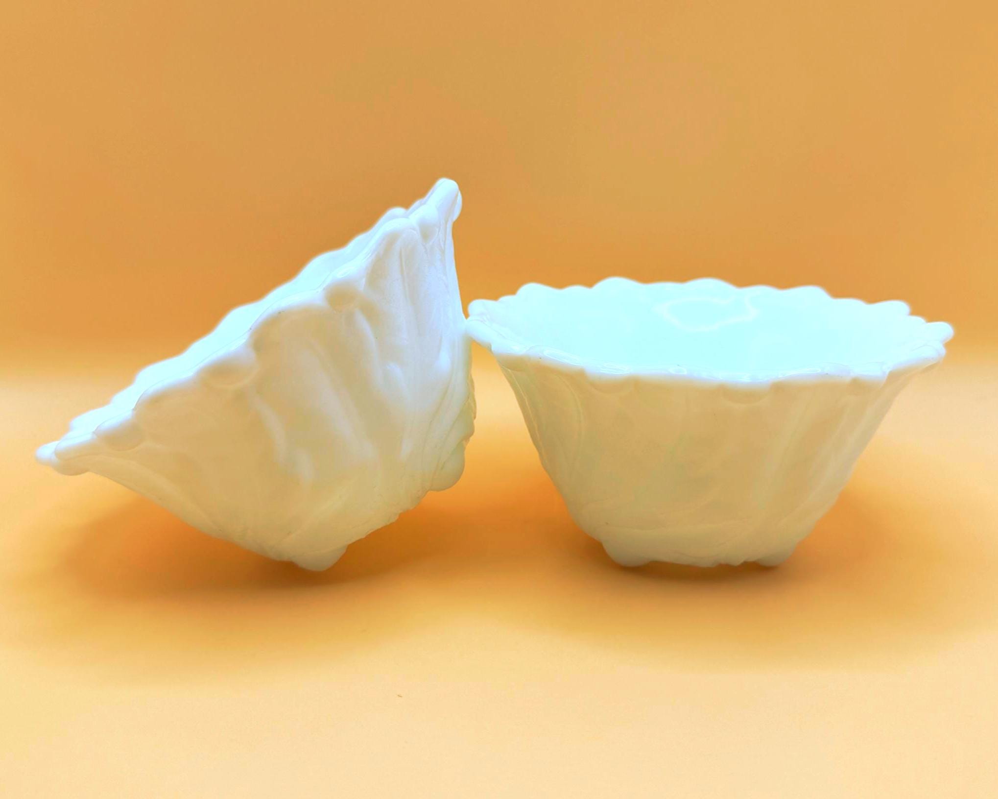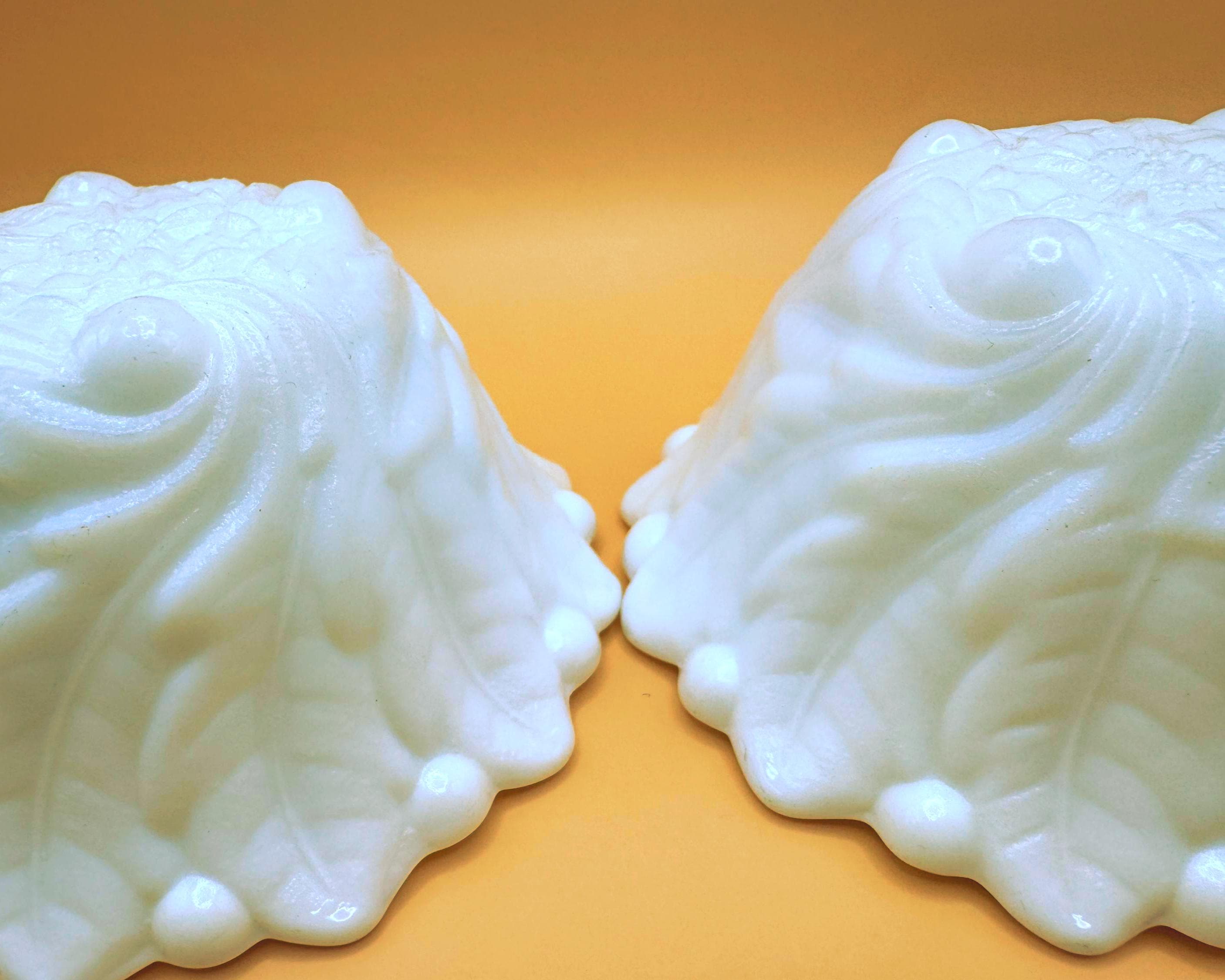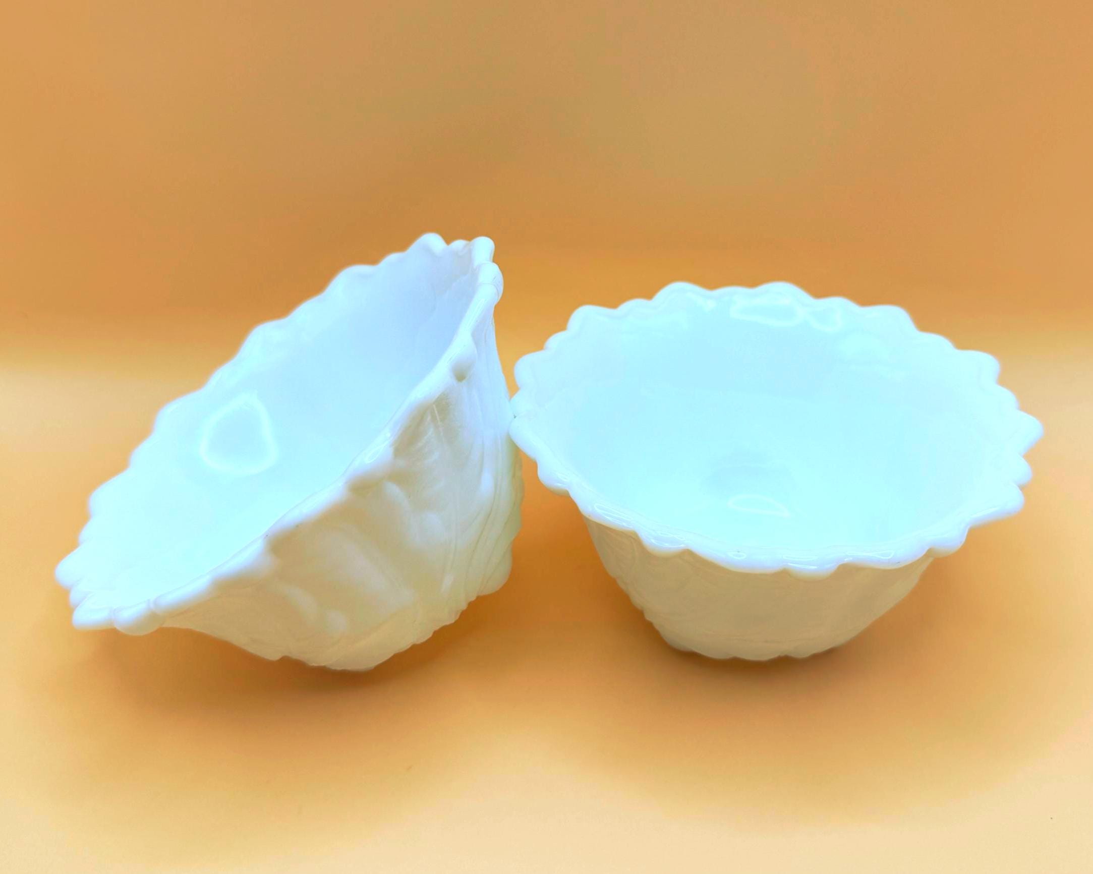 This beautiful set of two vintage milk glass bowls features a classic raised grape and leaf pattern with a softly scalloped edge.