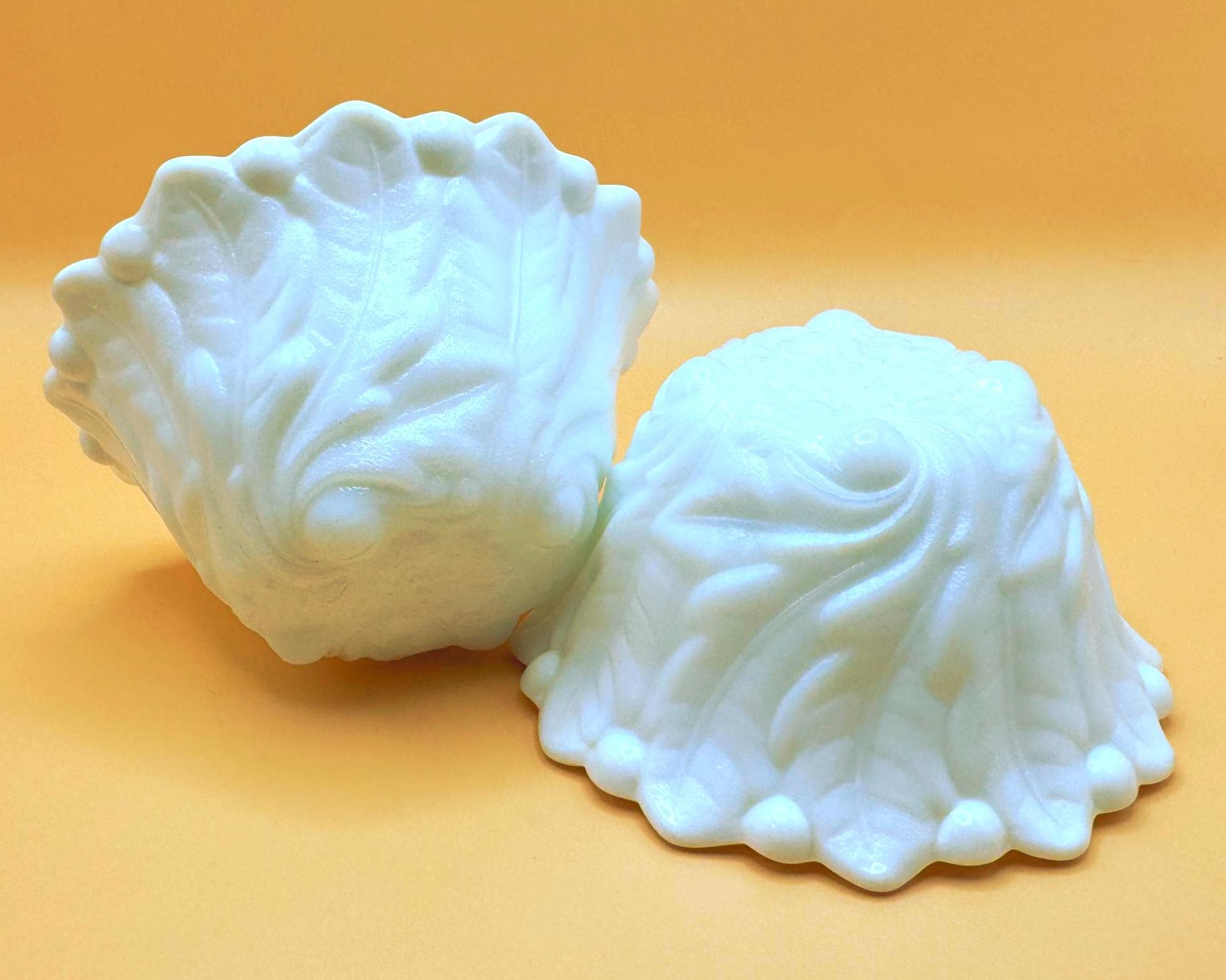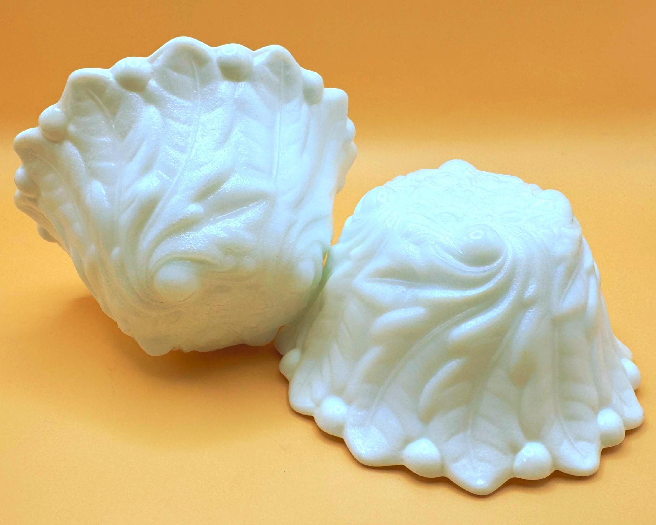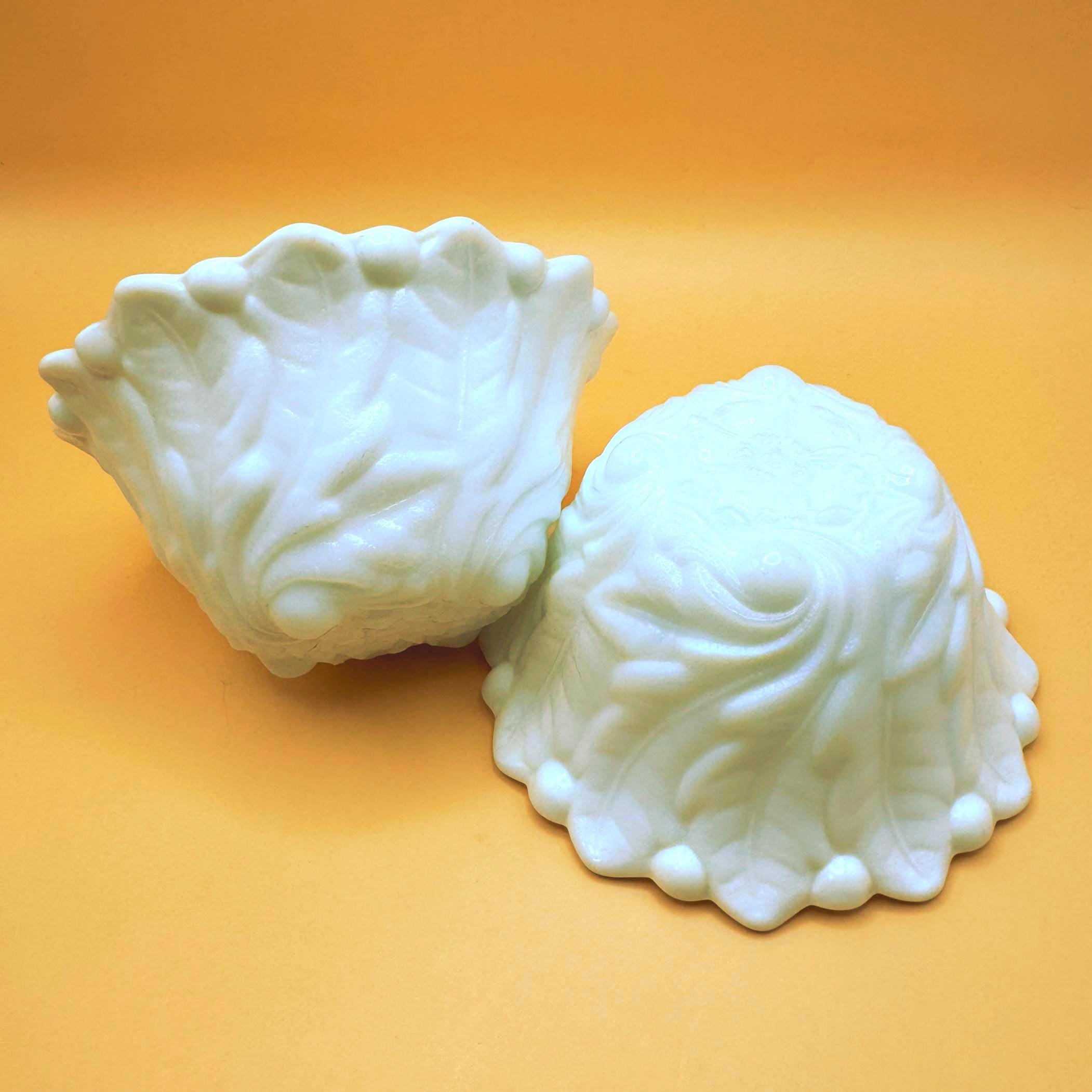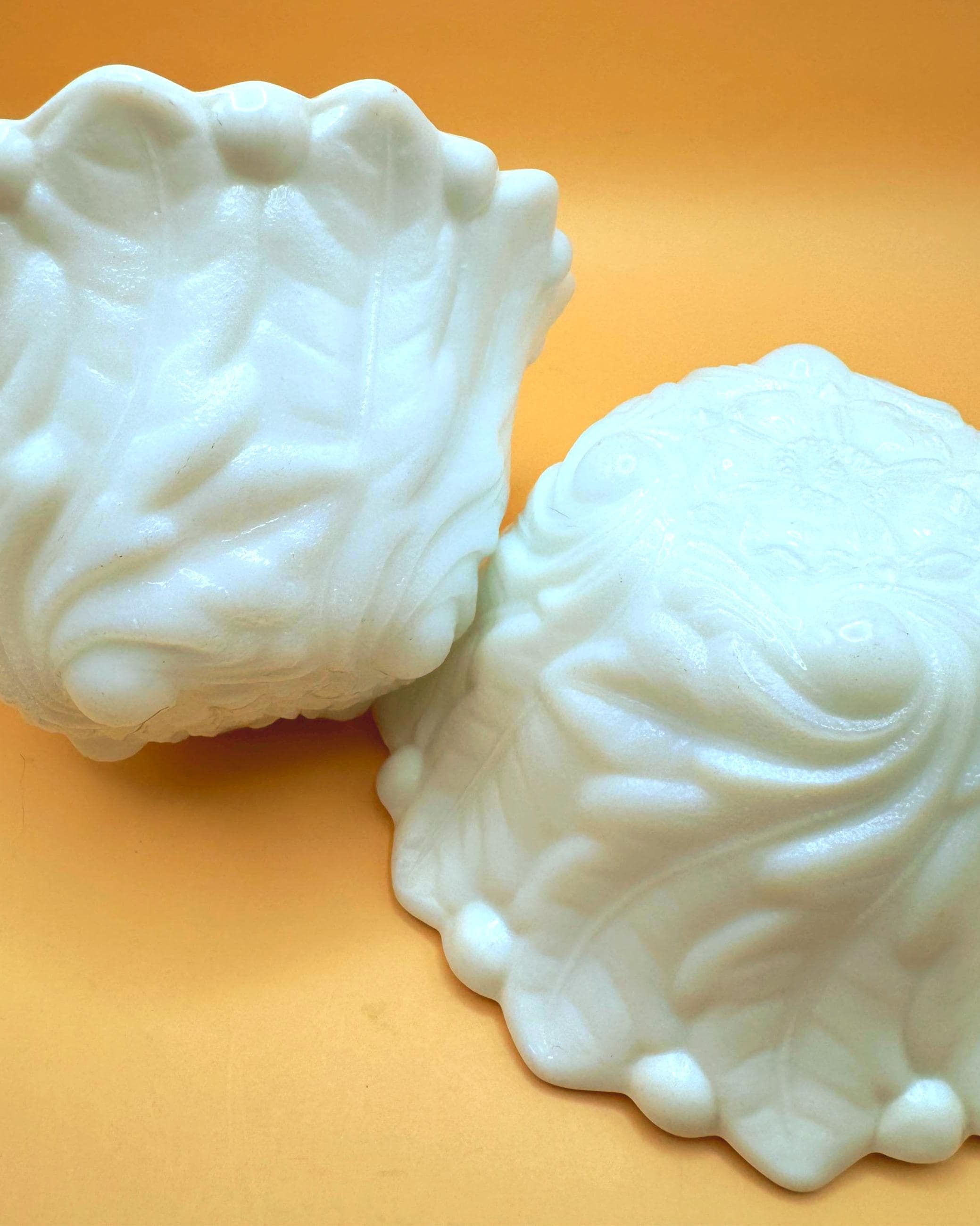 This beautiful set of two vintage milk glass bowls features a classic raised grape and leaf pattern with a softly scalloped edge.