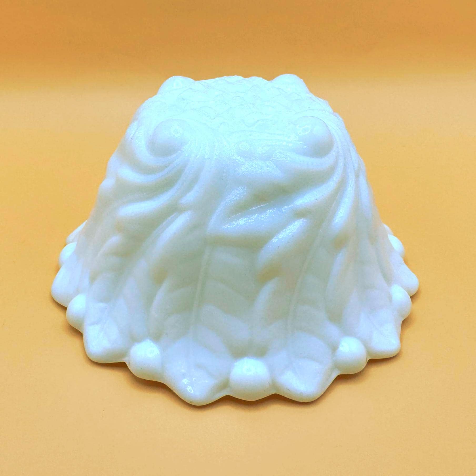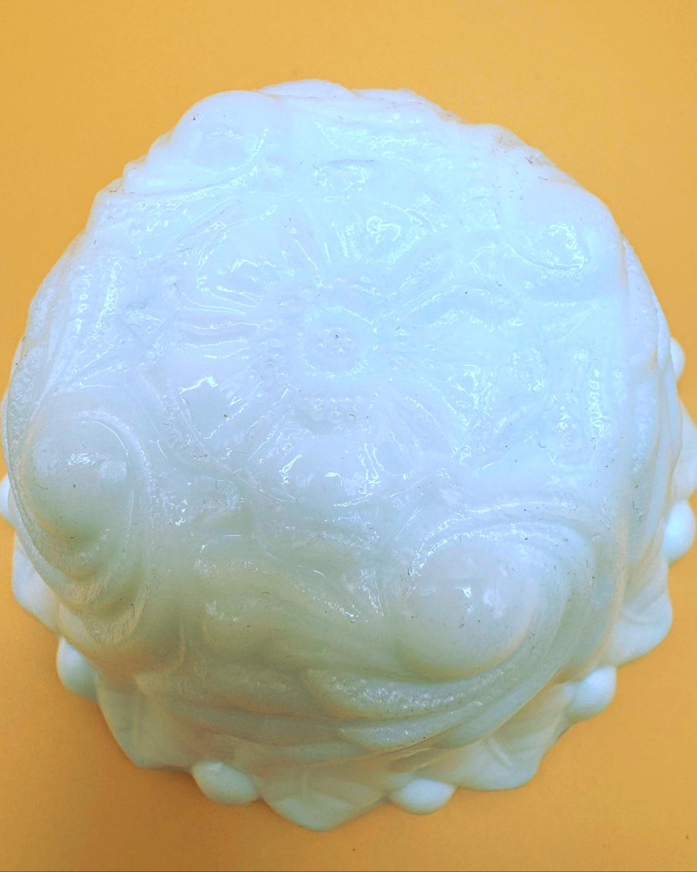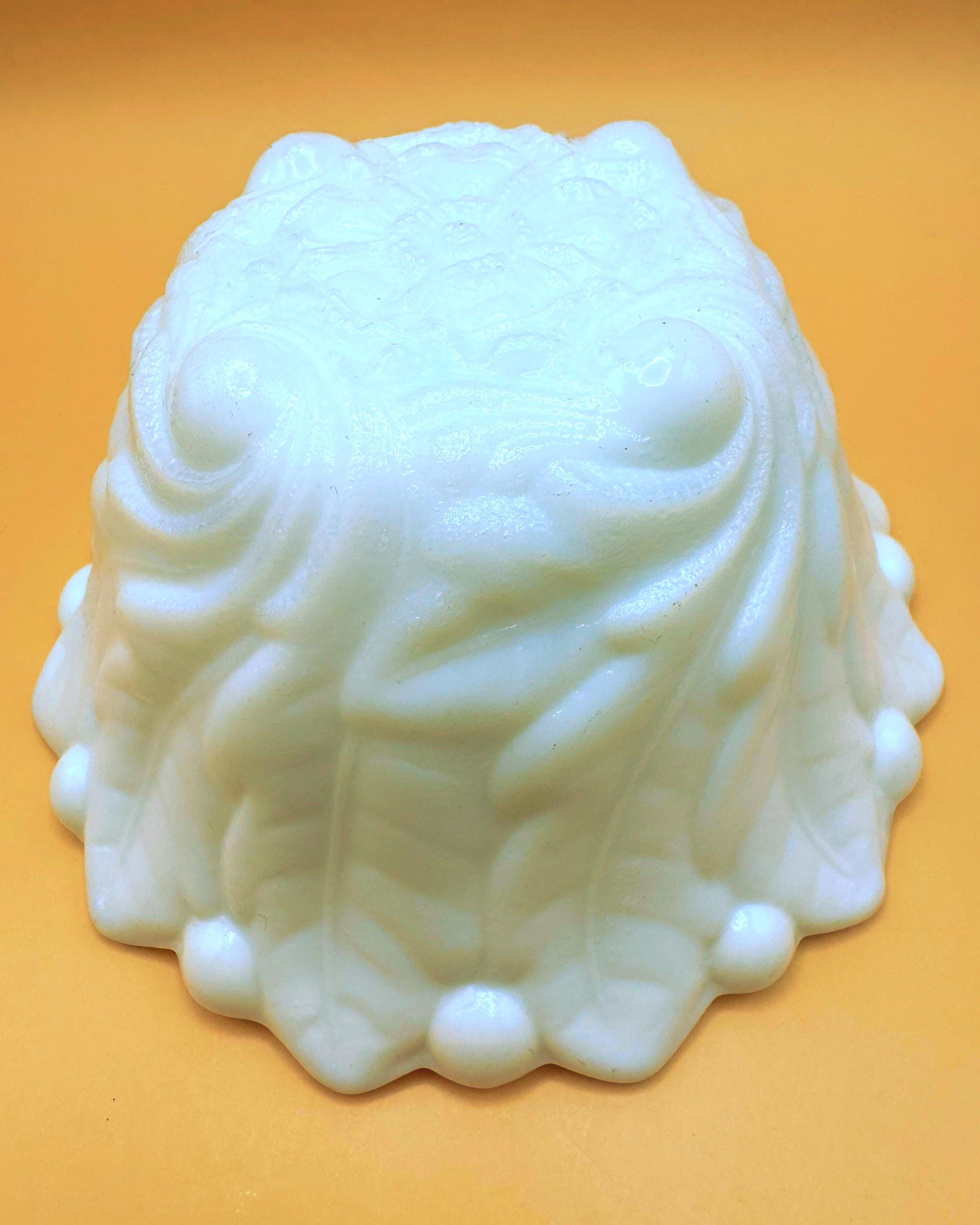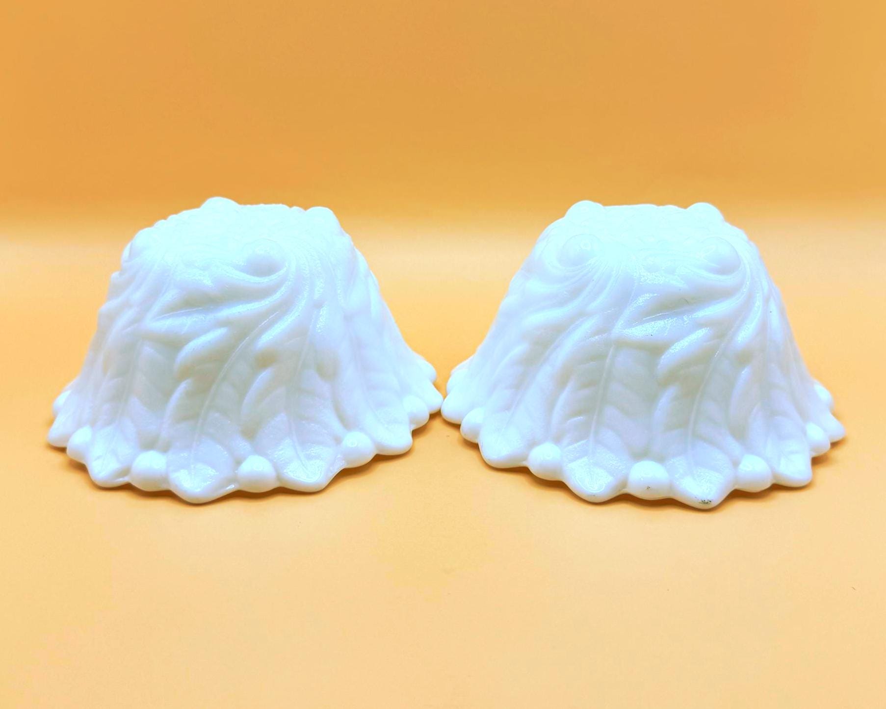 This beautiful set of two vintage milk glass bowls features a classic raised grape and leaf pattern with a softly scalloped edge.