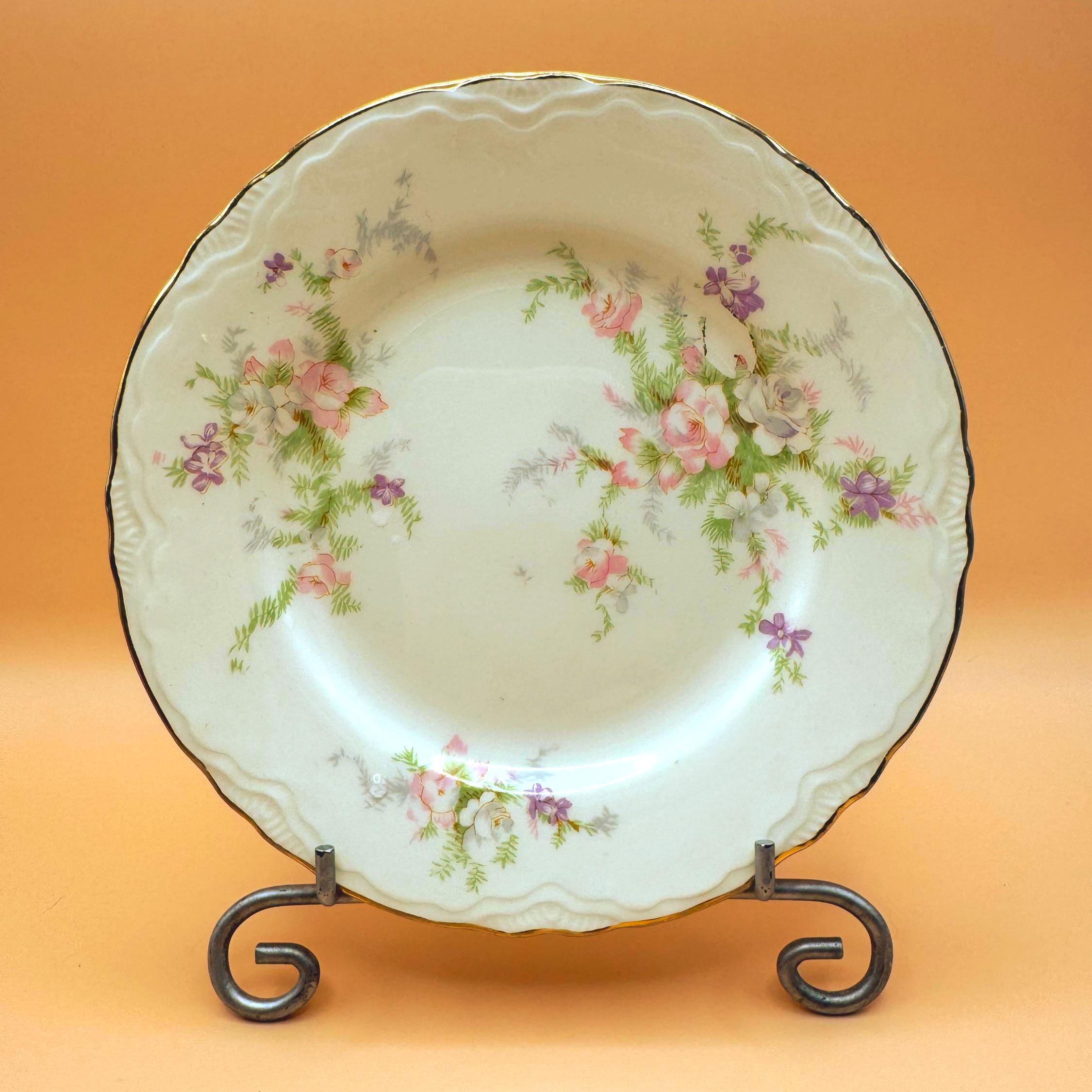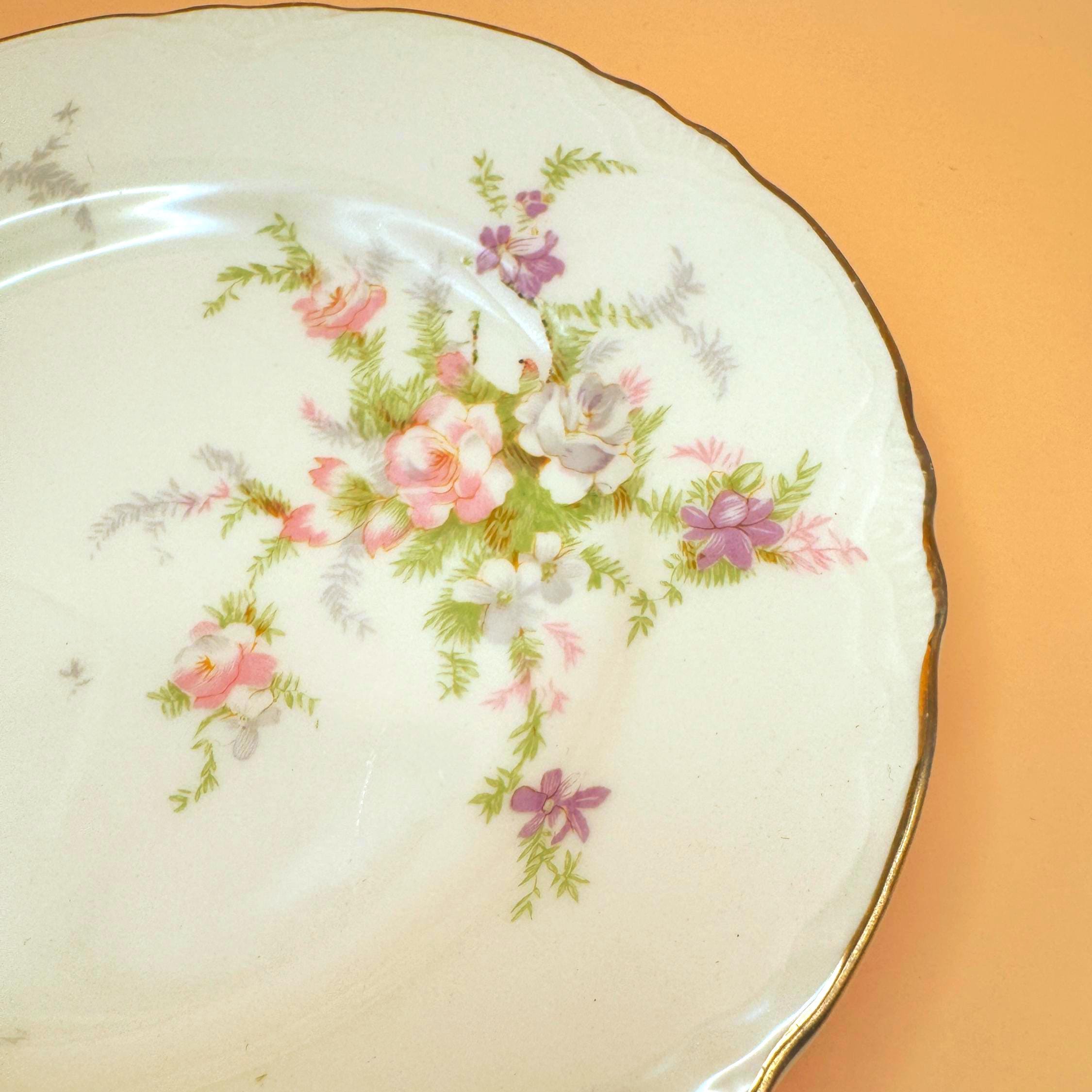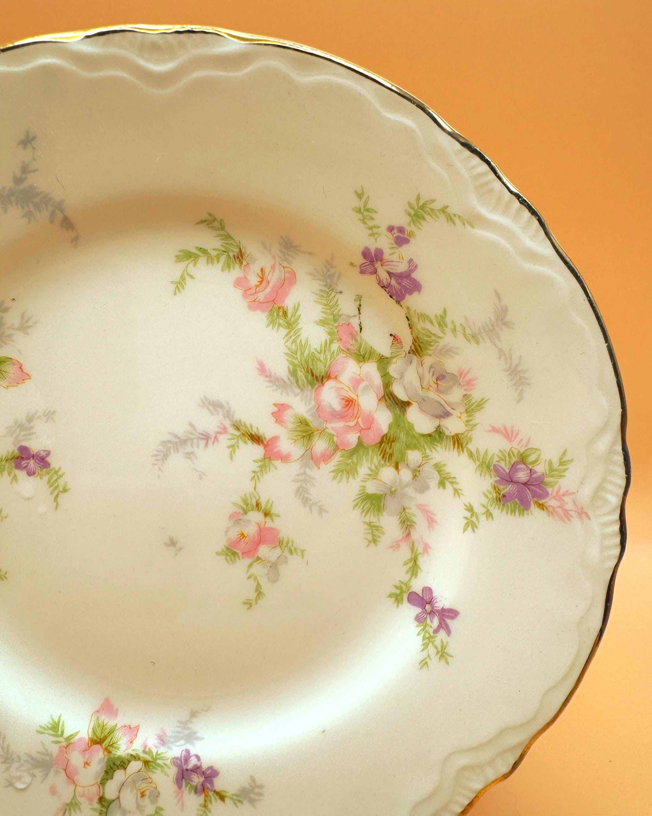 These beautiful vintage dessert plates feature a soft ivory porcelain base accented with delicate pastel florals and finished with an elegant gold gilt rim. Their timeless design makes them perfect for everyday use, entertaining, or adding a romantic vintage touch to your table.