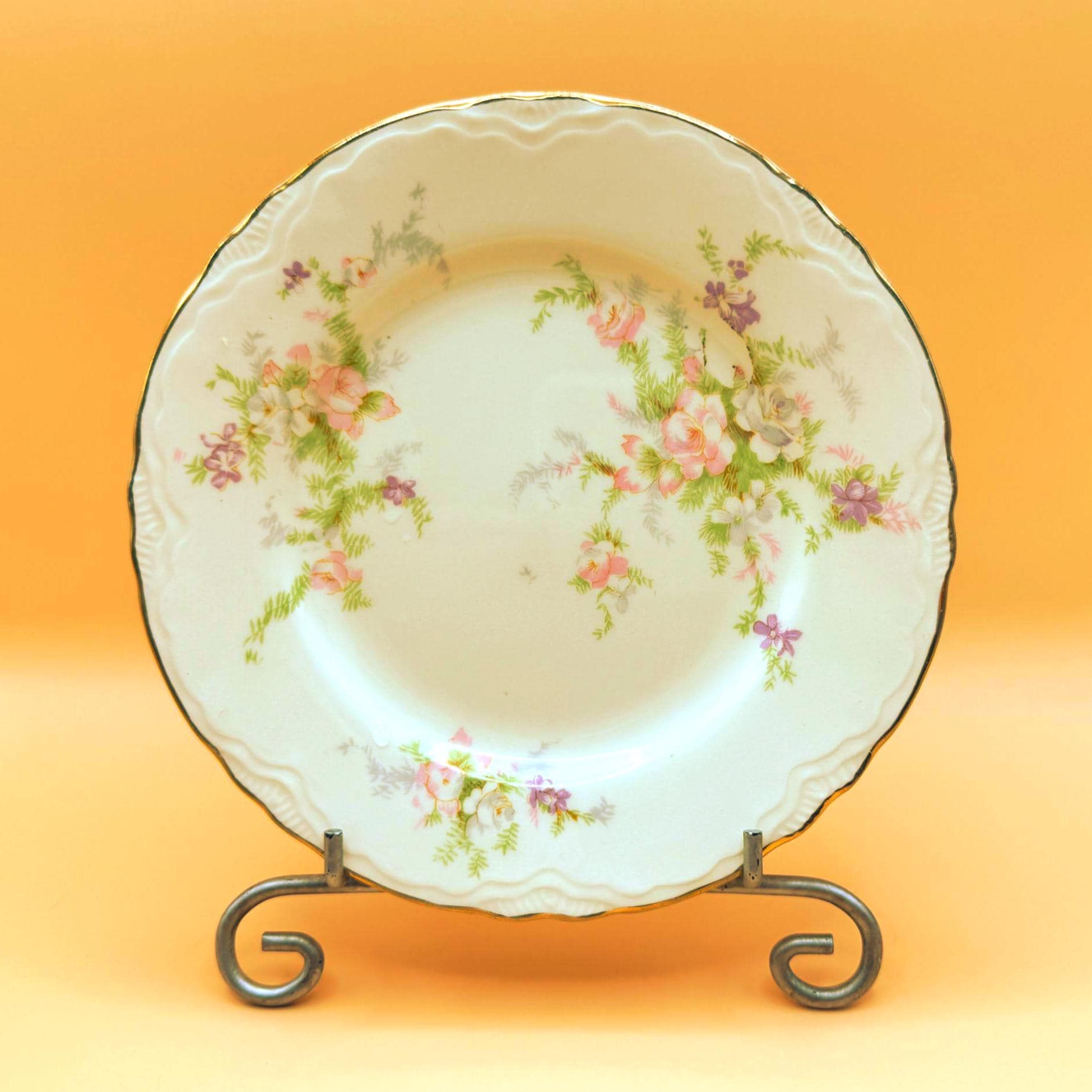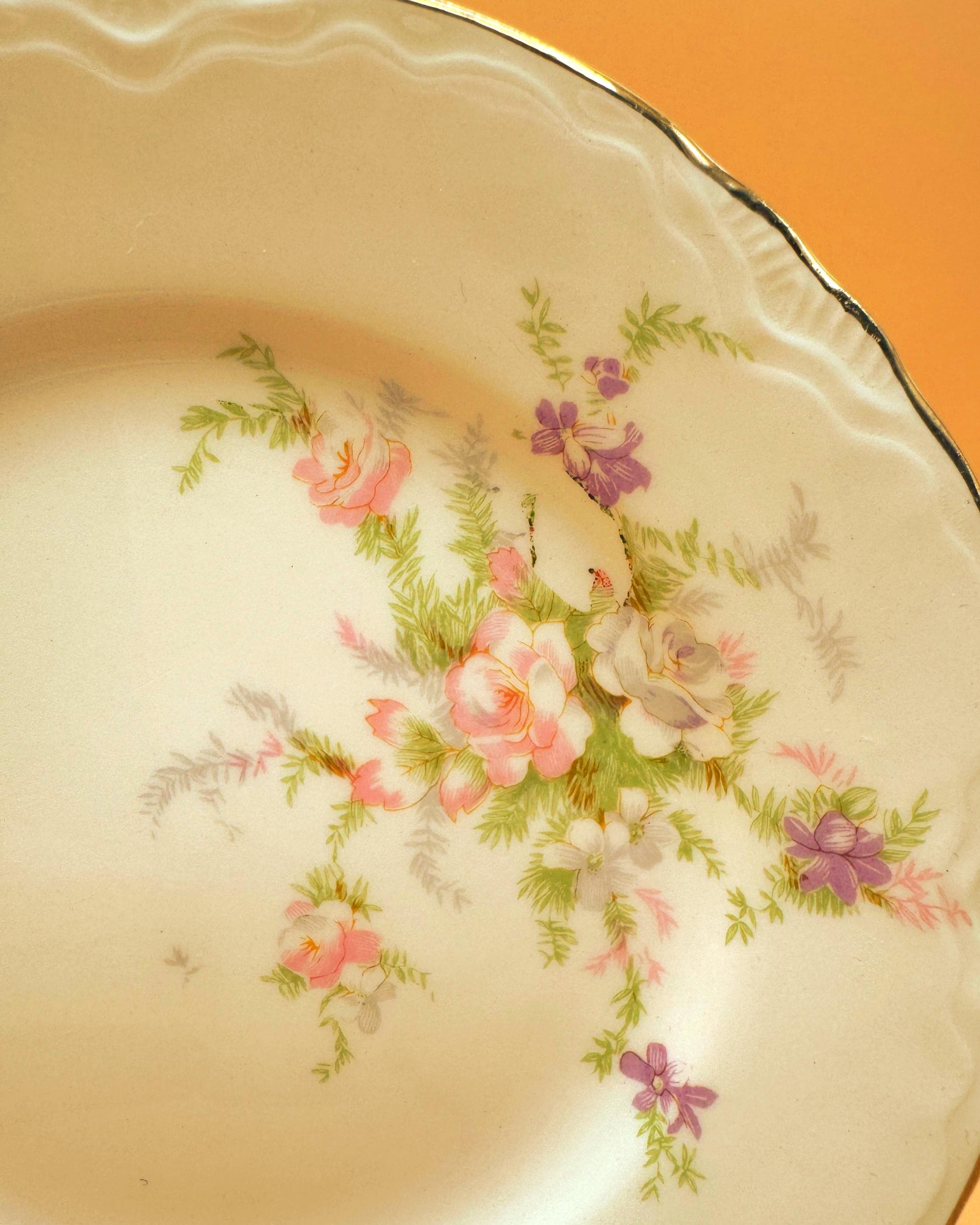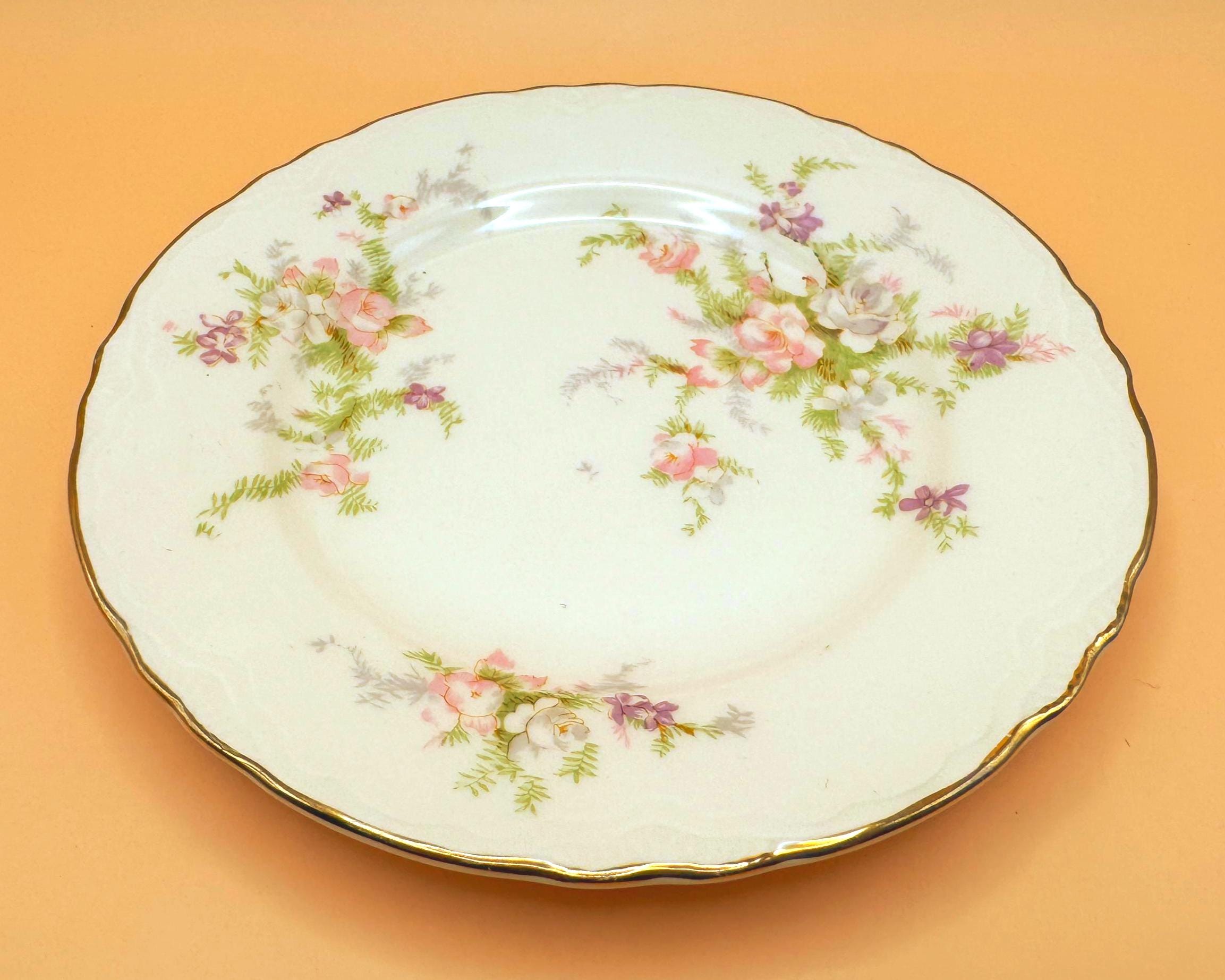 These beautiful vintage dessert plates feature a soft ivory porcelain base accented with delicate pastel florals and finished with an elegant gold gilt rim. Their timeless design makes them perfect for everyday use, entertaining, or adding a romantic vintage touch to your table.