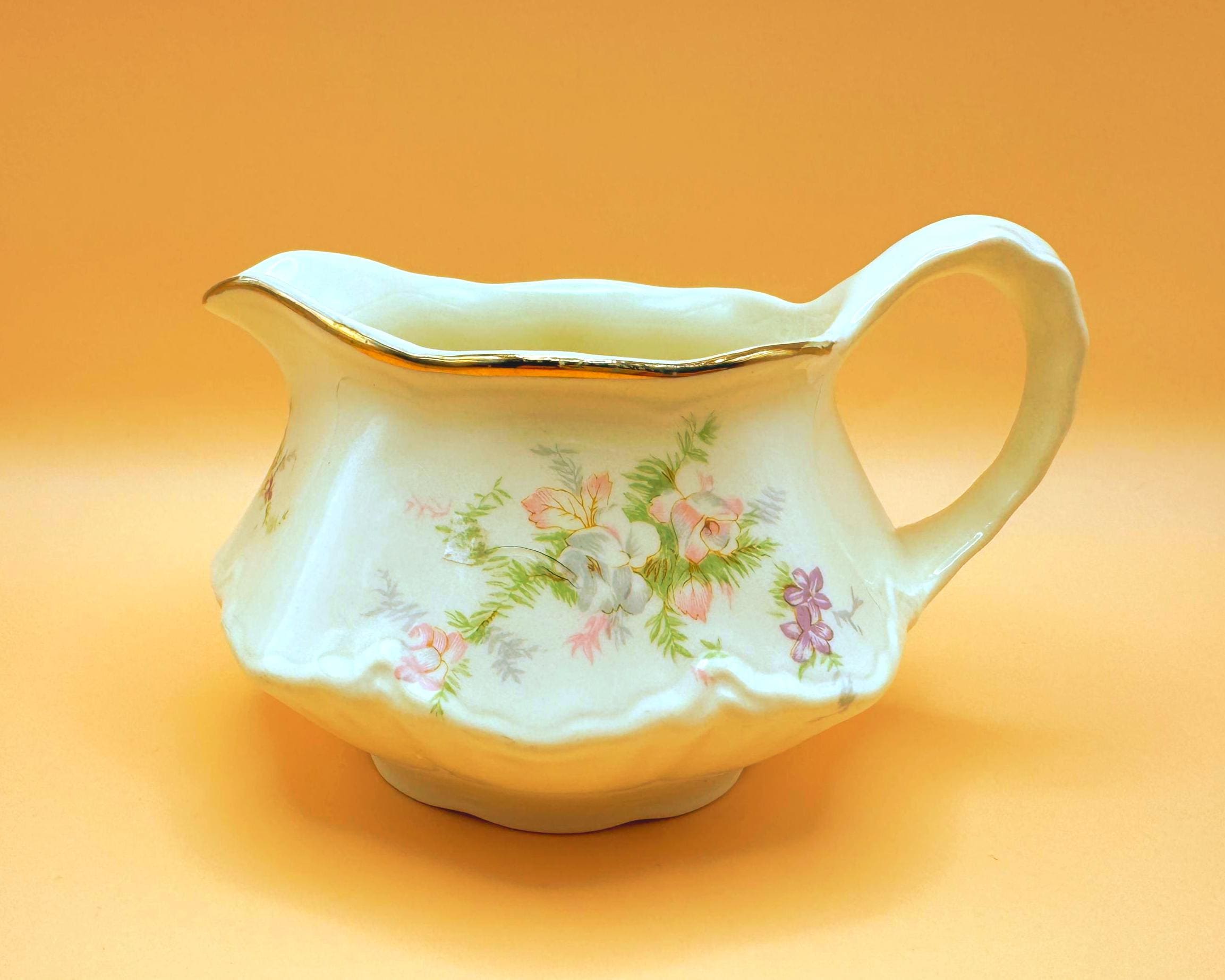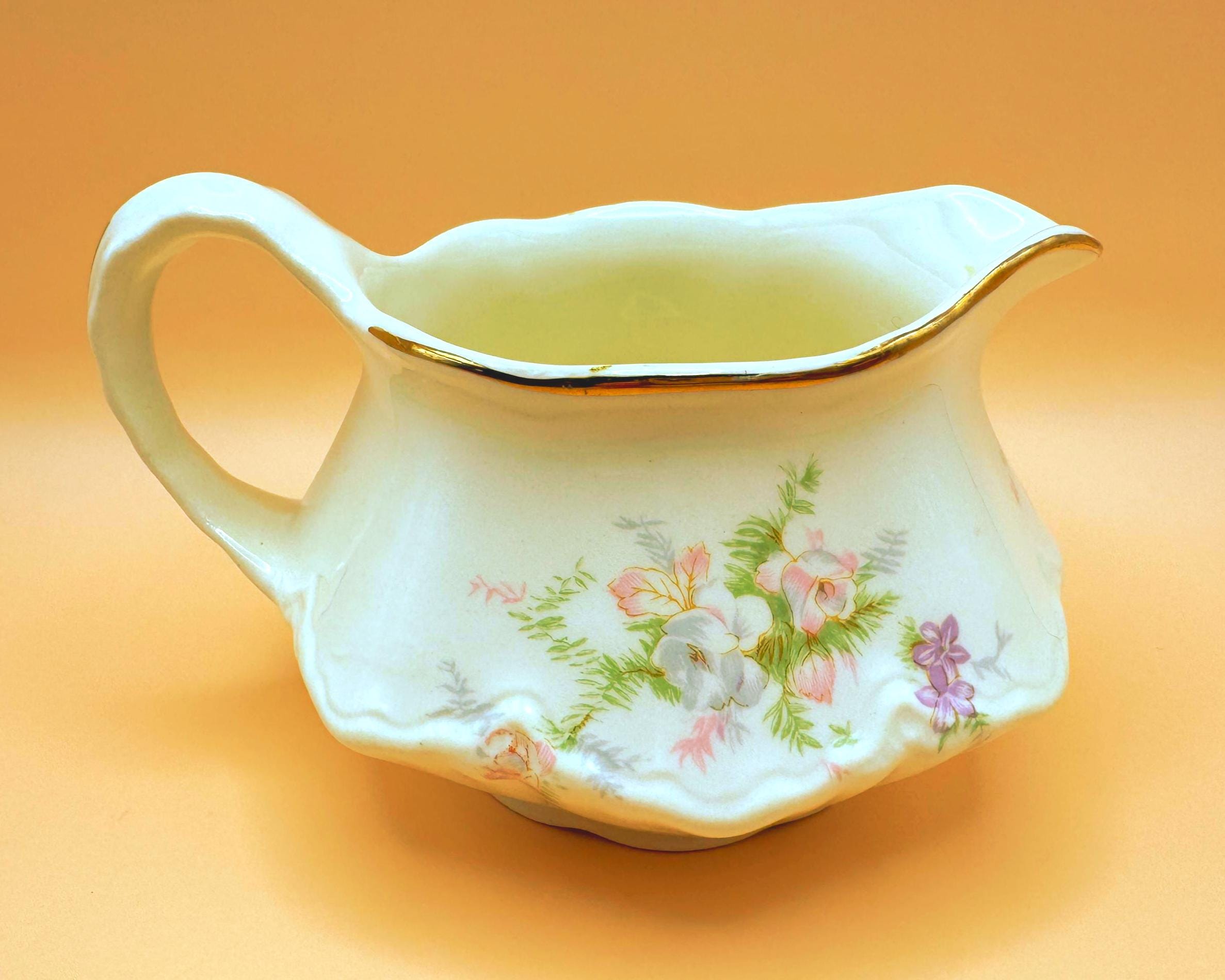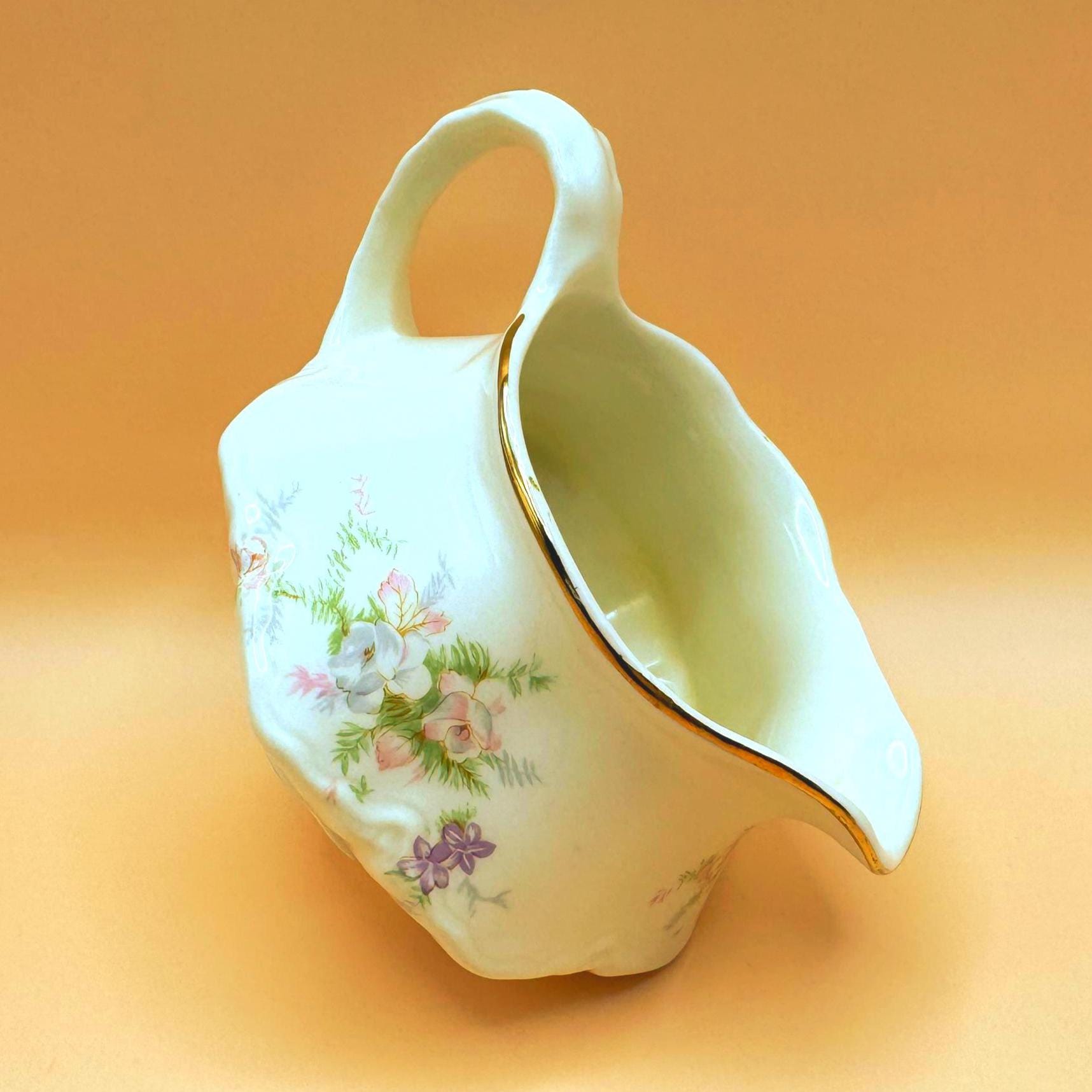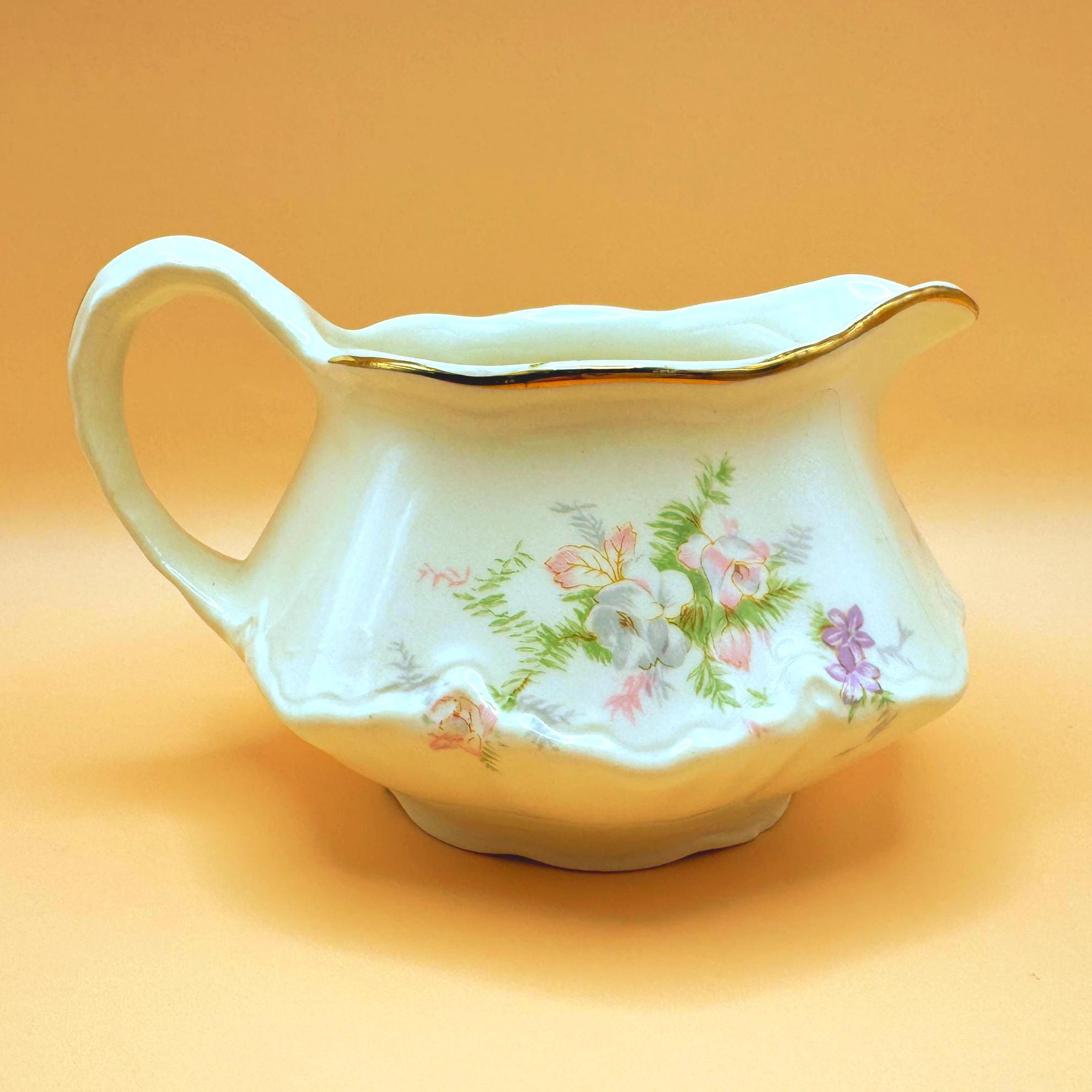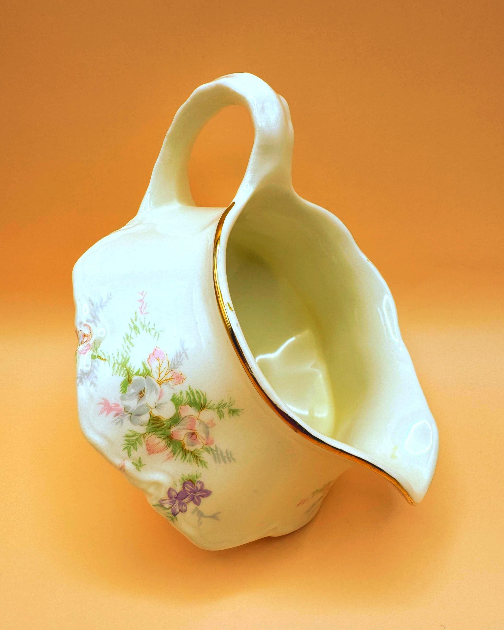 This charming vintage creamer features a soft ivory porcelain body adorned with delicate pastel florals and finished with a graceful gold trim. The gently scalloped shape and classic floral pattern give it a timeless cottage-style feel, perfect for display or everyday use.