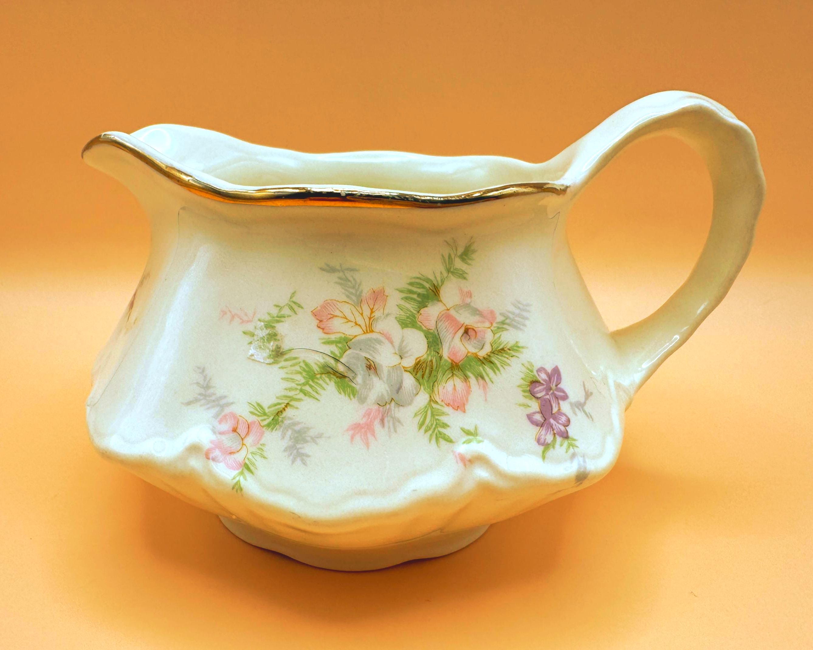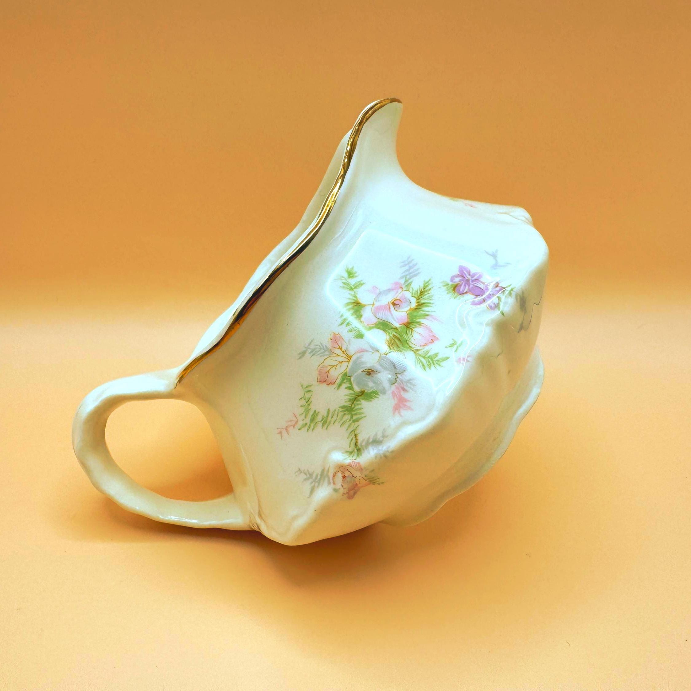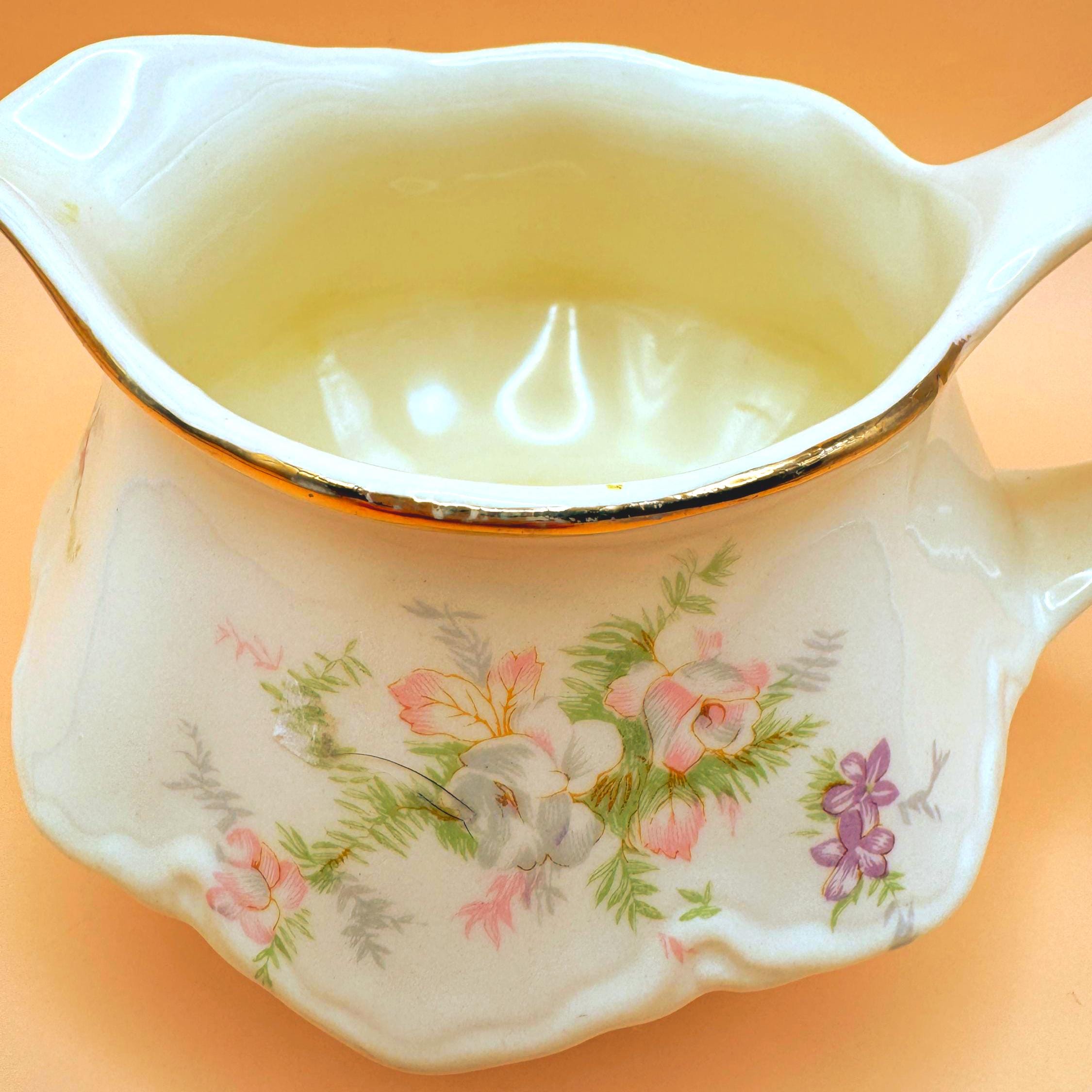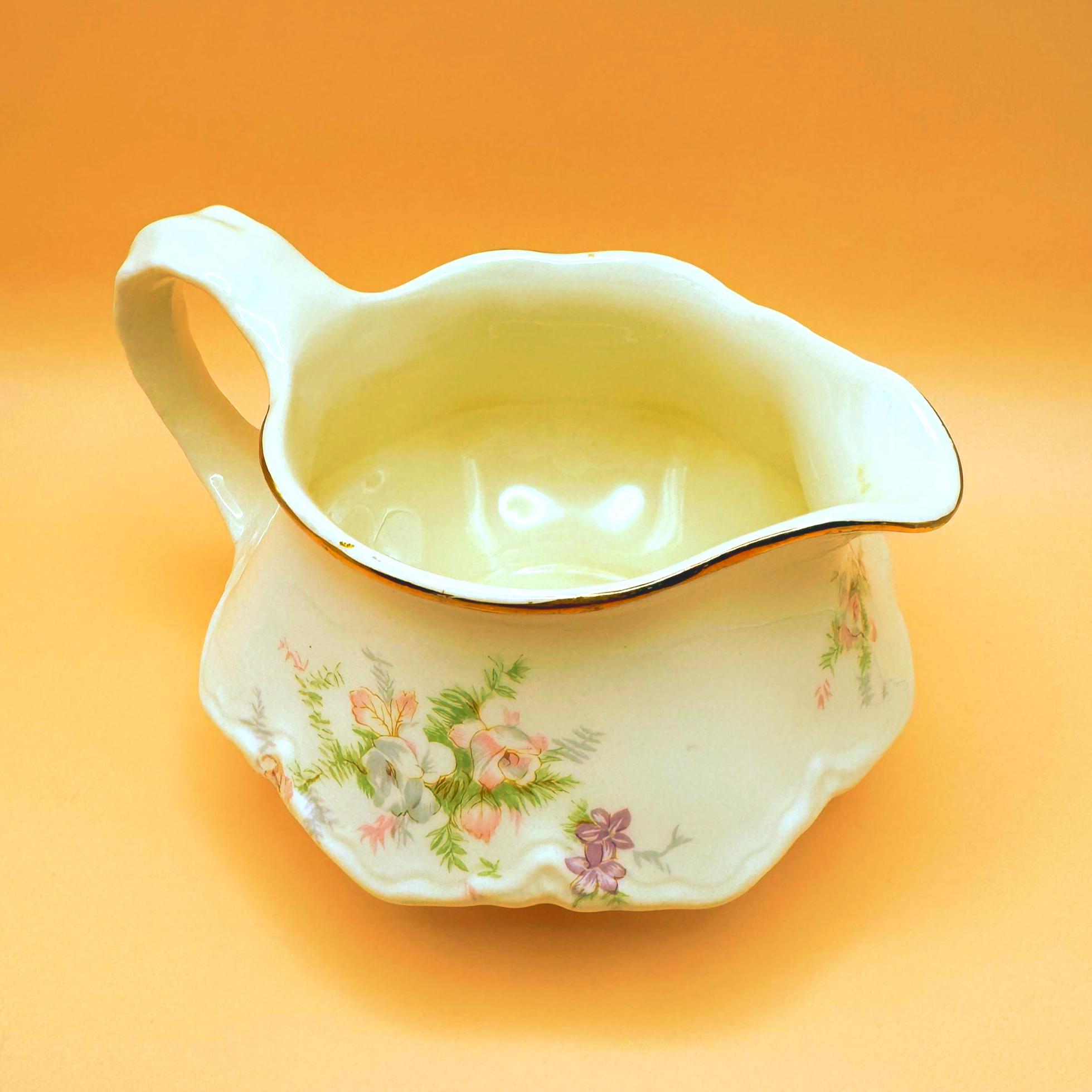 This charming vintage creamer features a soft ivory porcelain body adorned with delicate pastel florals and finished with a graceful gold trim. The gently scalloped shape and classic floral pattern give it a timeless cottage-style feel, perfect for display or everyday use.