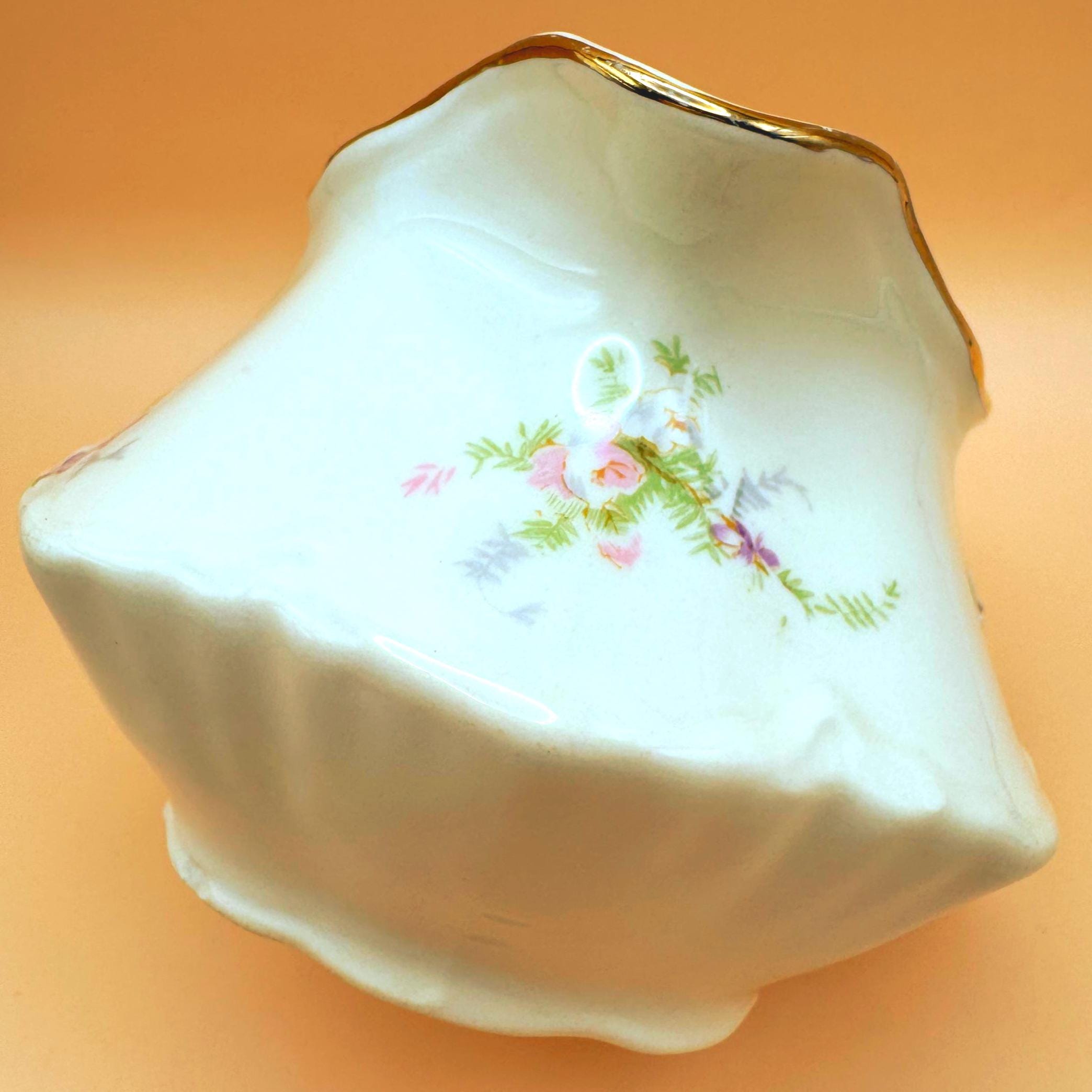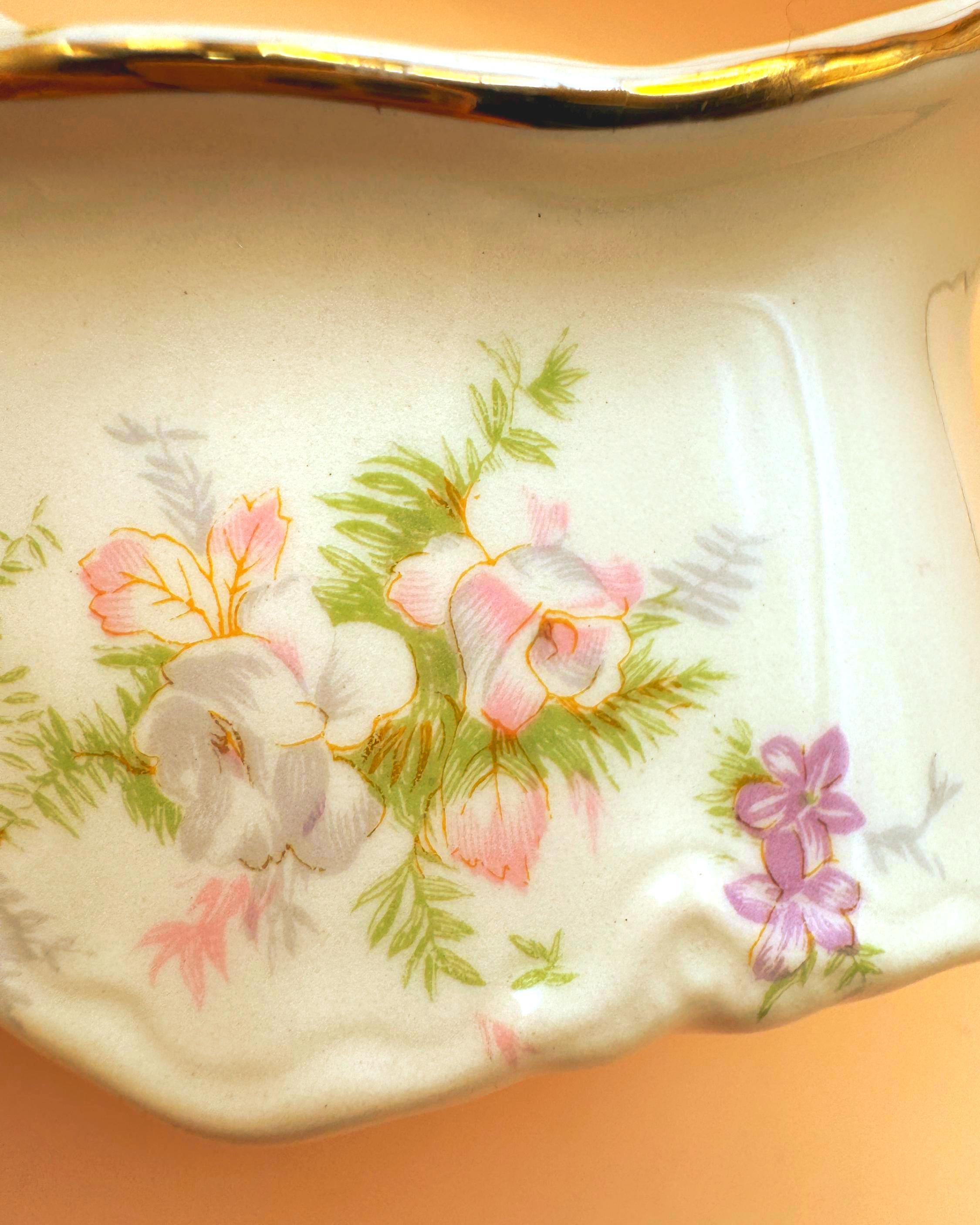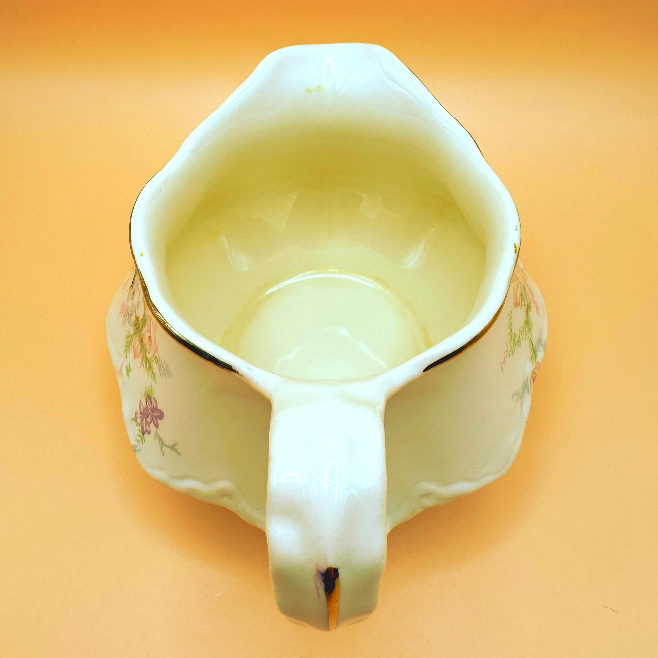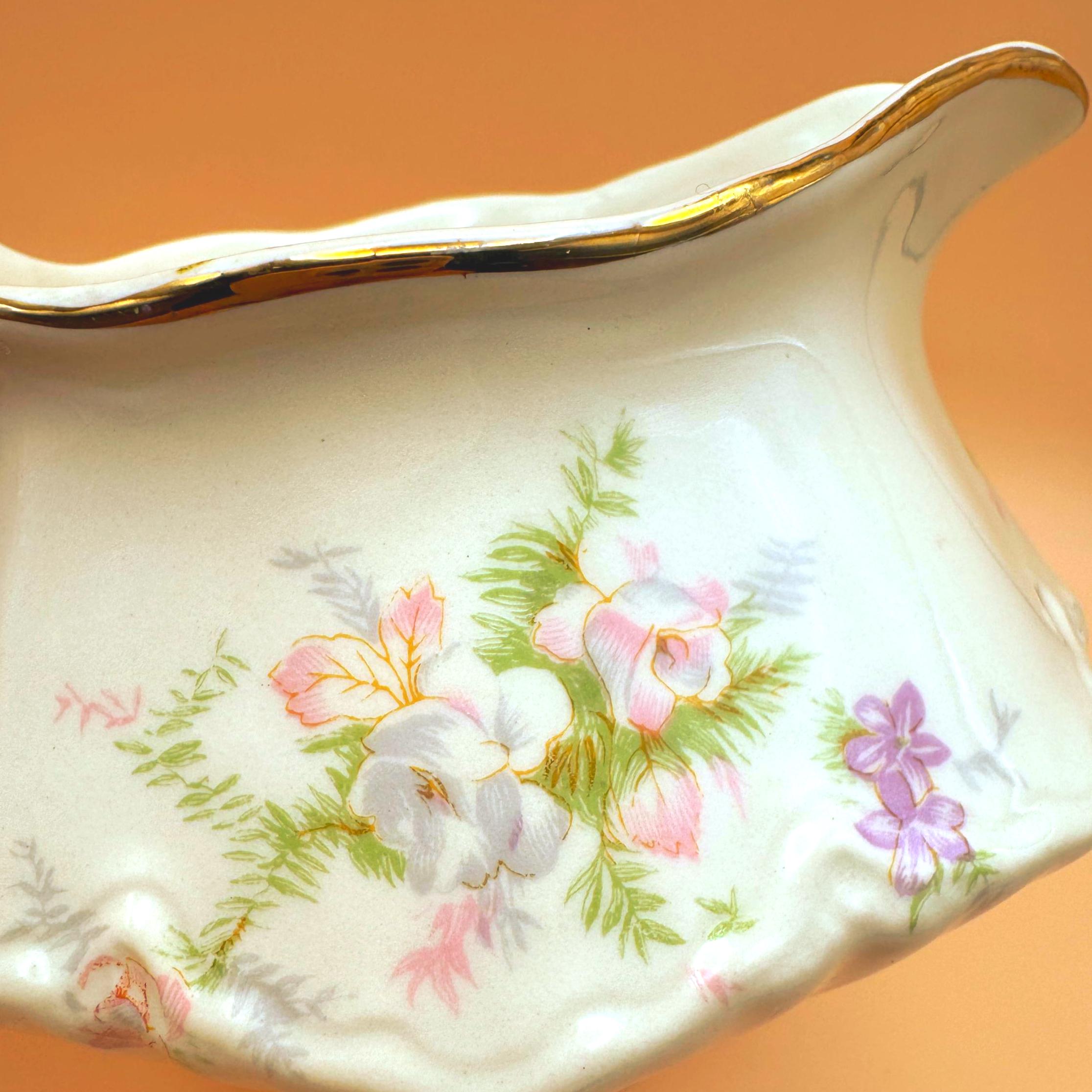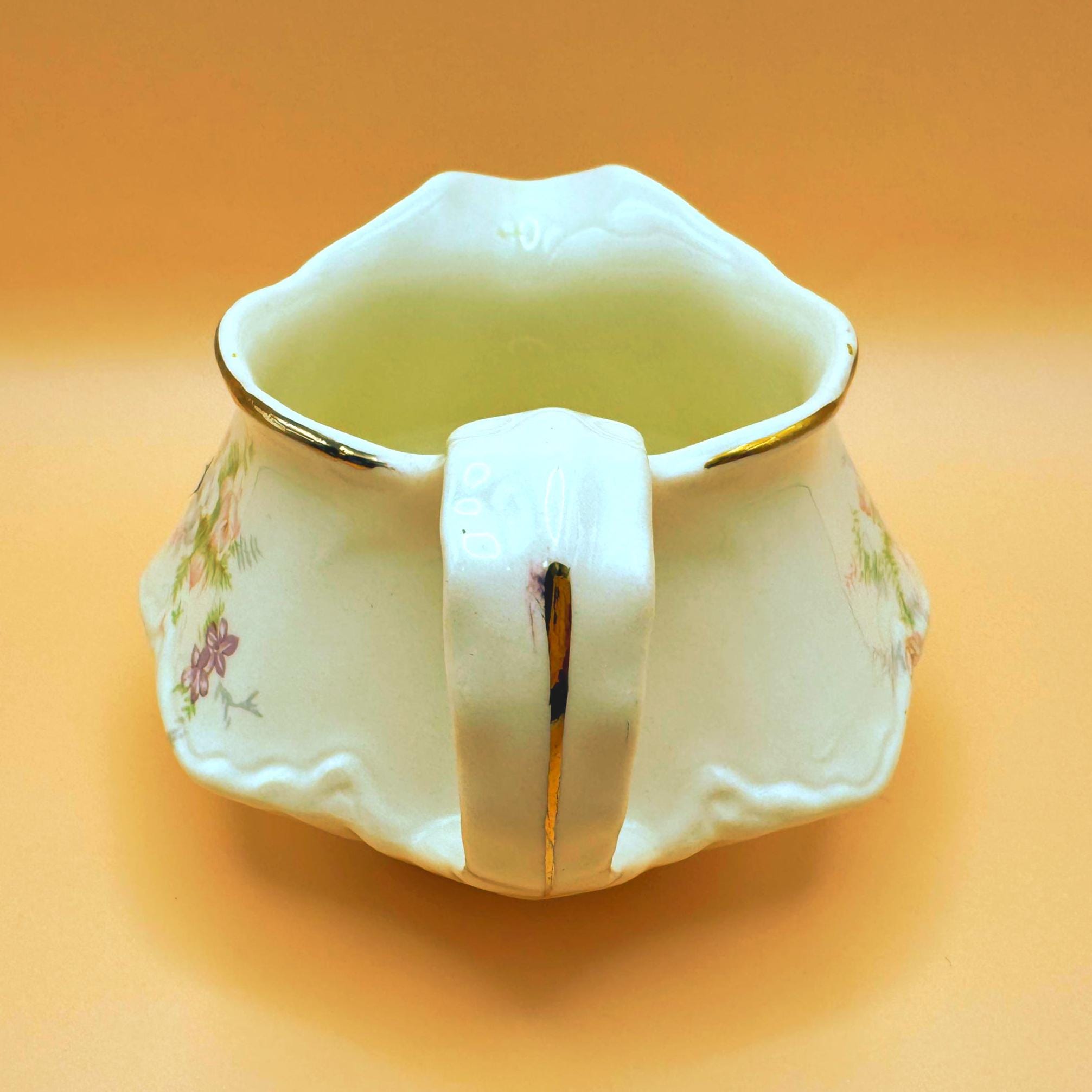 This charming vintage creamer features a soft ivory porcelain body adorned with delicate pastel florals and finished with a graceful gold trim. The gently scalloped shape and classic floral pattern give it a timeless cottage-style feel, perfect for display or everyday use.