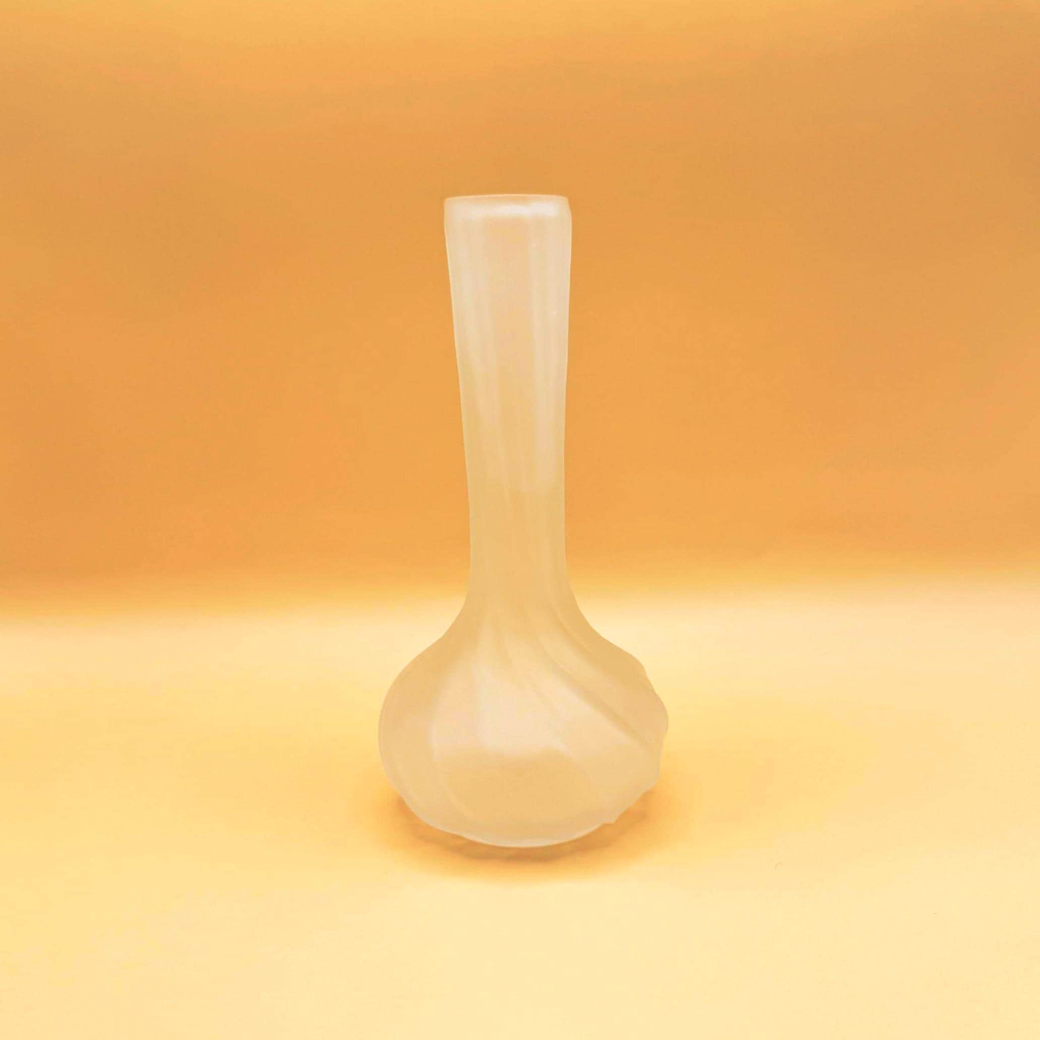 A charming vintage frosted glass bud vase with a soft swirl ribbed design and elegant silhouette. The gently twisted pattern flows from the narrow neck into a rounded, petal-like base, giving it a subtle sculptural look.