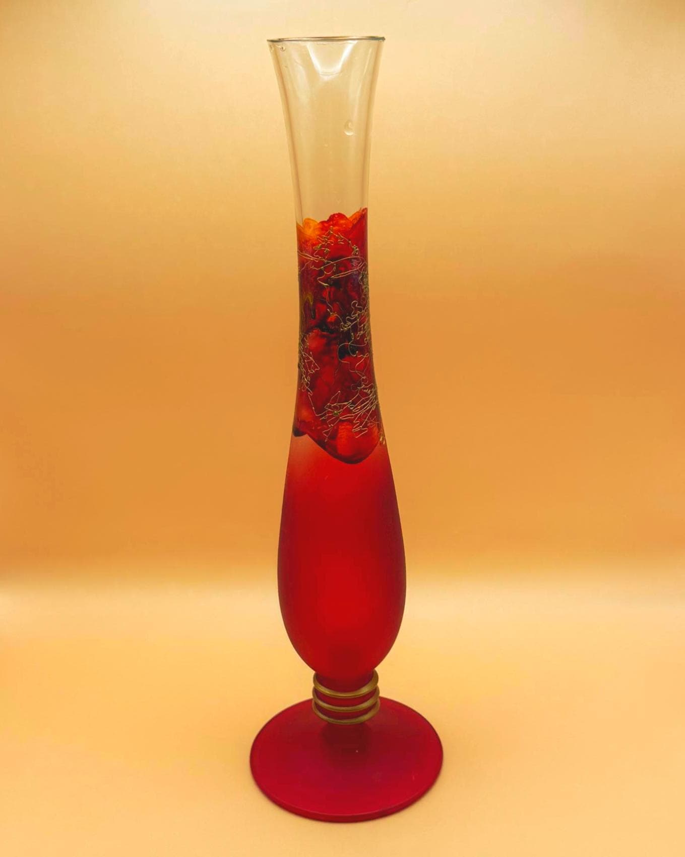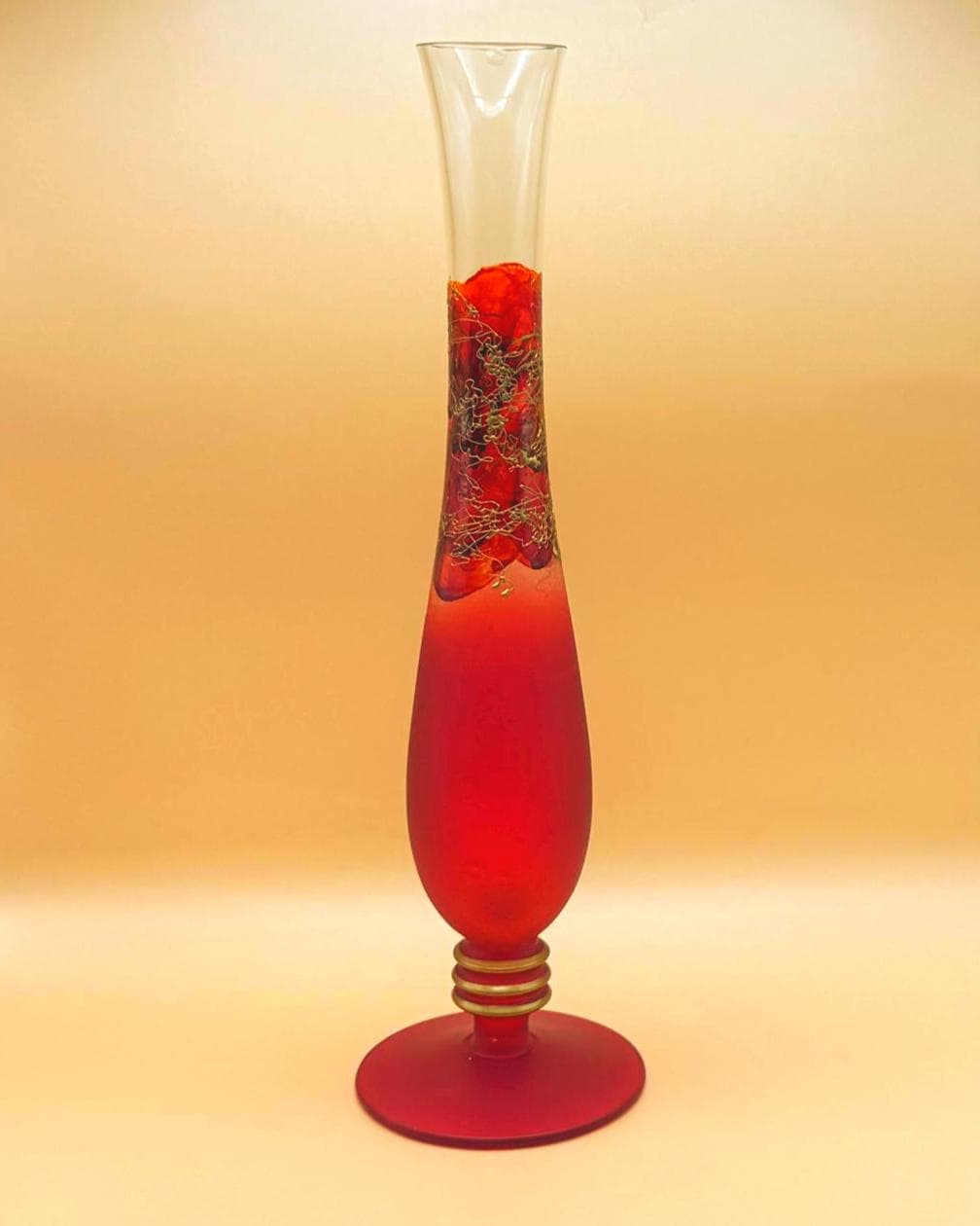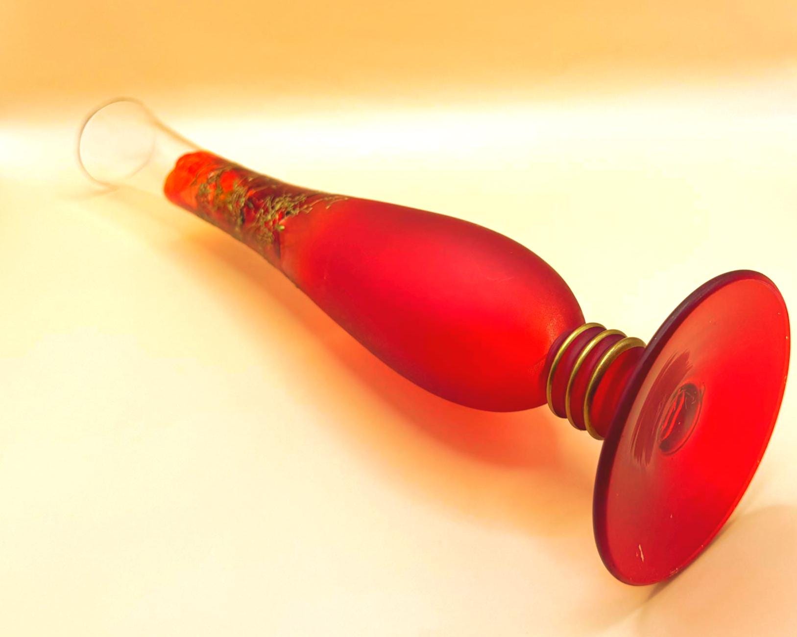 The sculptural silhouette and hand-crafted feel make it a beautiful statement piece—perfect for a single stem, dried florals, or simply displayed on its own. The combination of vibrant red, translucent glass, and metallic accents gives it a warm, modern artistic presence.