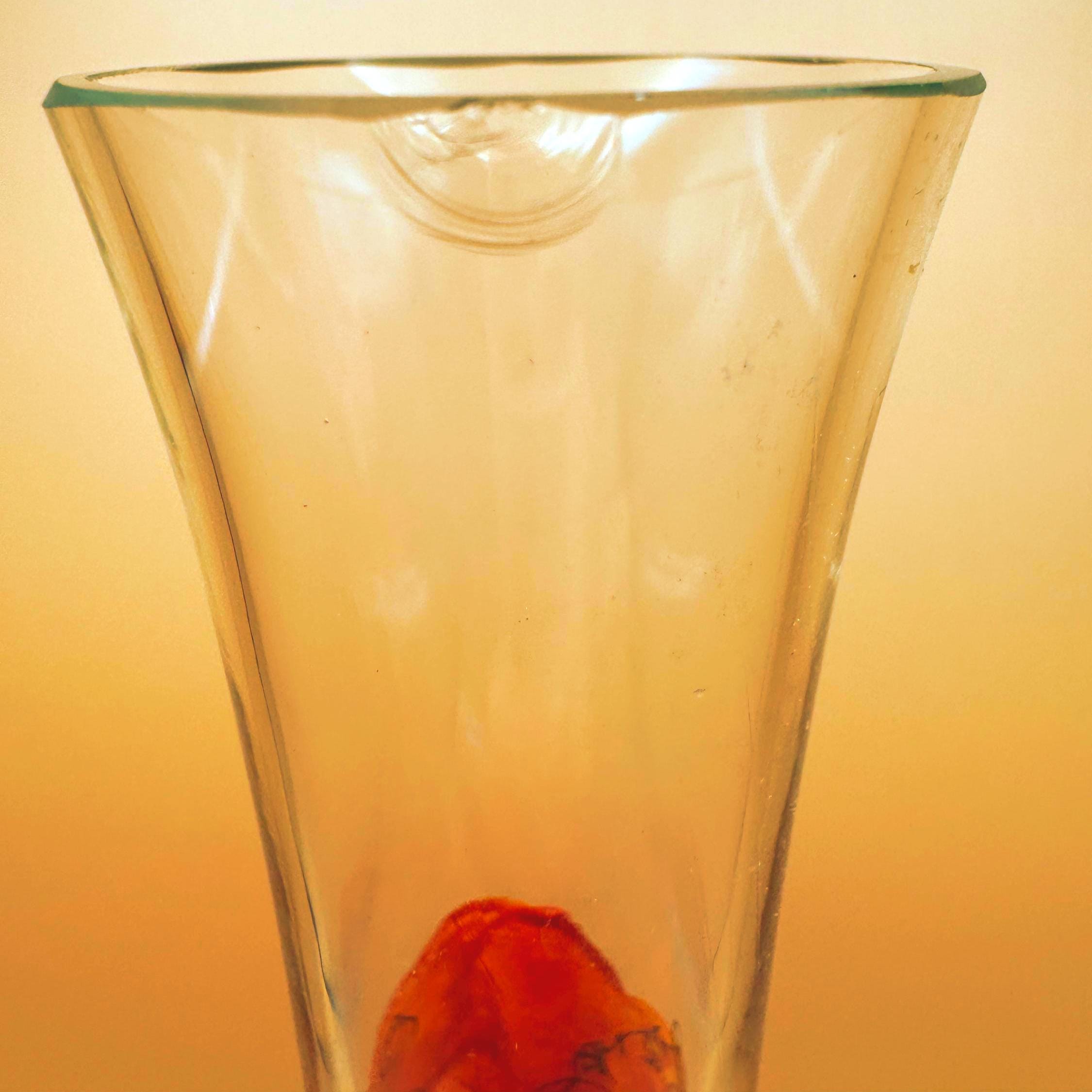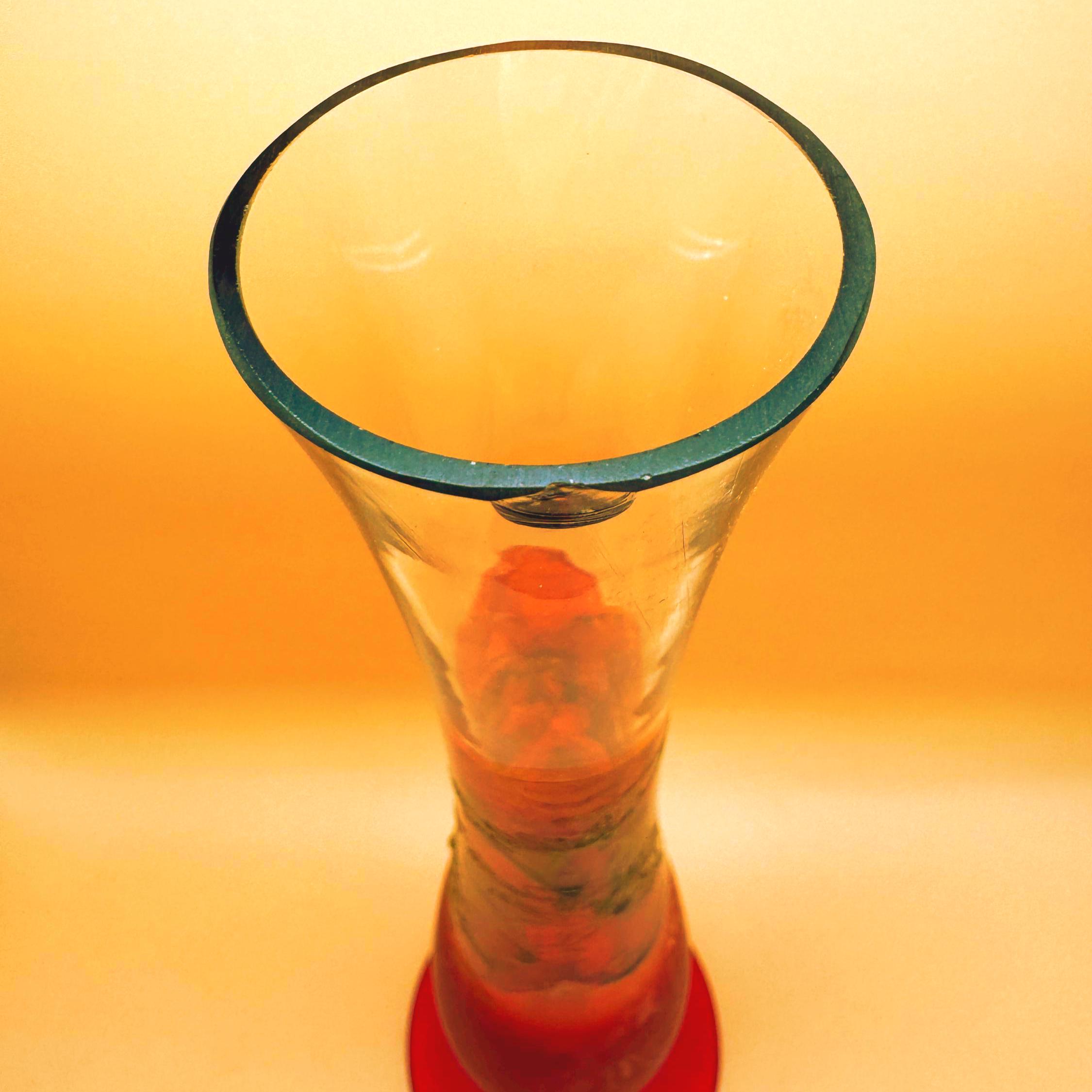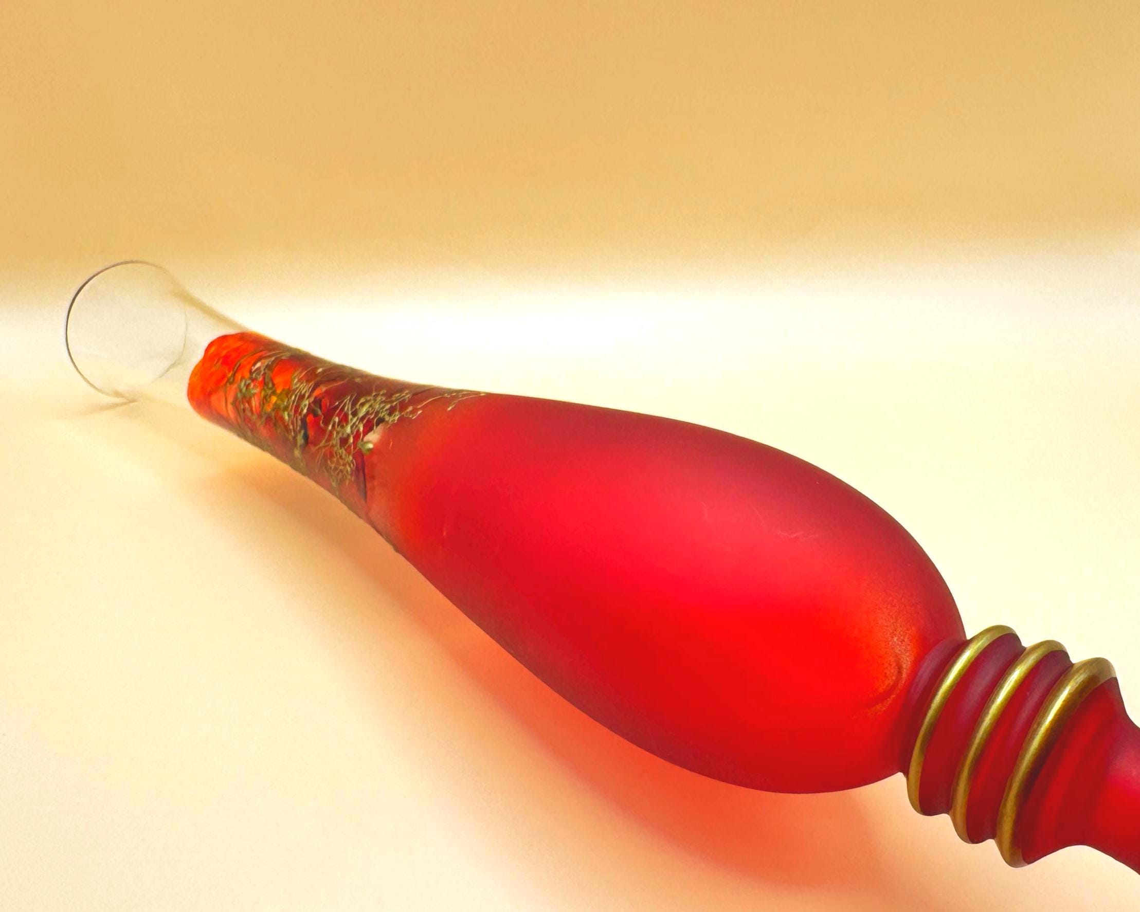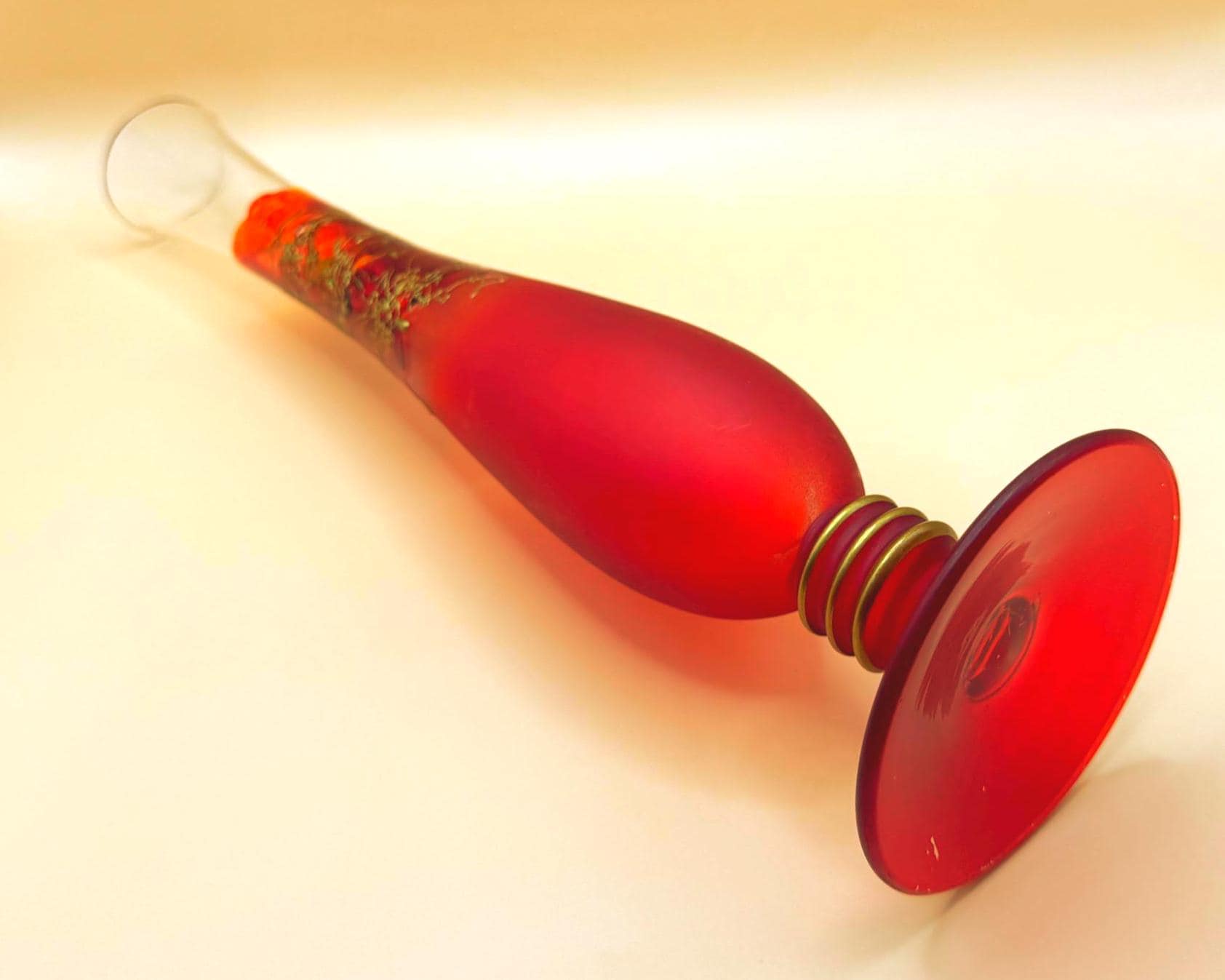 The sculptural silhouette and hand-crafted feel make it a beautiful statement piece—perfect for a single stem, dried florals, or simply displayed on its own. The combination of vibrant red, translucent glass, and metallic accents gives it a warm, modern artistic presence.