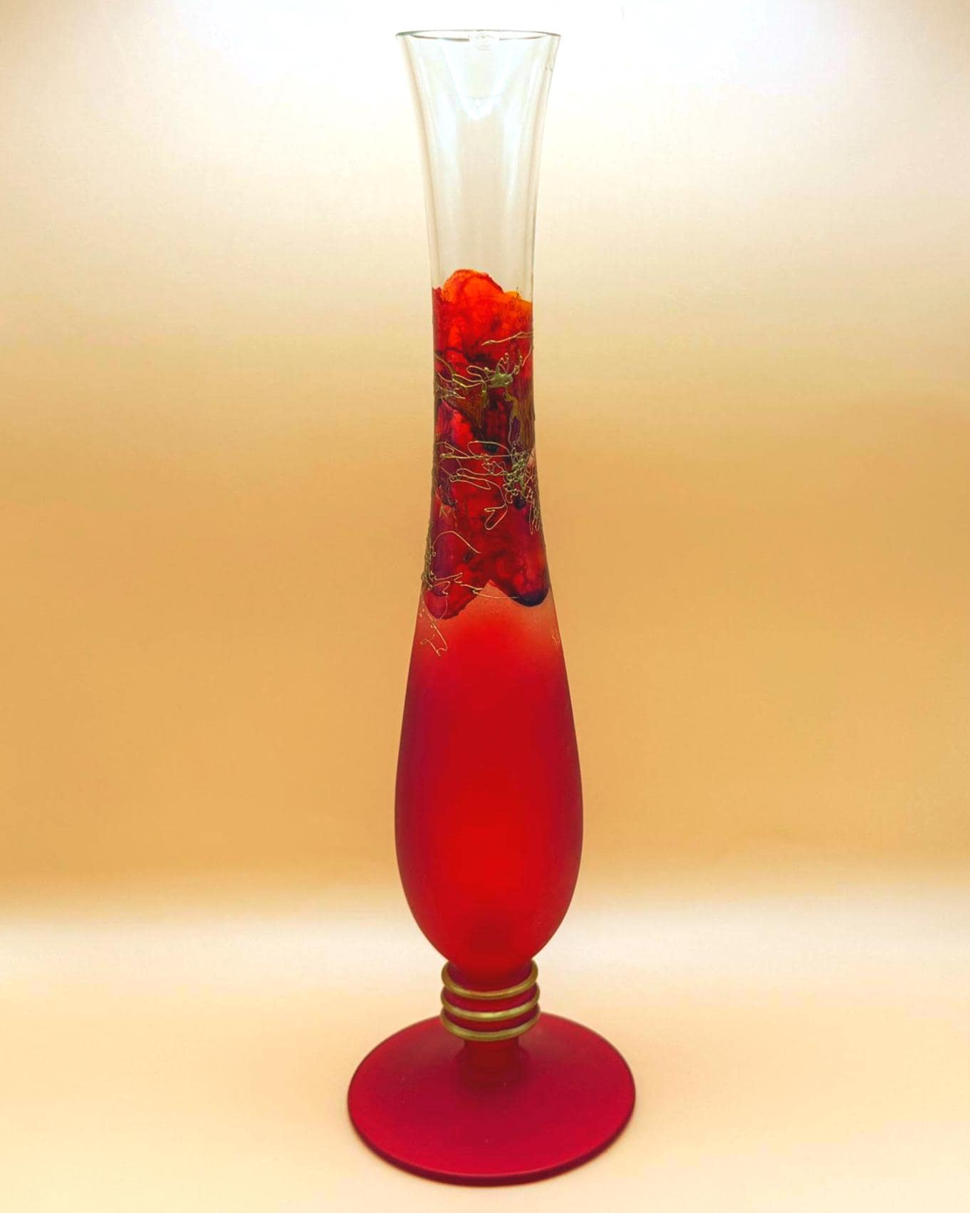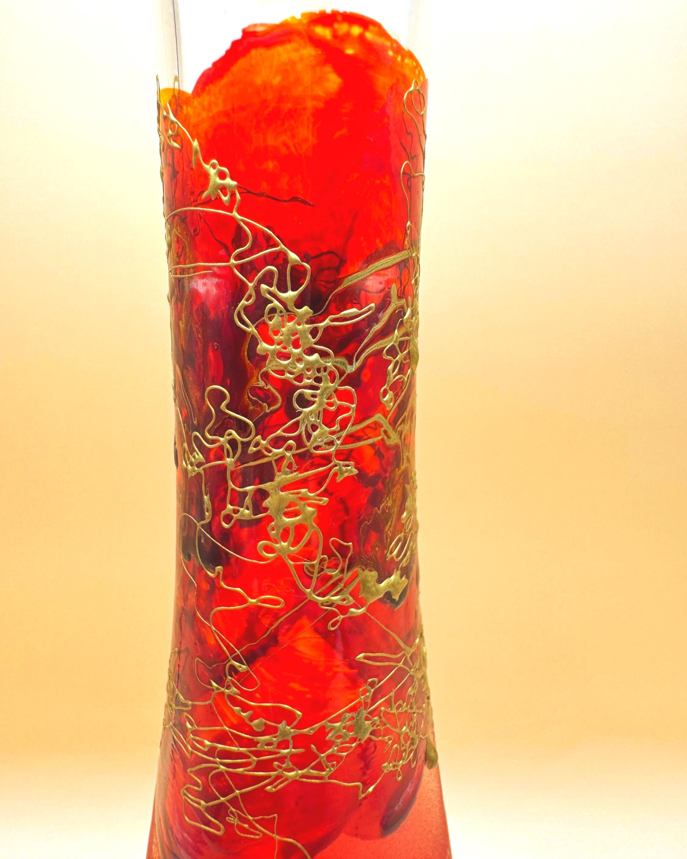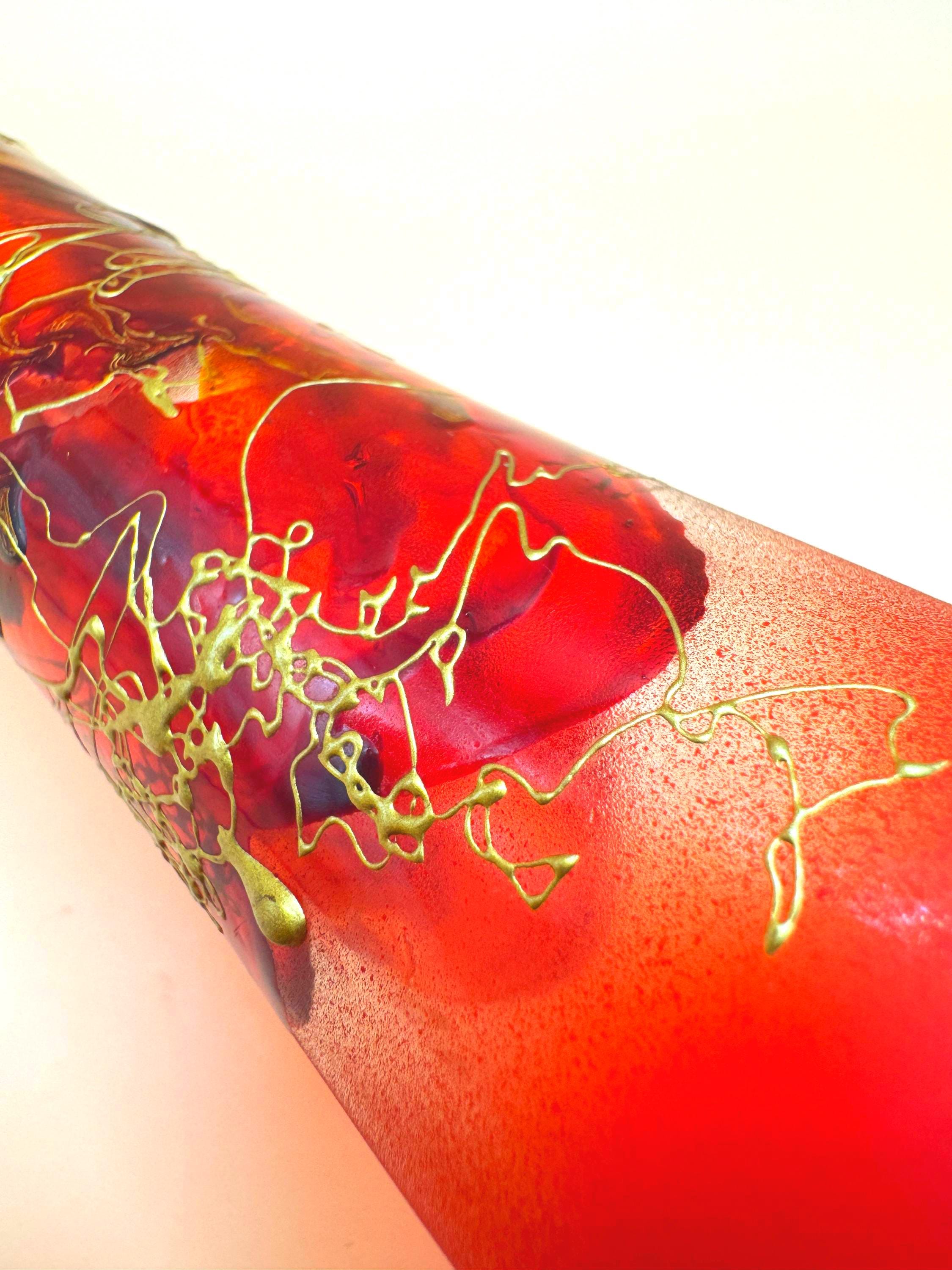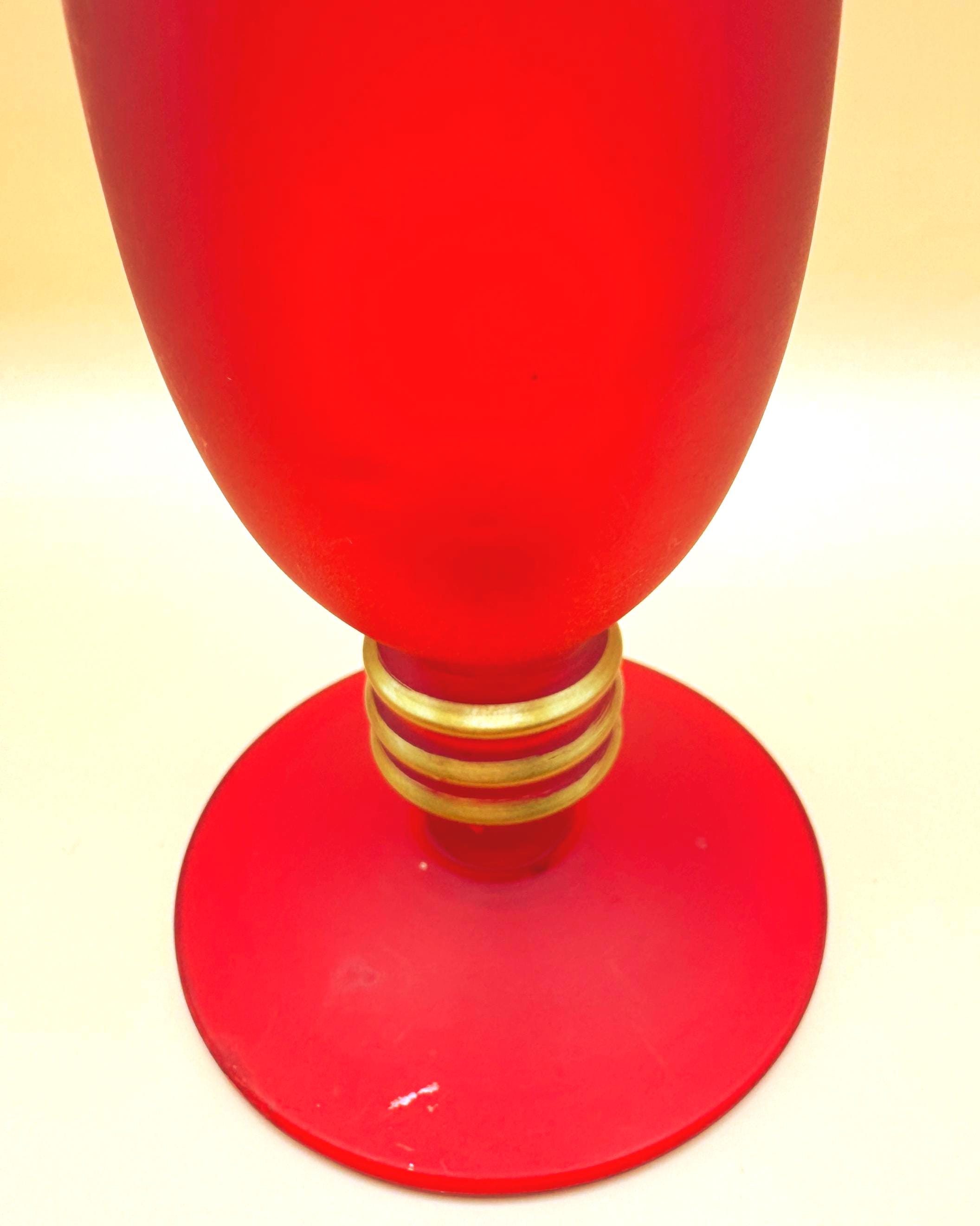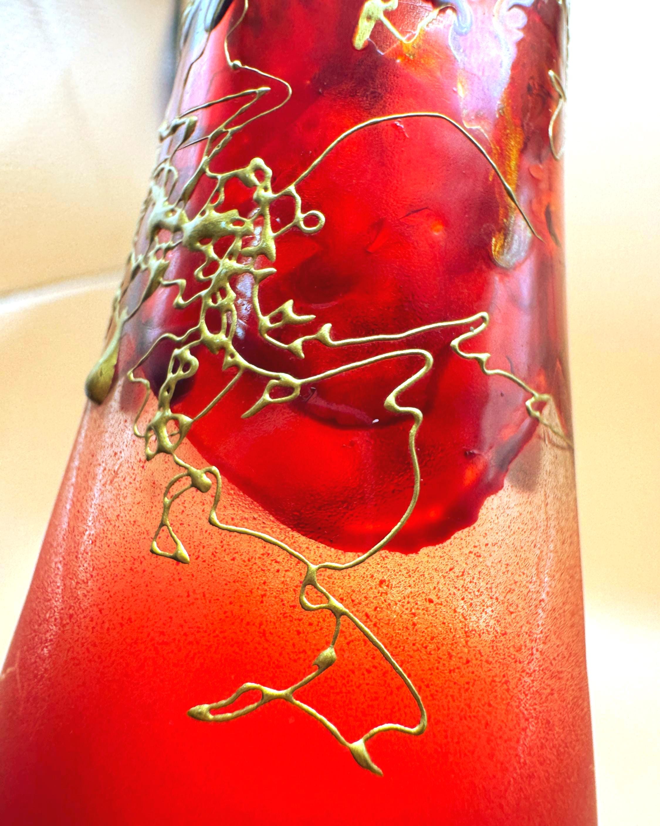 This striking tall art glass vase brings bold color and texture to any space. Featuring a rich red satin-frosted body that transitions into a clear flared top, this piece is elevated with unique freeform gold embellishments that wrap organically around the upper portion.