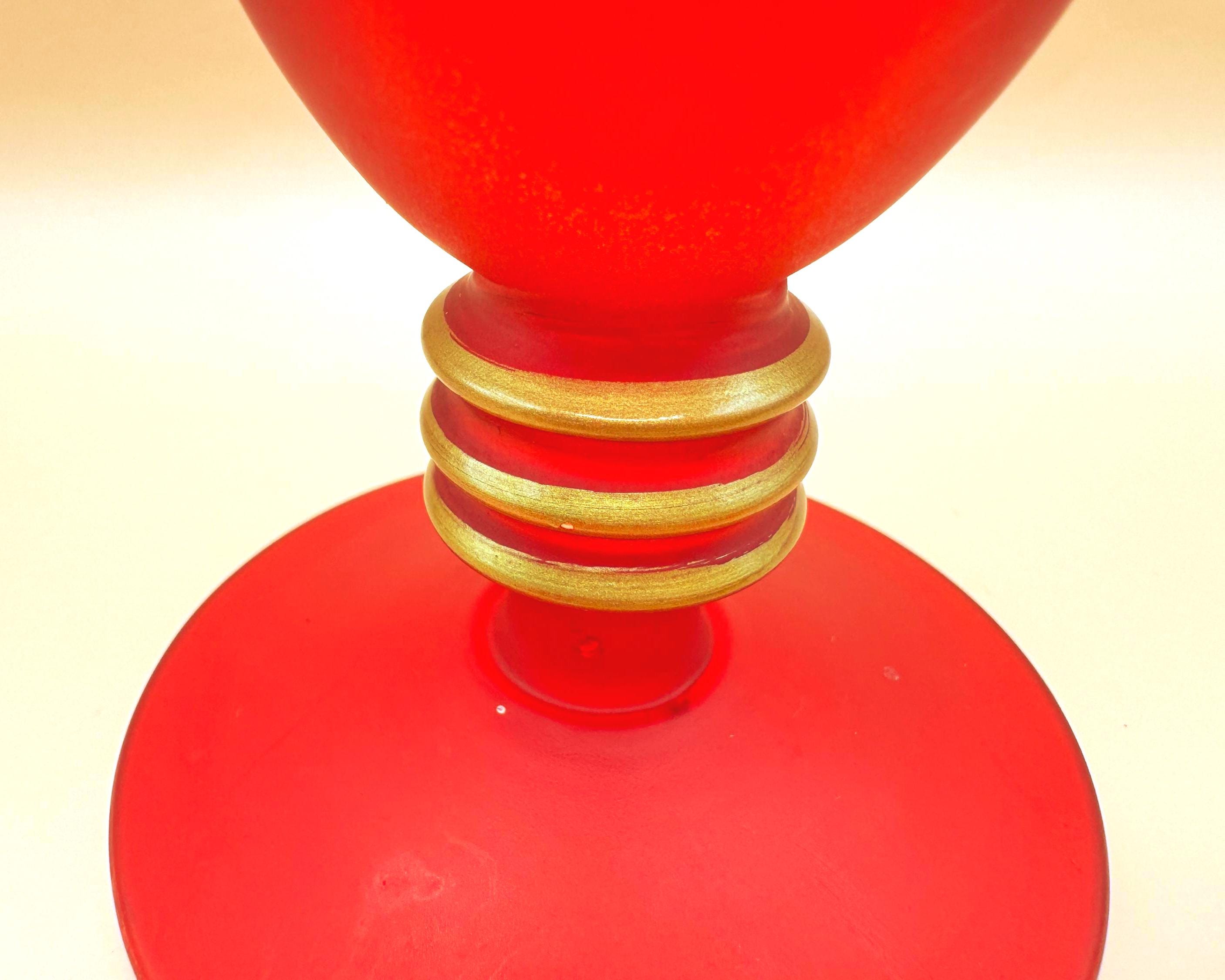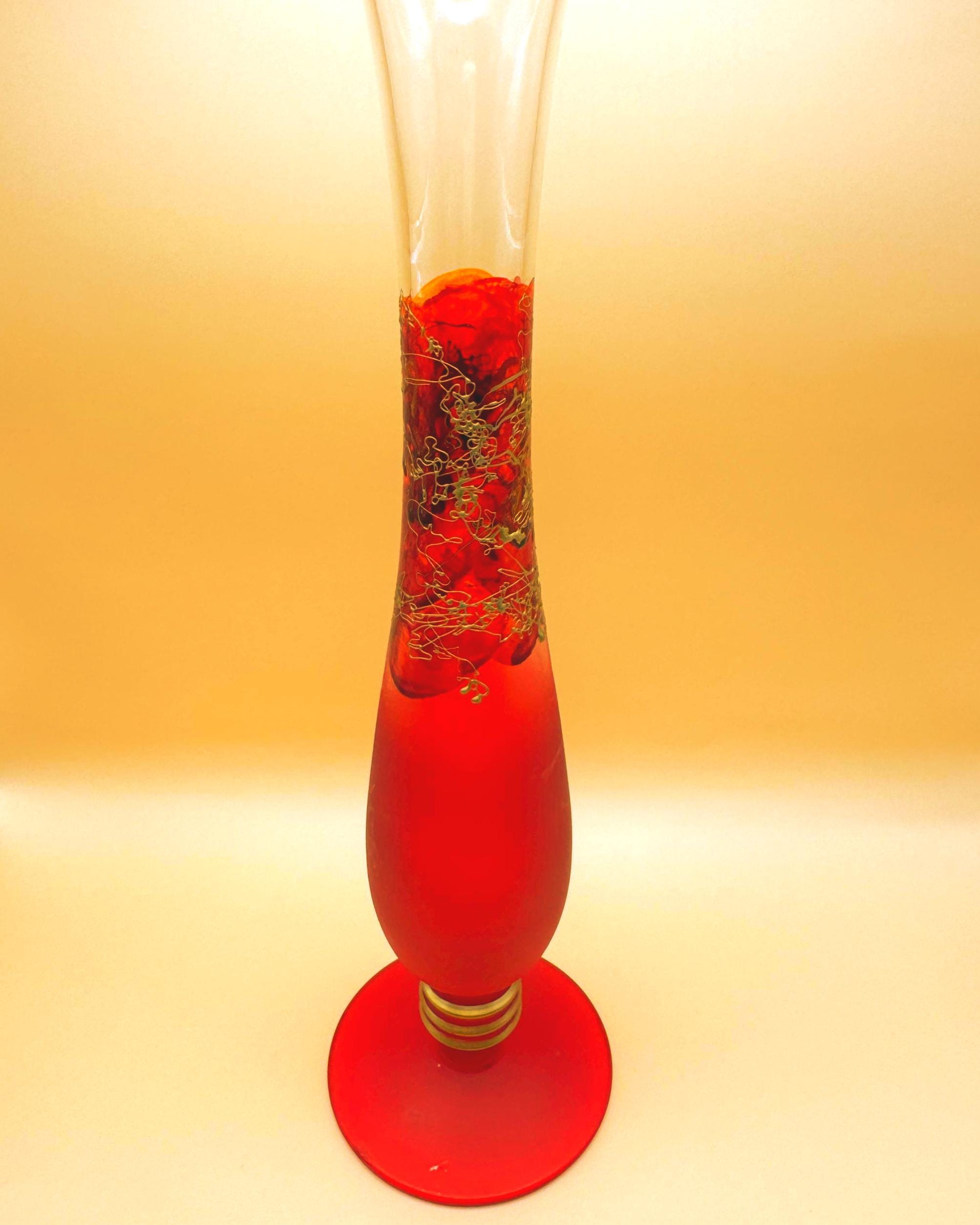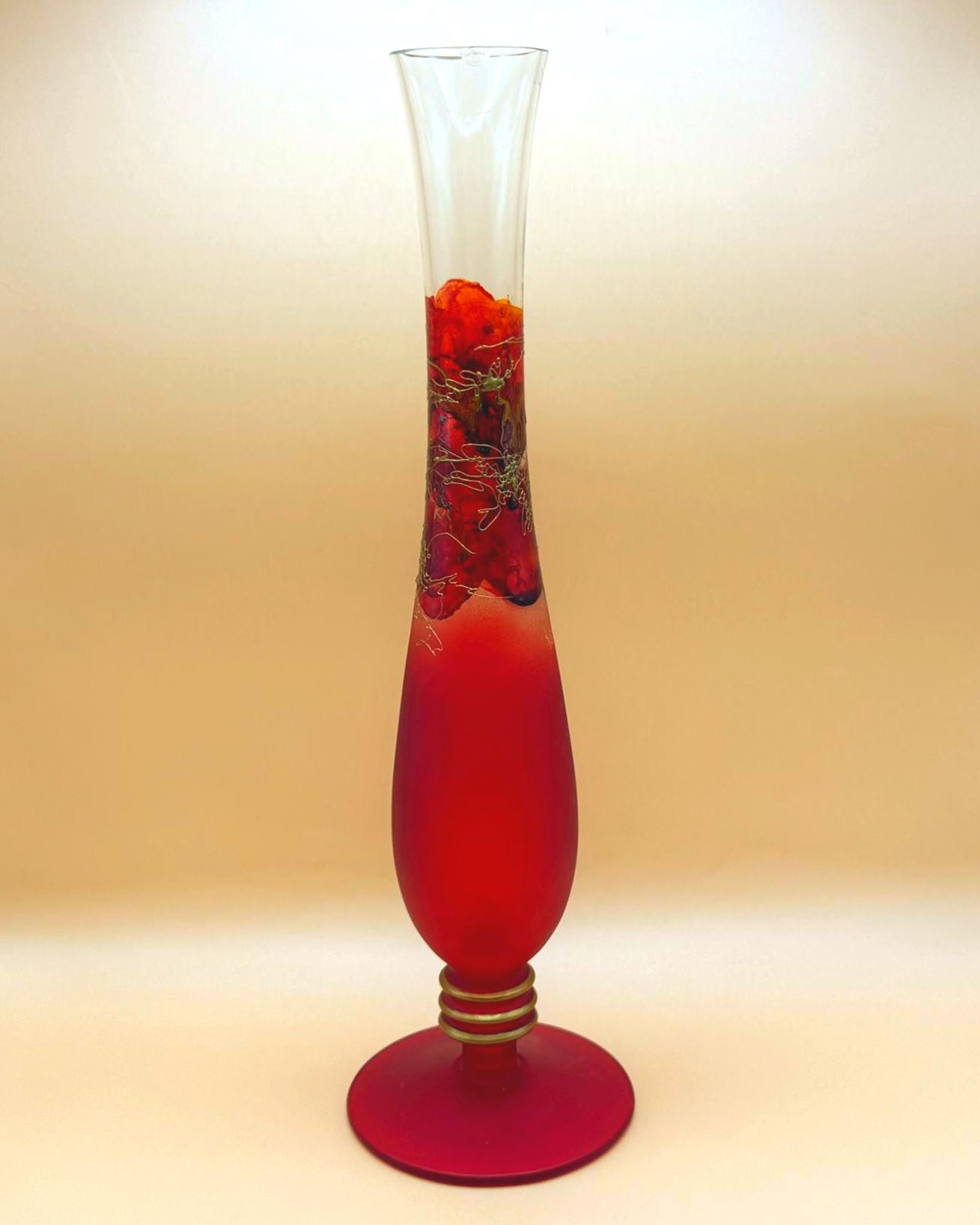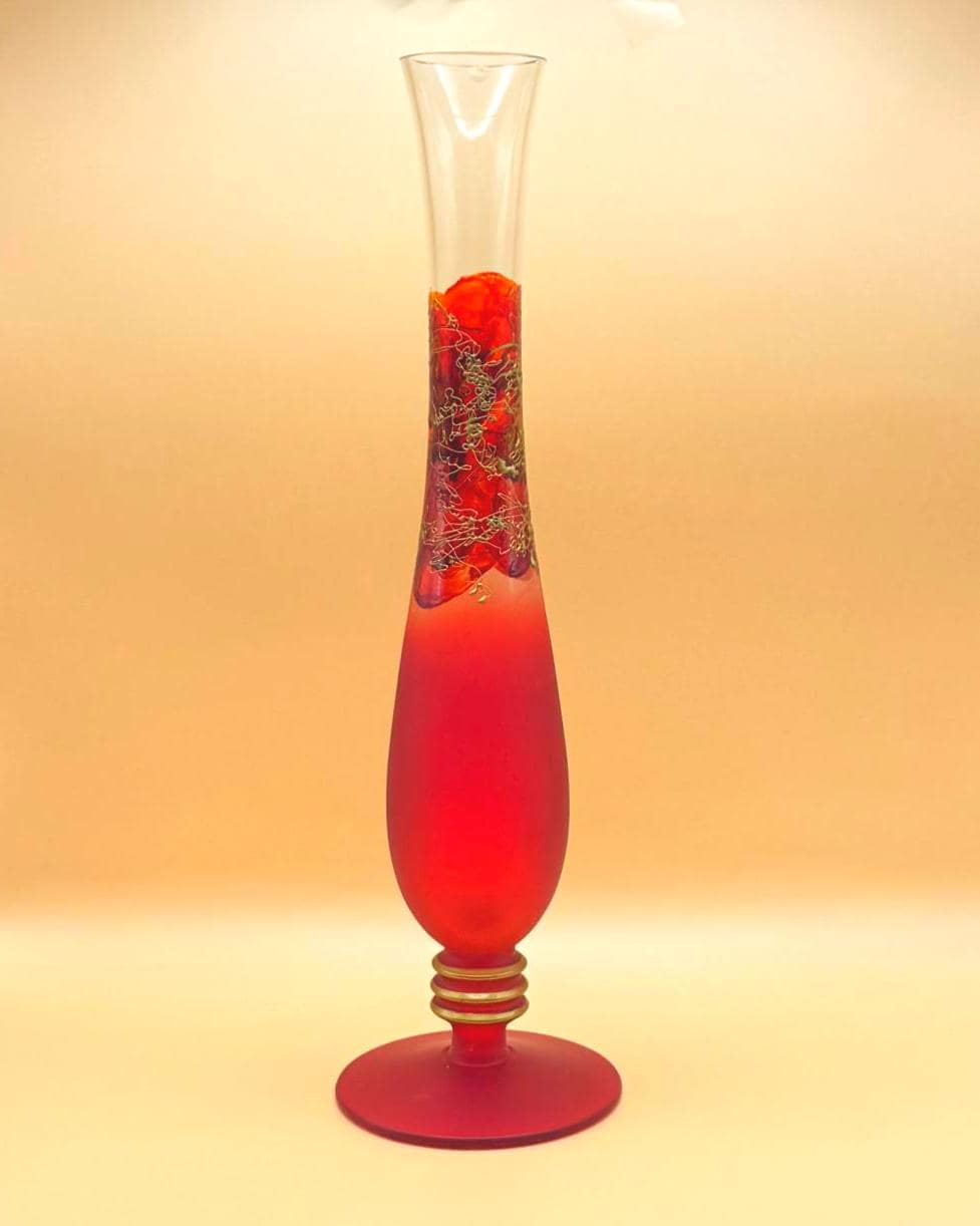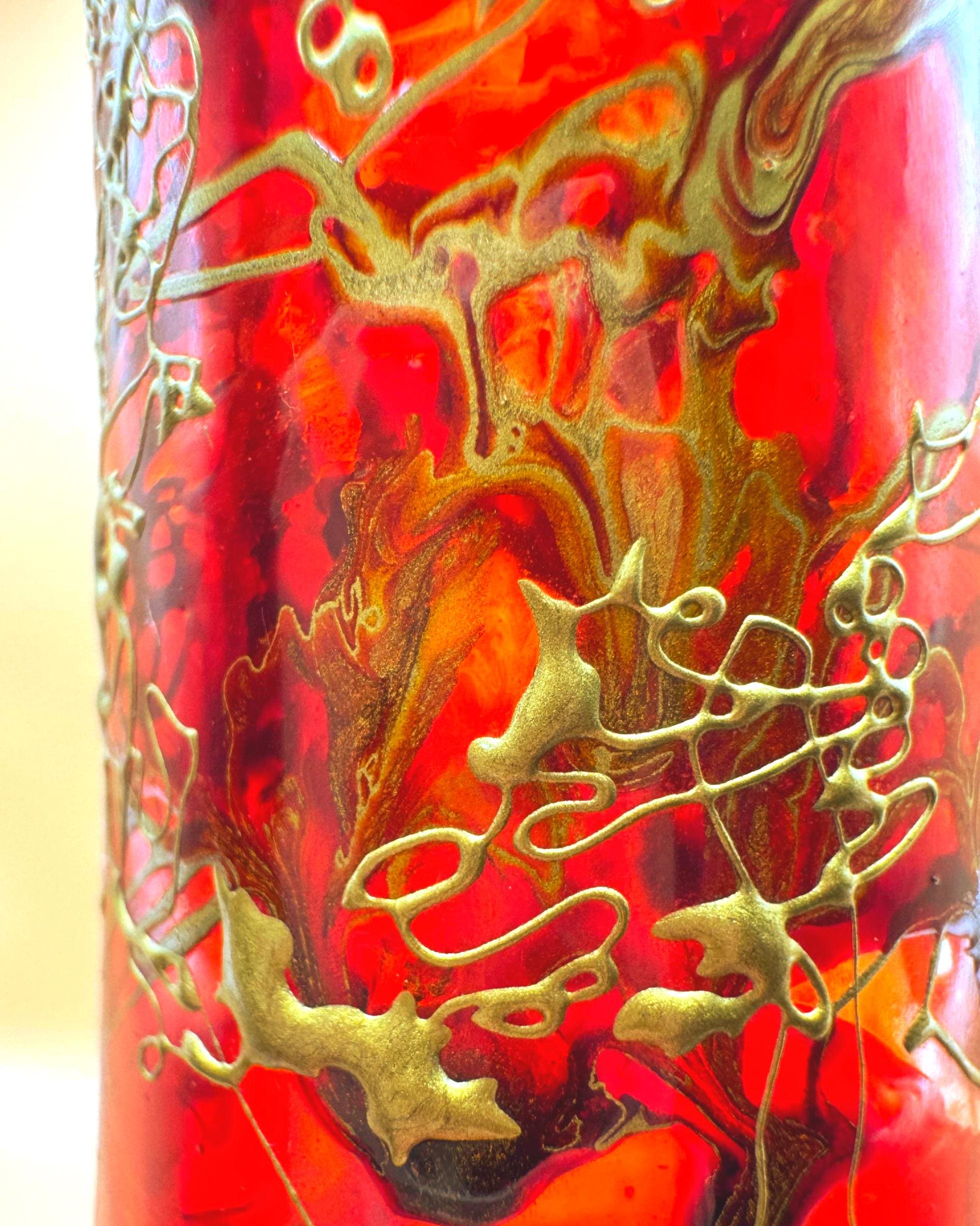 This striking tall art glass vase brings bold color and texture to any space. Featuring a rich red satin-frosted body that transitions into a clear flared top, this piece is elevated with unique freeform gold embellishments that wrap organically around the upper portion.