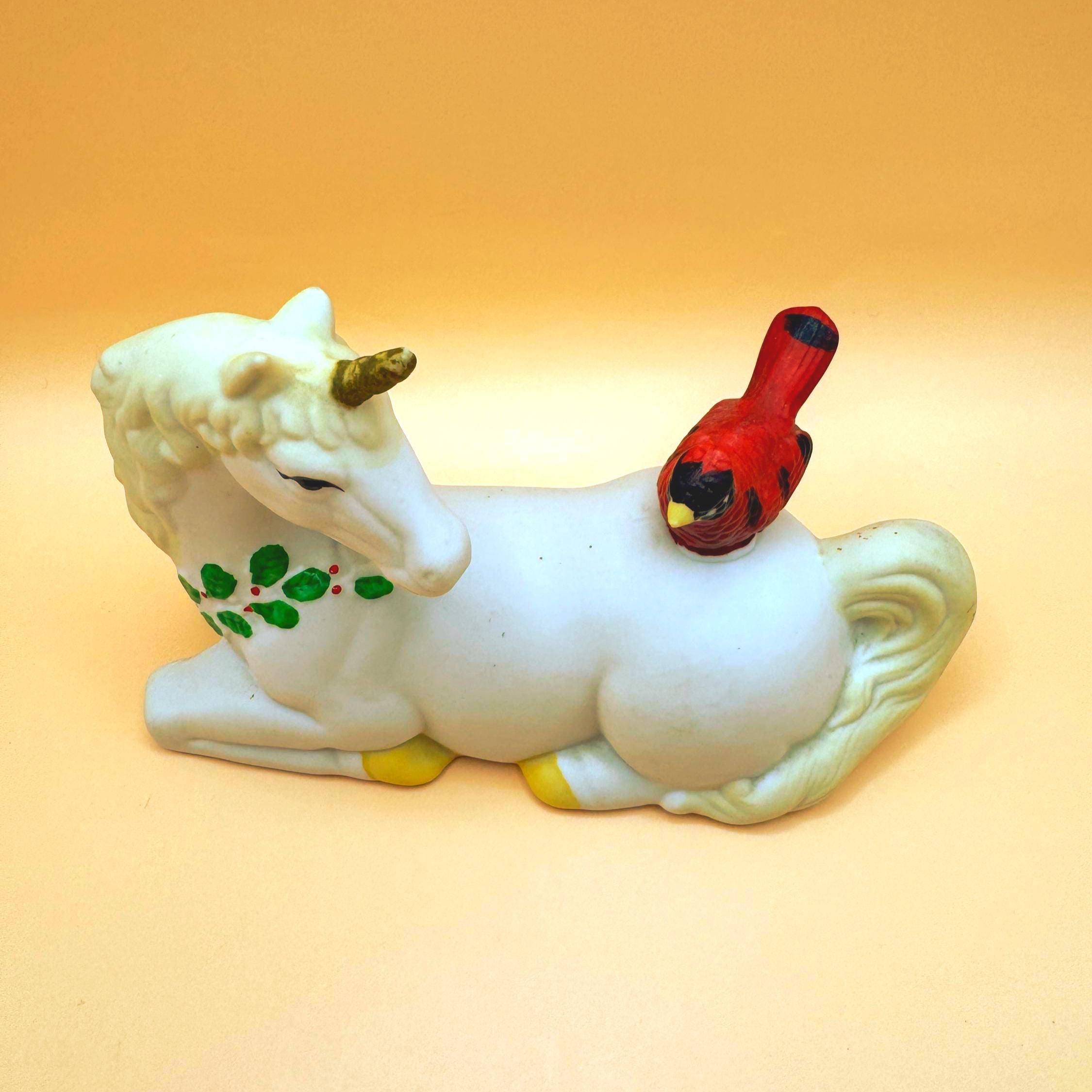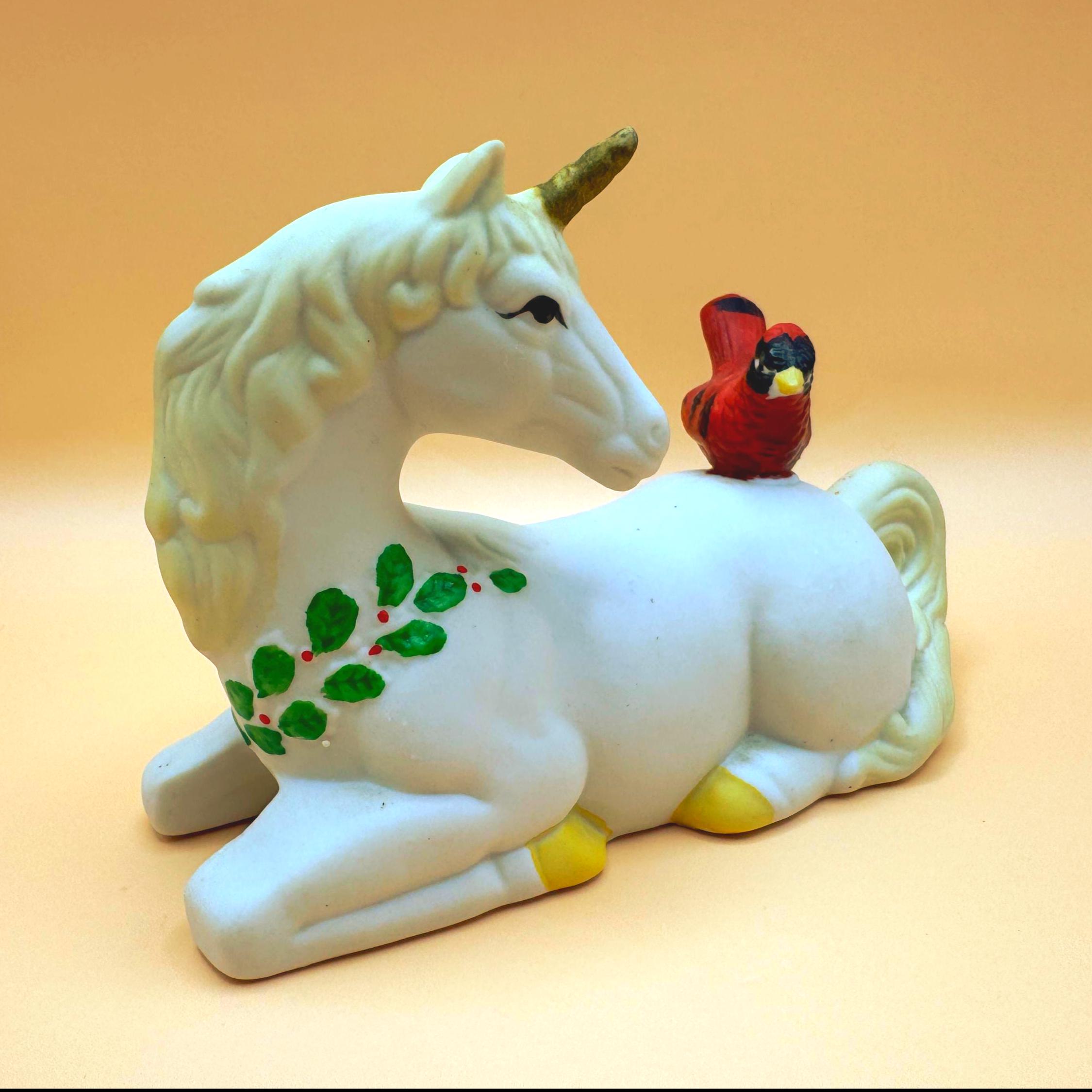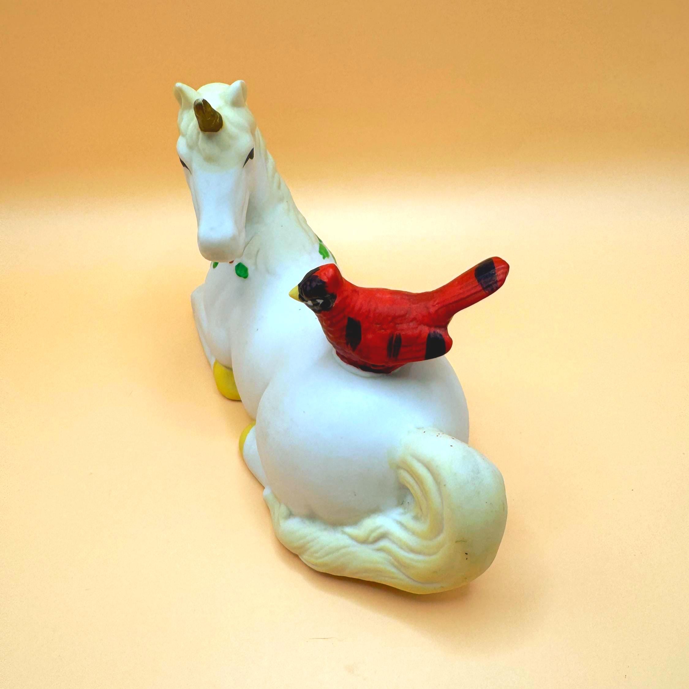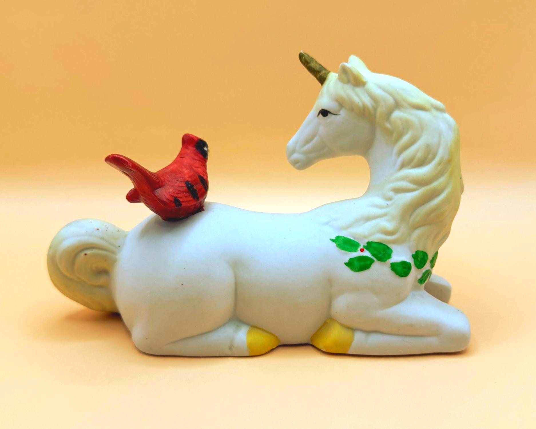 A sweet and whimsical vintage unicorn figurine featuring a bright red cardinal perched gently on its back. This charming piece has a soft matte (bisque-style) finish with delicate hand-painted details, including greenery accents that give it a subtle seasonal feel.