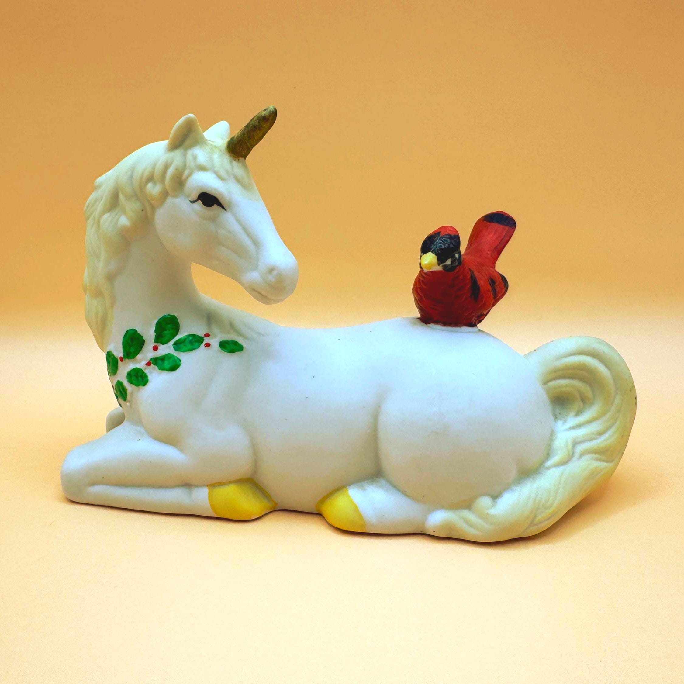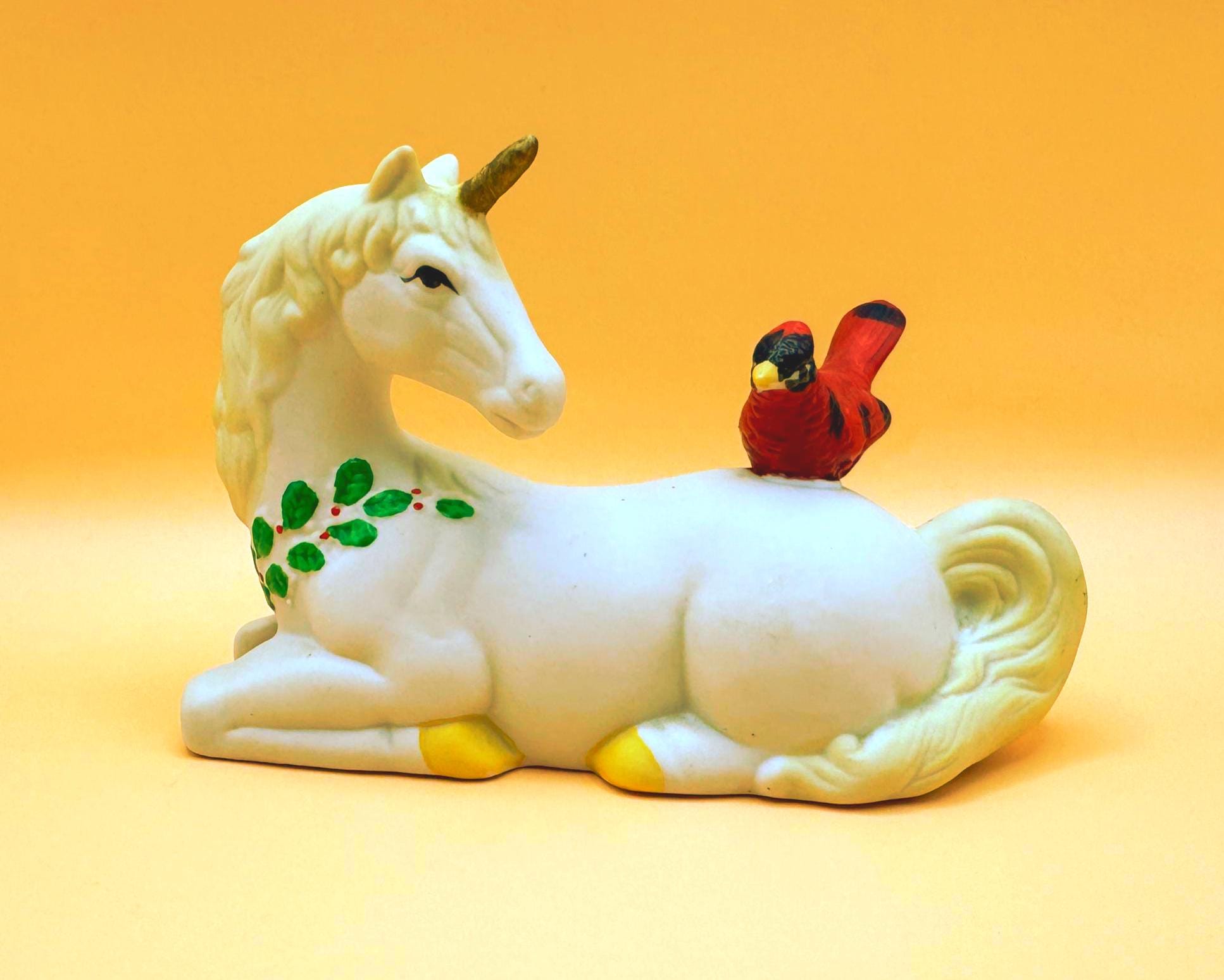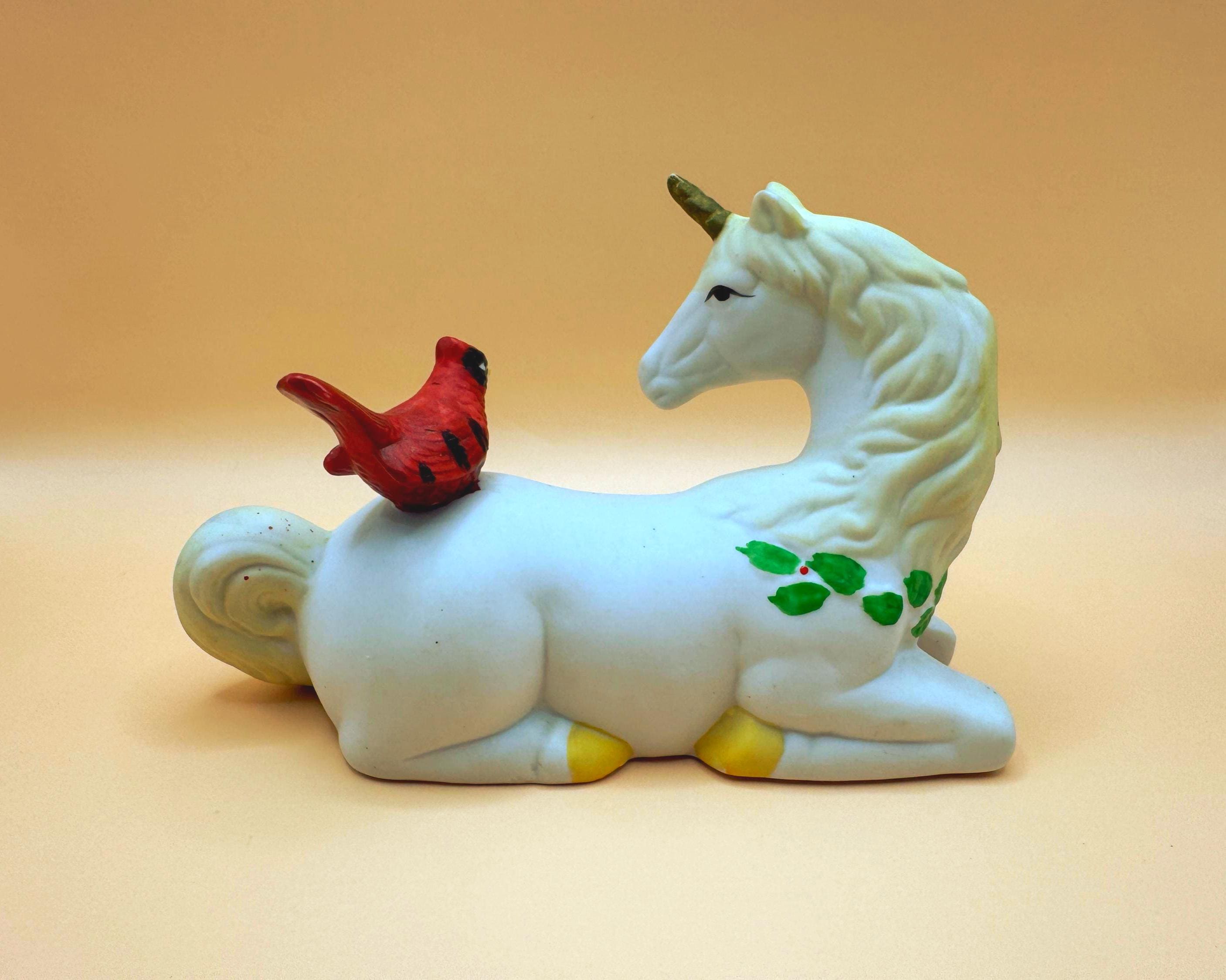 A sweet and whimsical vintage unicorn figurine featuring a bright red cardinal perched gently on its back. This charming piece has a soft matte (bisque-style) finish with delicate hand-painted details, including greenery accents that give it a subtle seasonal feel.