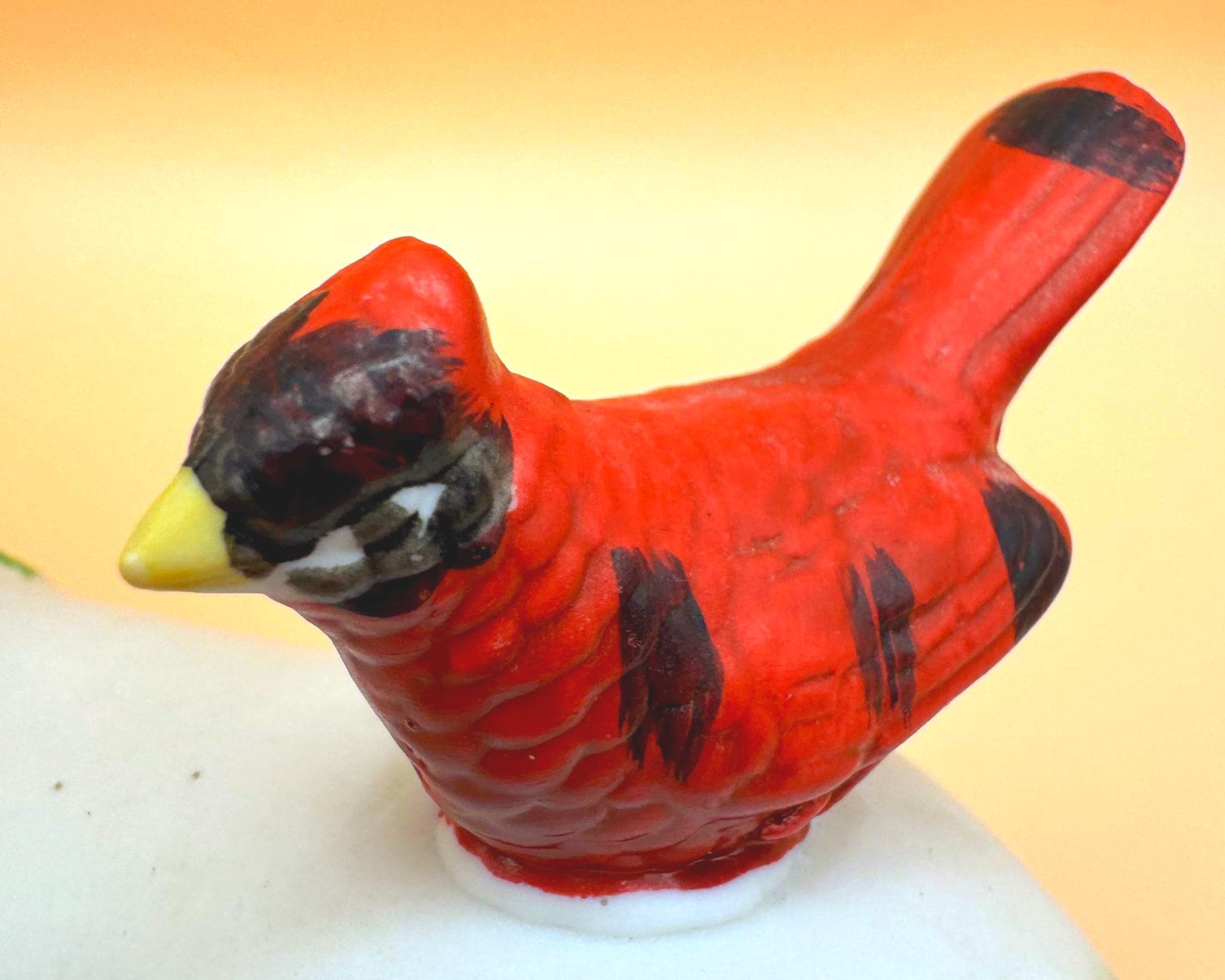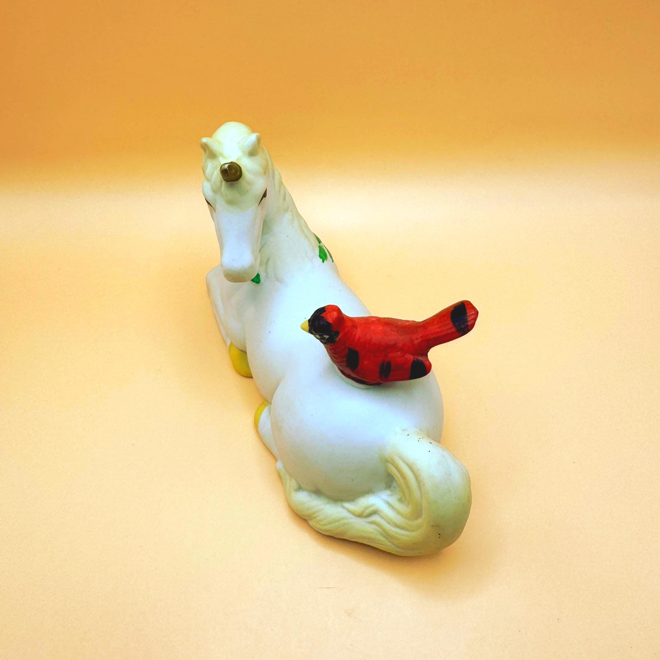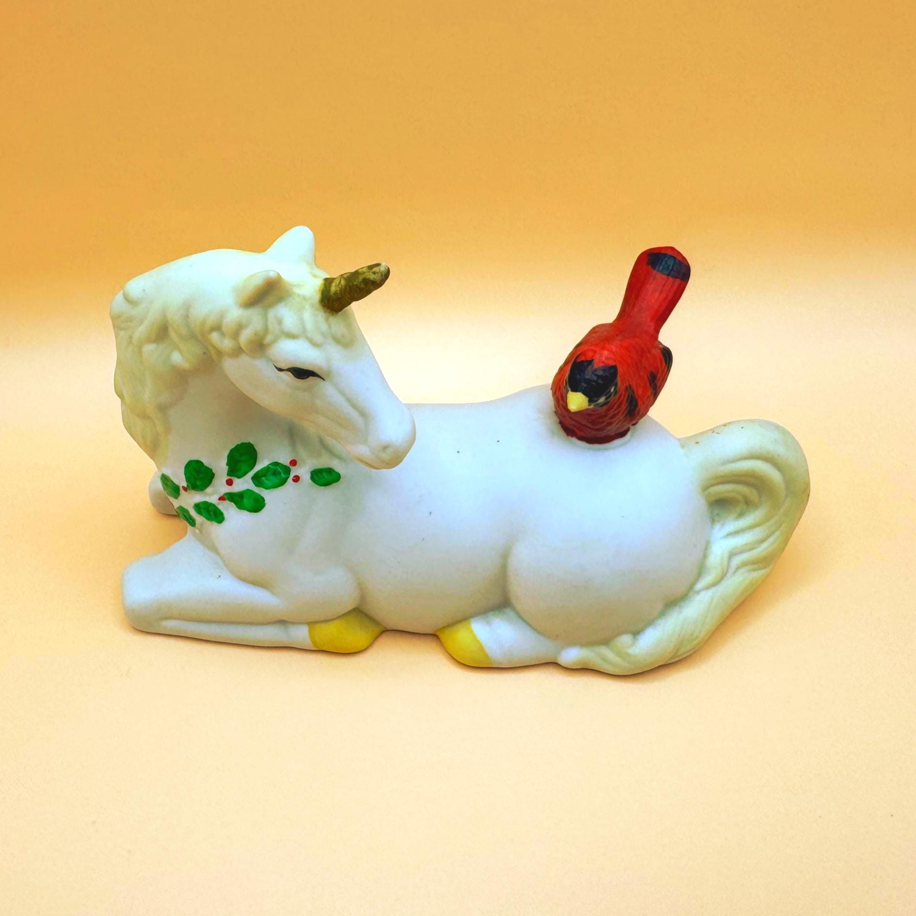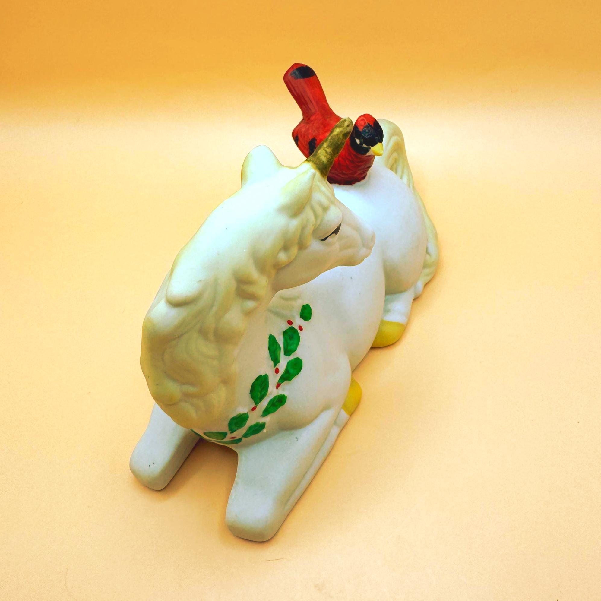 A sweet and whimsical vintage unicorn figurine featuring a bright red cardinal perched gently on its back. This charming piece has a soft matte (bisque-style) finish with delicate hand-painted details, including greenery accents that give it a subtle seasonal feel.