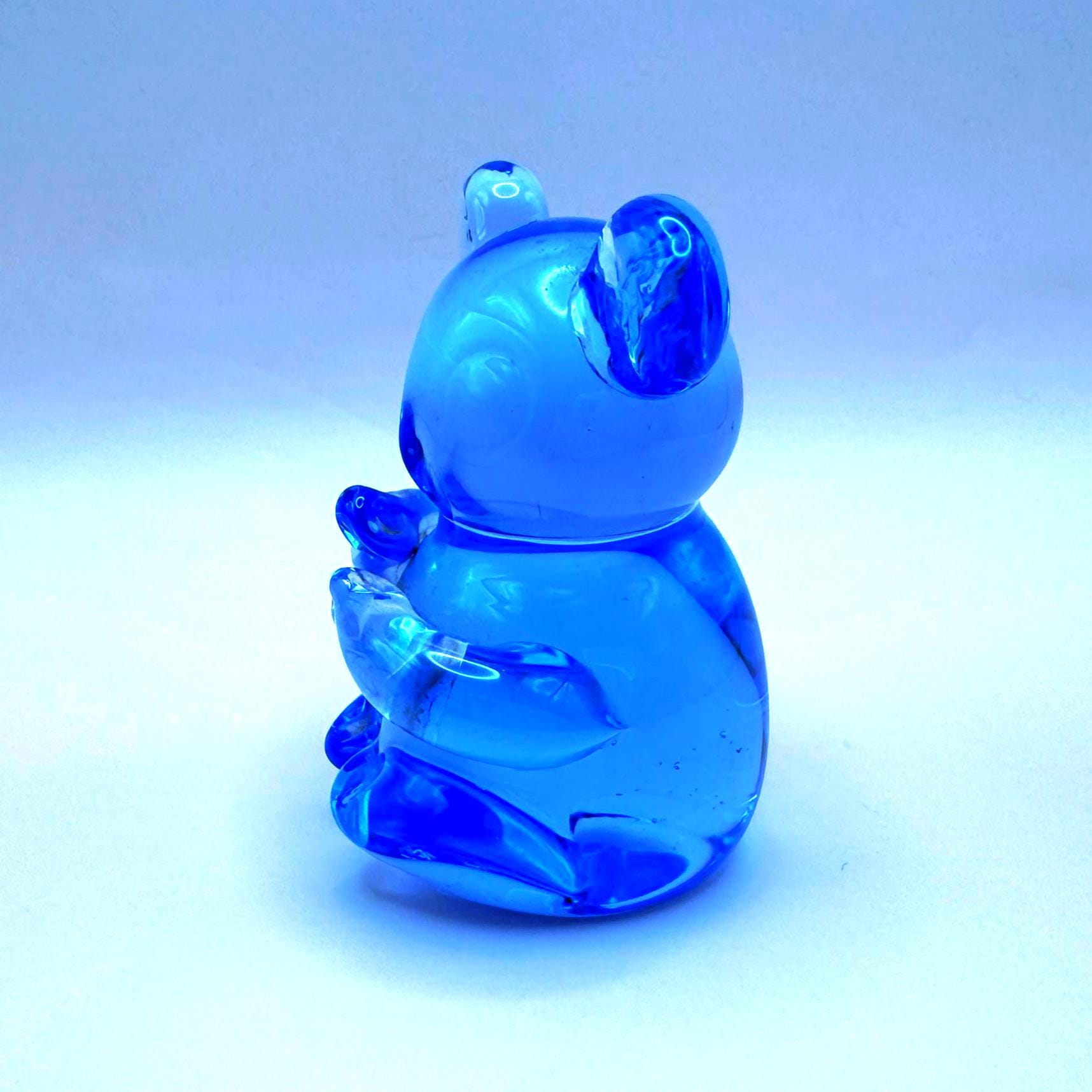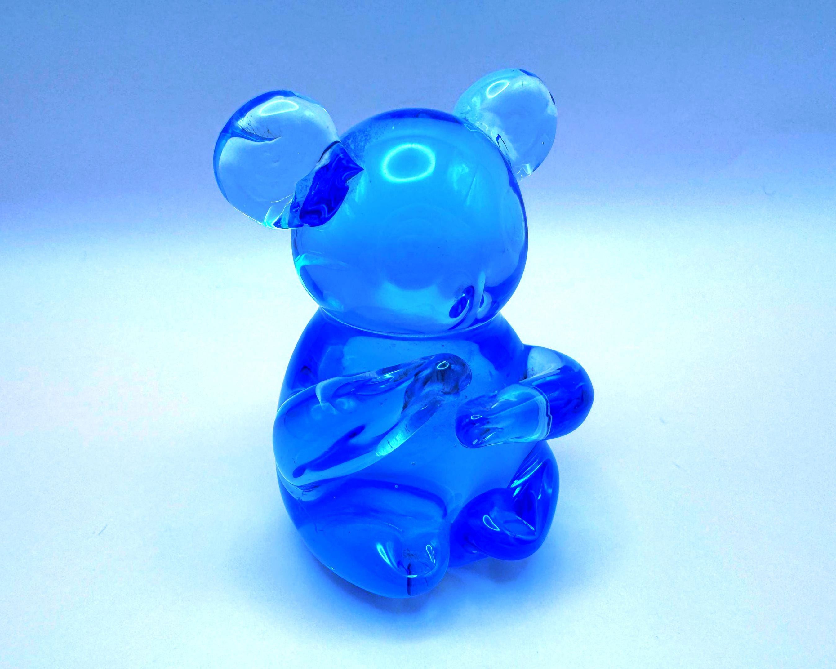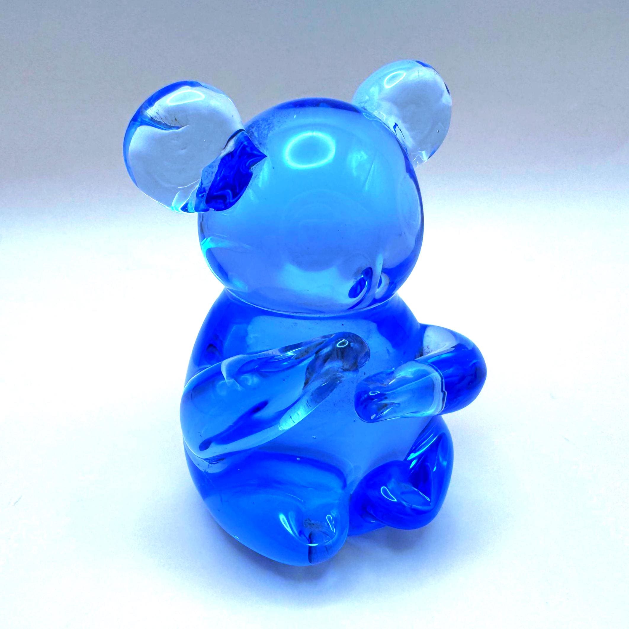 This adorable vintage cobalt blue glass koala bear is a beautifully crafted hand-blown piece with charming character and detail. The rich blue glass paired with clear accents in the ears and arms gives it a striking, eye-catching look.