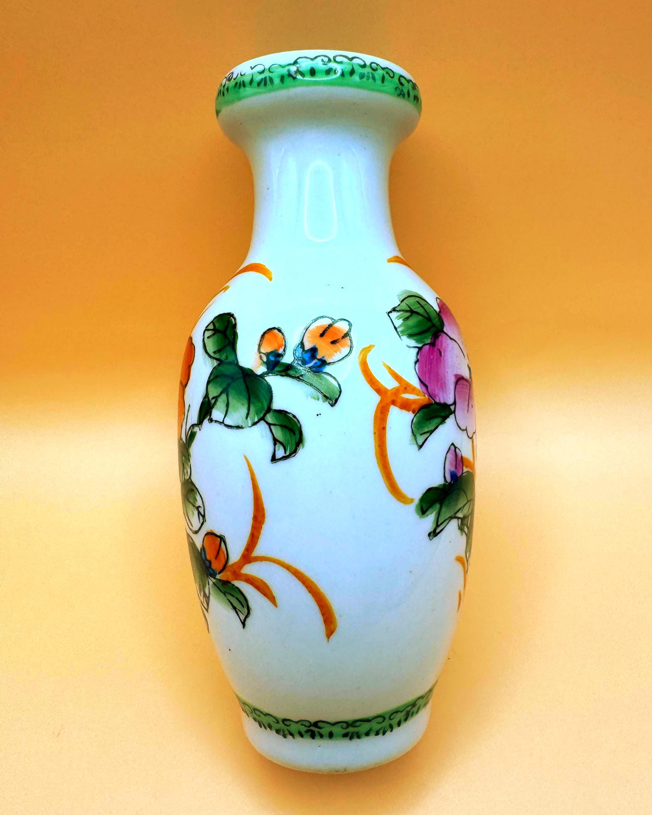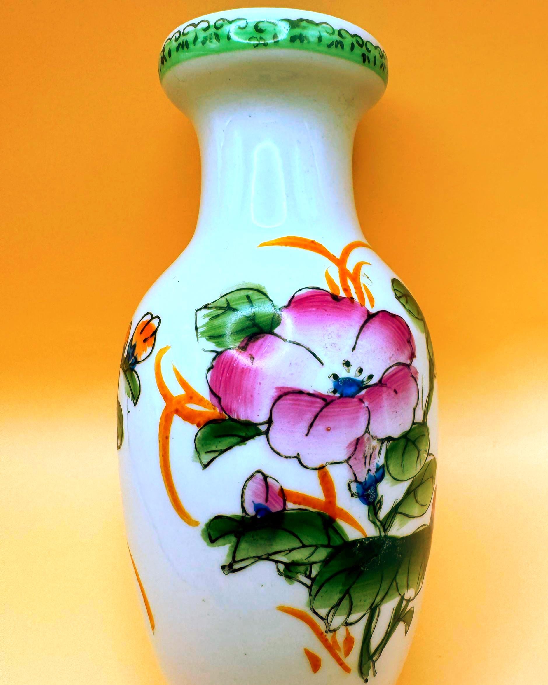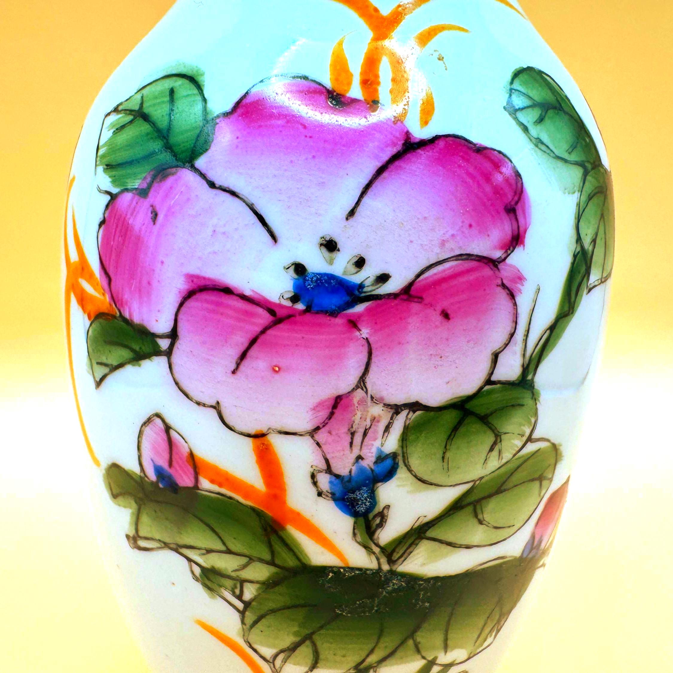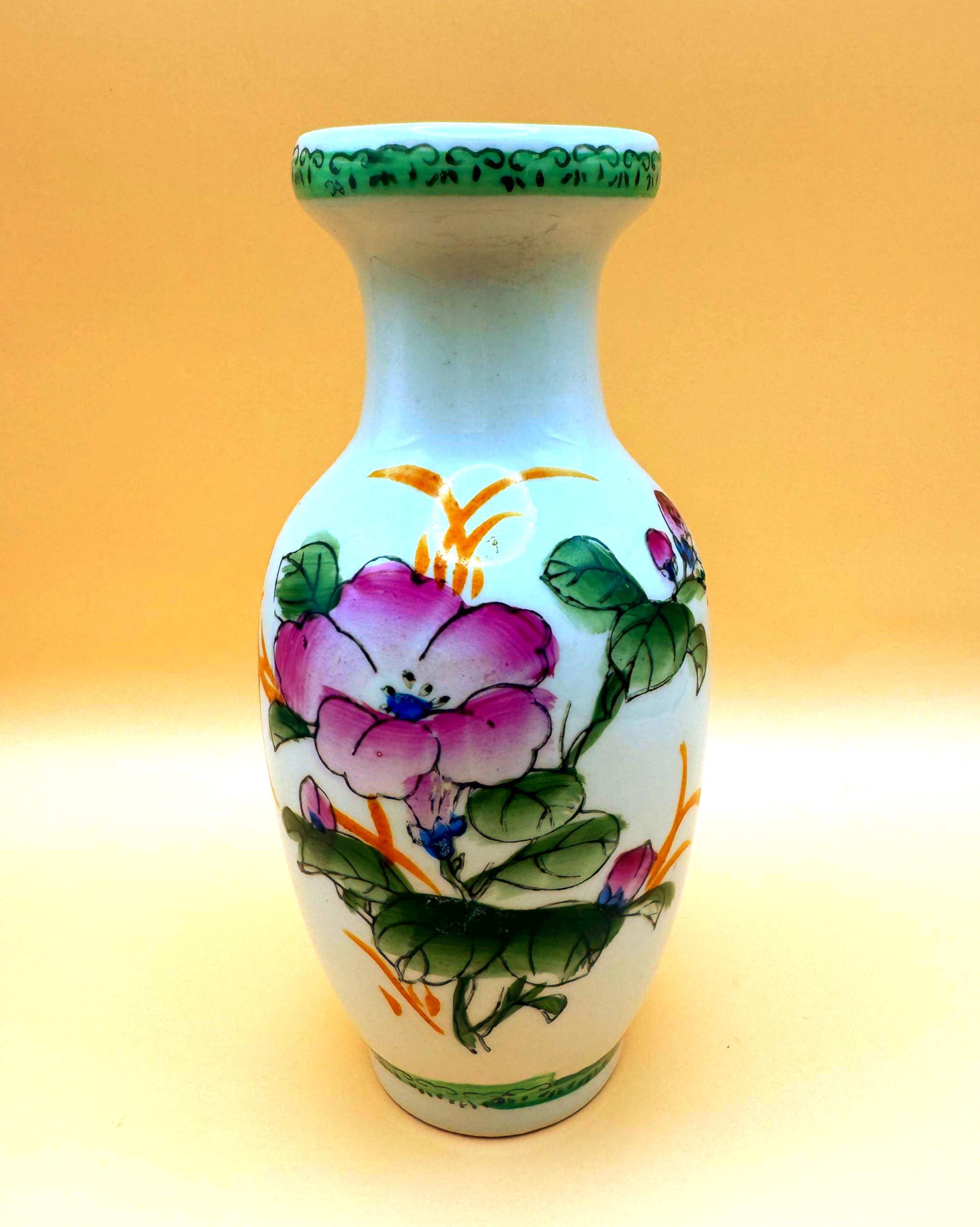 This charming vintage porcelain vase features a beautifully hand-painted floral design with soft pink and purple blooms on one side and warm orange florals on the other. Delicate green leaves and a decorative green scroll trim at the top and base add a lovely contrast and vintage character.