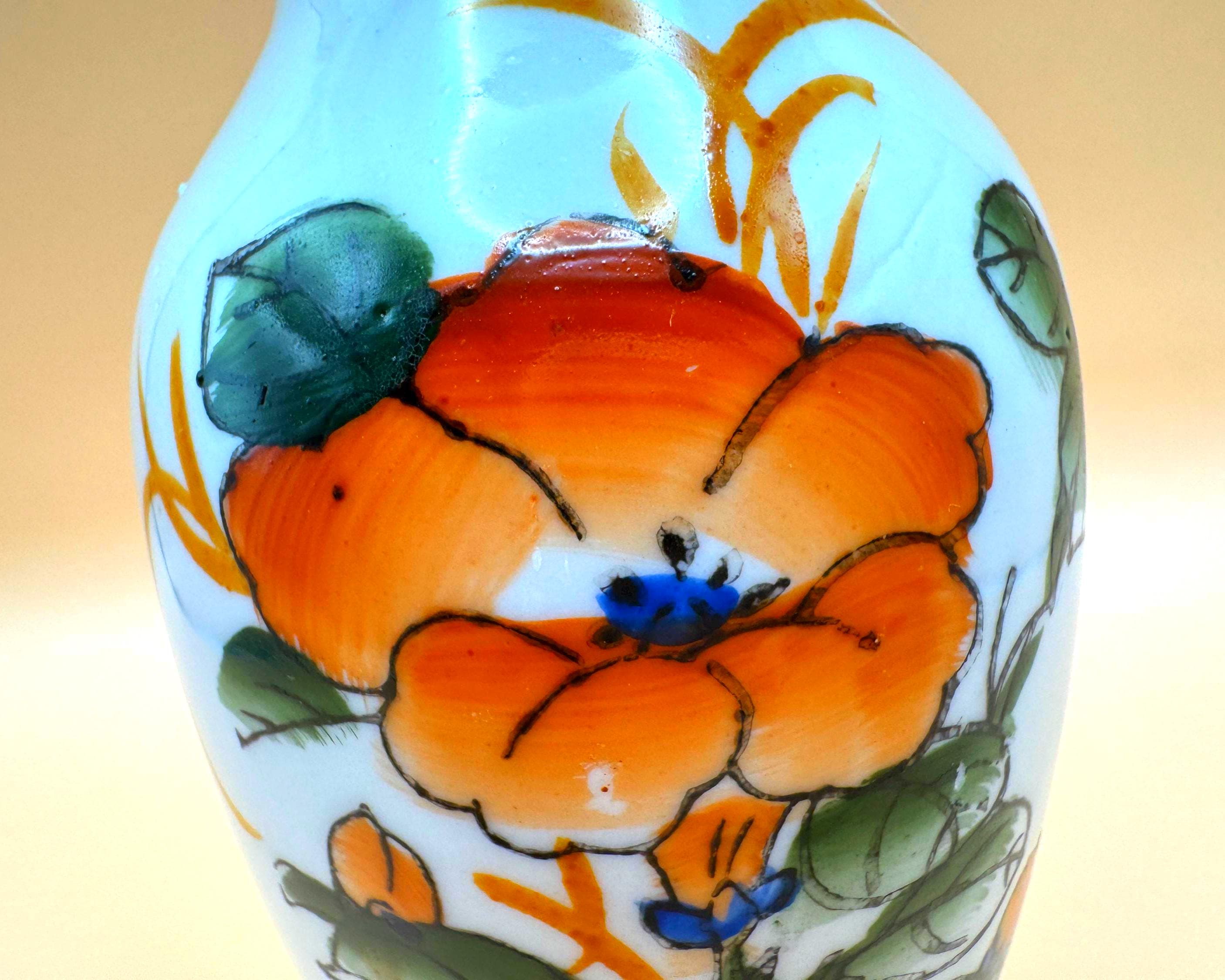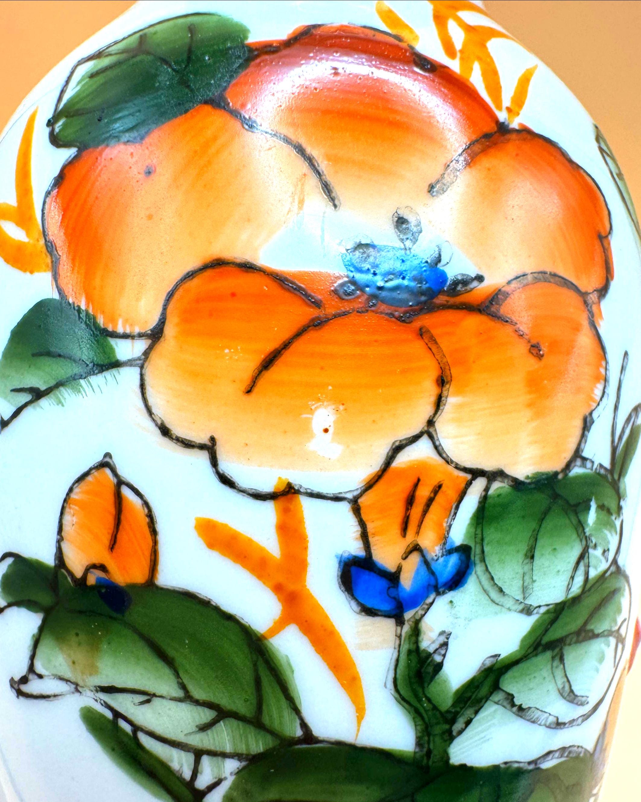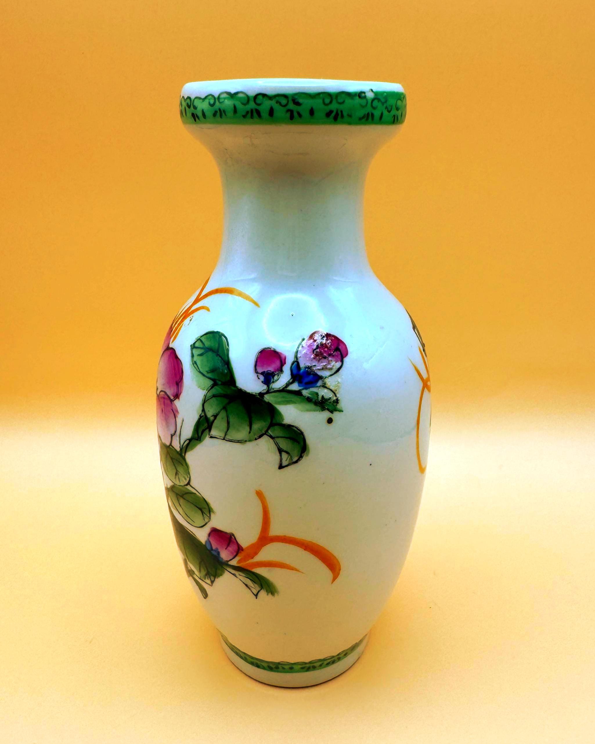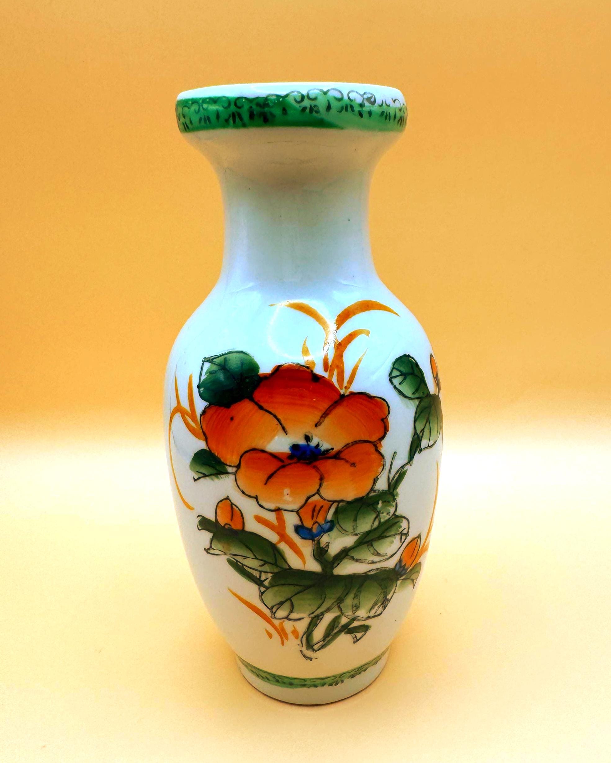 This charming vintage porcelain vase features a beautifully hand-painted floral design with soft pink and purple blooms on one side and warm orange florals on the other. Delicate green leaves and a decorative green scroll trim at the top and base add a lovely contrast and vintage character.