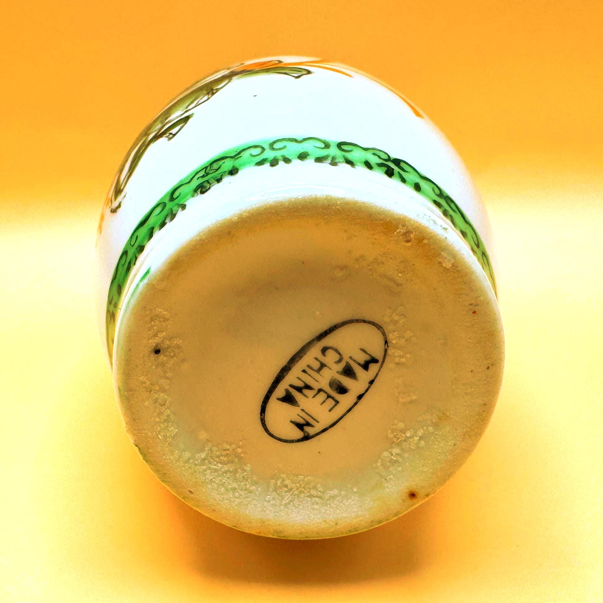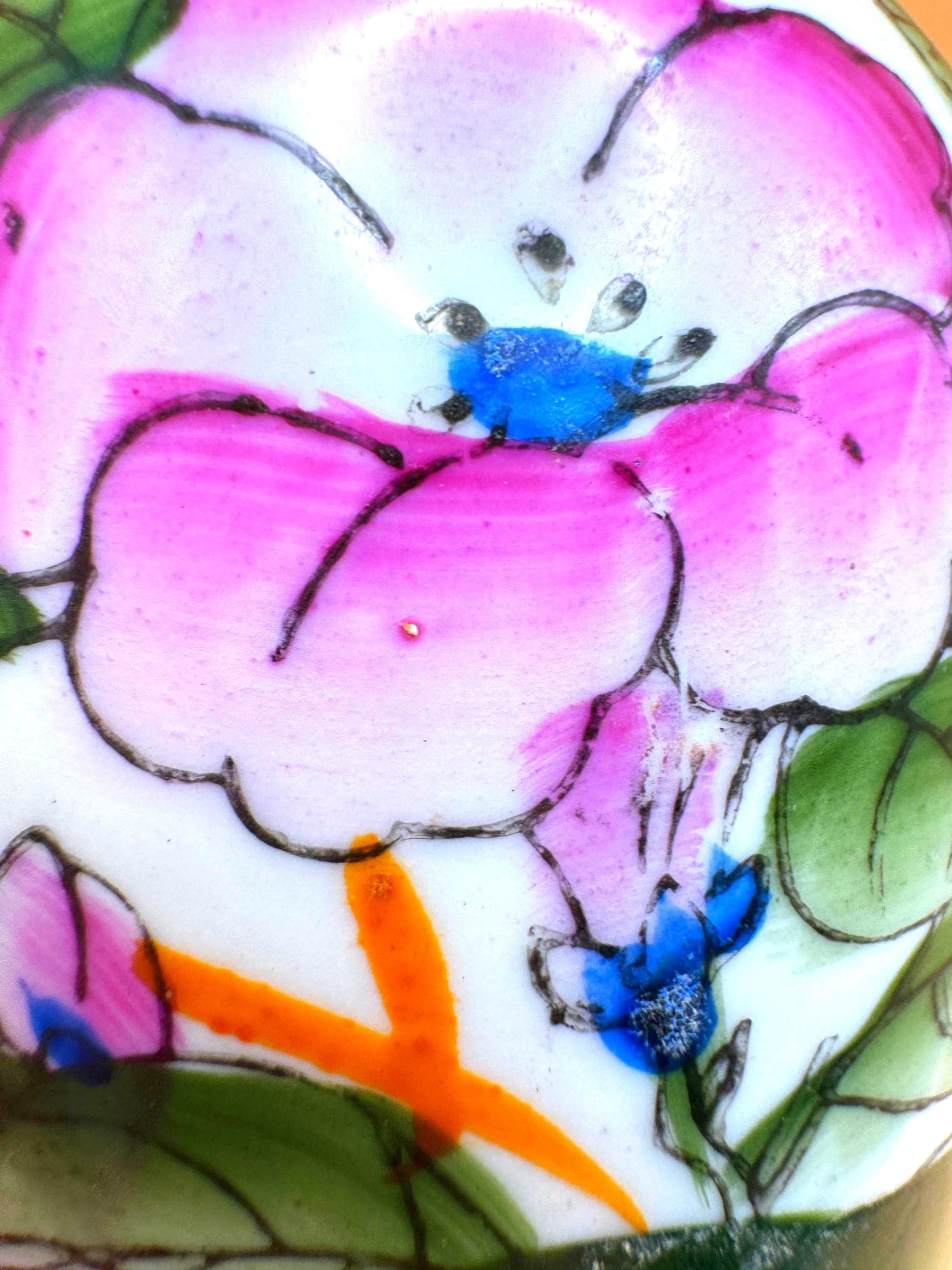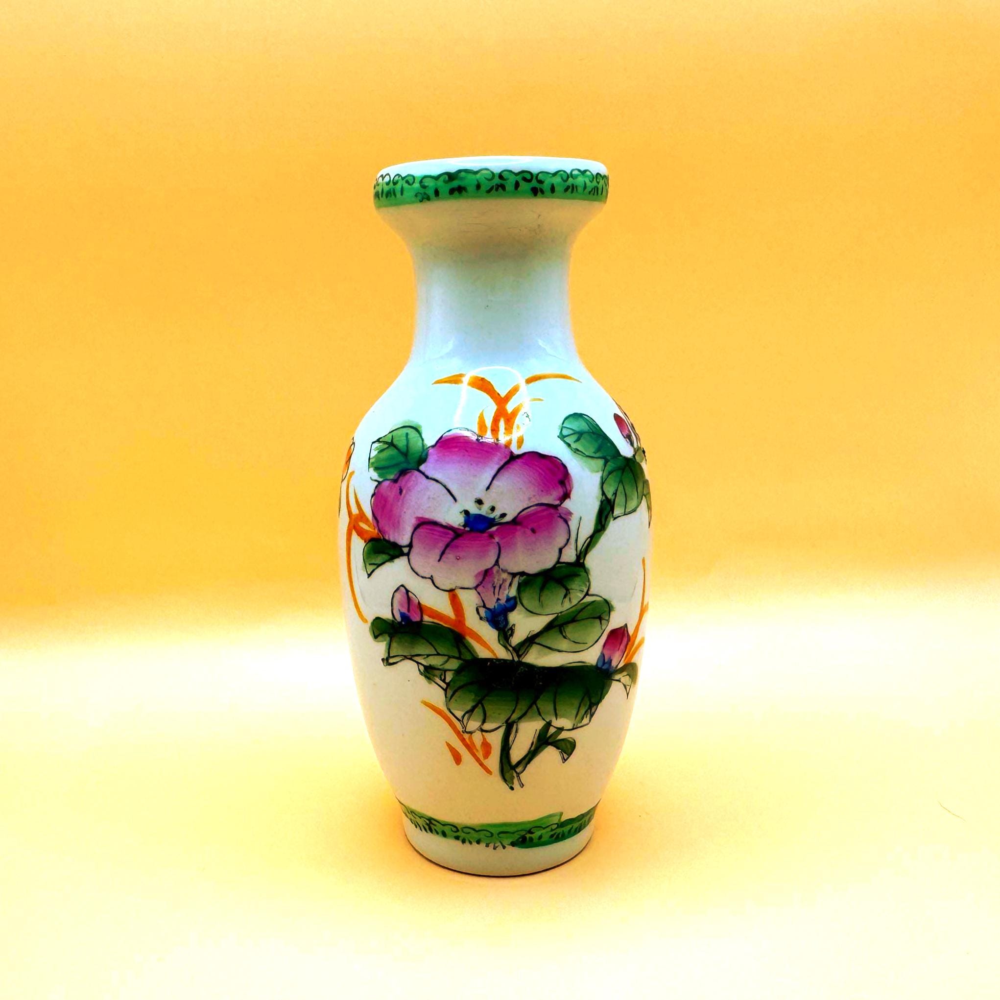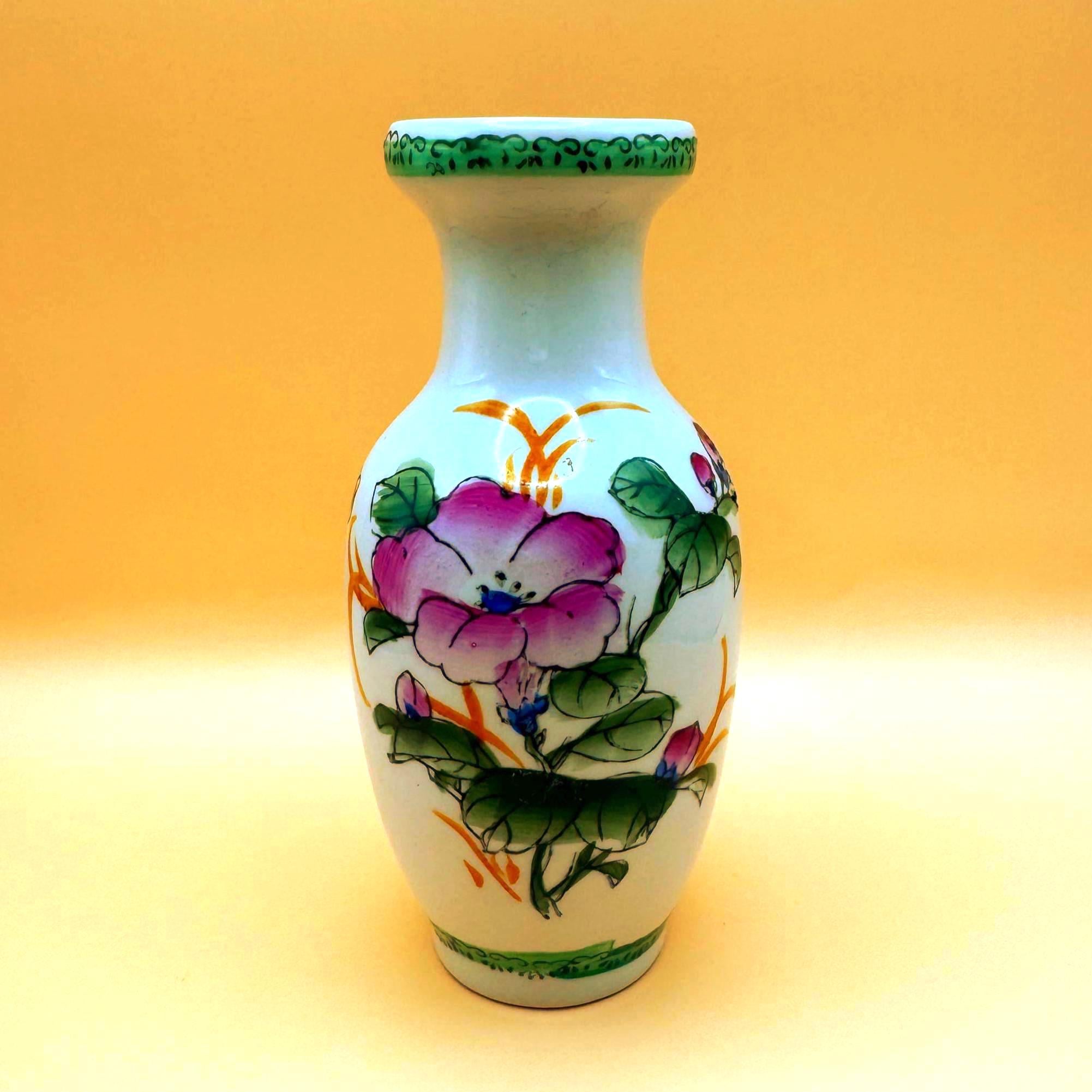 This charming vintage porcelain vase features a beautifully hand-painted floral design with soft pink and purple blooms on one side and warm orange florals on the other. Delicate green leaves and a decorative green scroll trim at the top and base add a lovely contrast and vintage character.