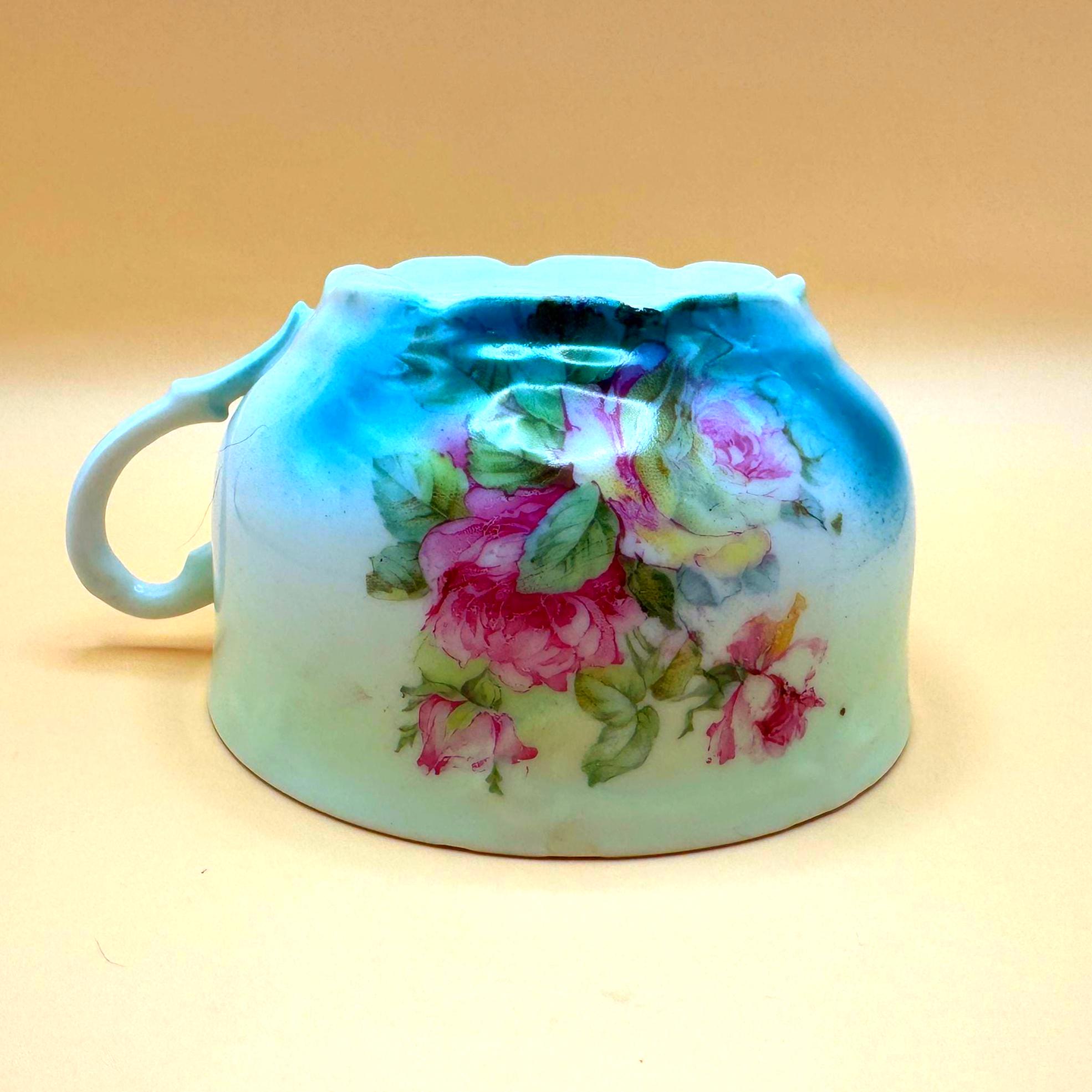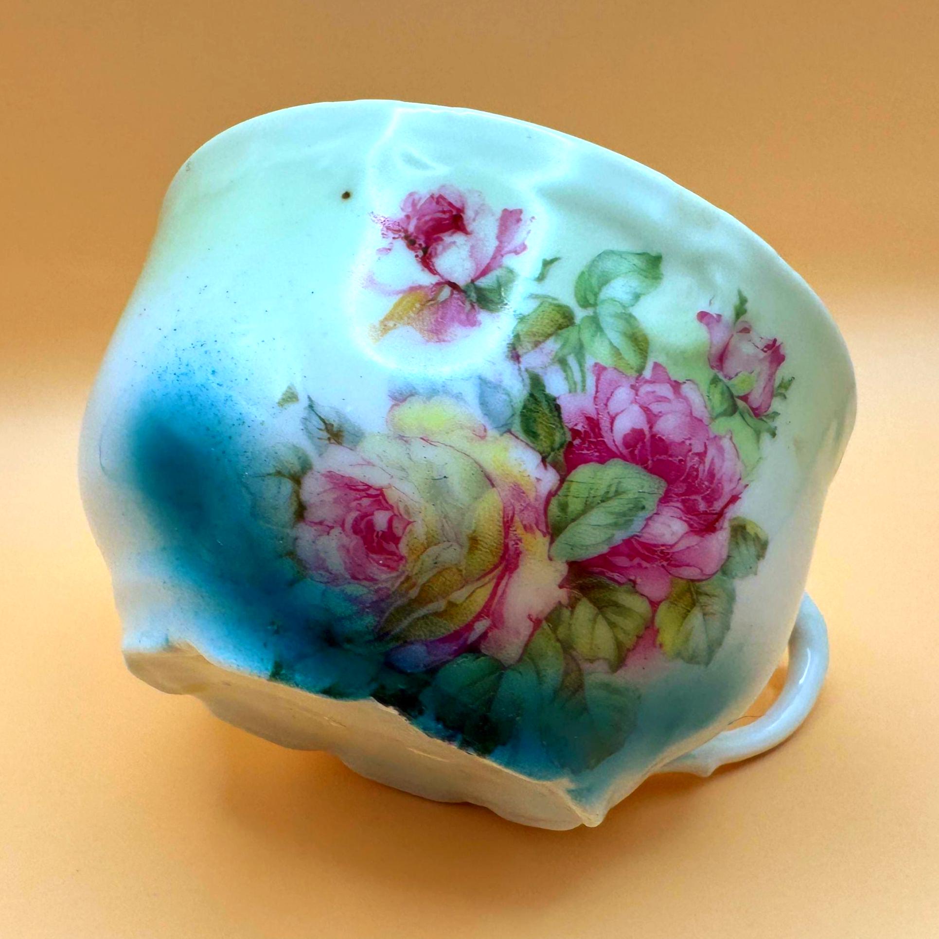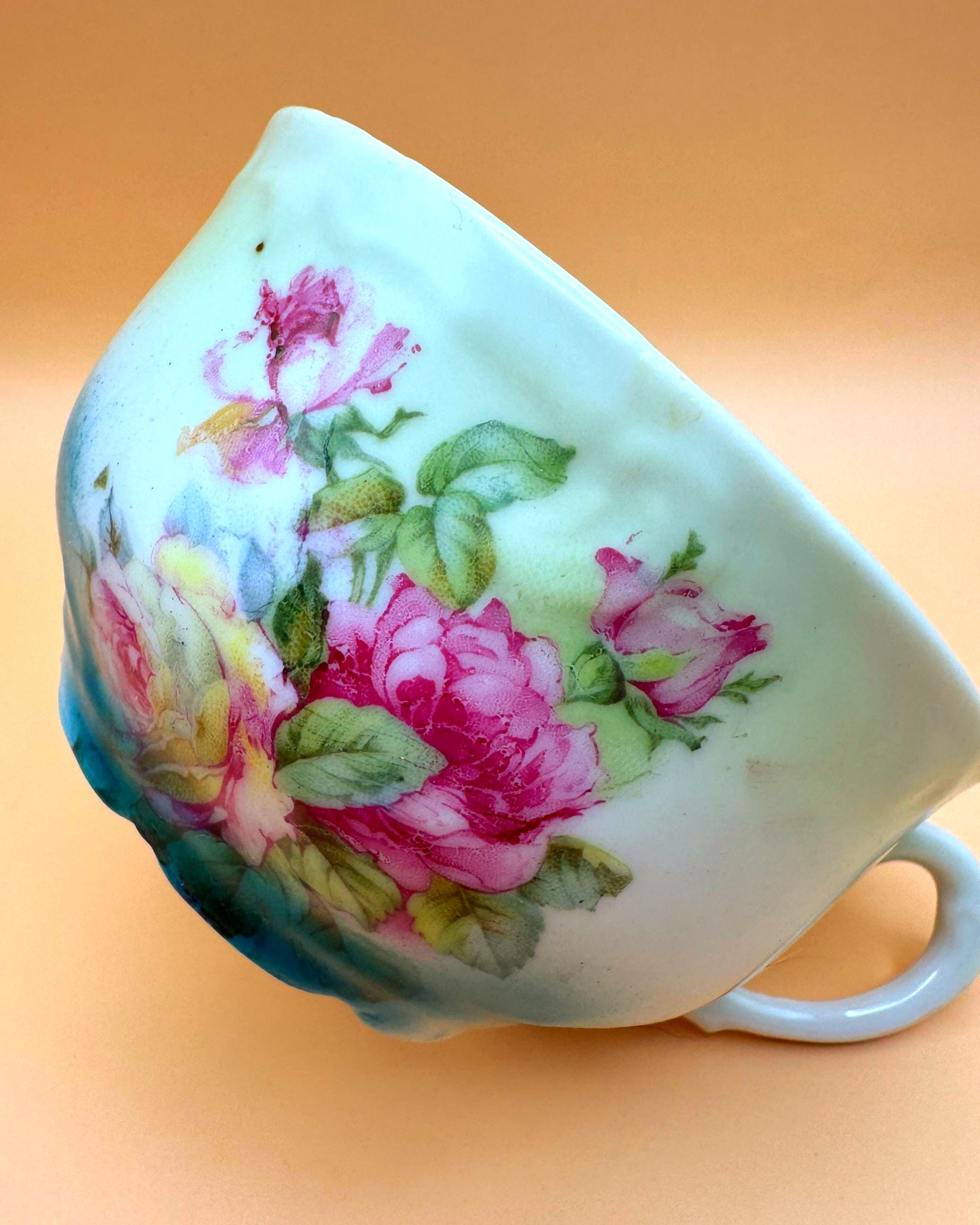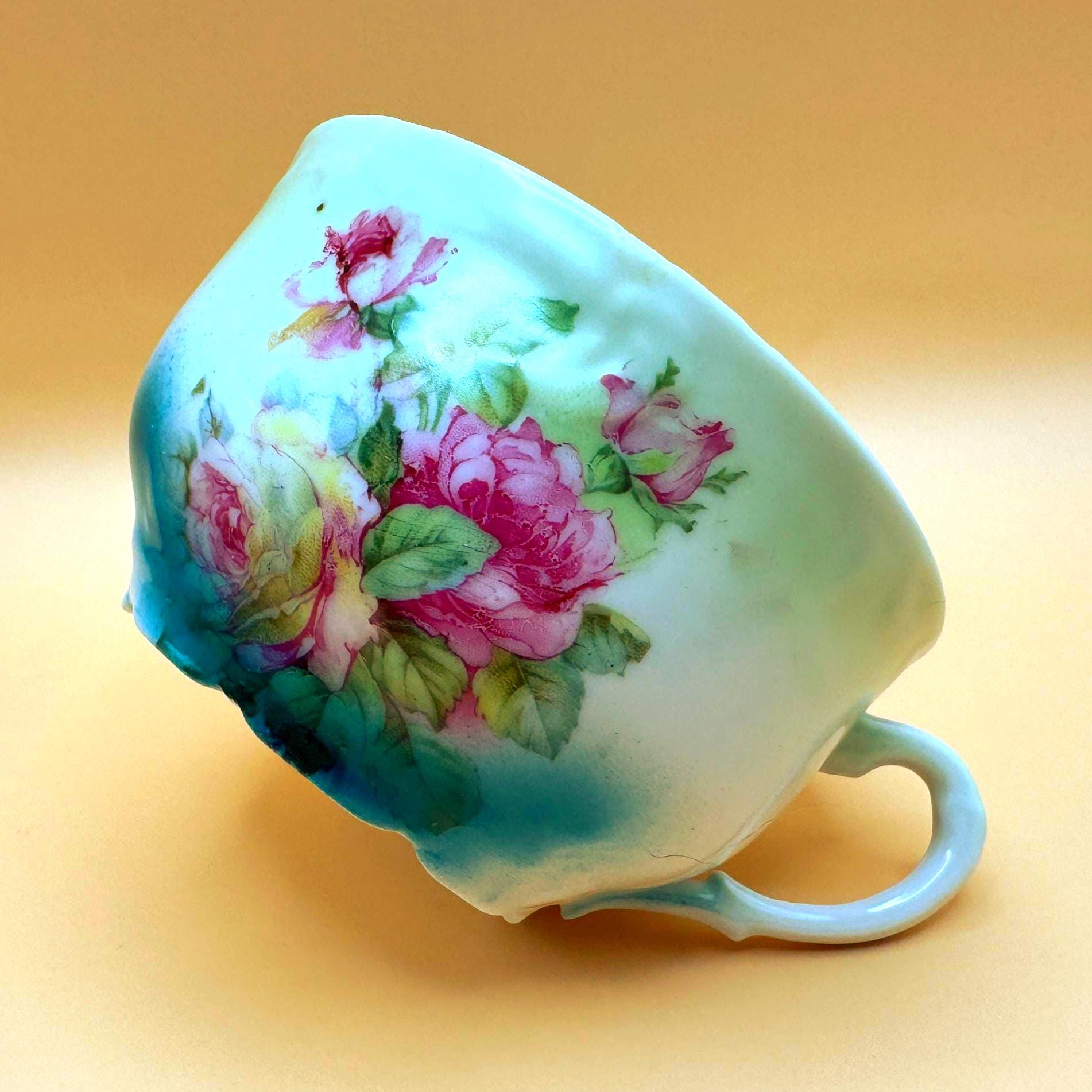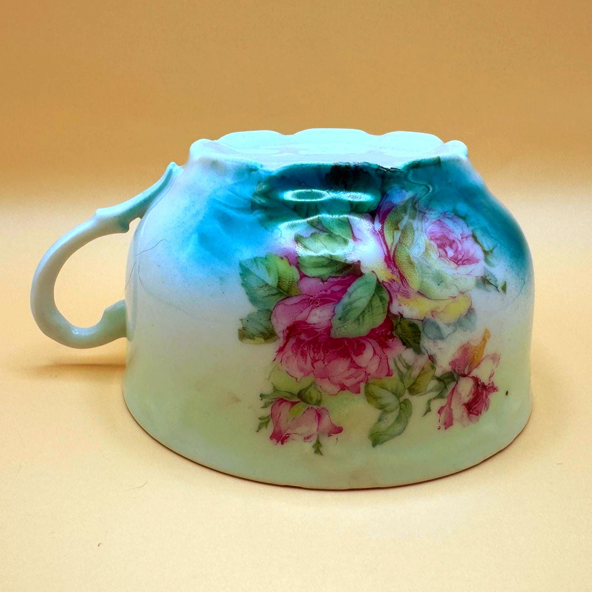 This beautiful vintage teacup features a soft, romantic blend of hand-painted pink roses set against a dreamy green to turquoise ombré background. The delicate floral design paired with its gently scalloped shape gives it a timeless, cottage-inspired charm.