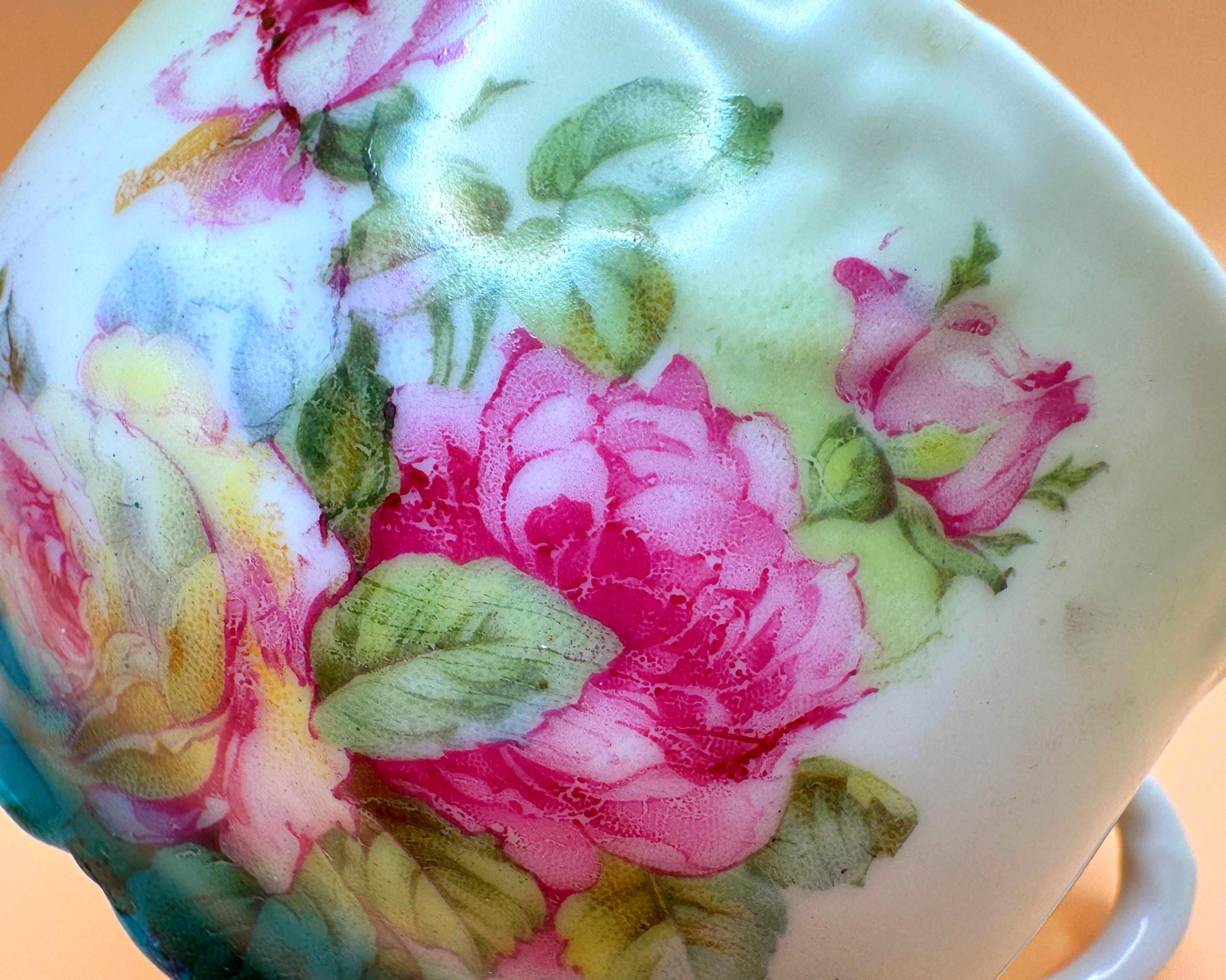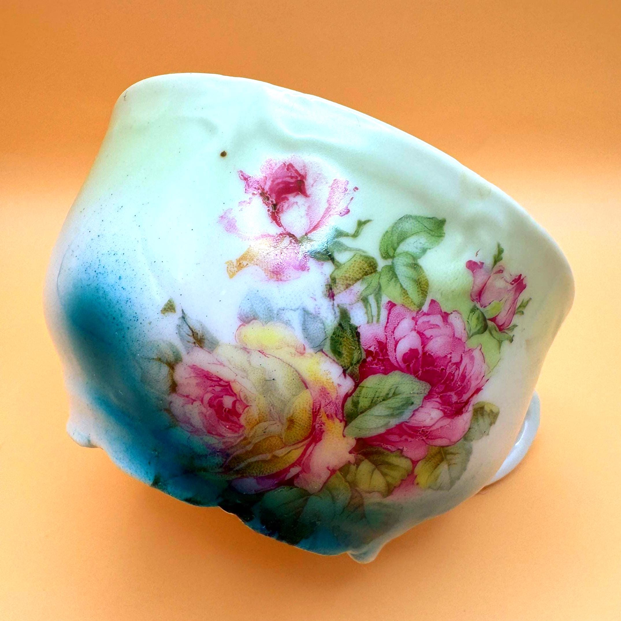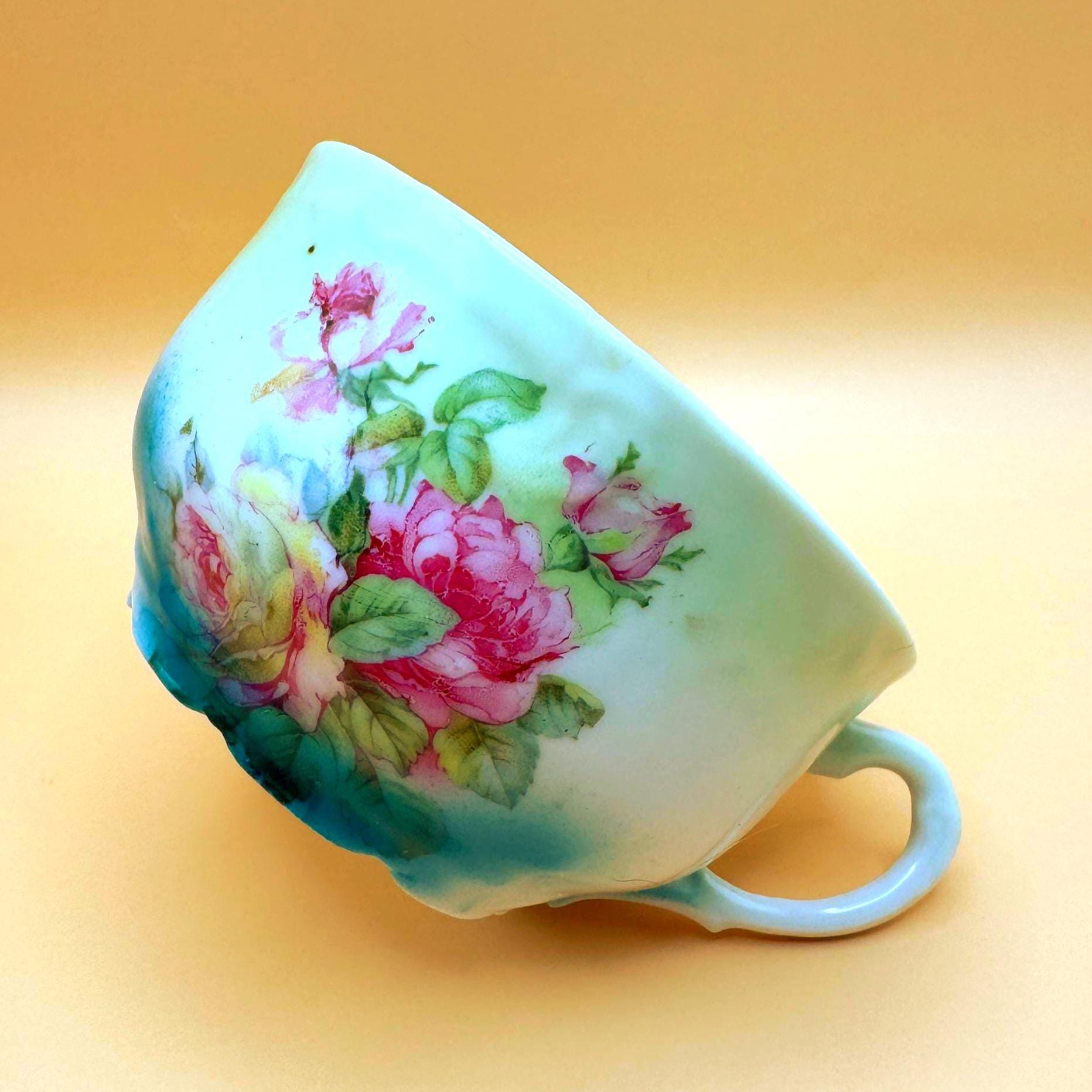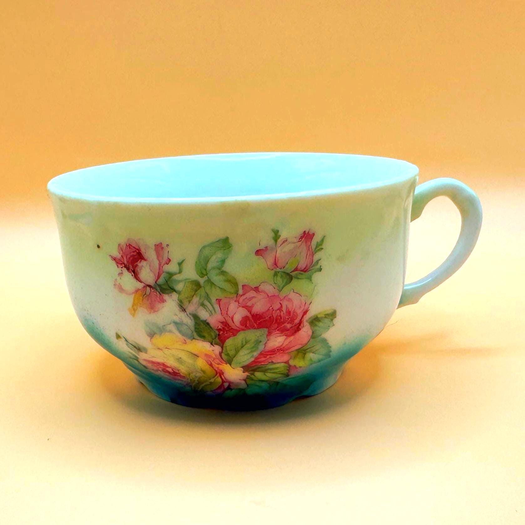 This beautiful vintage teacup features a soft, romantic blend of hand-painted pink roses set against a dreamy green to turquoise ombré background. The delicate floral design paired with its gently scalloped shape gives it a timeless, cottage-inspired charm.