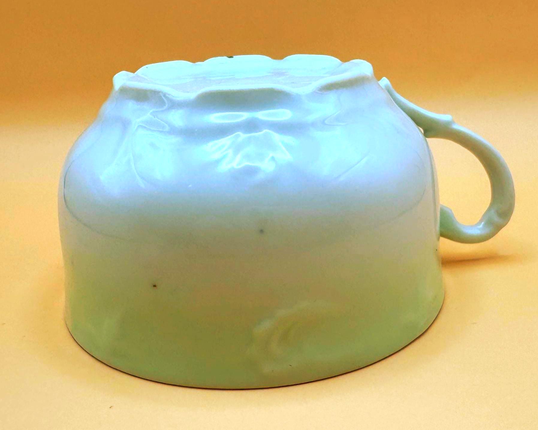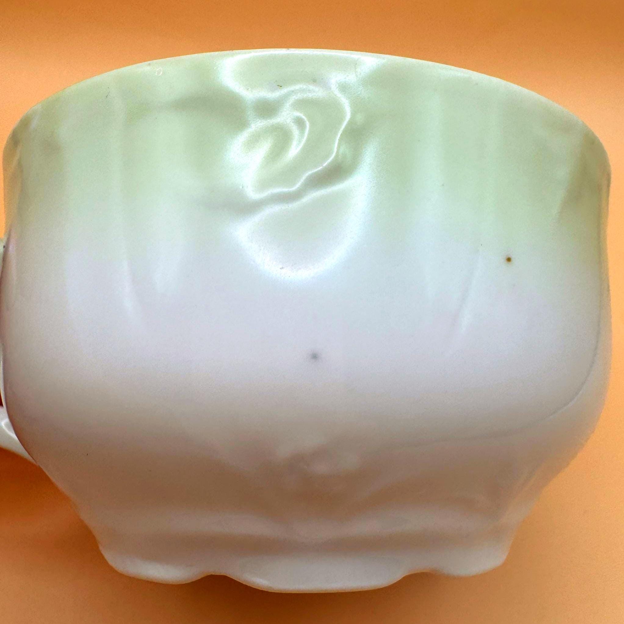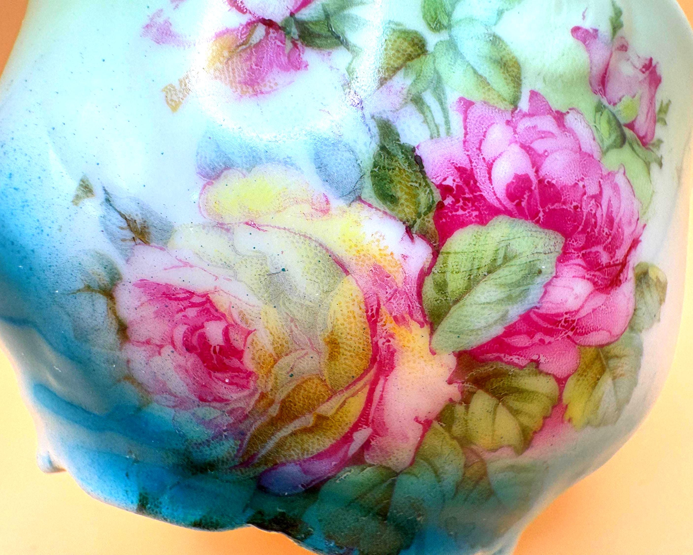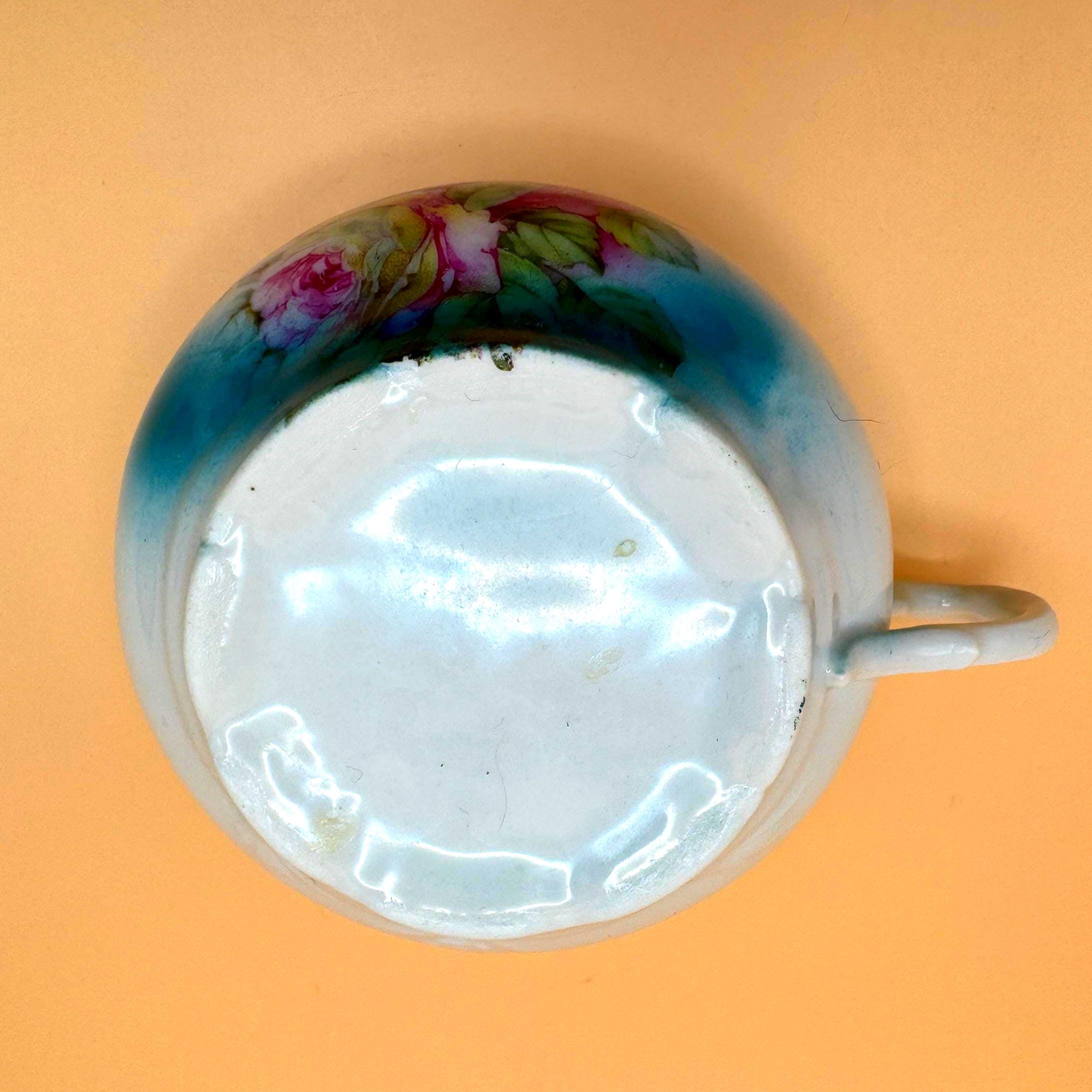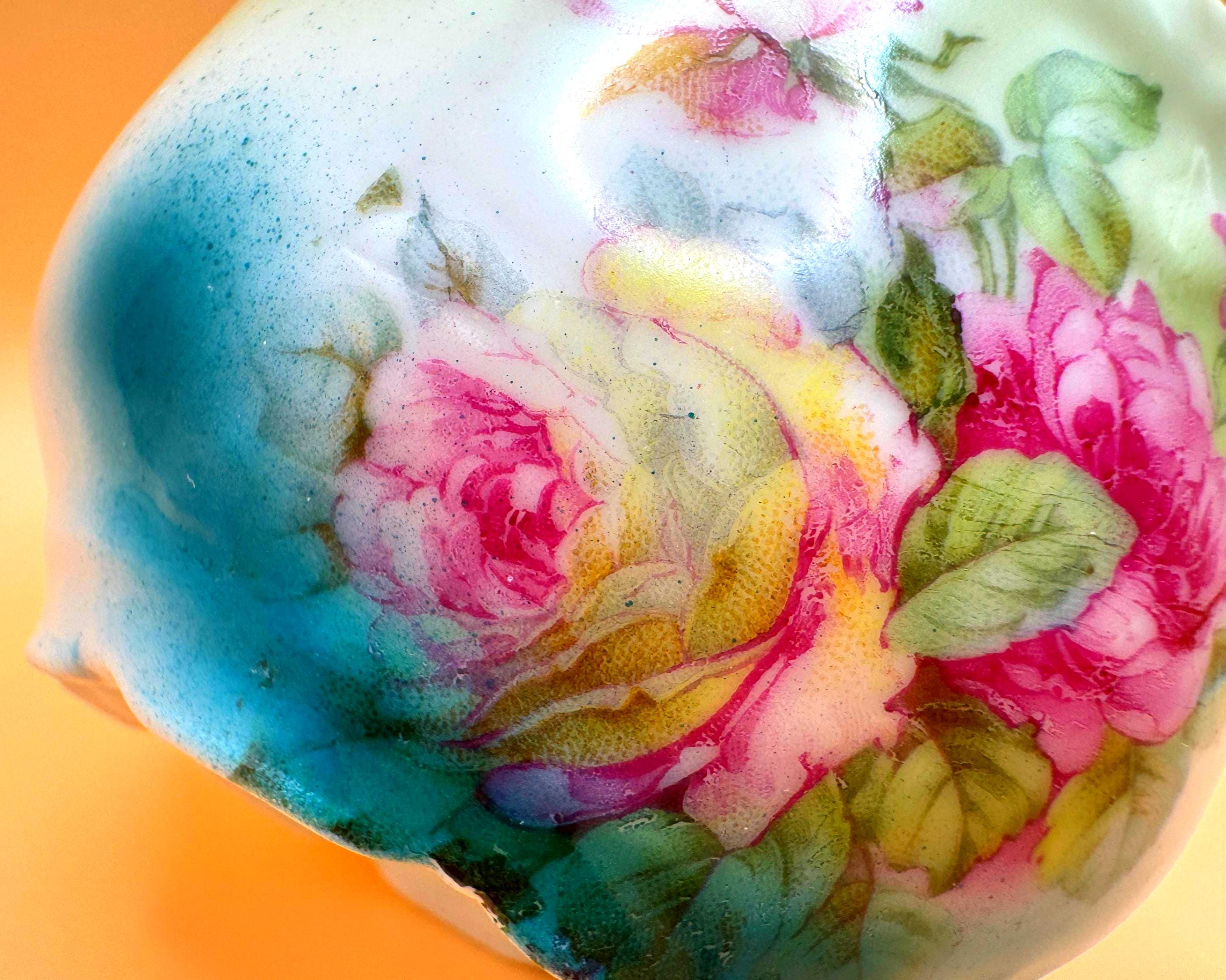 This beautiful vintage teacup features a soft, romantic blend of hand-painted pink roses set against a dreamy green to turquoise ombré background. The delicate floral design paired with its gently scalloped shape gives it a timeless, cottage-inspired charm.
