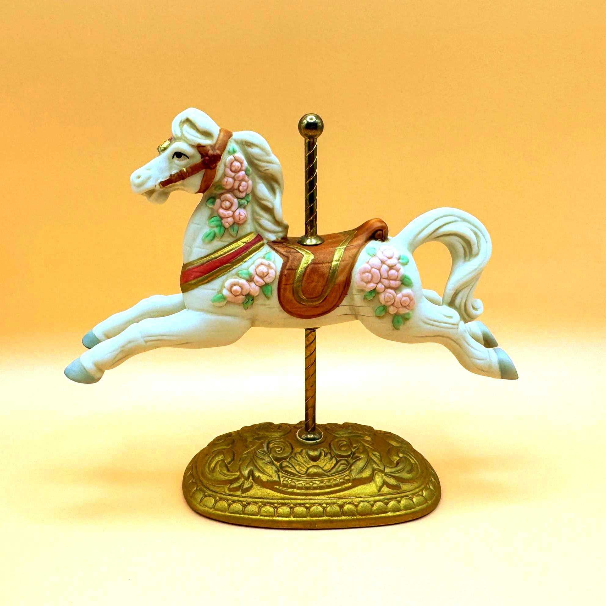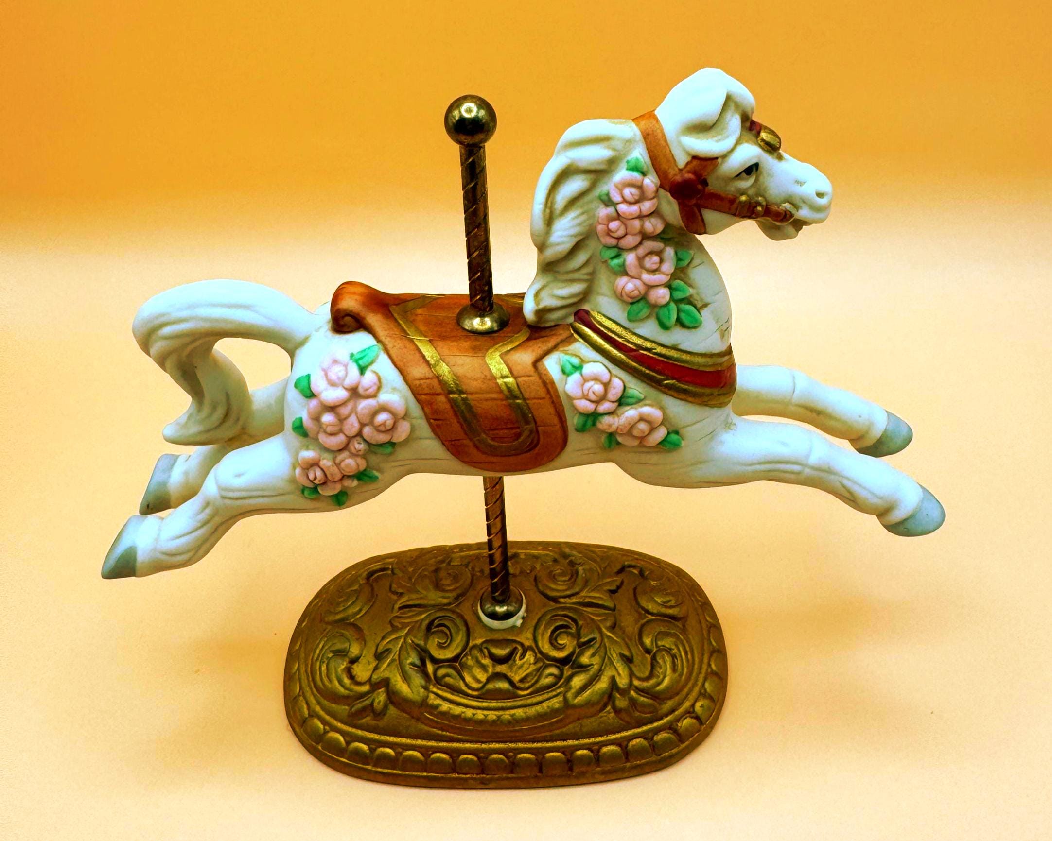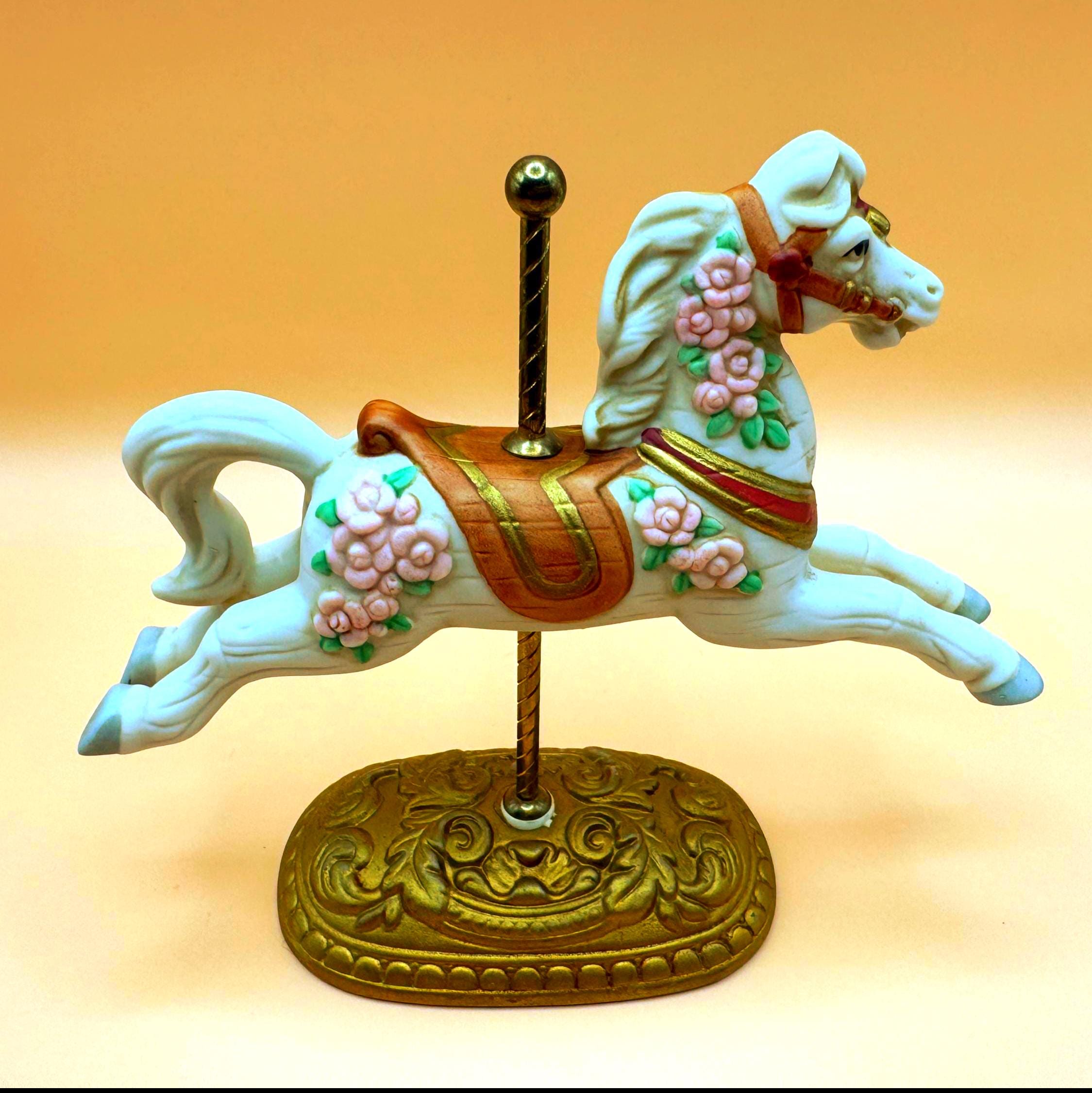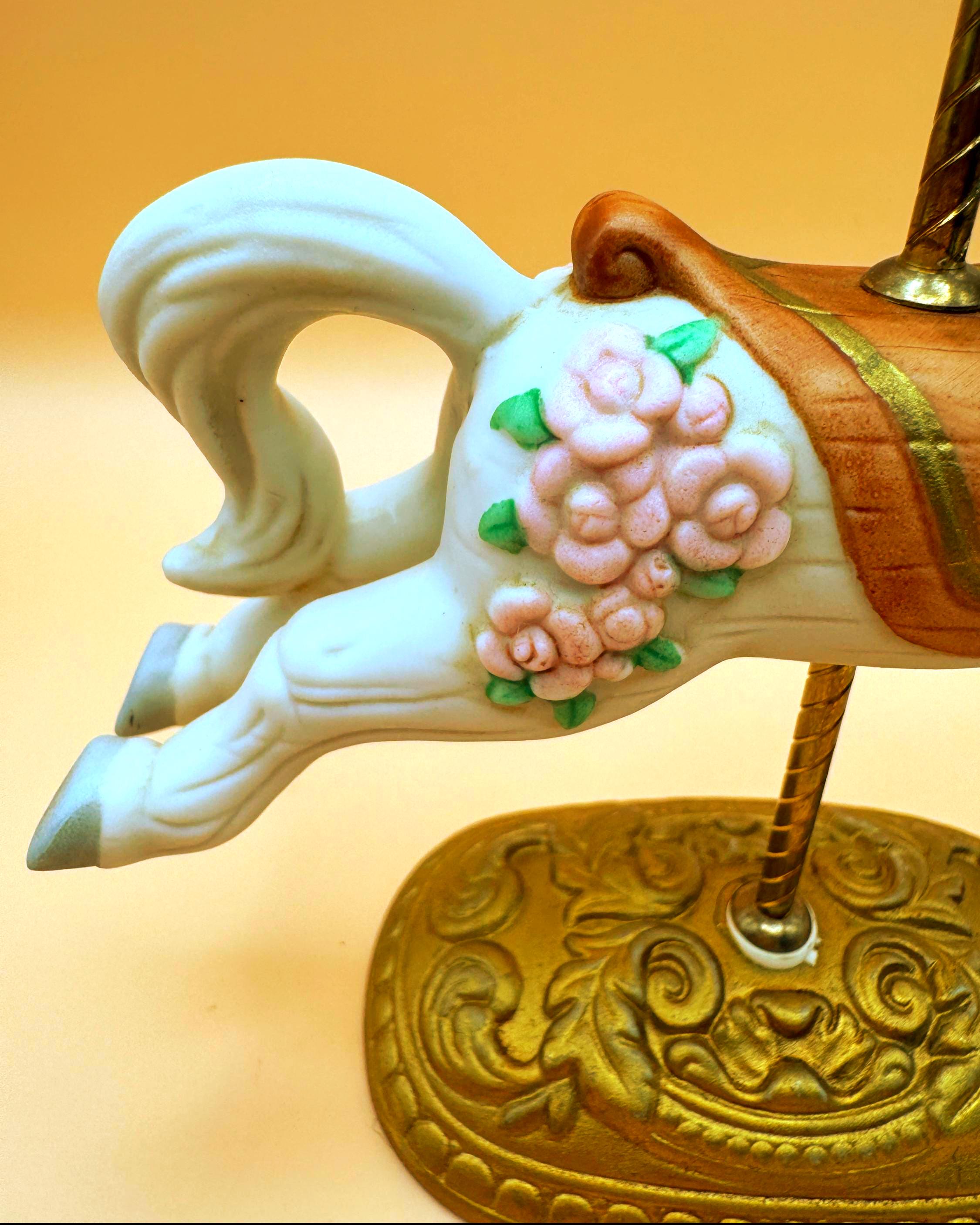 This charming vintage HOMCO carousel horse figurine features a beautifully detailed white porcelain horse adorned with soft pink florals and a classic saddle design. Mounted on a decorative gold-tone base, it captures the nostalgic elegance of traditional carousel pieces.