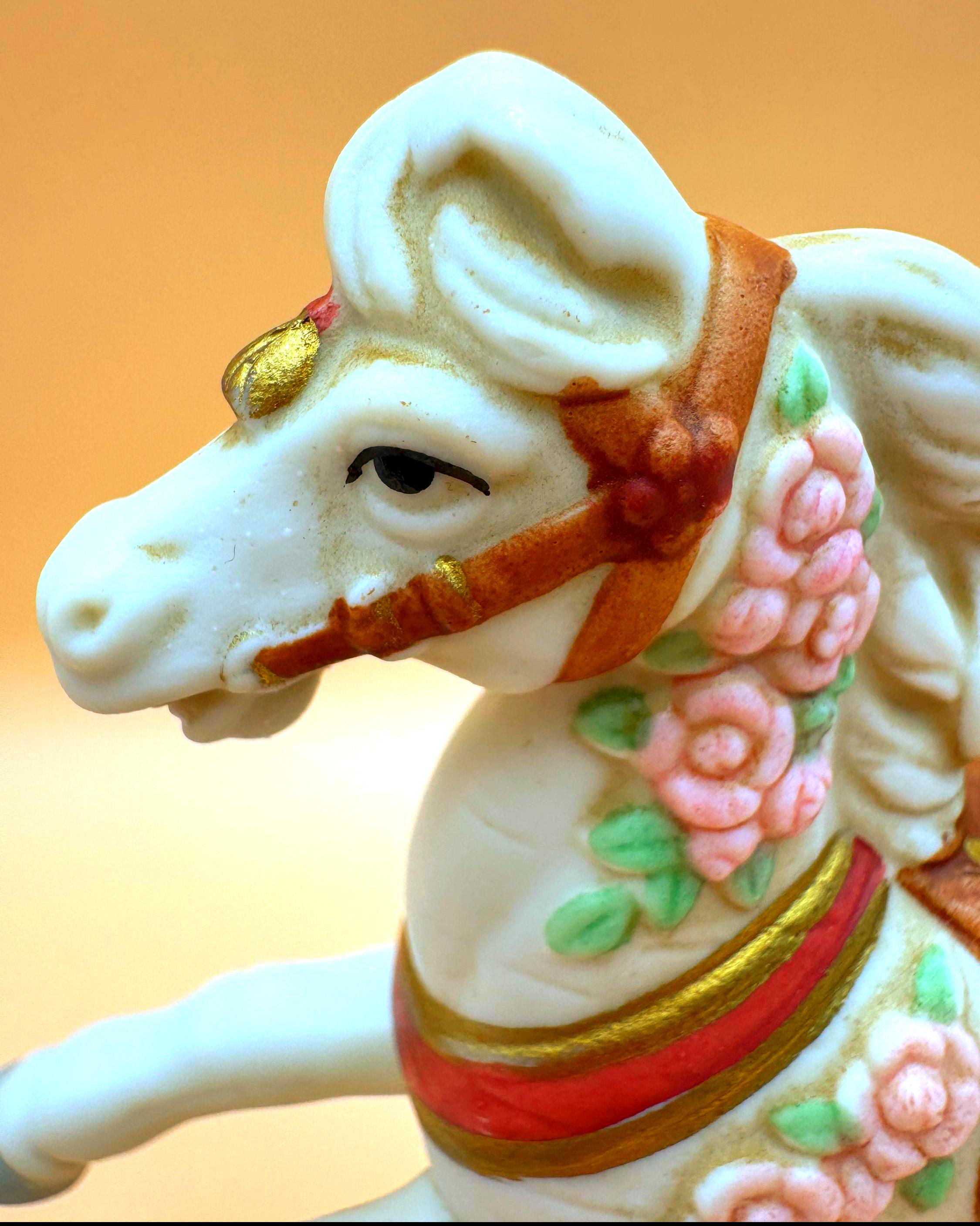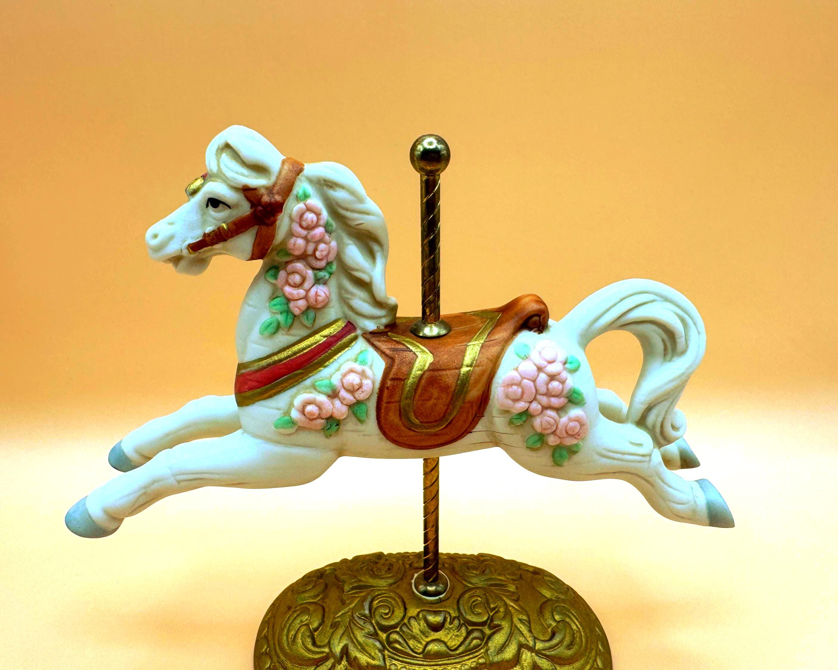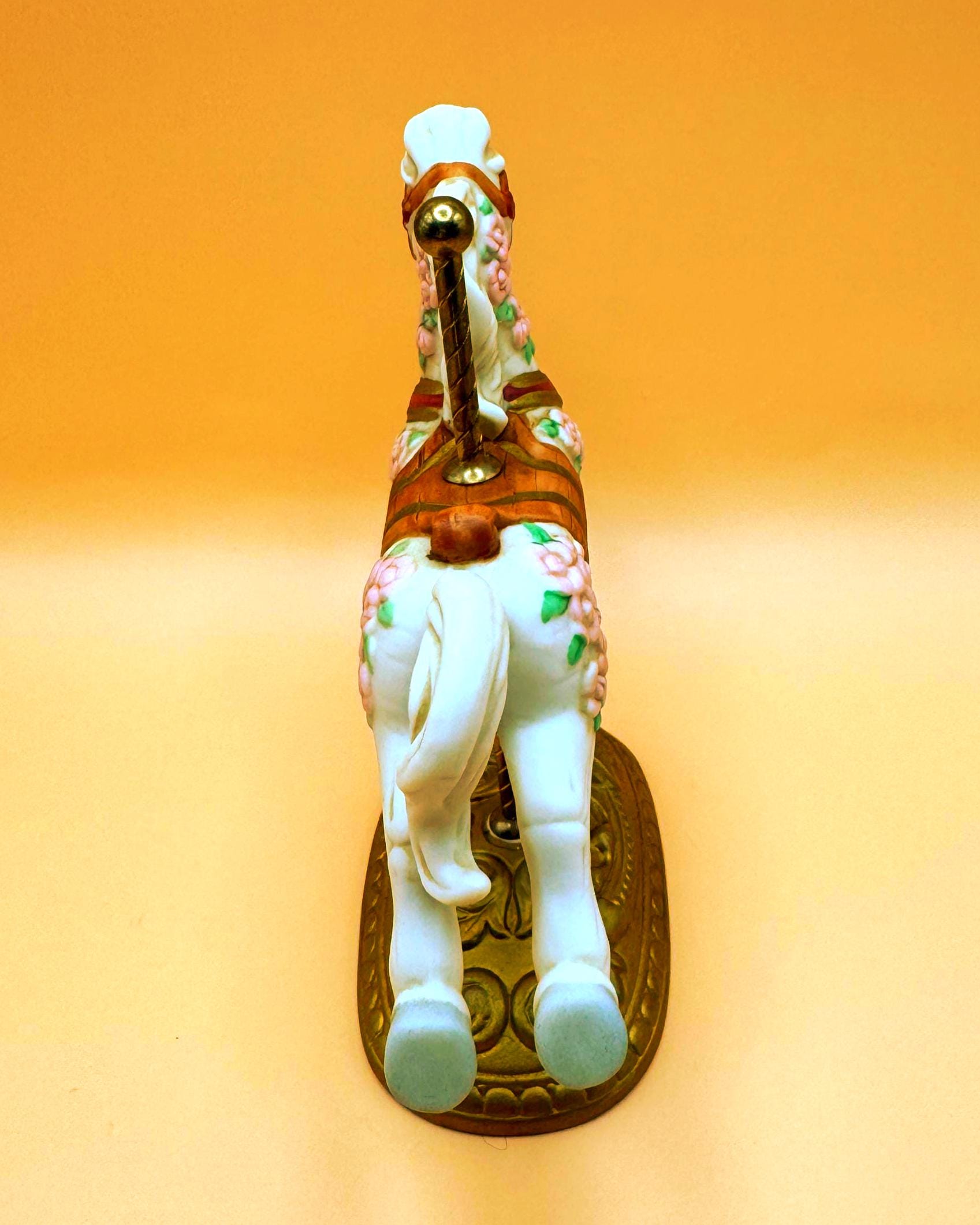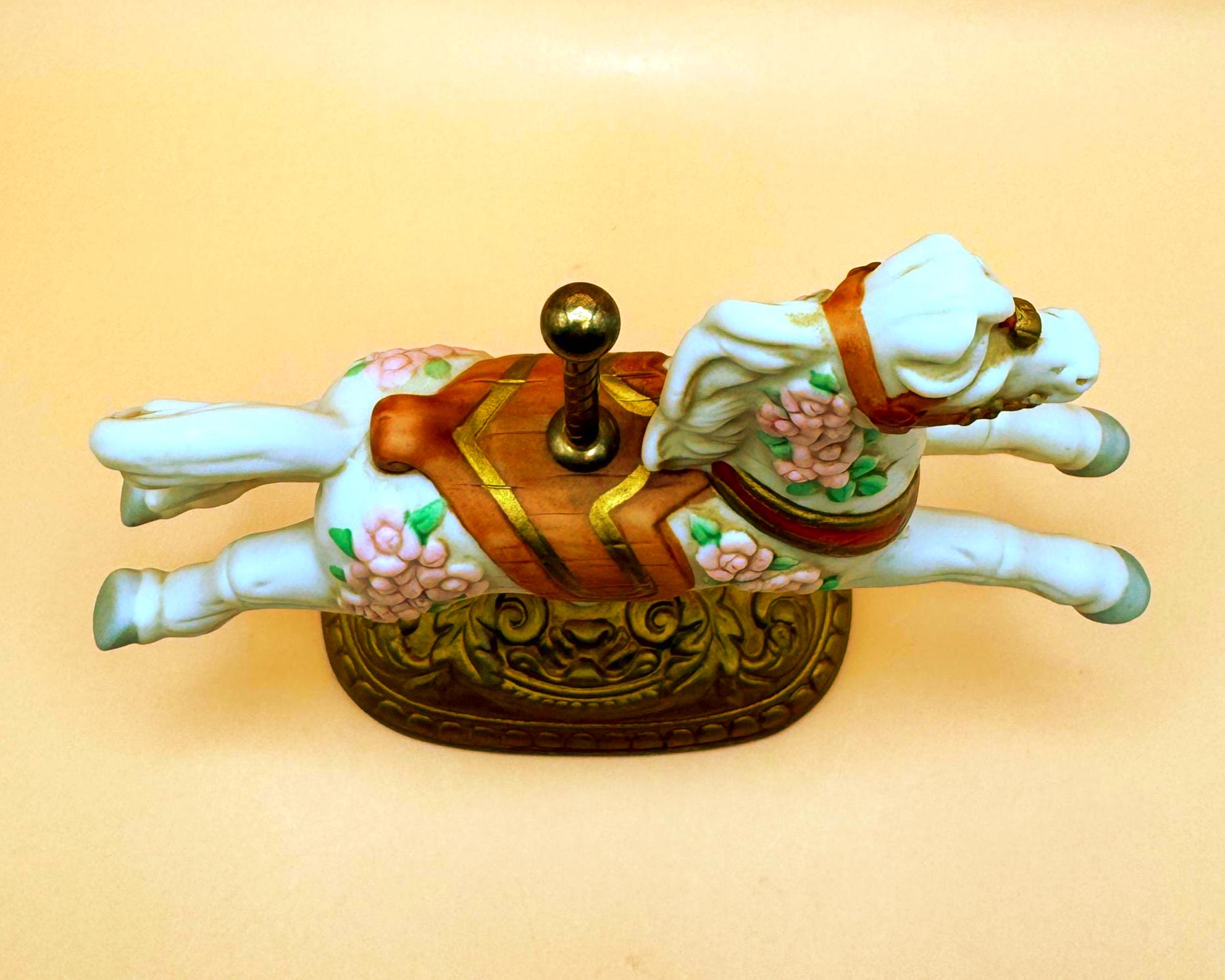 This charming vintage HOMCO carousel horse figurine features a beautifully detailed white porcelain horse adorned with soft pink florals and a classic saddle design. Mounted on a decorative gold-tone base, it captures the nostalgic elegance of traditional carousel pieces.