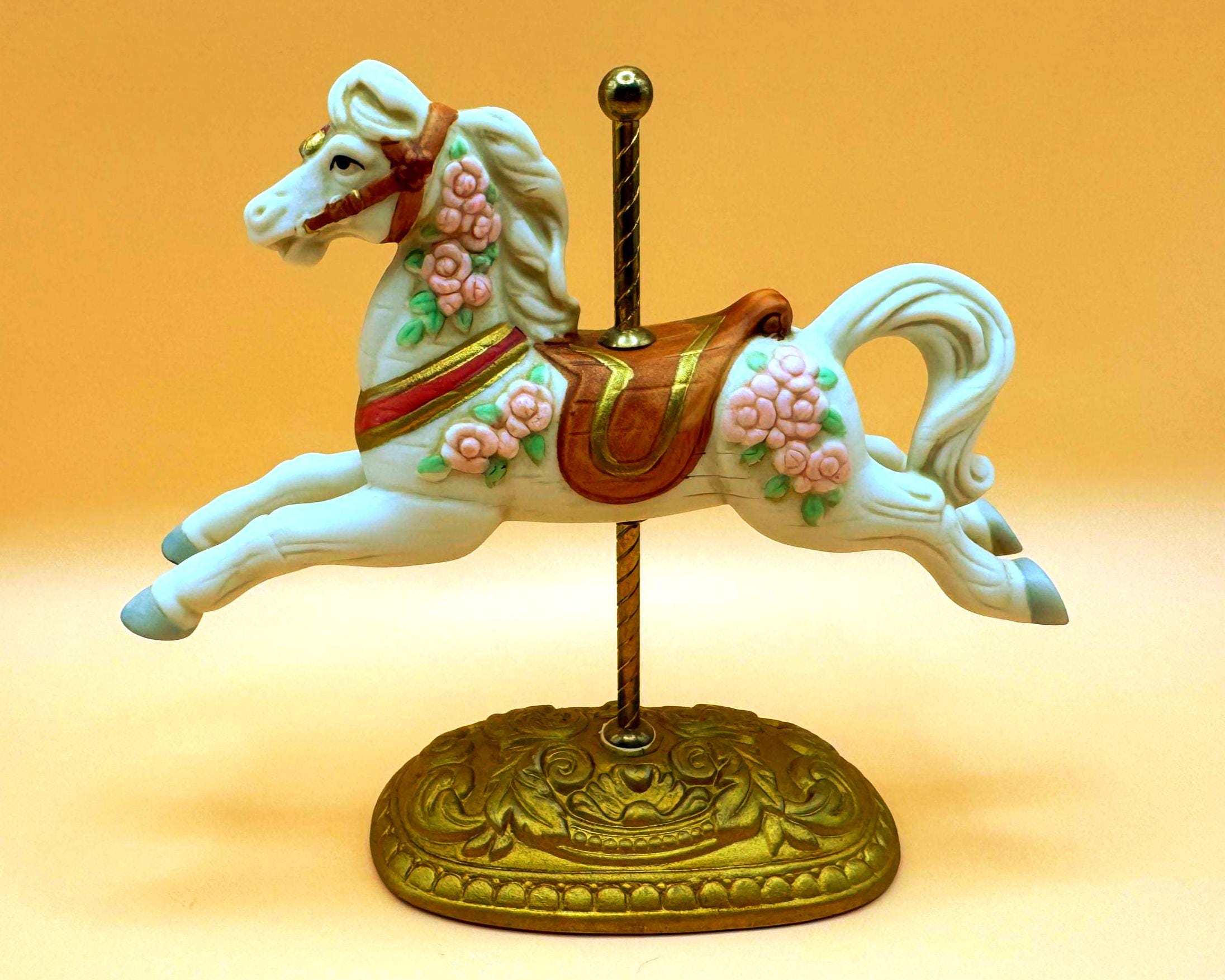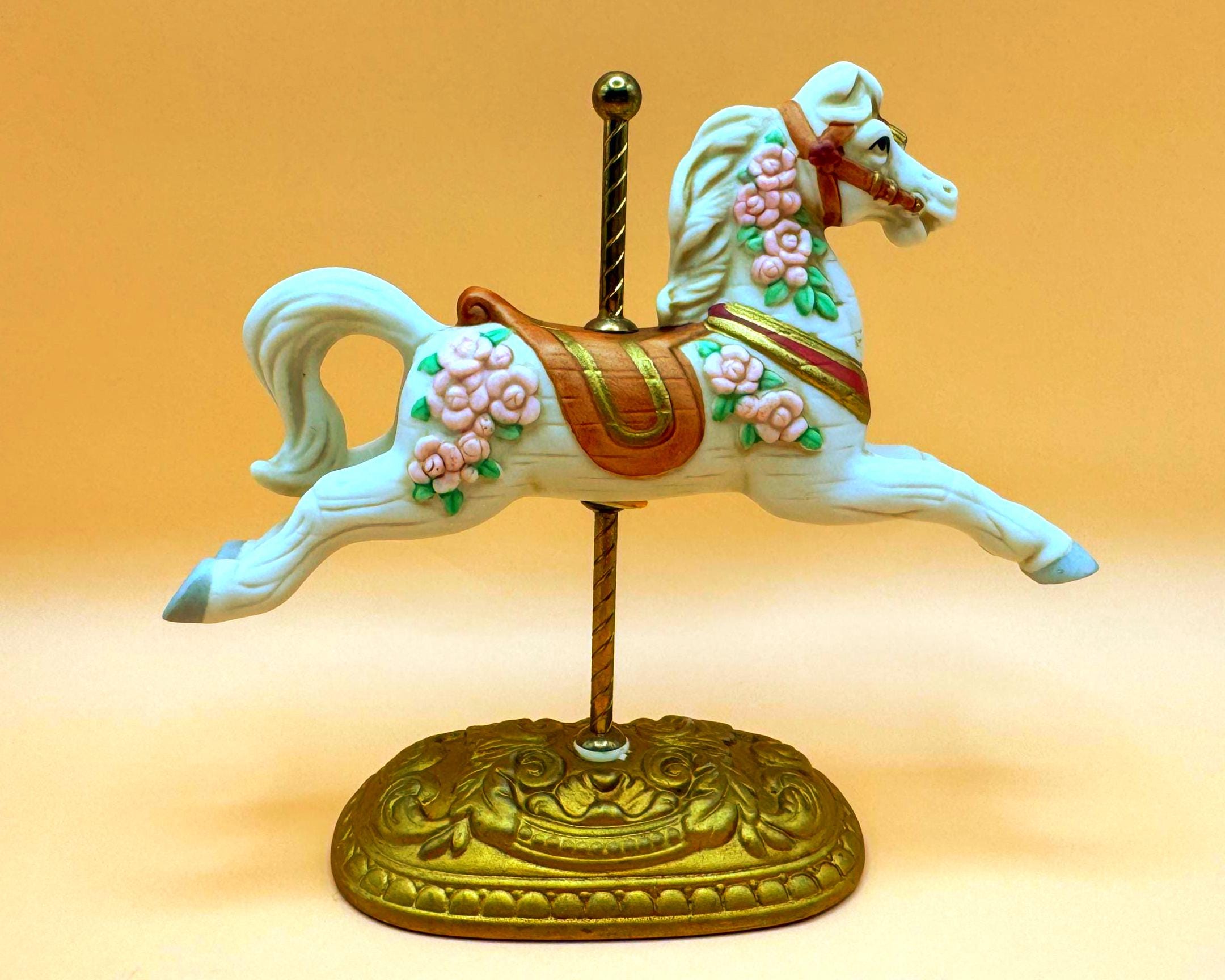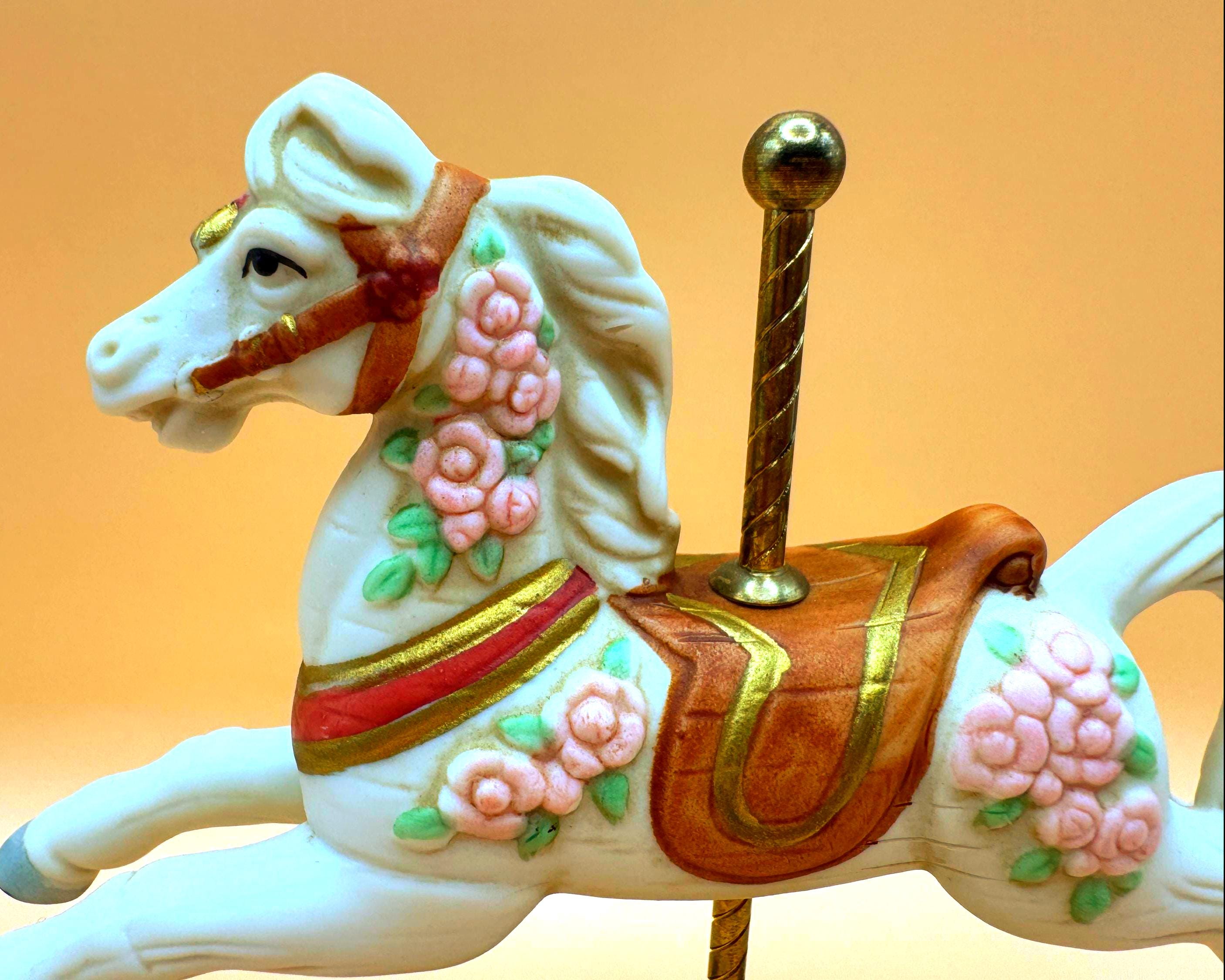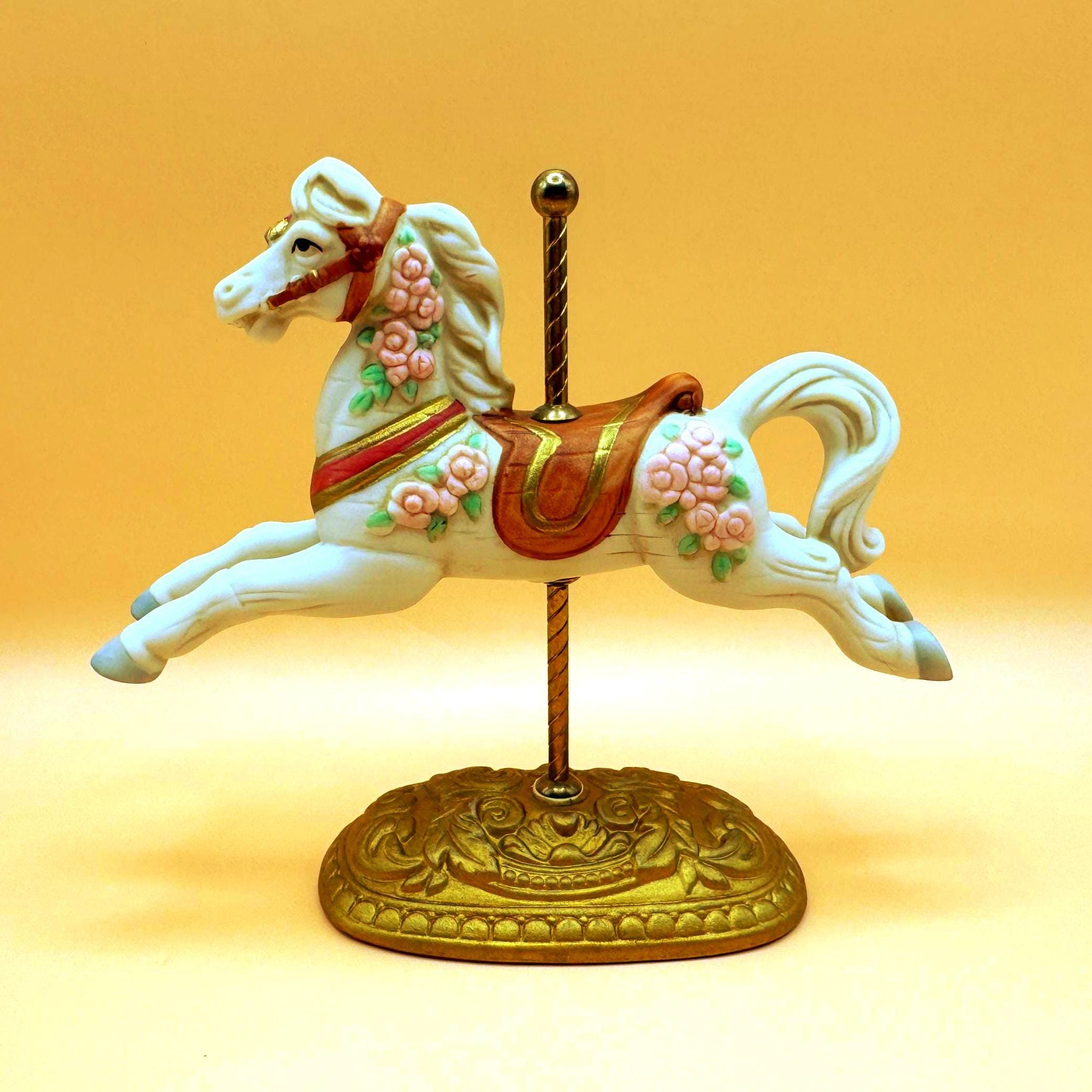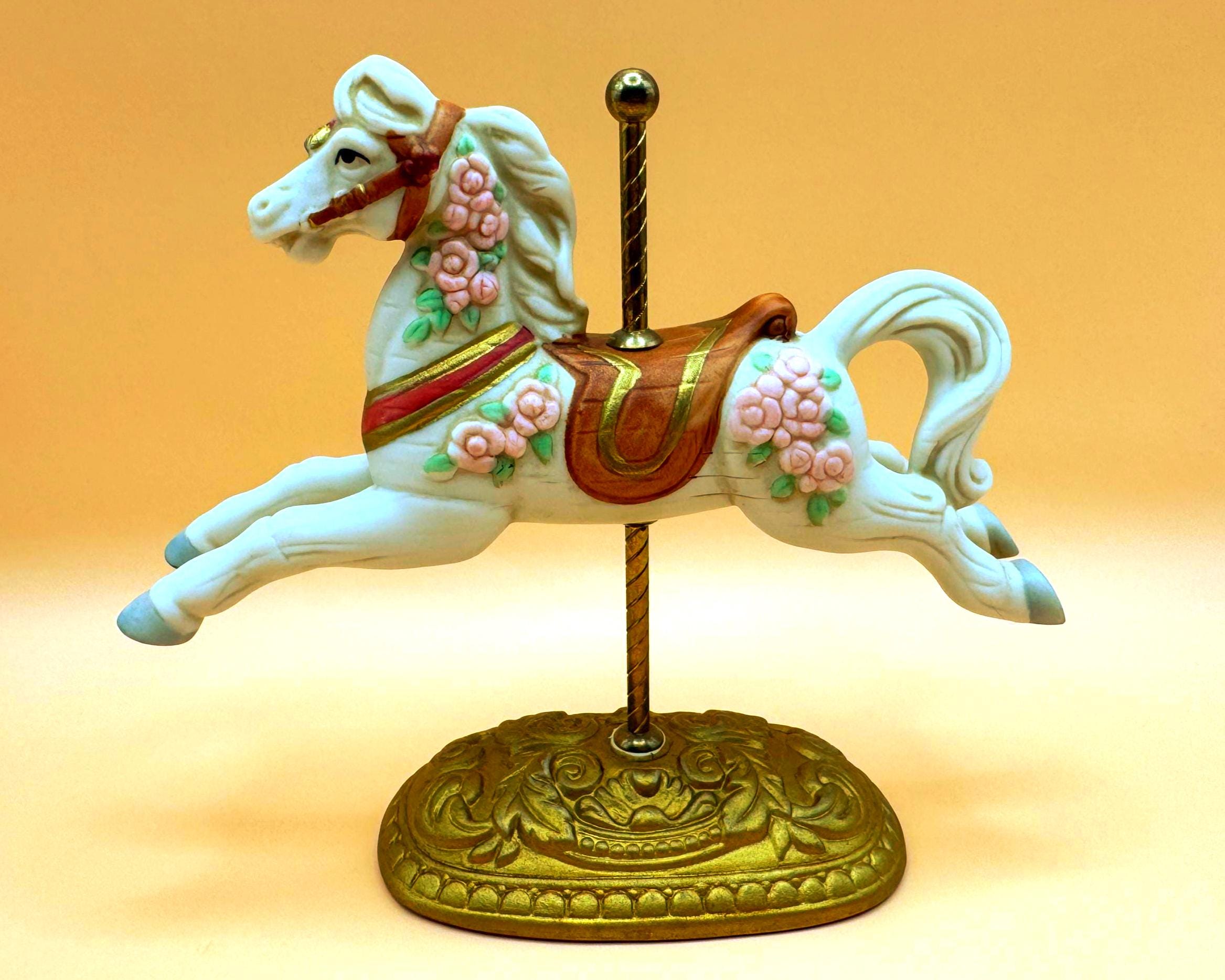 This charming vintage HOMCO carousel horse figurine features a beautifully detailed white porcelain horse adorned with soft pink florals and a classic saddle design. Mounted on a decorative gold-tone base, it captures the nostalgic elegance of traditional carousel pieces.