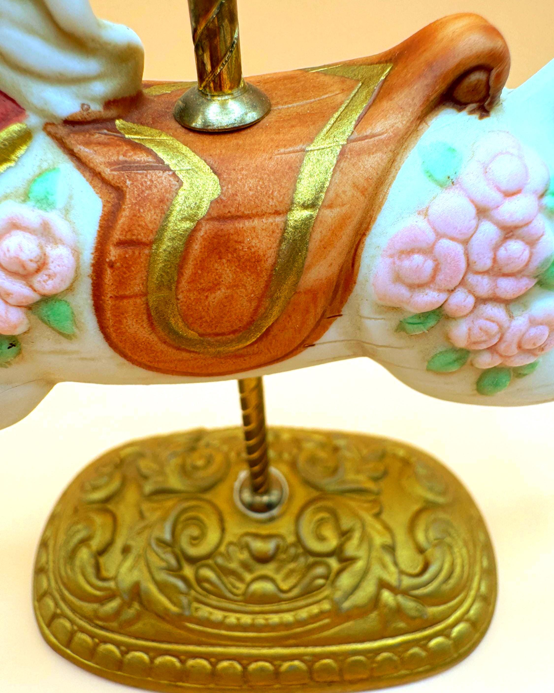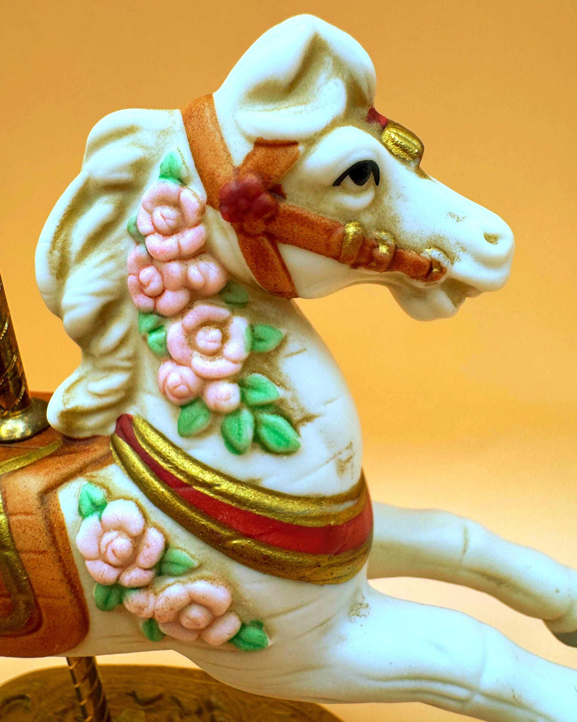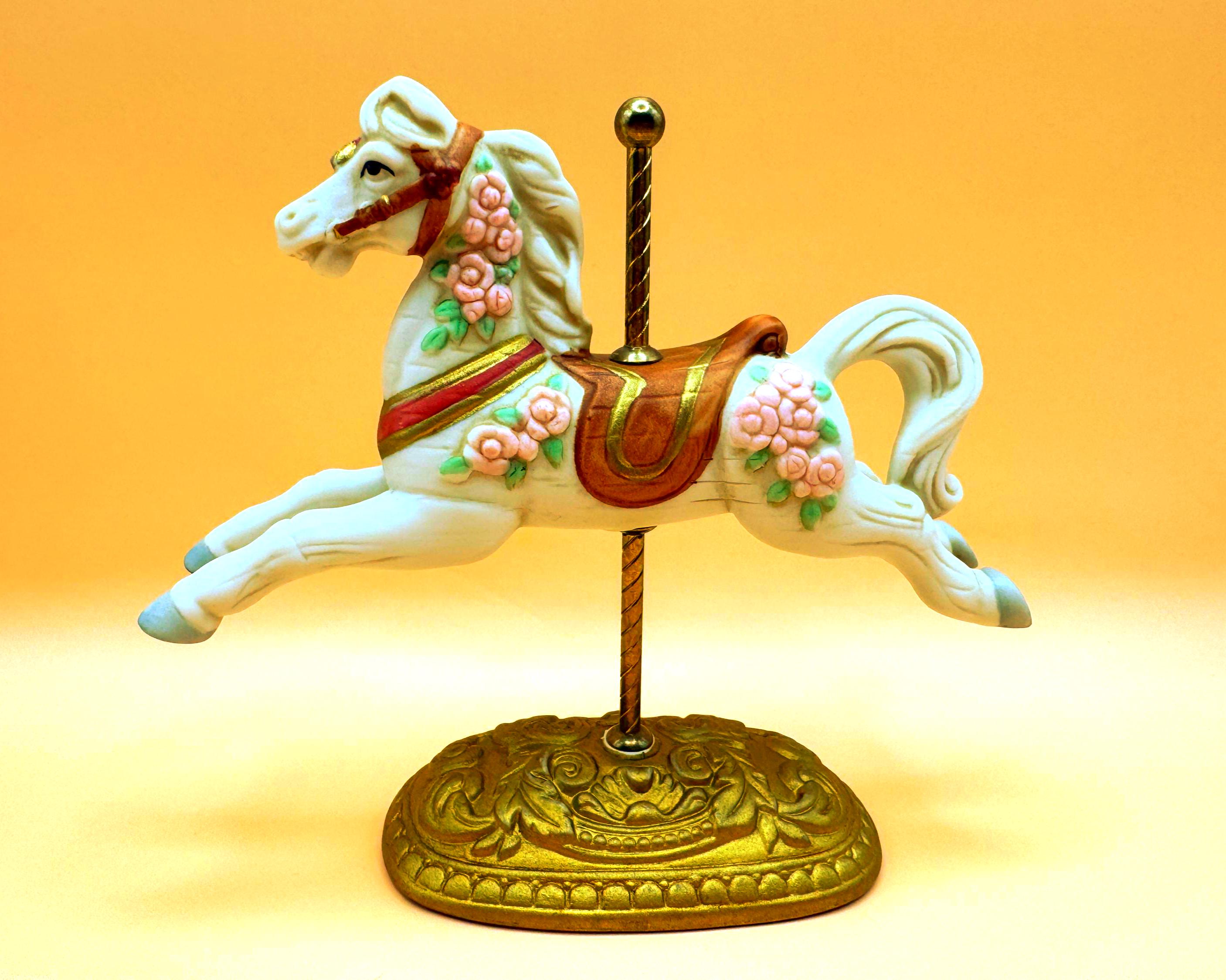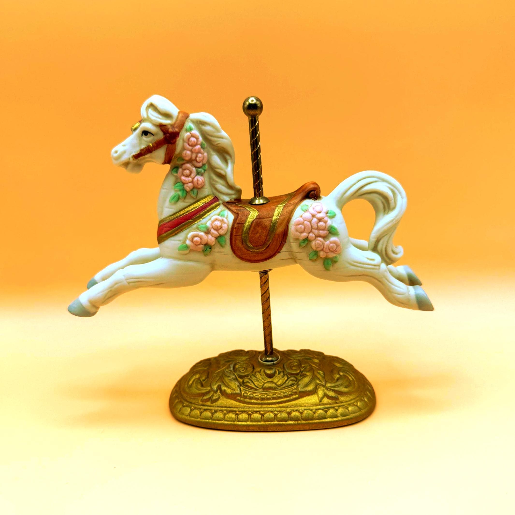 This charming vintage HOMCO carousel horse figurine features a beautifully detailed white porcelain horse adorned with soft pink florals and a classic saddle design. Mounted on a decorative gold-tone base, it captures the nostalgic elegance of traditional carousel pieces.