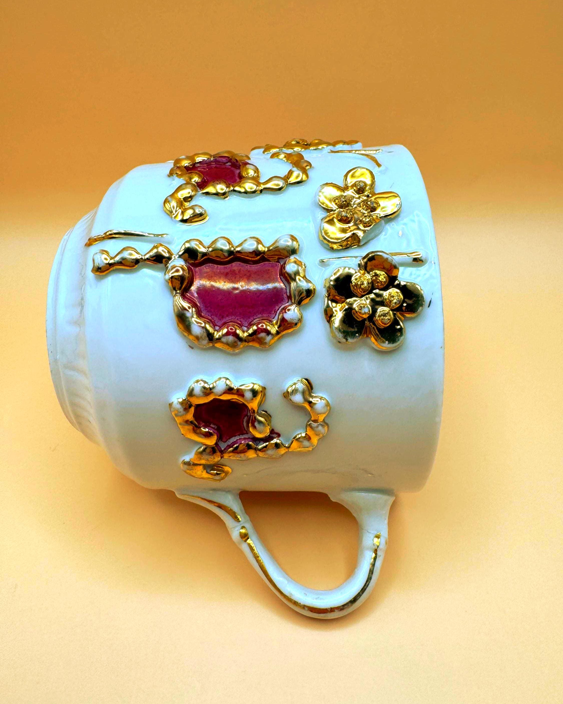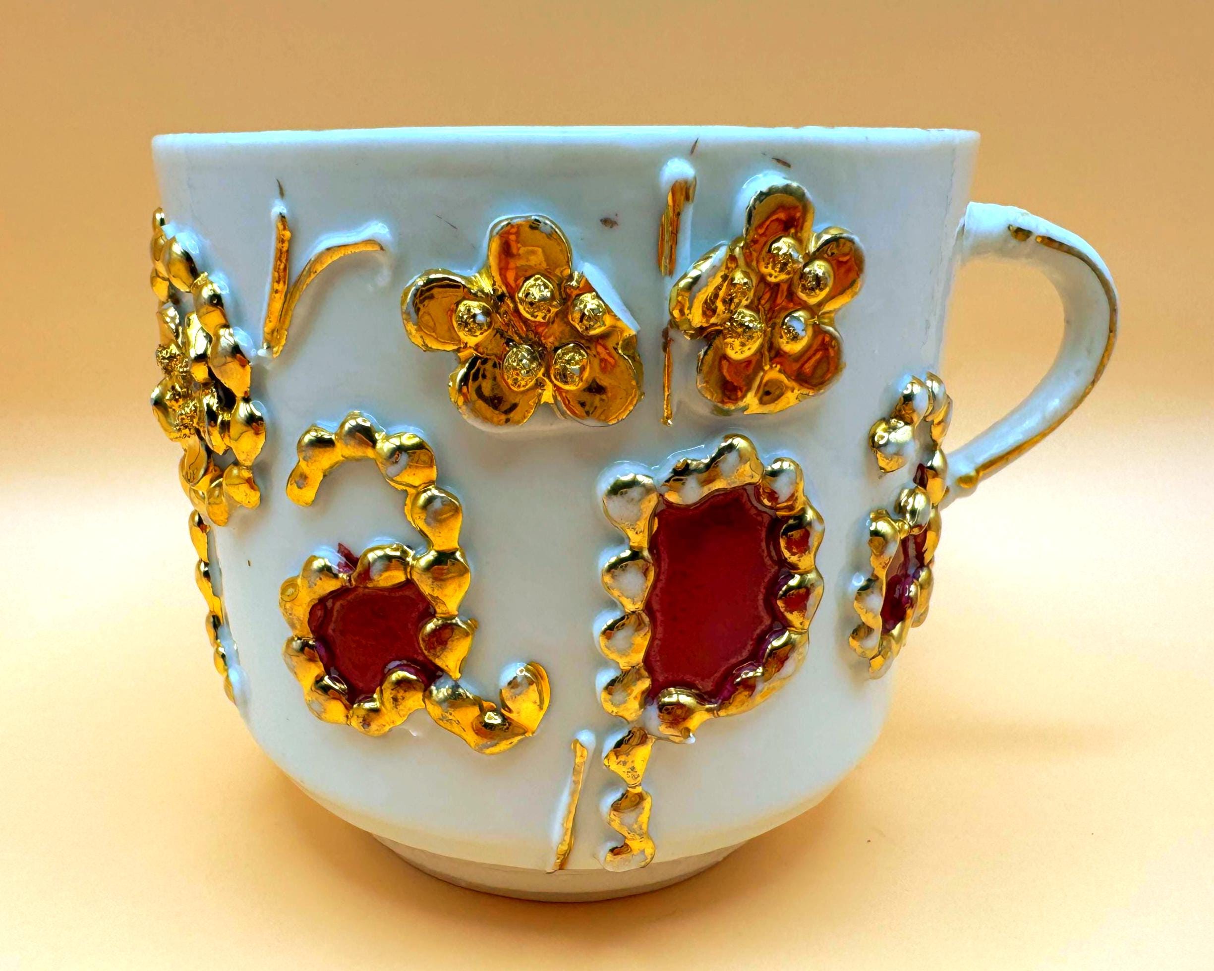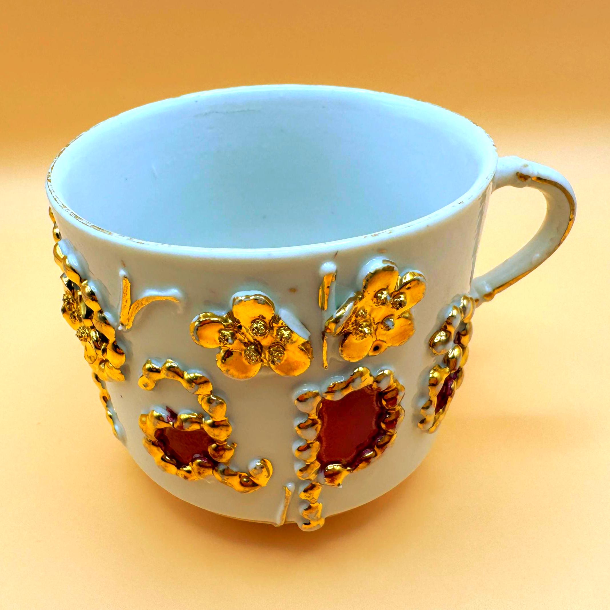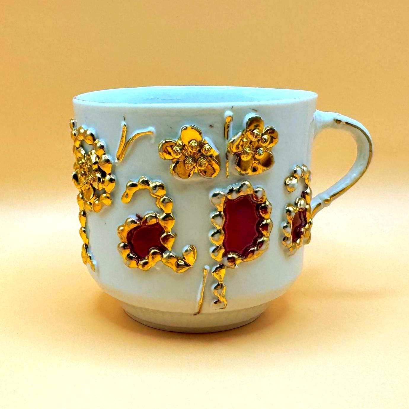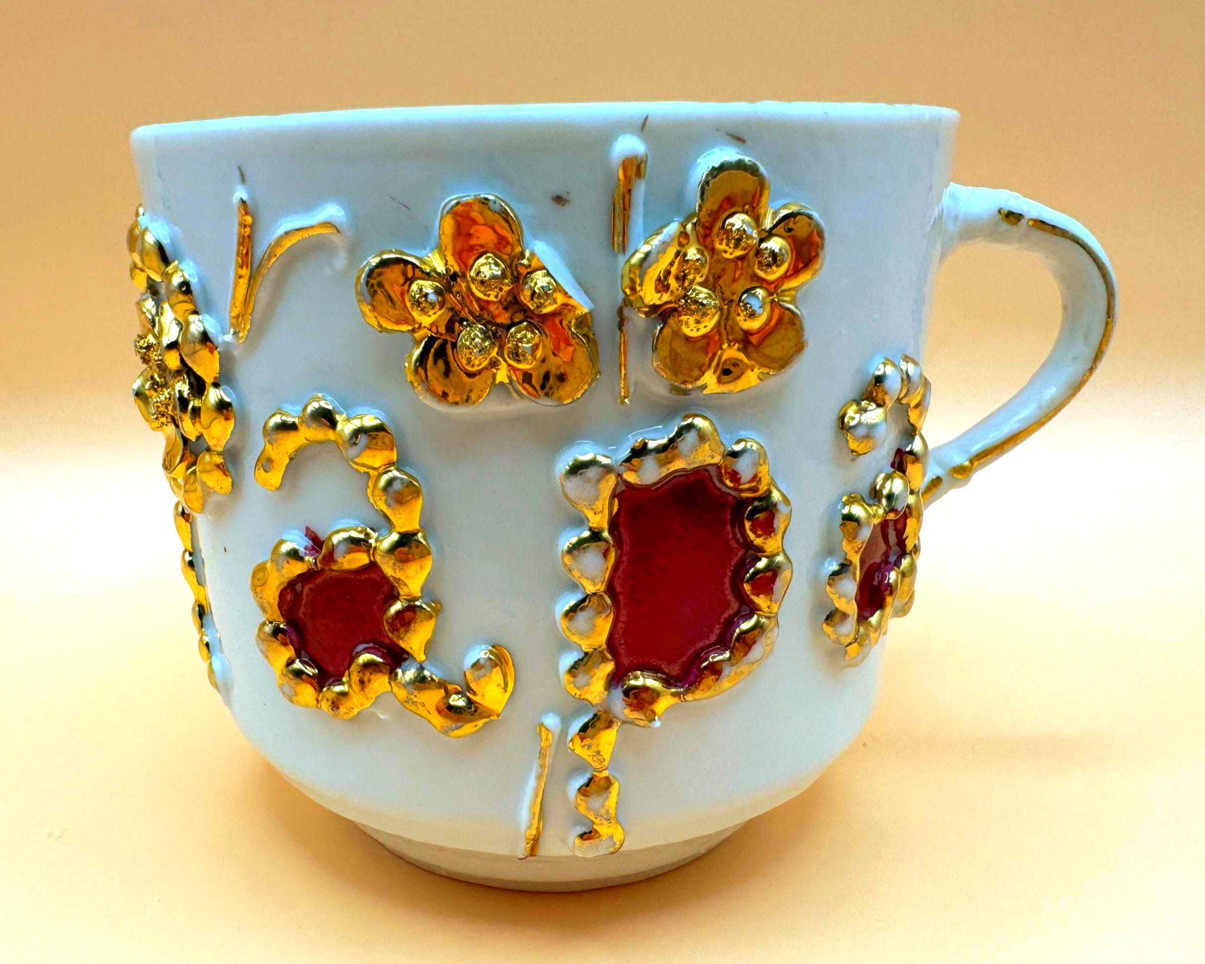 Charming vintage porcelain mug featuring raised gold floral detailing with rich wine/burgundy enamel accents and the word “Papa” across the front. Made in Germany, this piece showcases beautiful dimensional appliqué work that adds texture and depth.