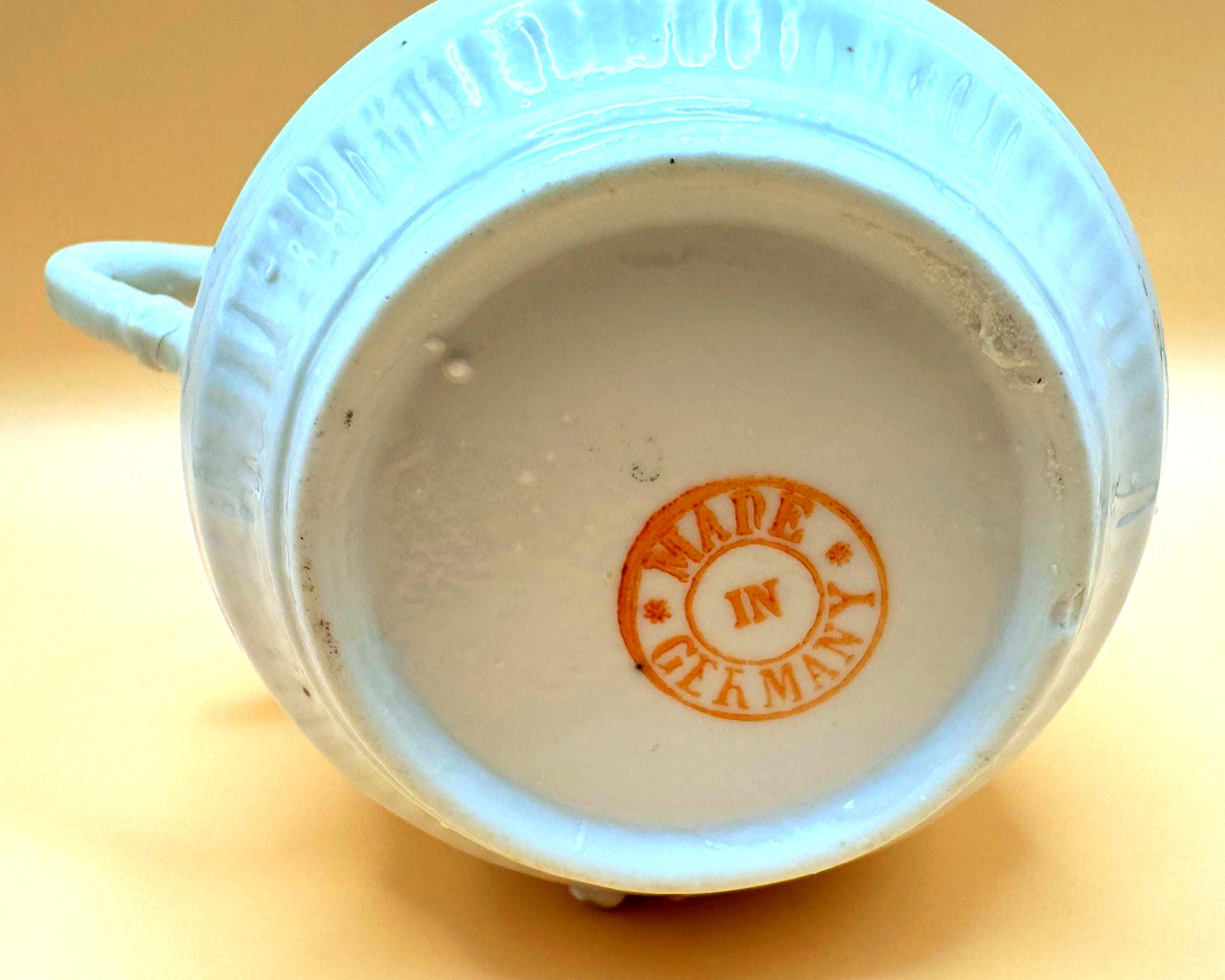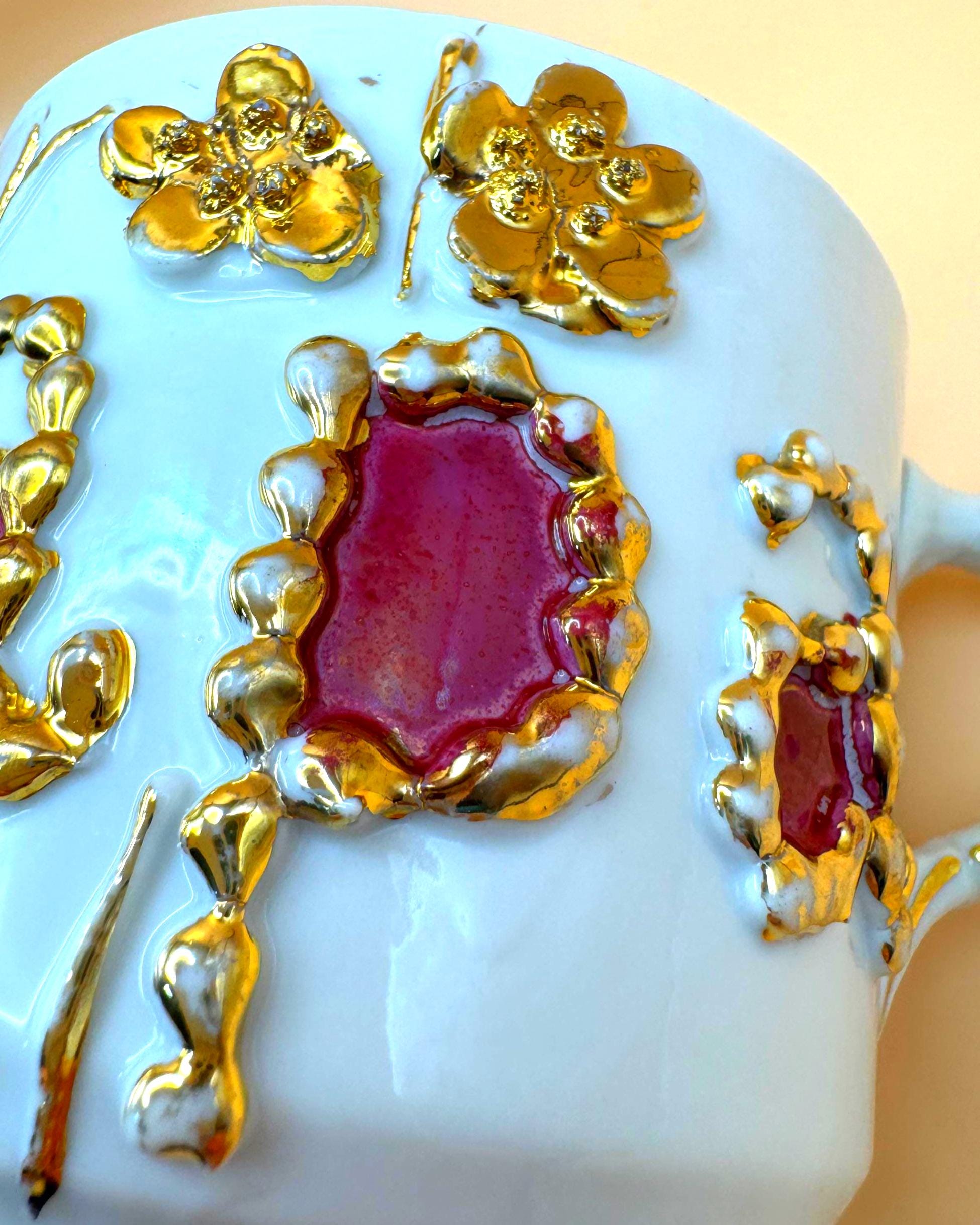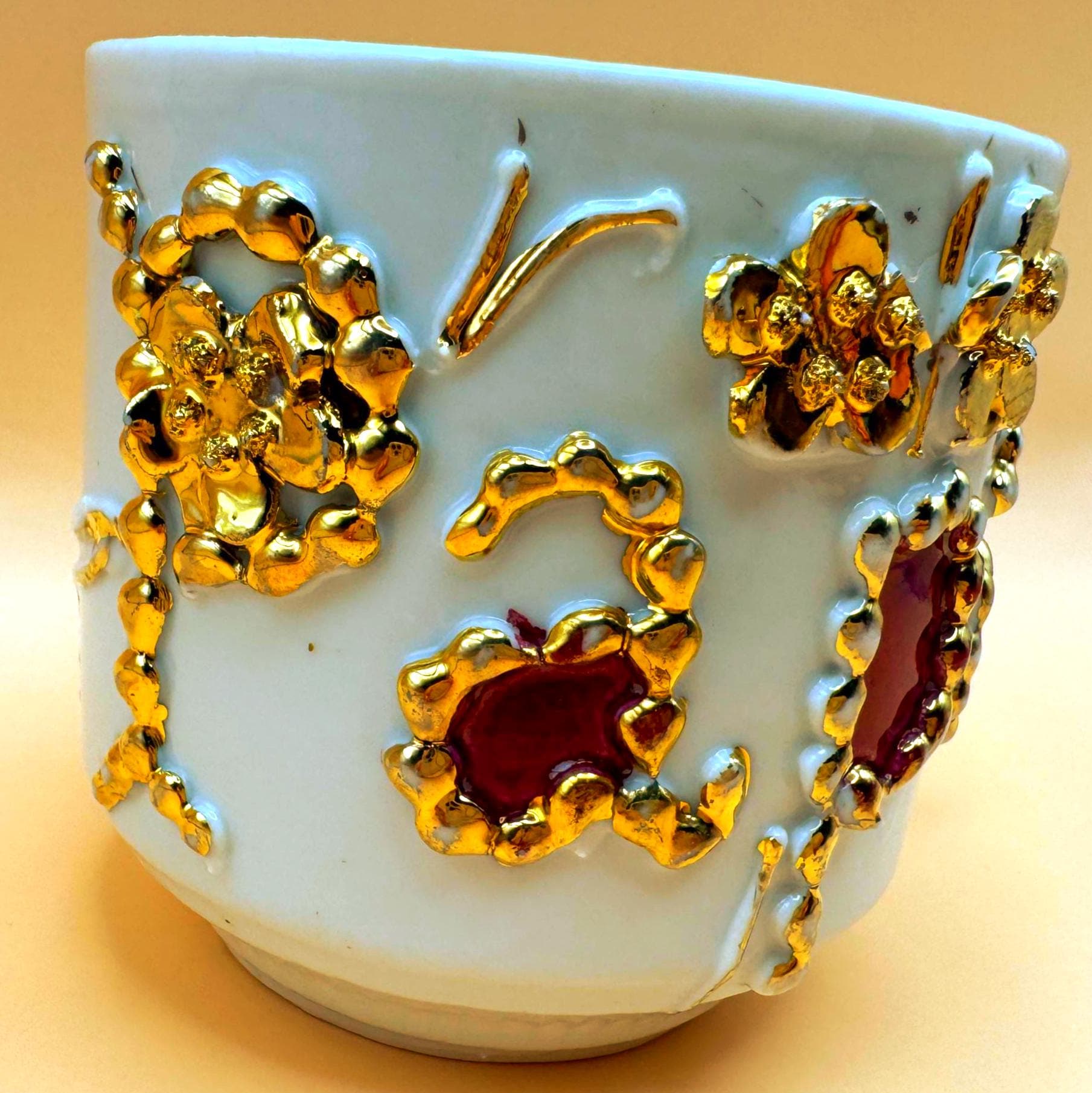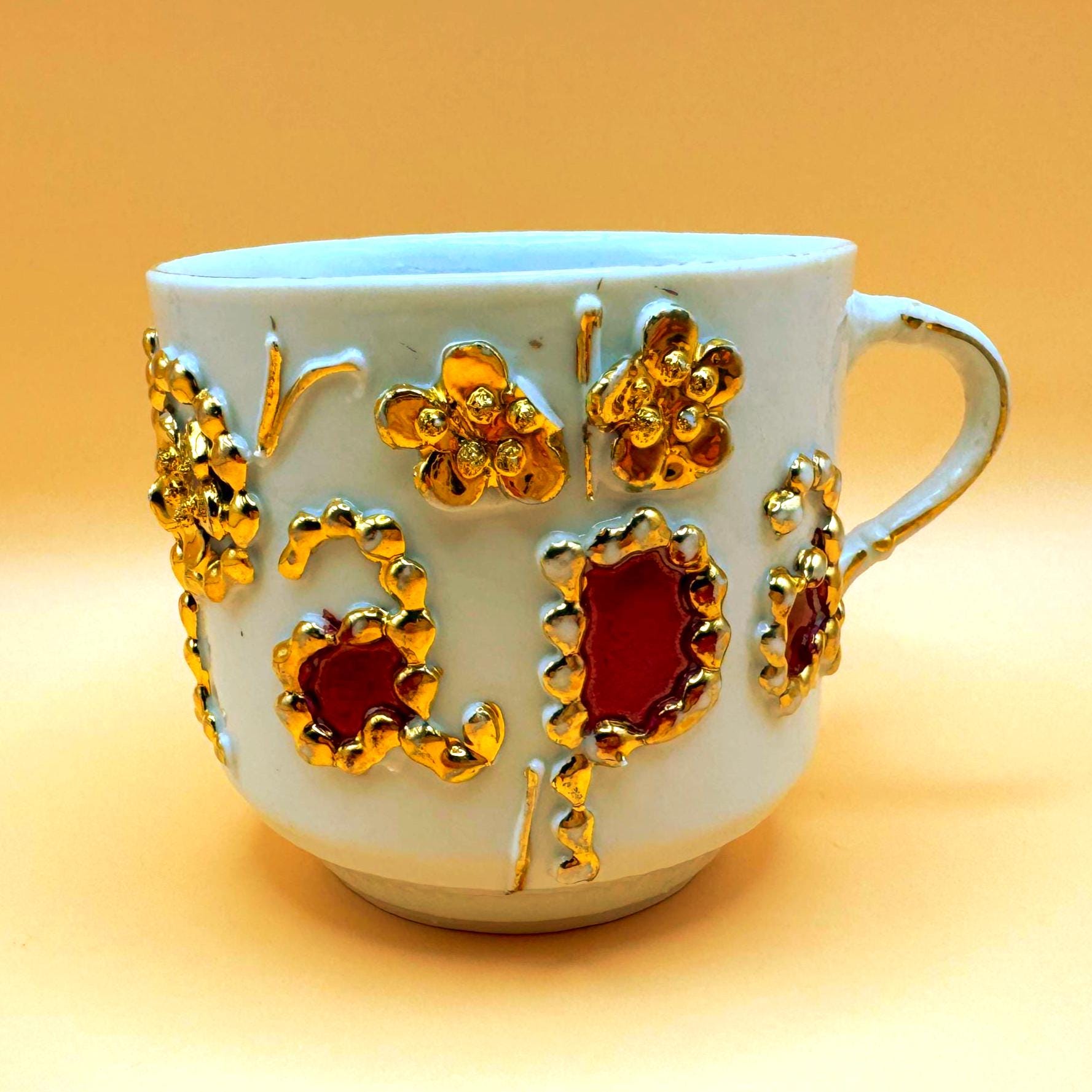Charming vintage porcelain mug featuring raised gold floral detailing with rich wine/burgundy enamel accents and the word “Papa” across the front. Made in Germany, this piece showcases beautiful dimensional appliqué work that adds texture and depth.