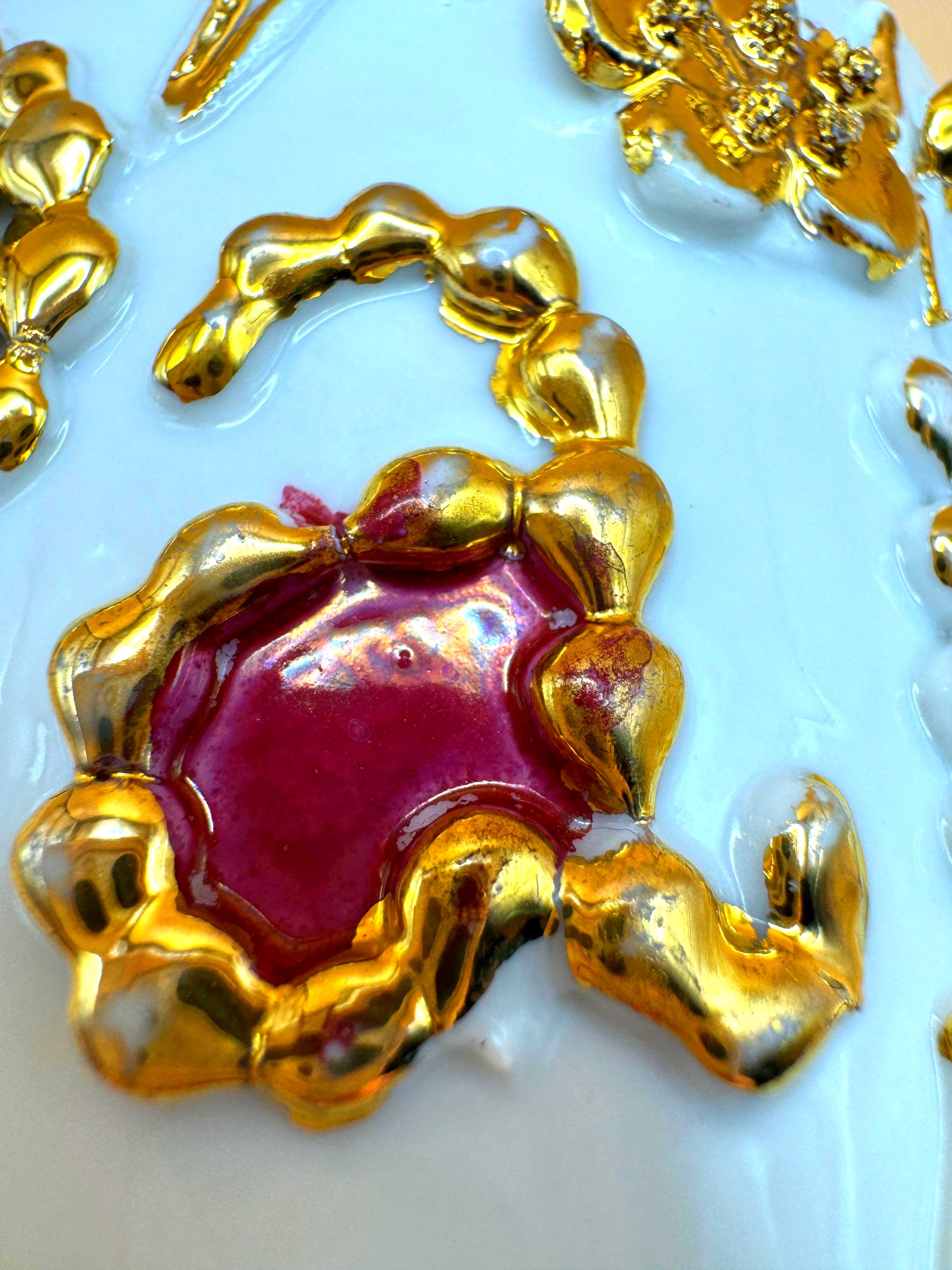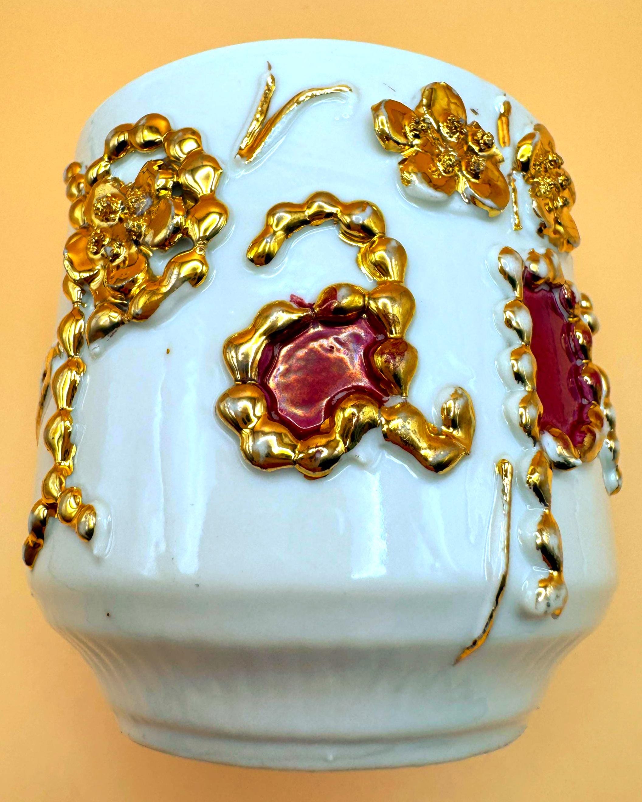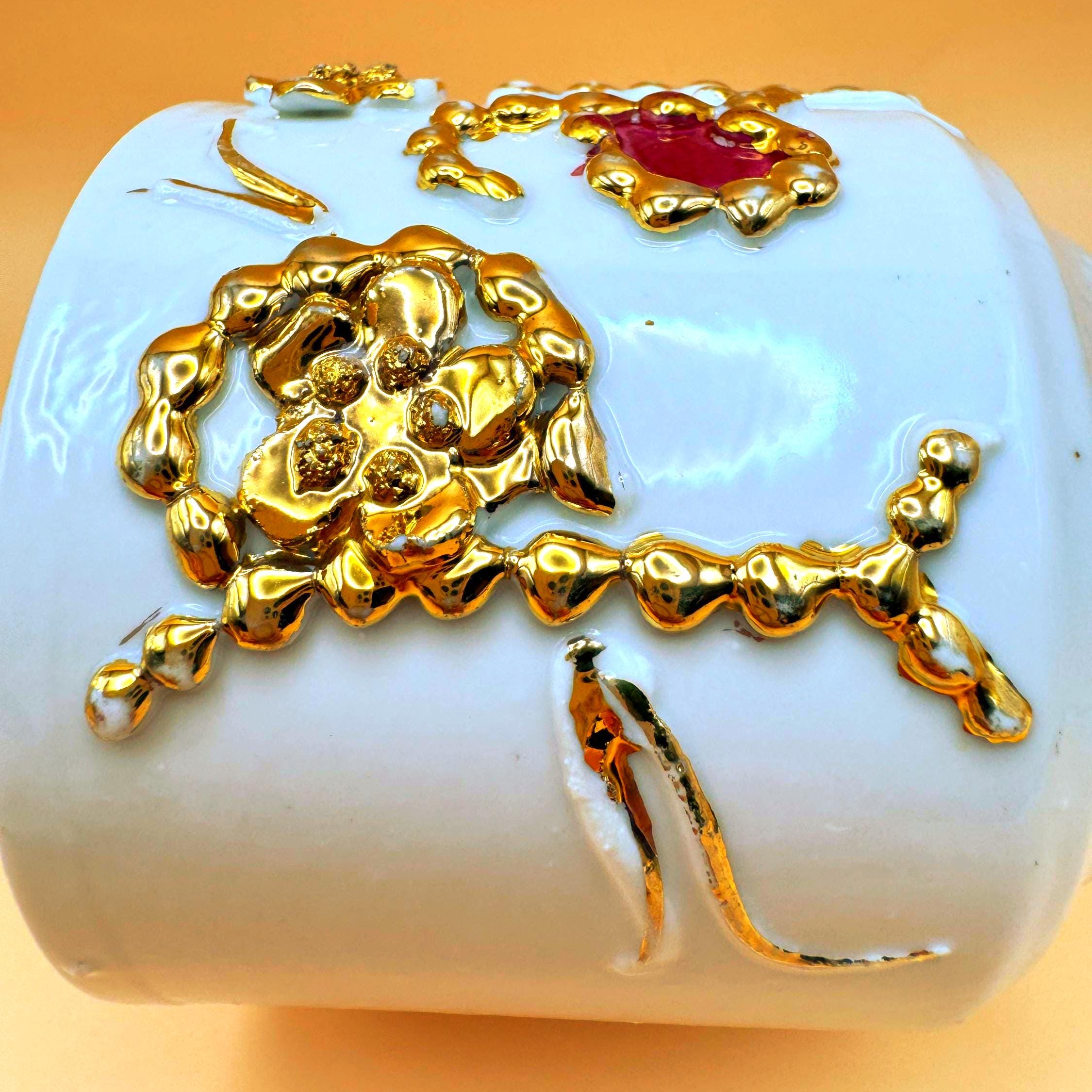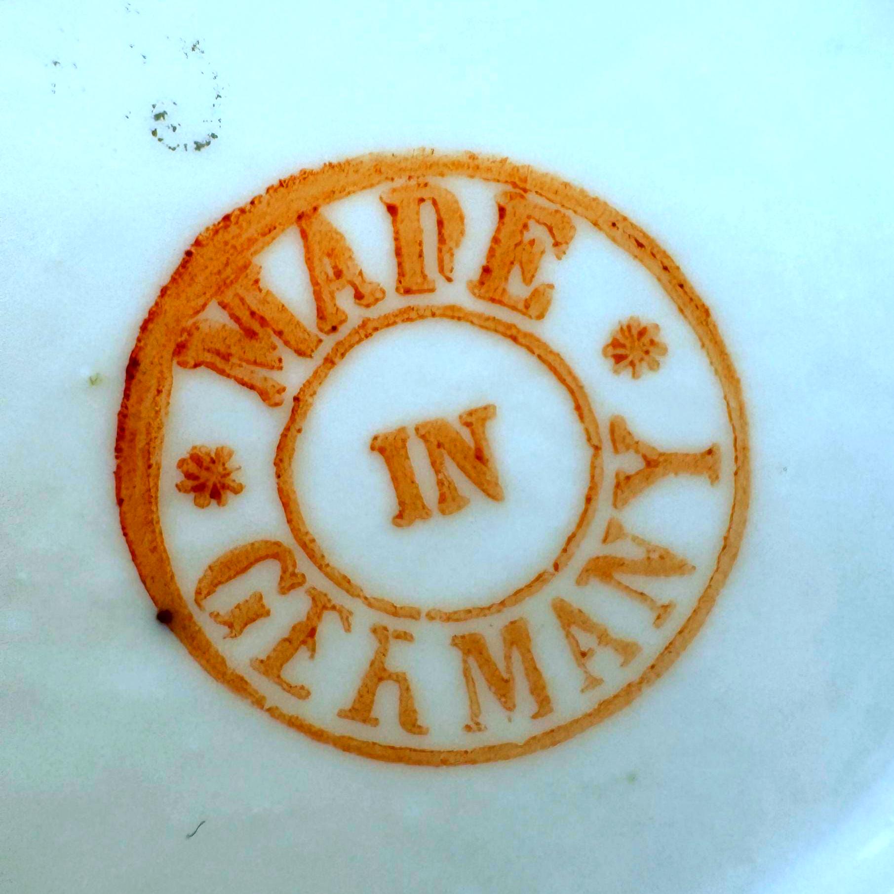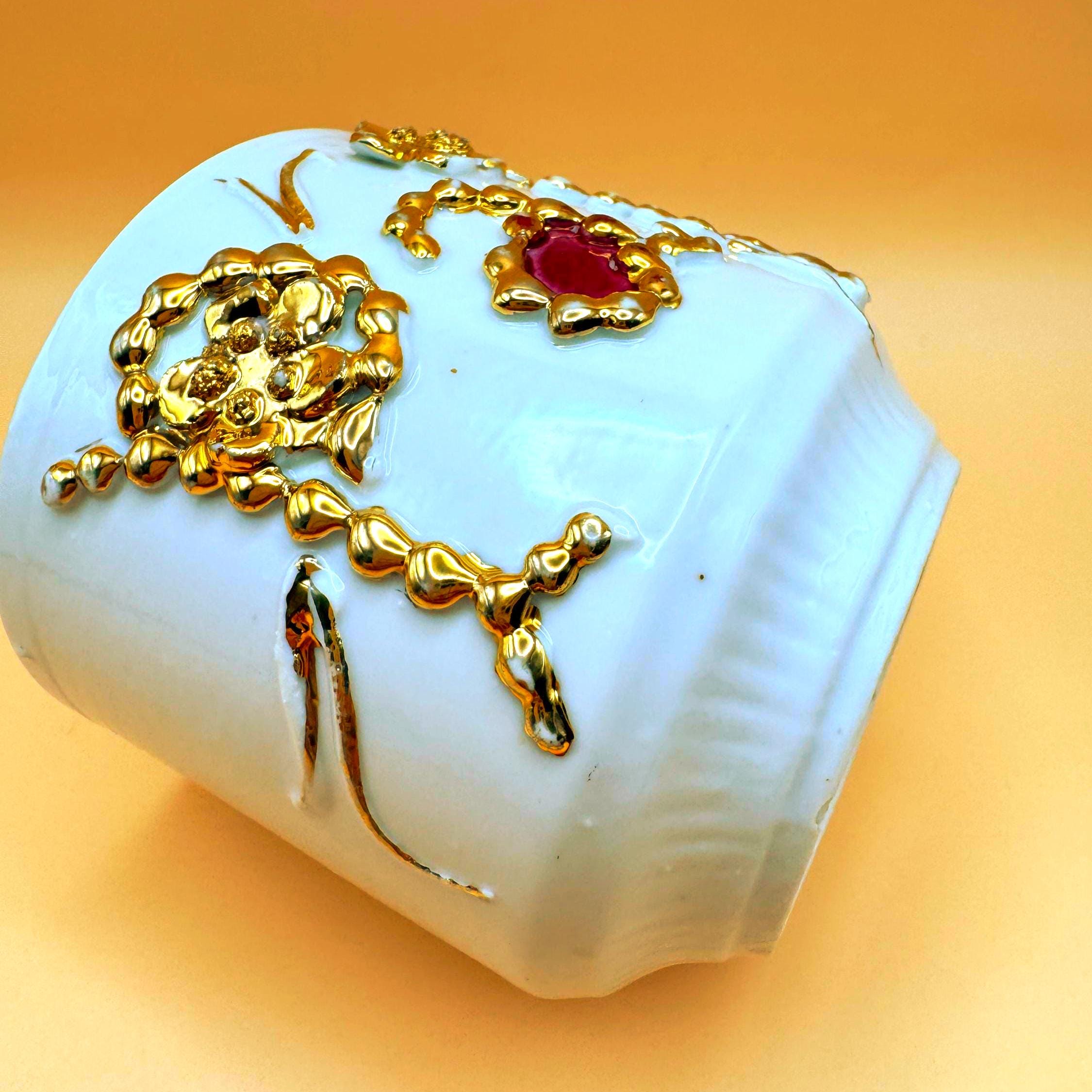 Charming vintage porcelain mug featuring raised gold floral detailing with rich wine/burgundy enamel accents and the word “Papa” across the front. Made in Germany, this piece showcases beautiful dimensional appliqué work that adds texture and depth.