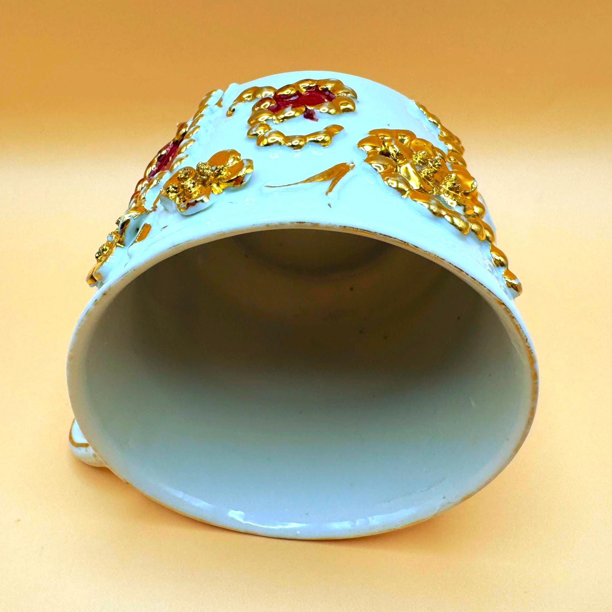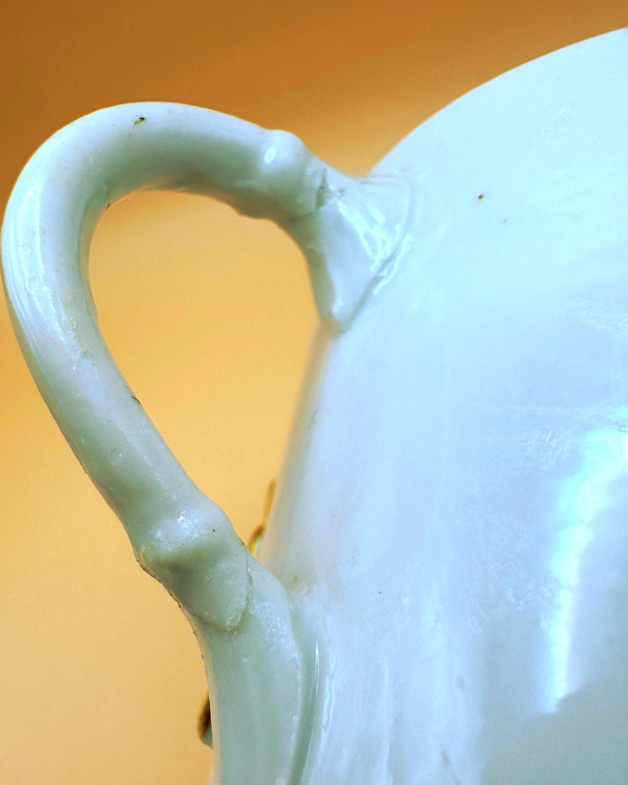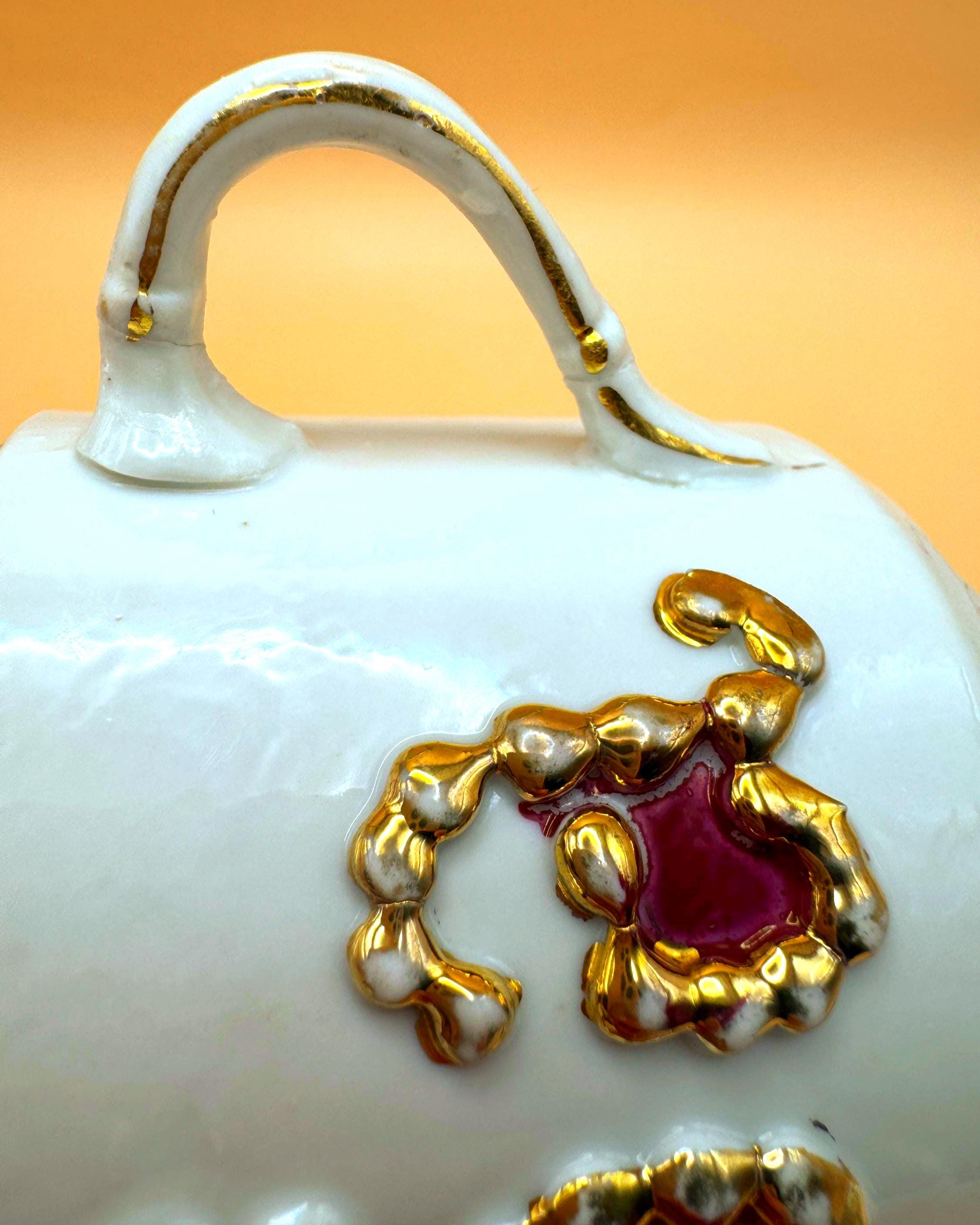Vintage condition with visible age-related wear. One applied flower petal is broken, and there is wear to the gold detailing. The handle shows a previous repair and has visible texture differences. No cracks to the main body. Best suited for decorative use. (See photos for more detail)