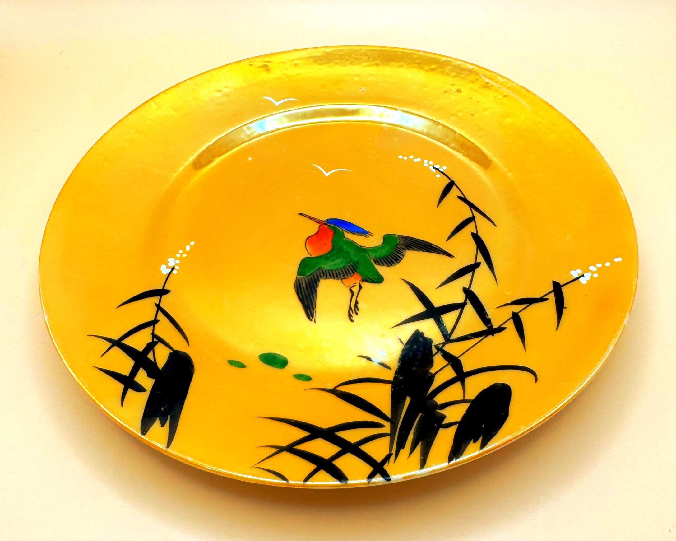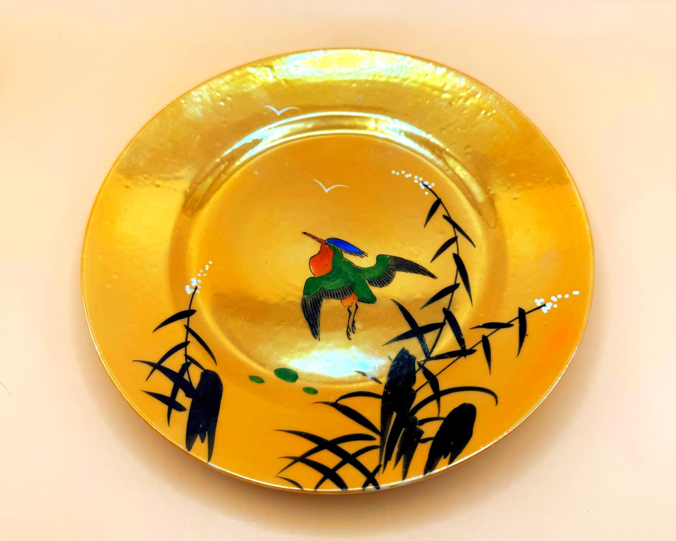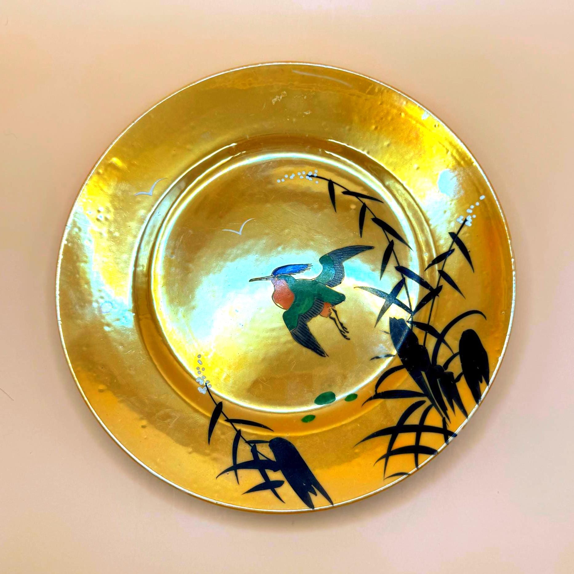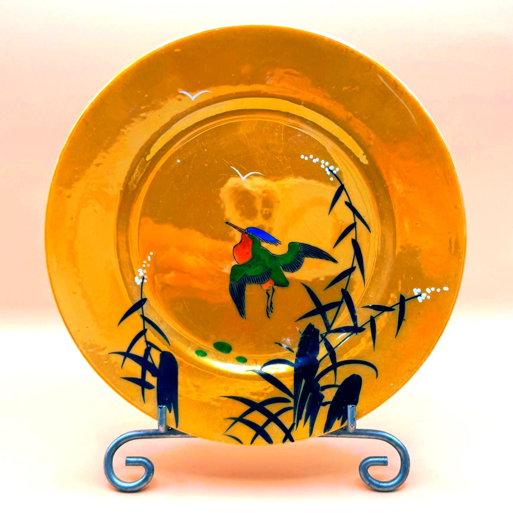 Beautiful vintage hand painted plate featuring a vibrant kingfisher in flight surrounded by delicate reeds, set against a warm peach luster finish with a soft iridescent glow. The rich colors and fine brushwork give this piece a lovely sense of movement and charm, making it a standout for display.