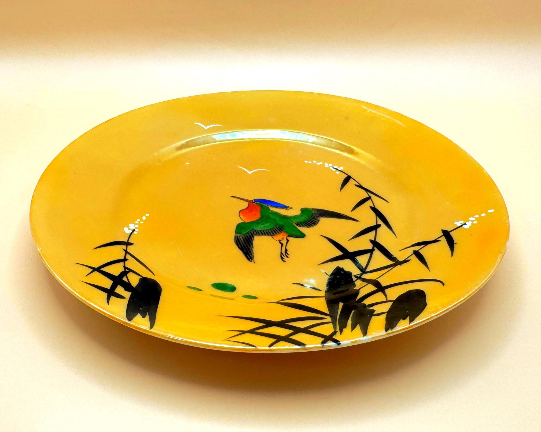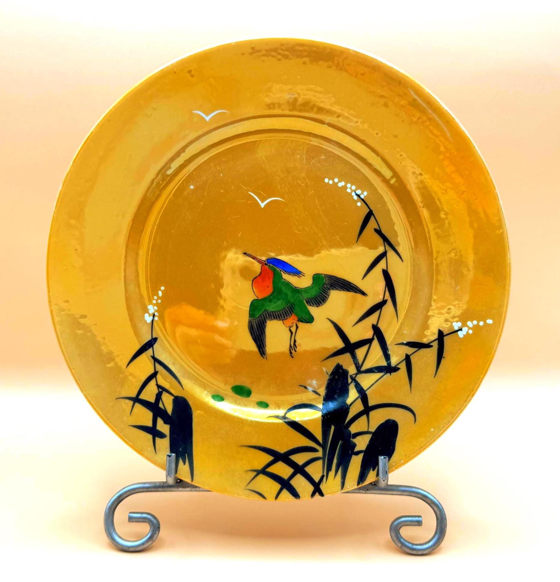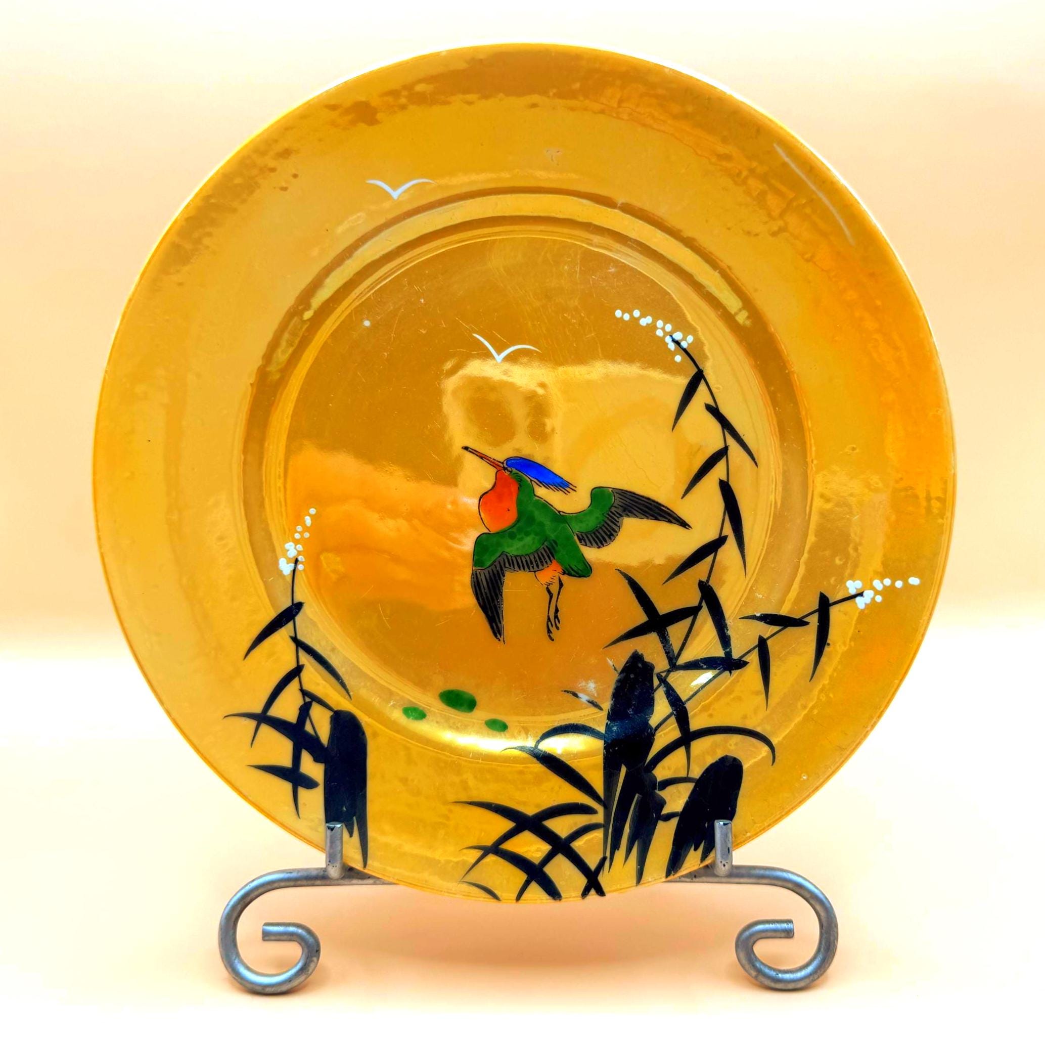 Beautiful vintage hand painted plate featuring a vibrant kingfisher in flight surrounded by delicate reeds, set against a warm peach luster finish with a soft iridescent glow. The rich colors and fine brushwork give this piece a lovely sense of movement and charm, making it a standout for display.