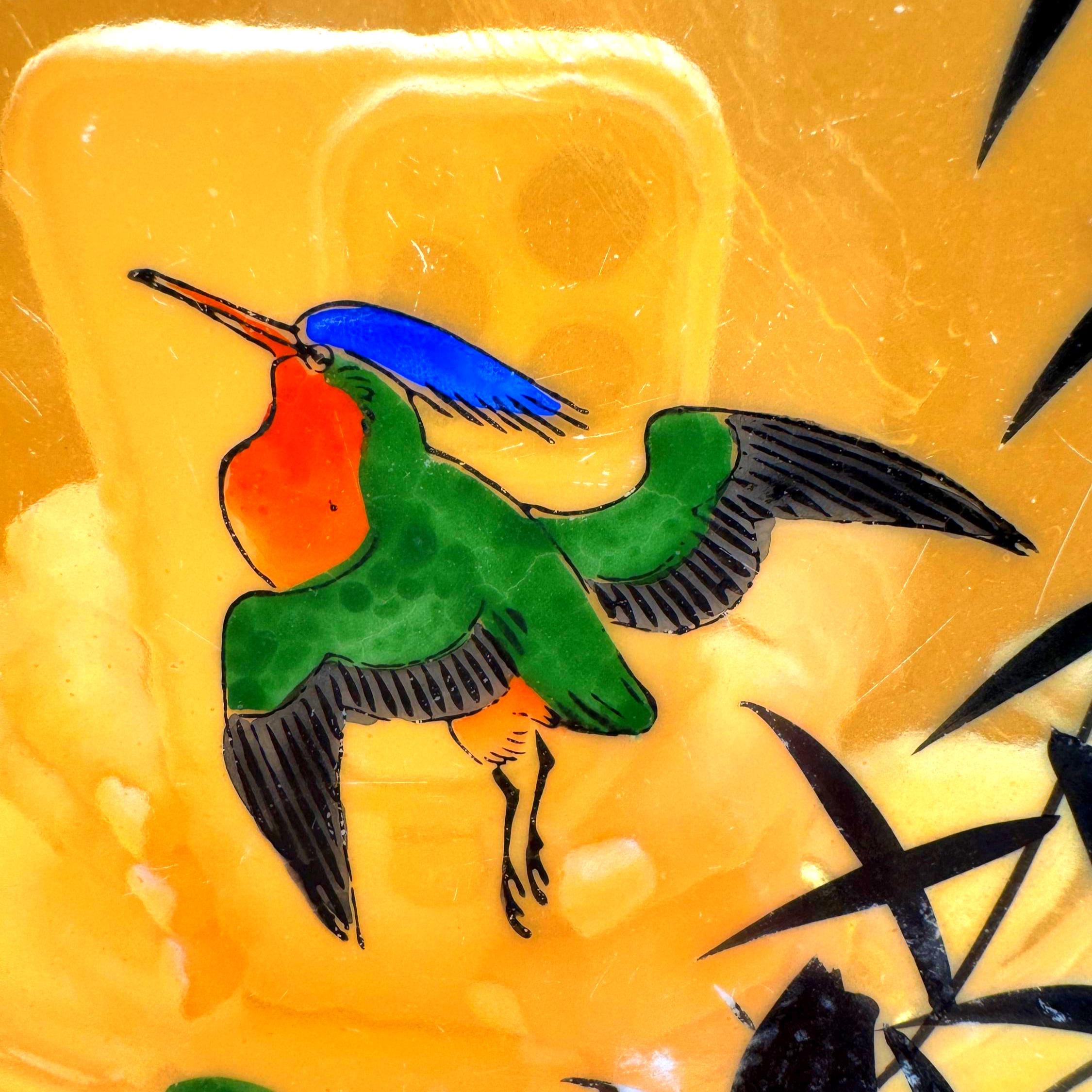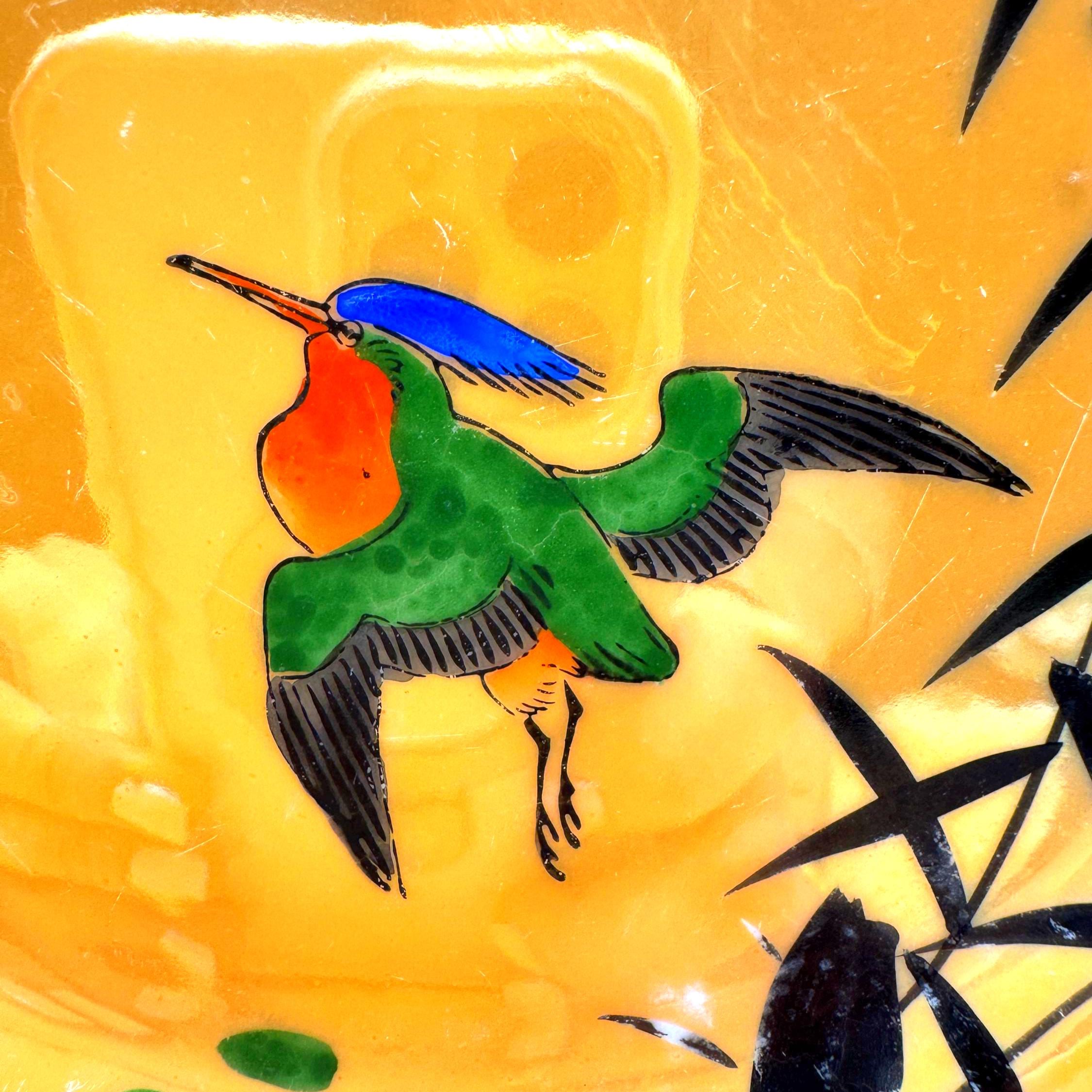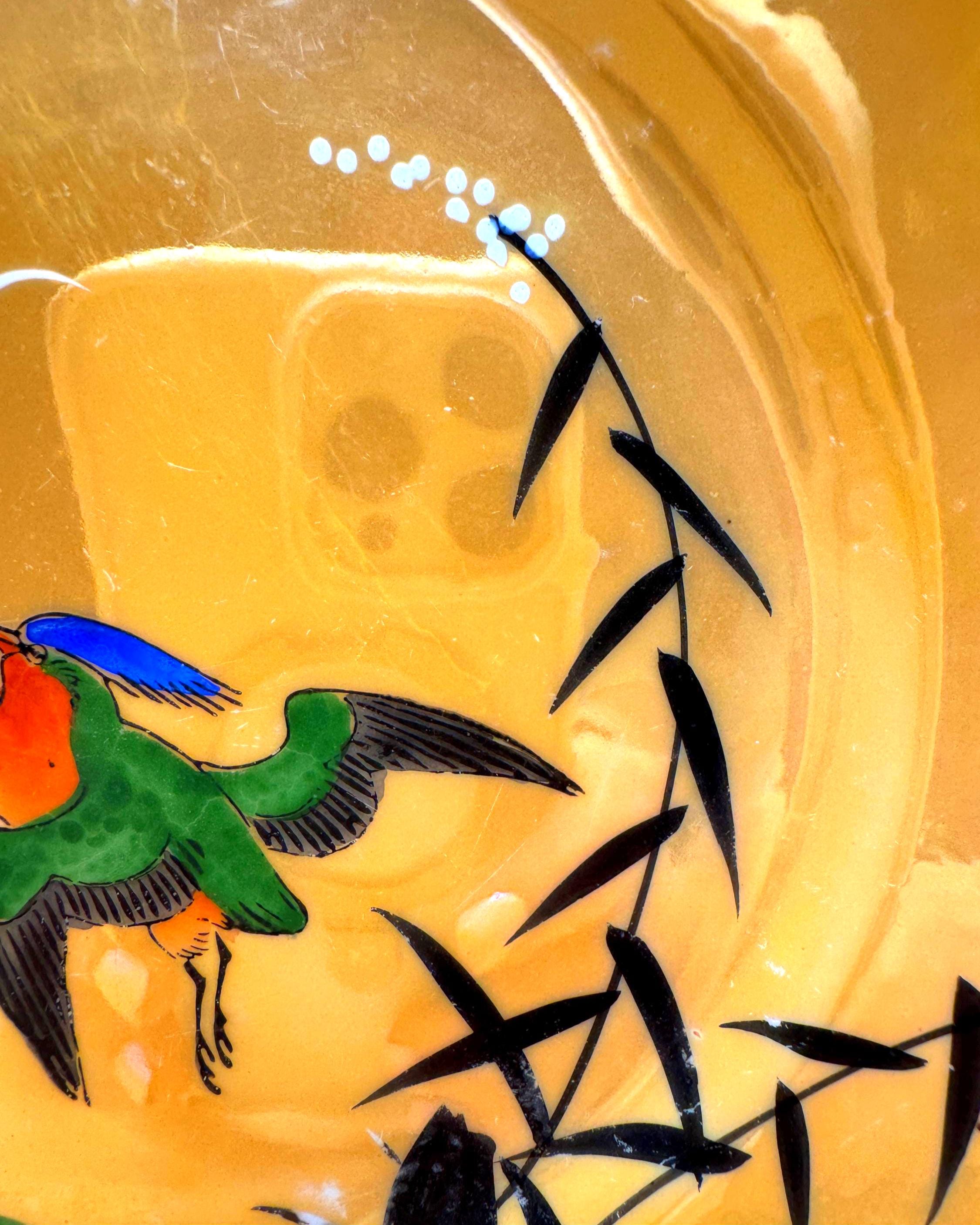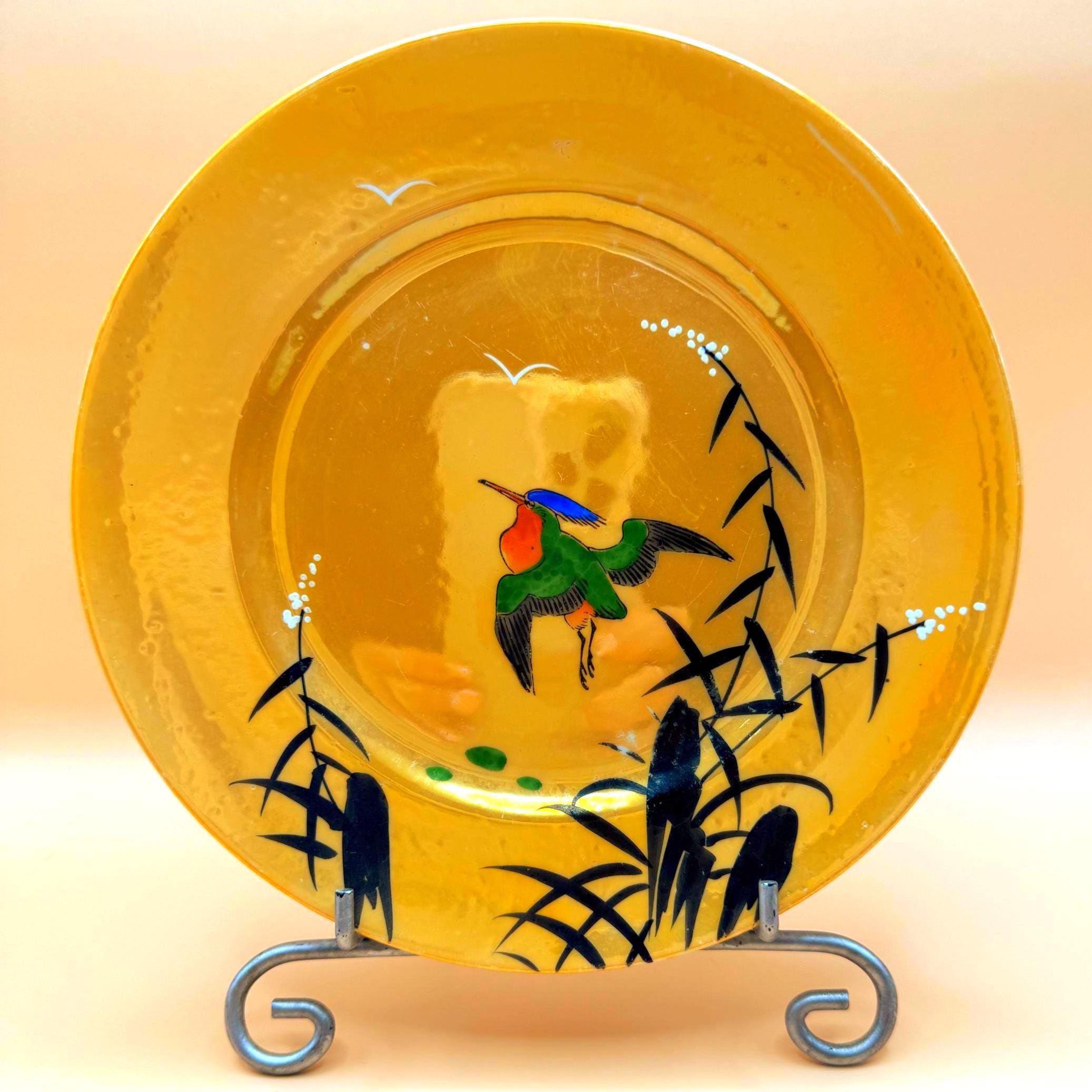Beautiful vintage hand painted plate featuring a vibrant kingfisher in flight surrounded by delicate reeds, set against a warm peach luster finish with a soft iridescent glow. The rich colors and fine brushwork give this piece a lovely sense of movement and charm, making it a standout for display.
