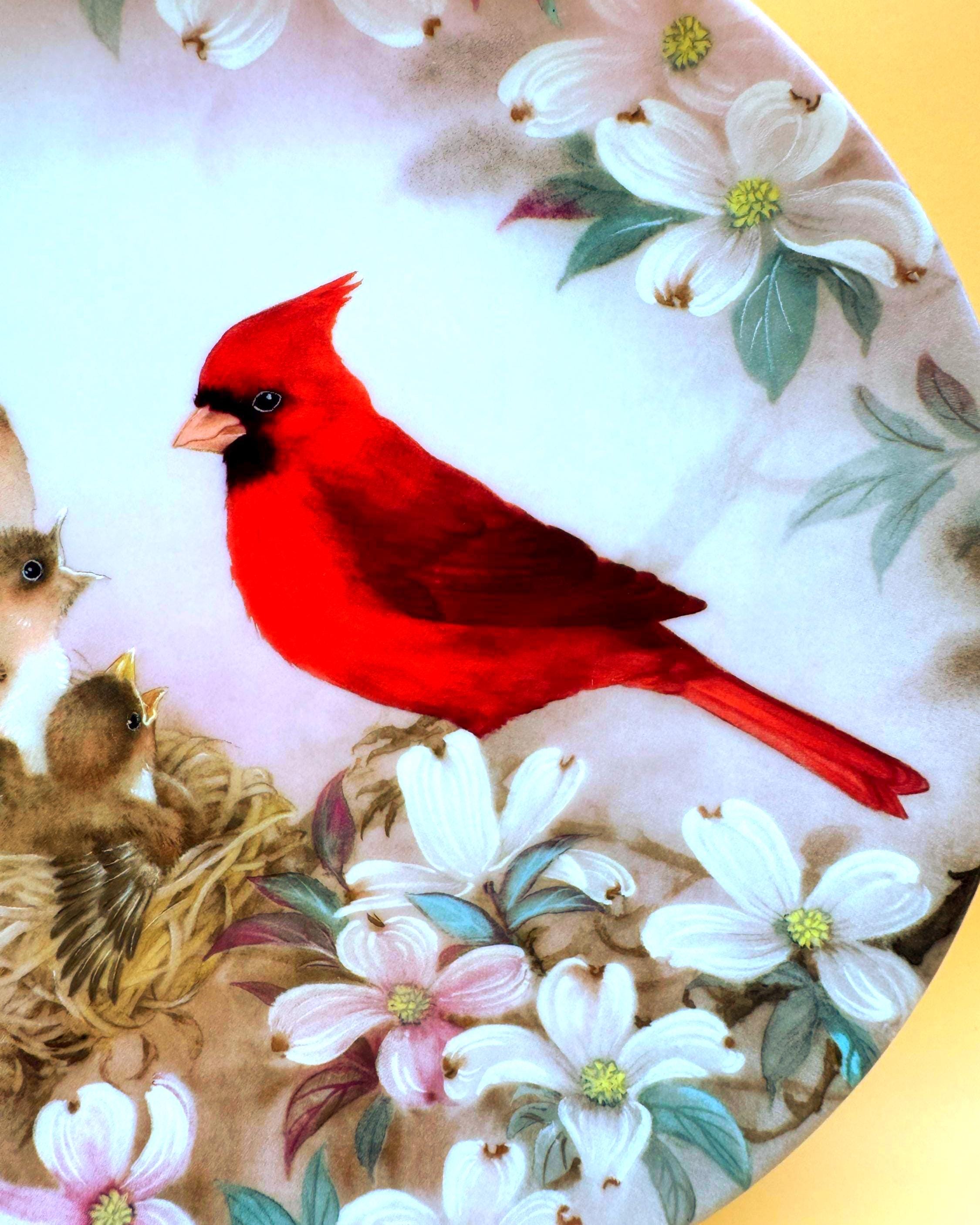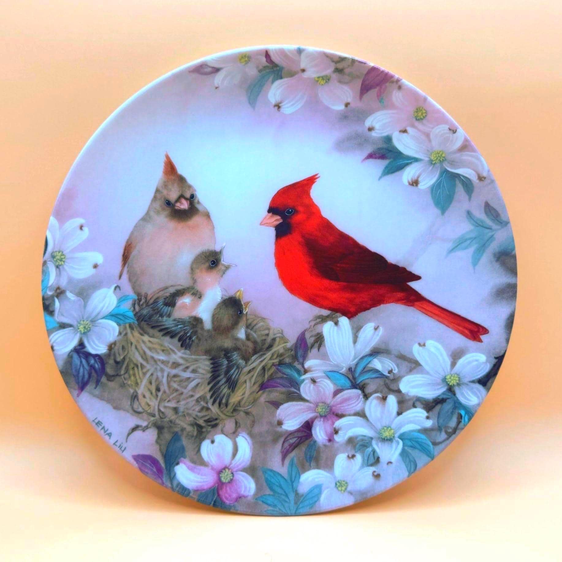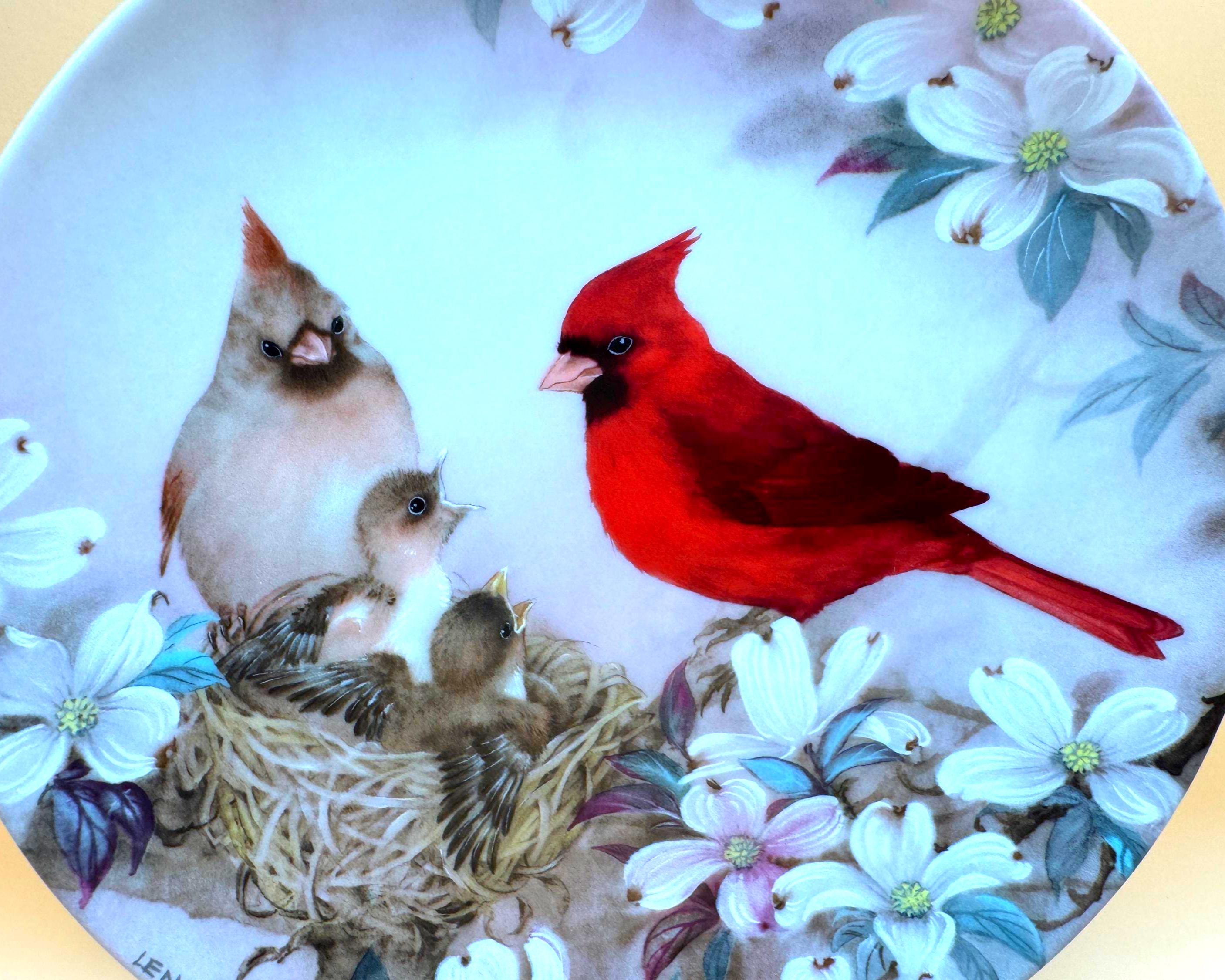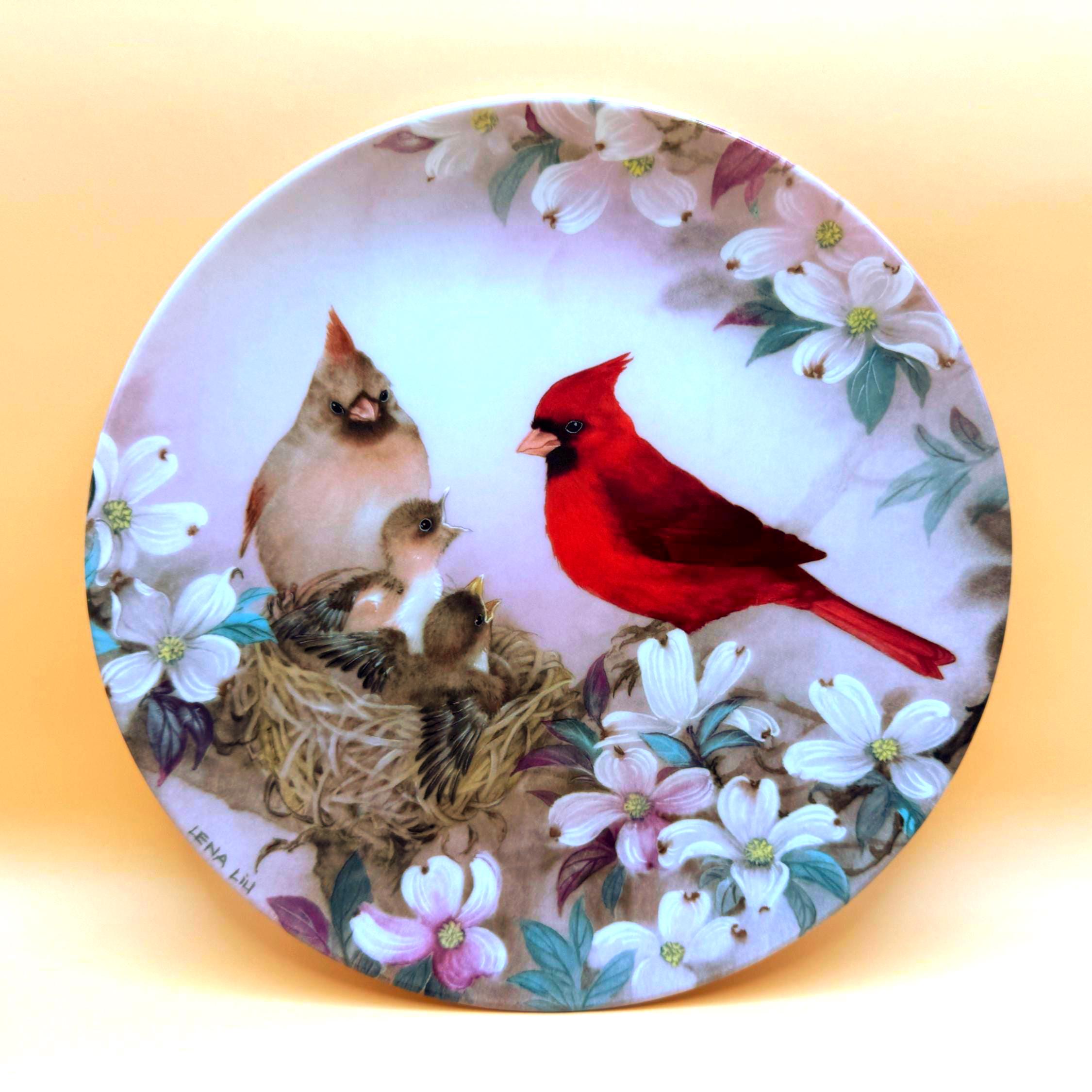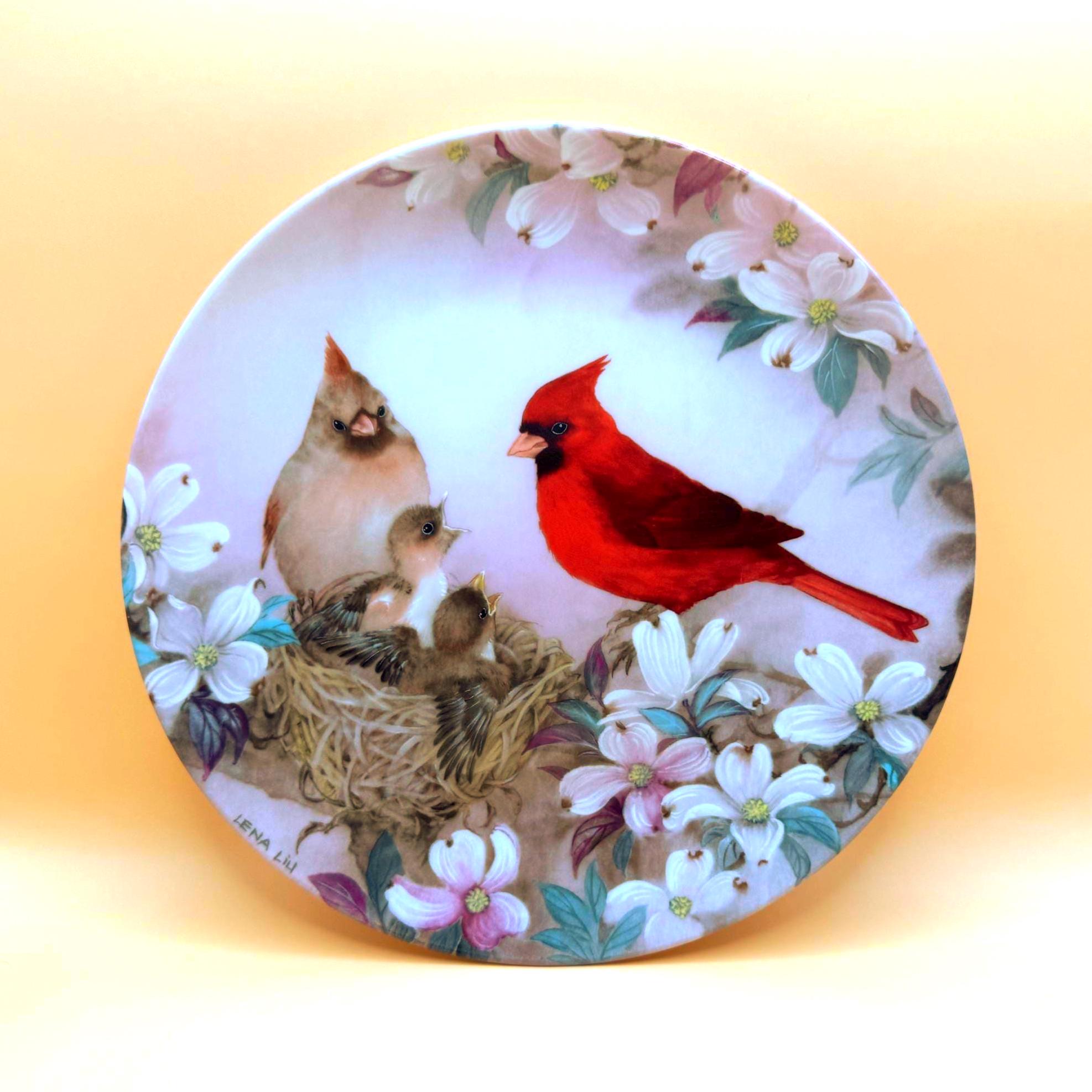 A beautiful and serene collectible plate featuring “Morning Serenade” by Lena Liu, showcasing a vibrant cardinal alongside a nesting family surrounded by soft florals. The delicate artwork and calming tones make this a lovely display piece for bird lovers or nature-inspired décor.