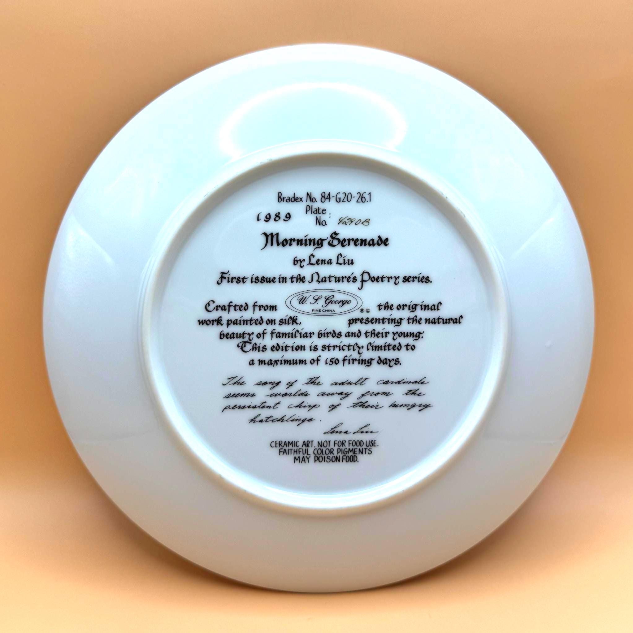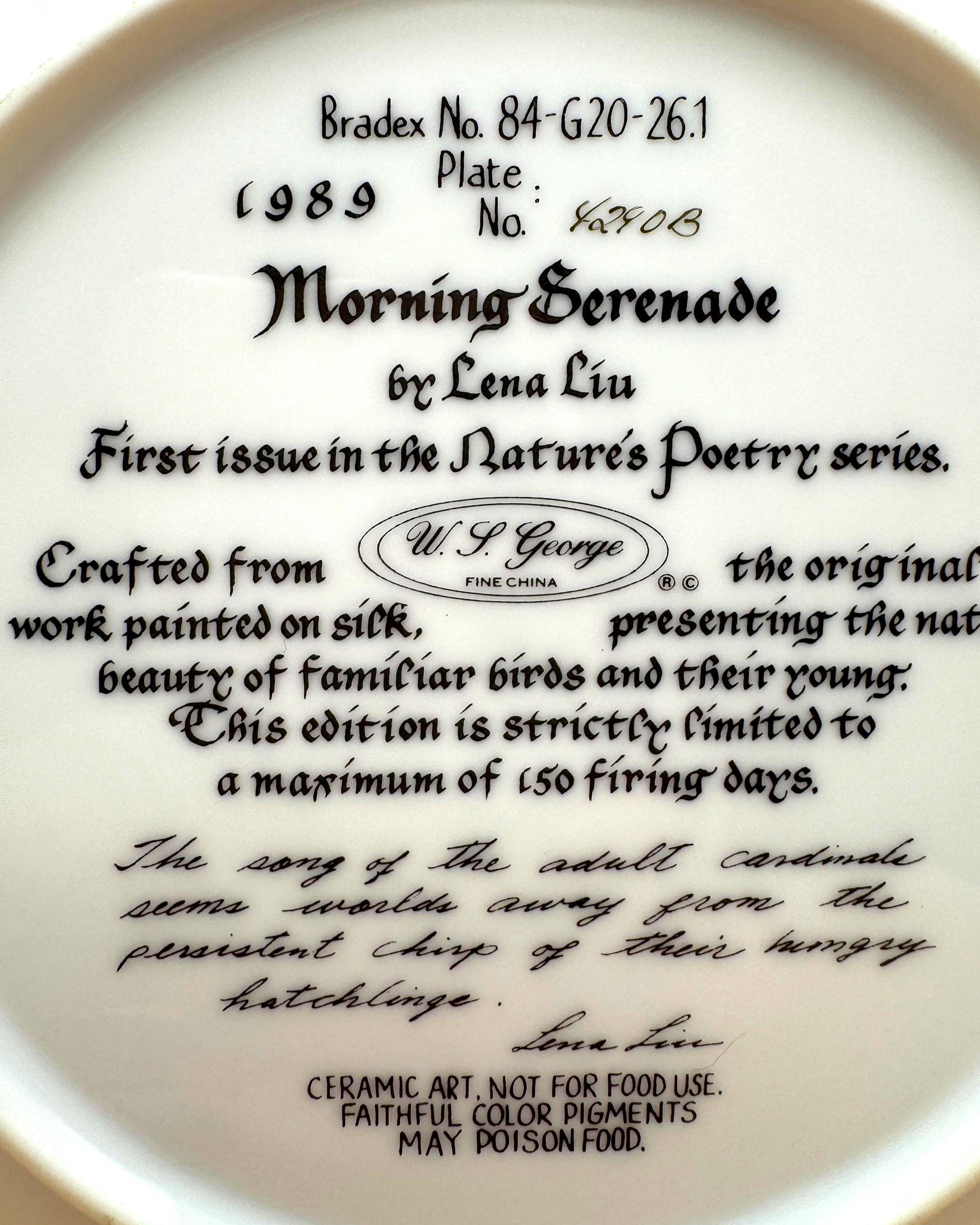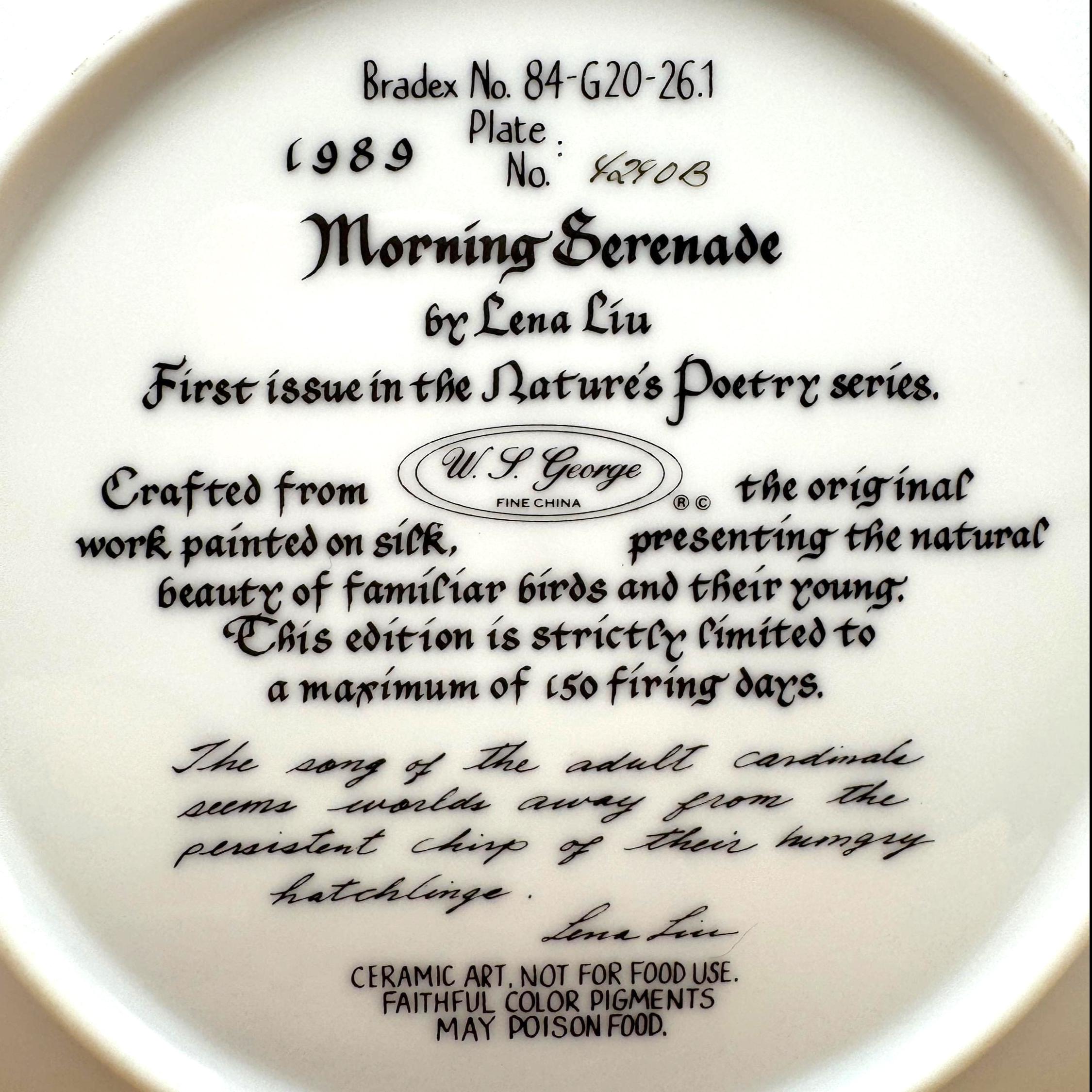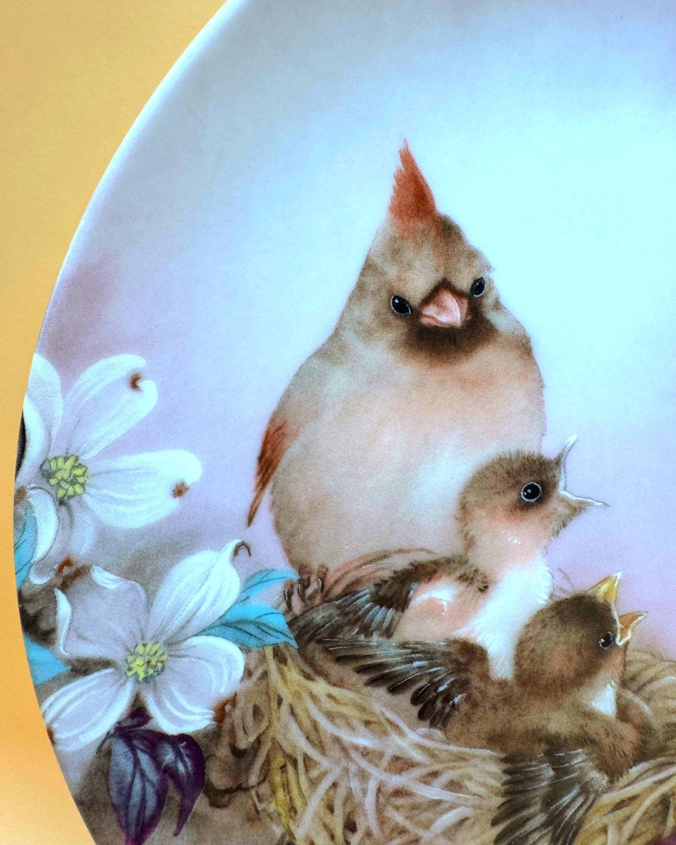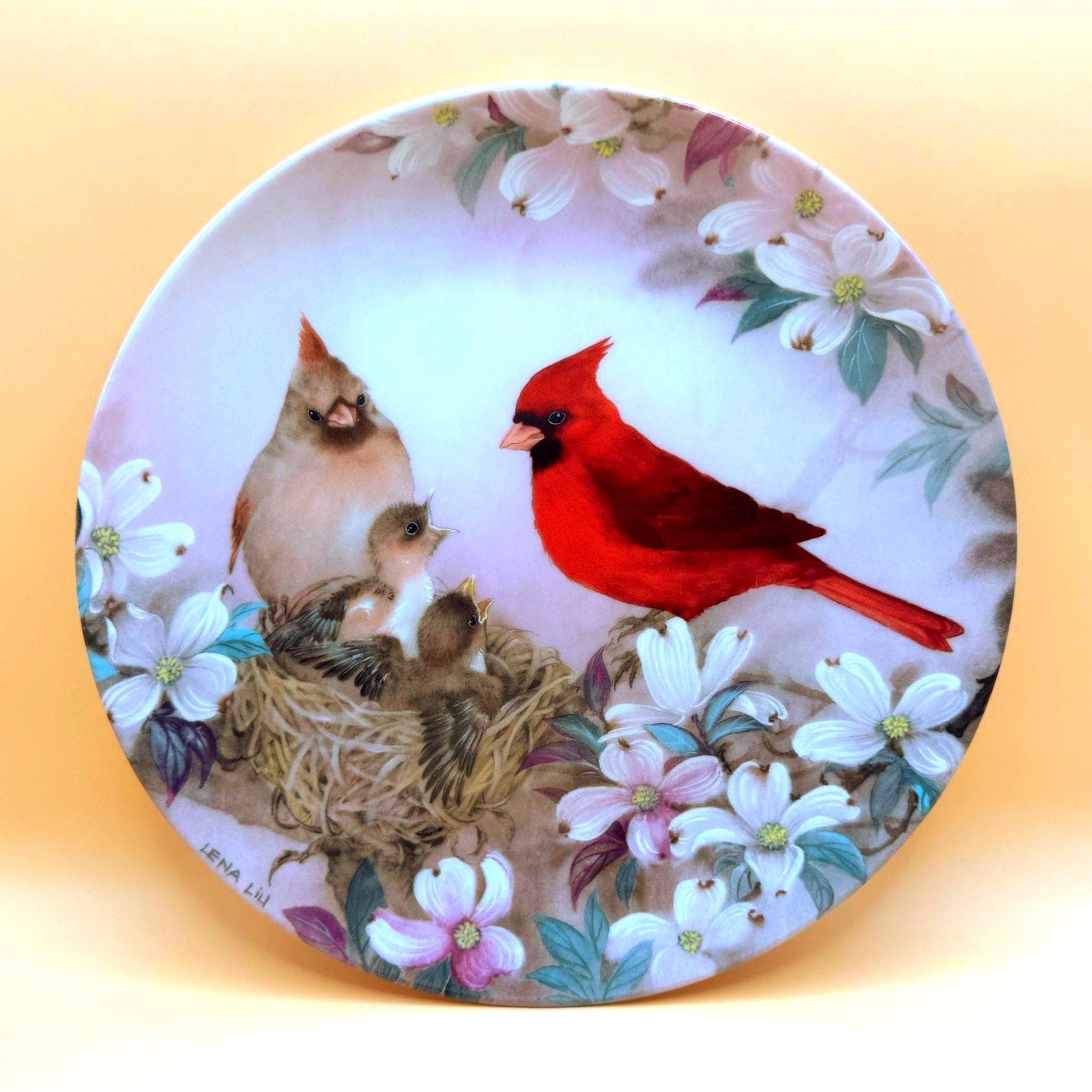 A beautiful and serene collectible plate featuring “Morning Serenade” by Lena Liu, showcasing a vibrant cardinal alongside a nesting family surrounded by soft florals. The delicate artwork and calming tones make this a lovely display piece for bird lovers or nature-inspired décor.
