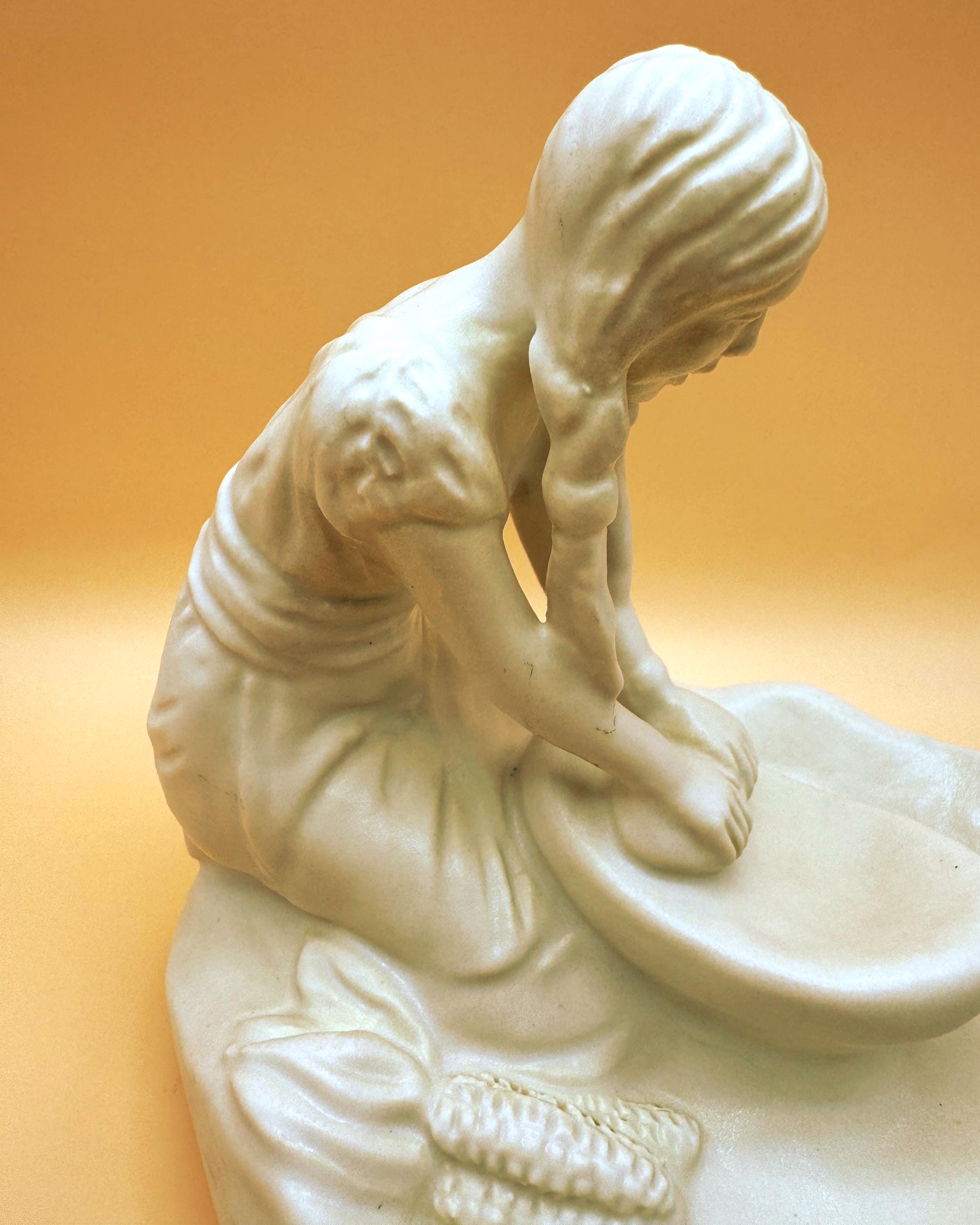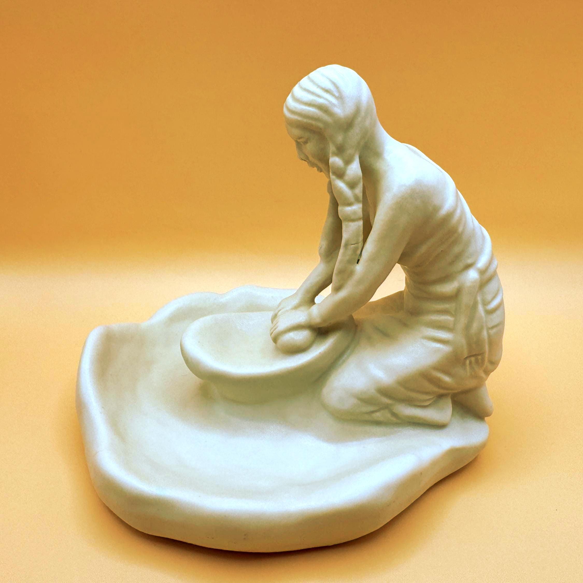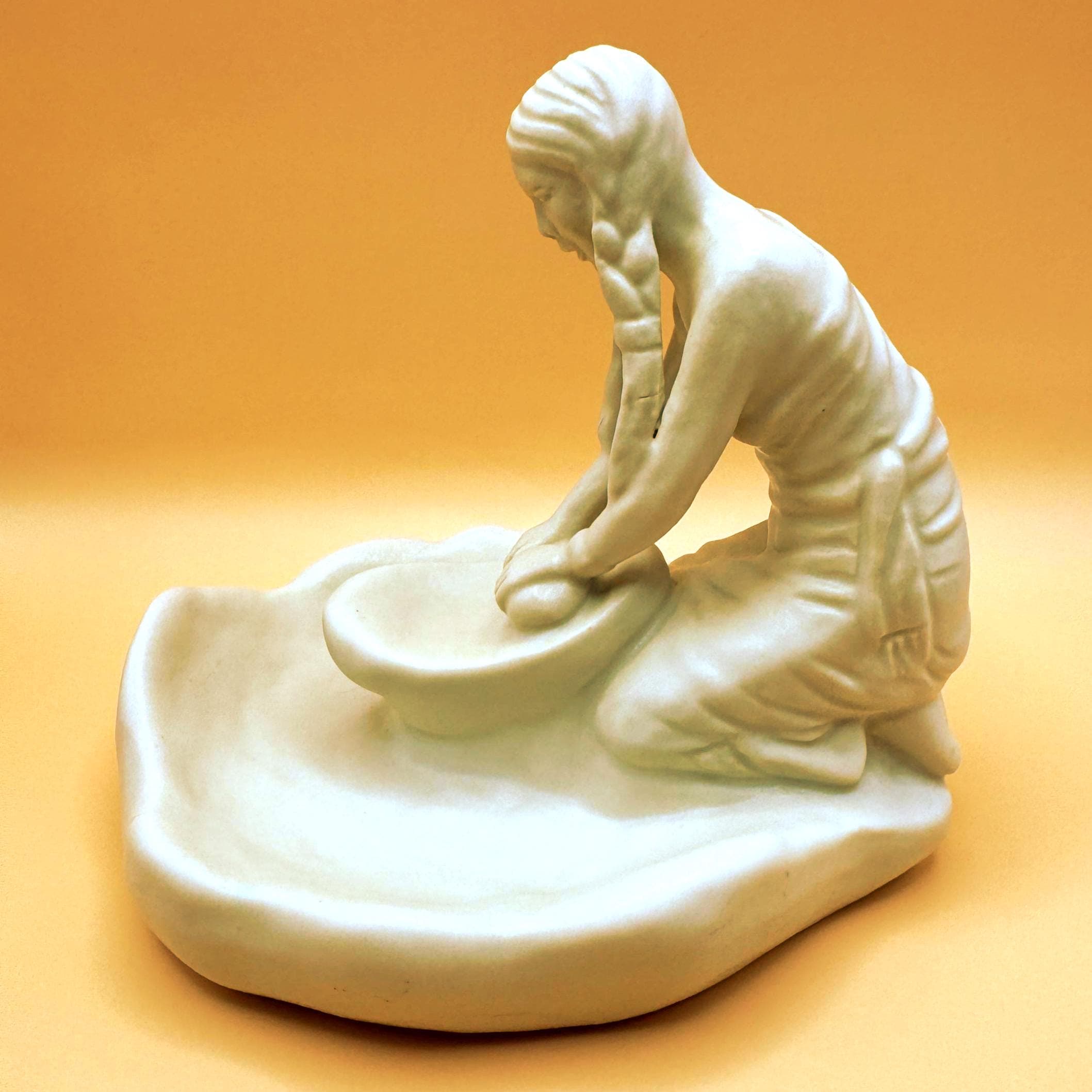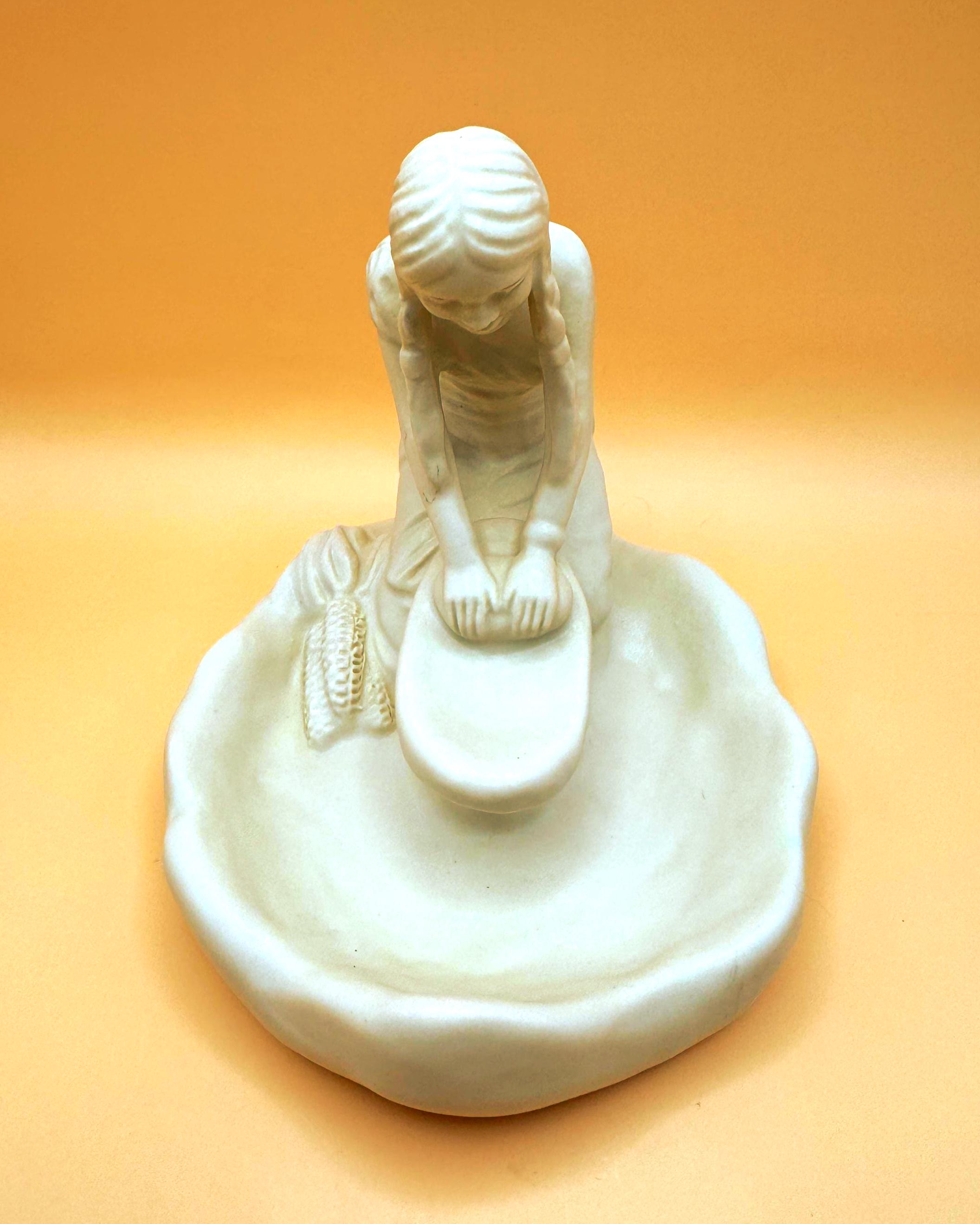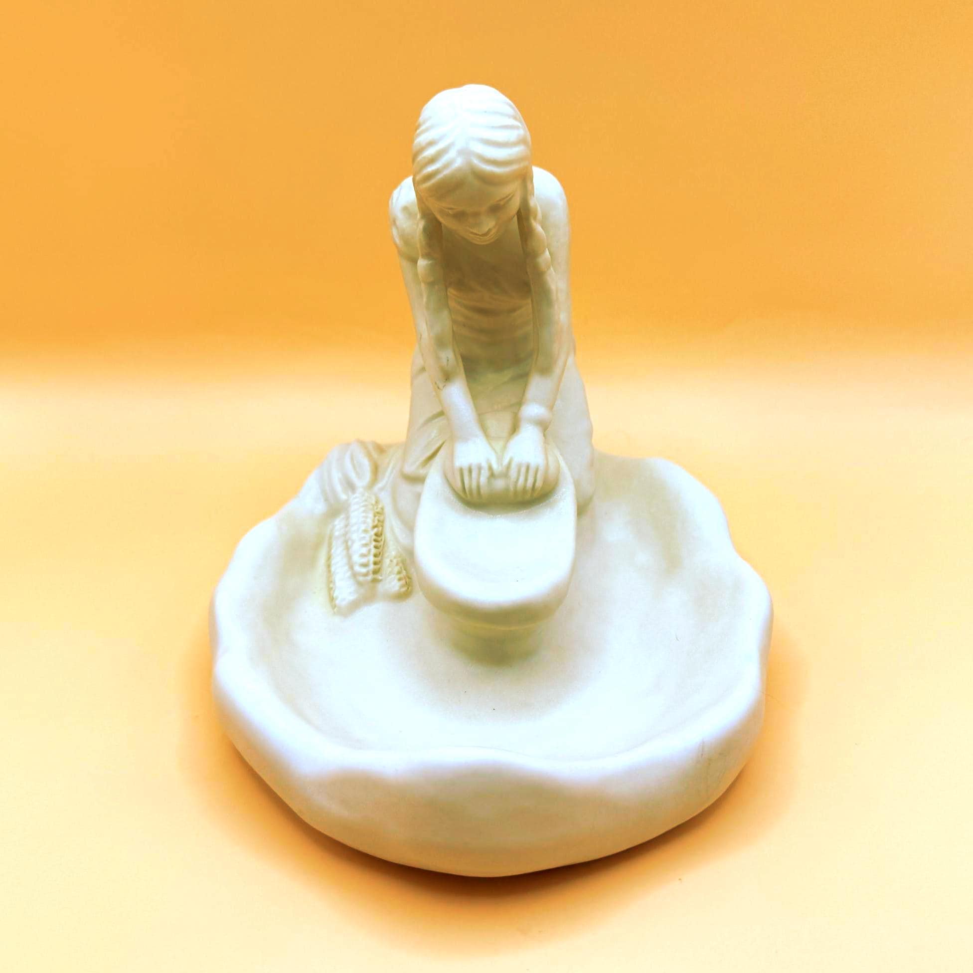 A beautifully detailed Van Briggle pottery figurine depicting a Hopi Indian girl grinding corn, capturing a quiet and meaningful moment of traditional life. The sculptural detail is exceptional—from her braided hair to her focused posture at the grinding stone, with corn accents along the base adding depth and authenticity.