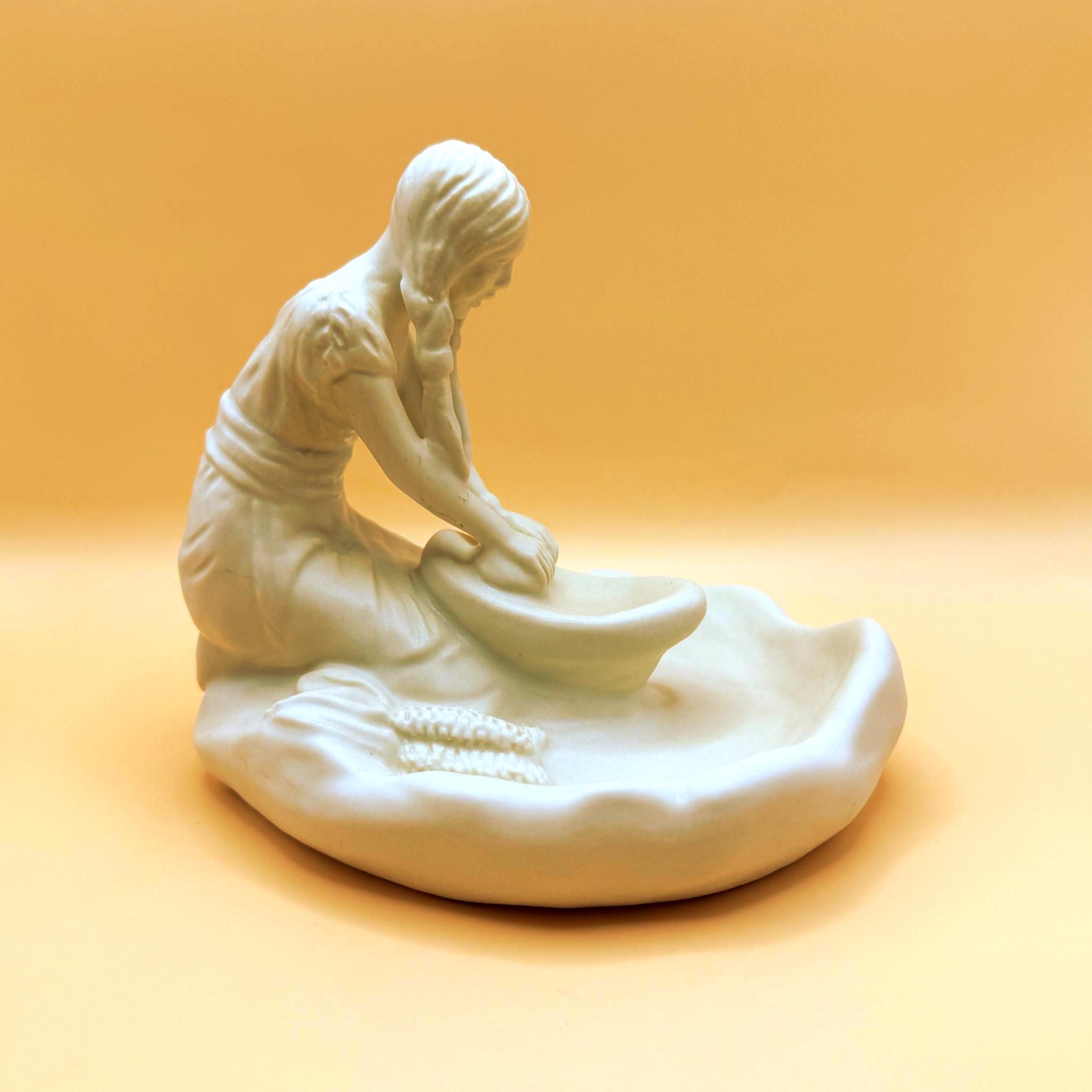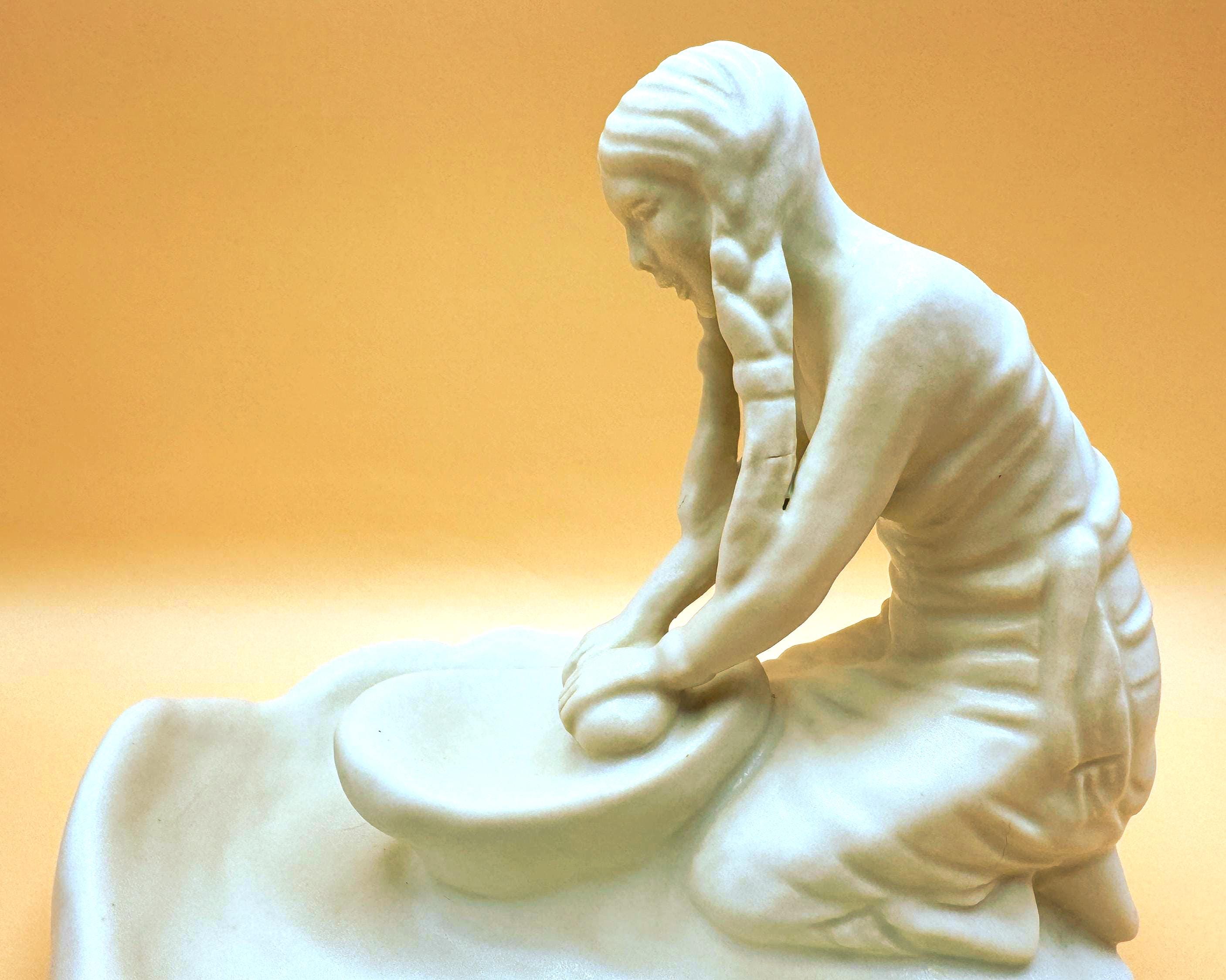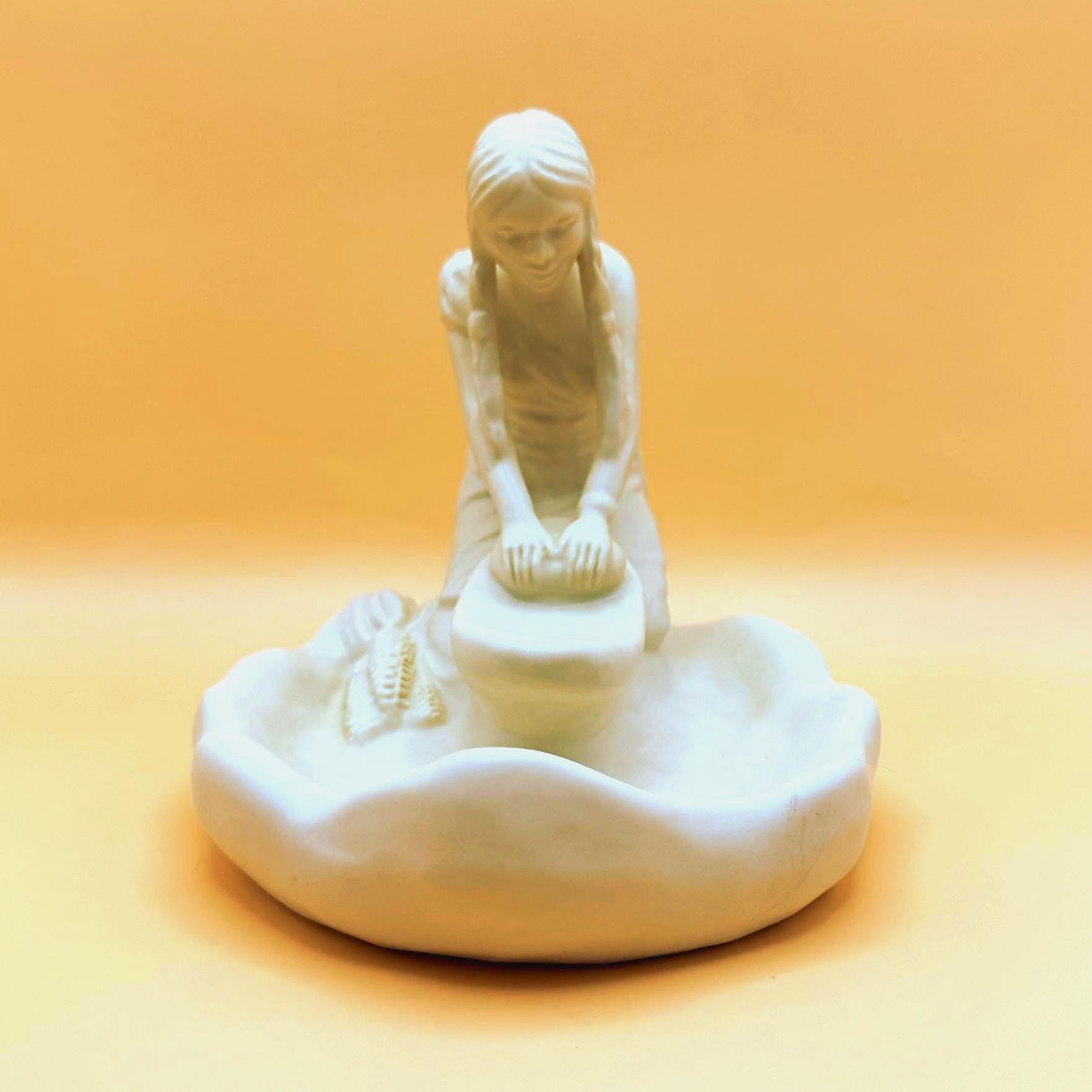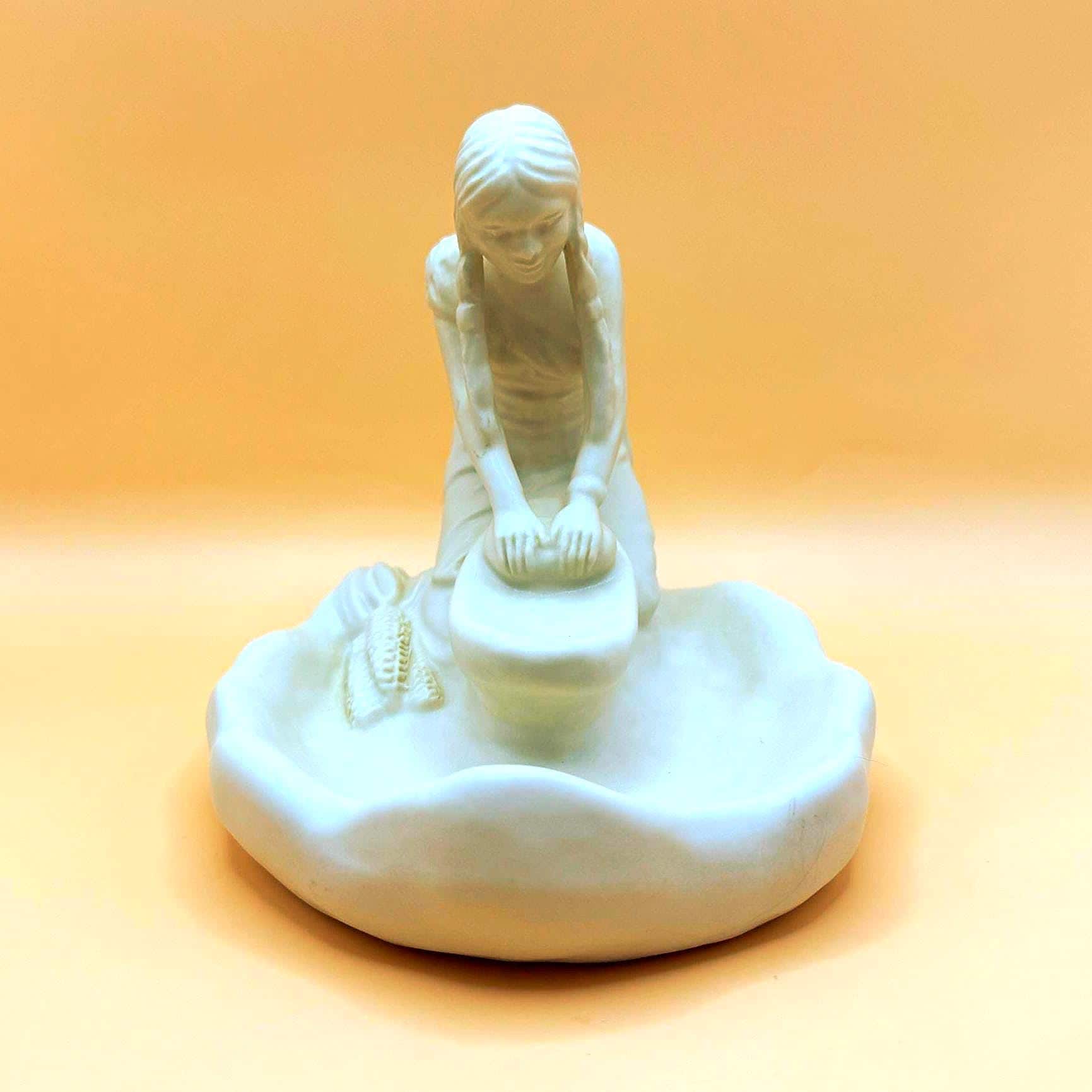 A beautifully detailed Van Briggle pottery figurine depicting a Hopi Indian girl grinding corn, capturing a quiet and meaningful moment of traditional life. The sculptural detail is exceptional—from her braided hair to her focused posture at the grinding stone, with corn accents along the base adding depth and authenticity.