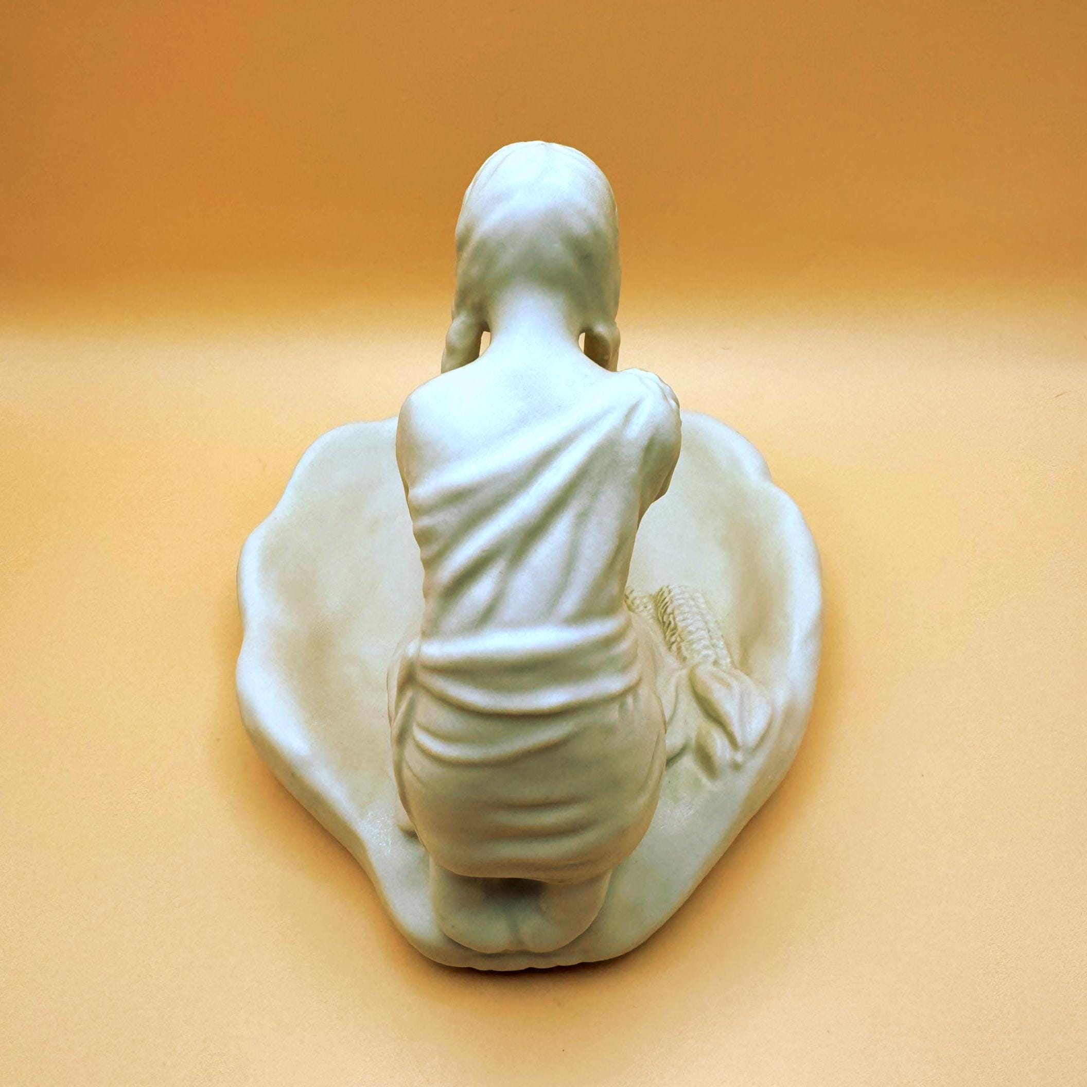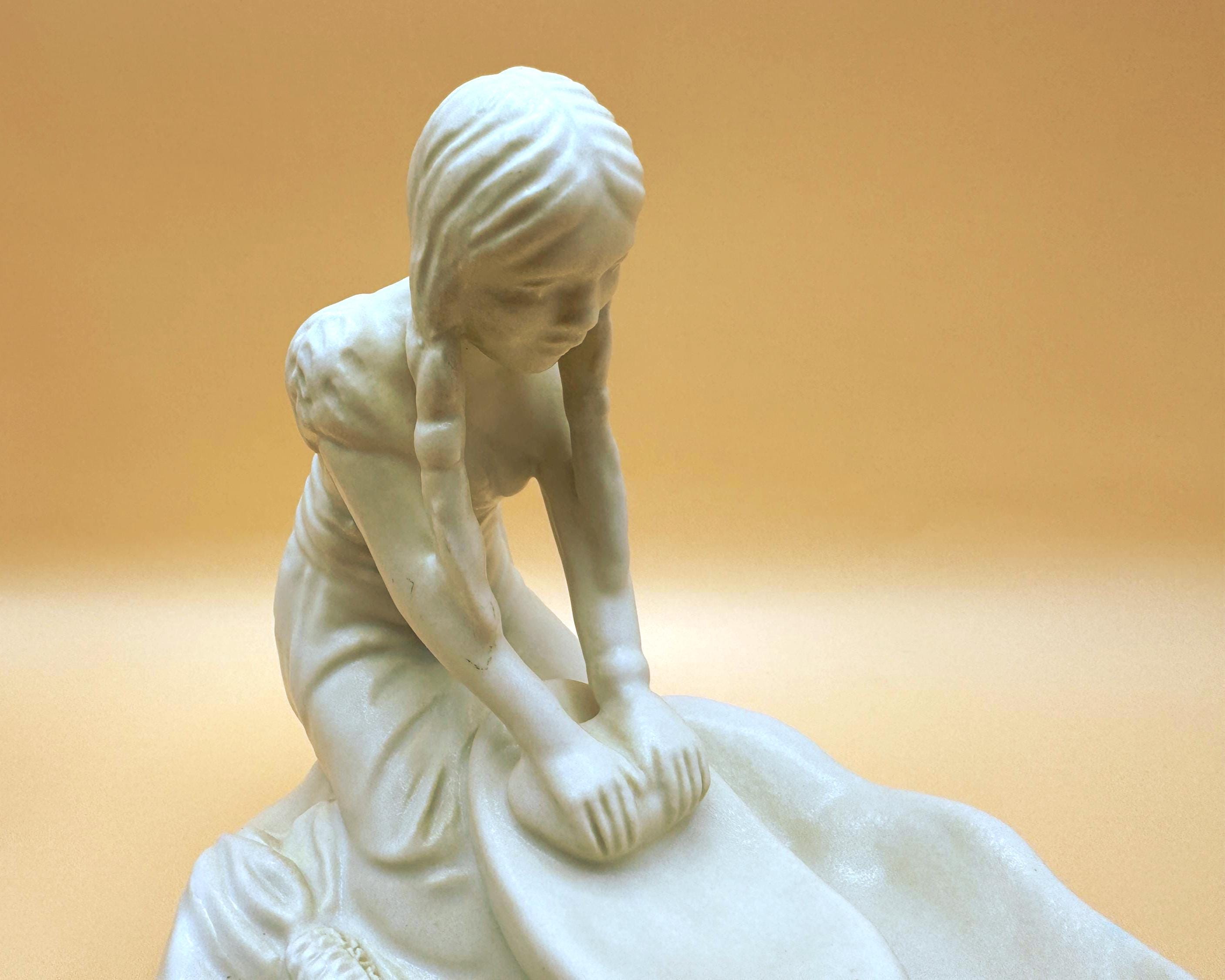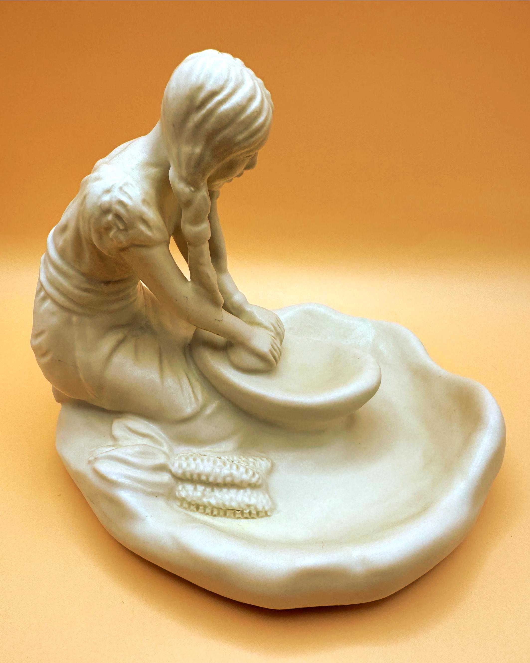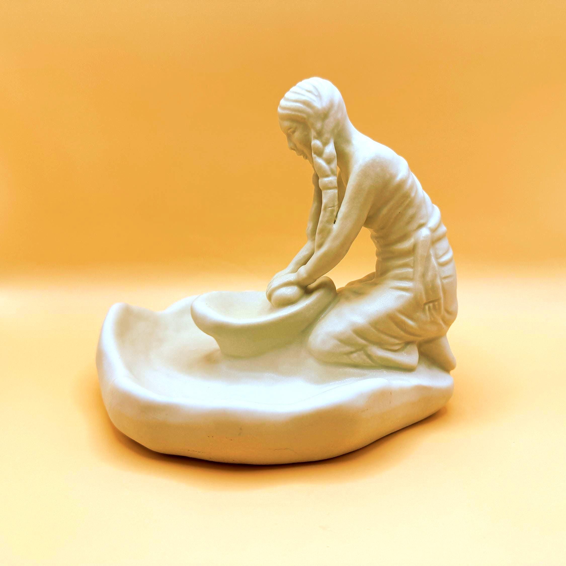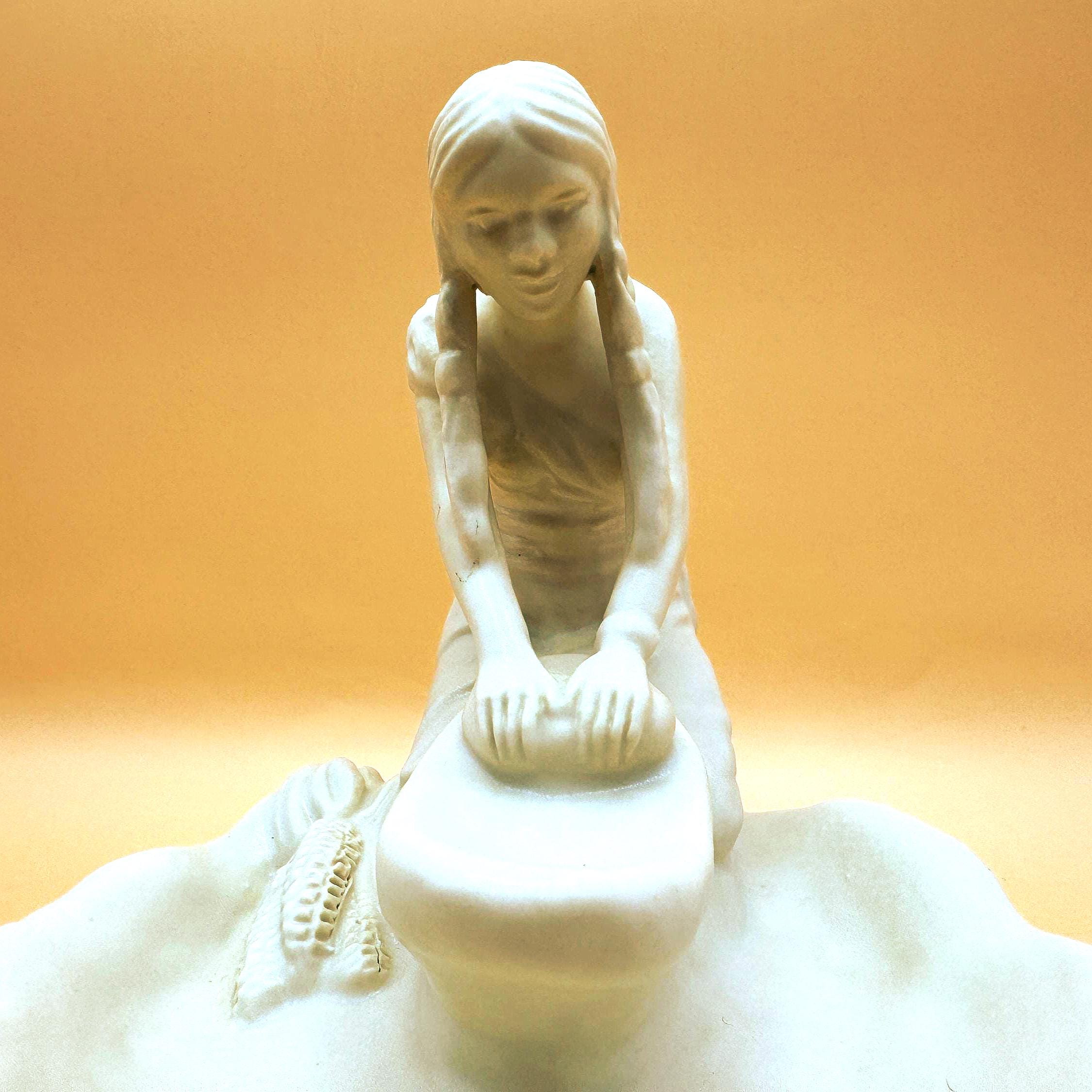 A beautifully detailed Van Briggle pottery figurine depicting a Hopi Indian girl grinding corn, capturing a quiet and meaningful moment of traditional life. The sculptural detail is exceptional—from her braided hair to her focused posture at the grinding stone, with corn accents along the base adding depth and authenticity.